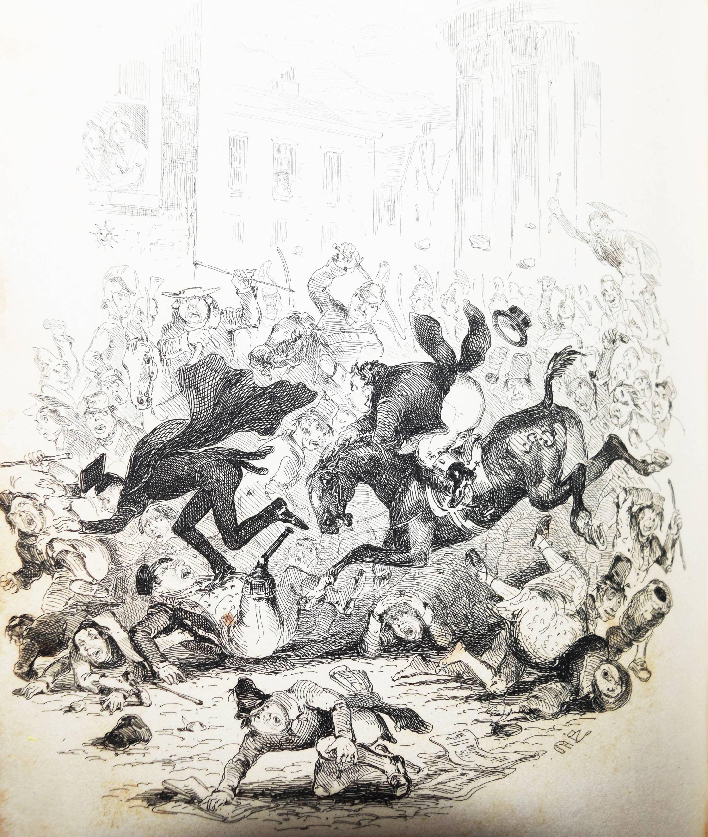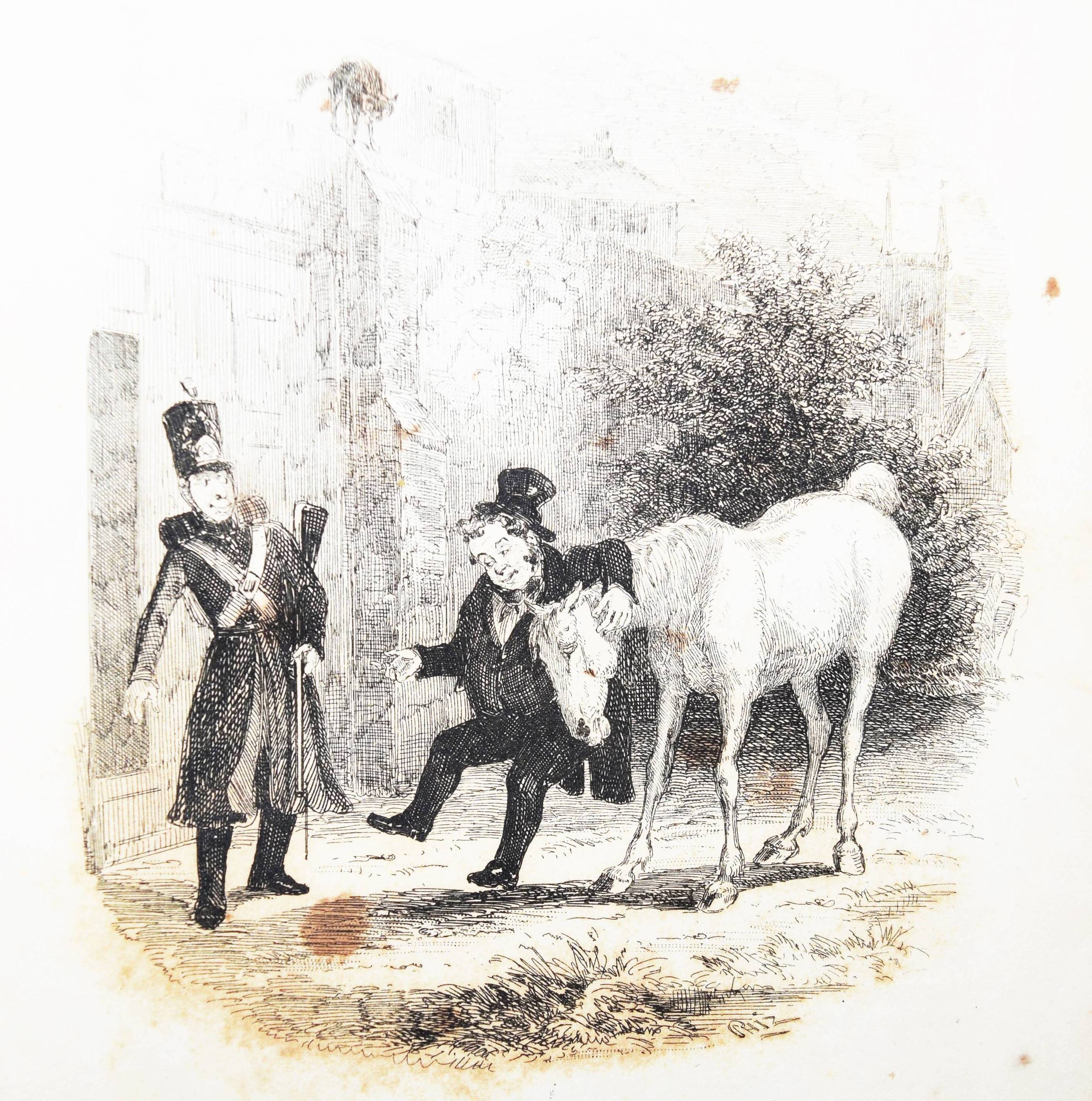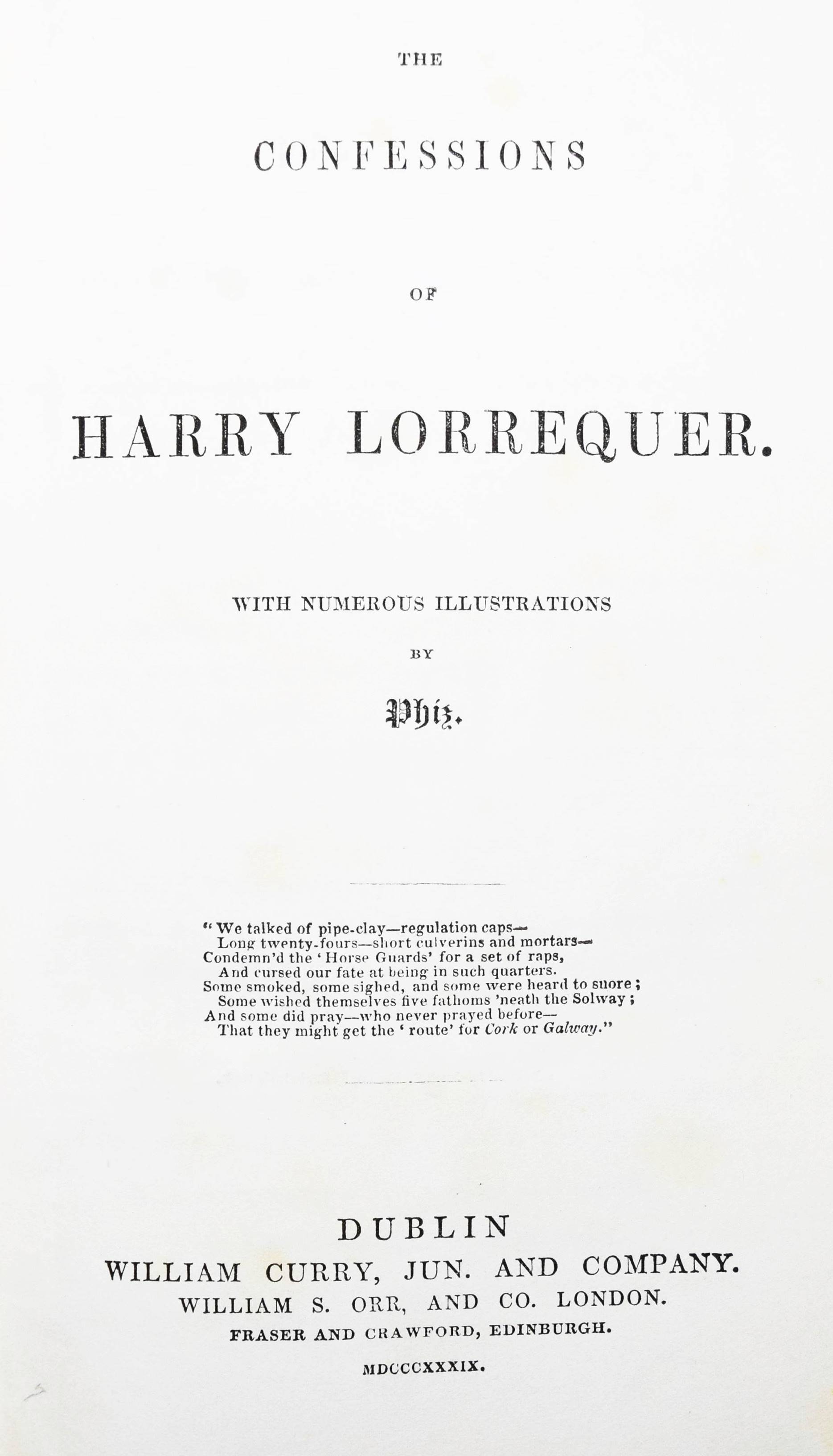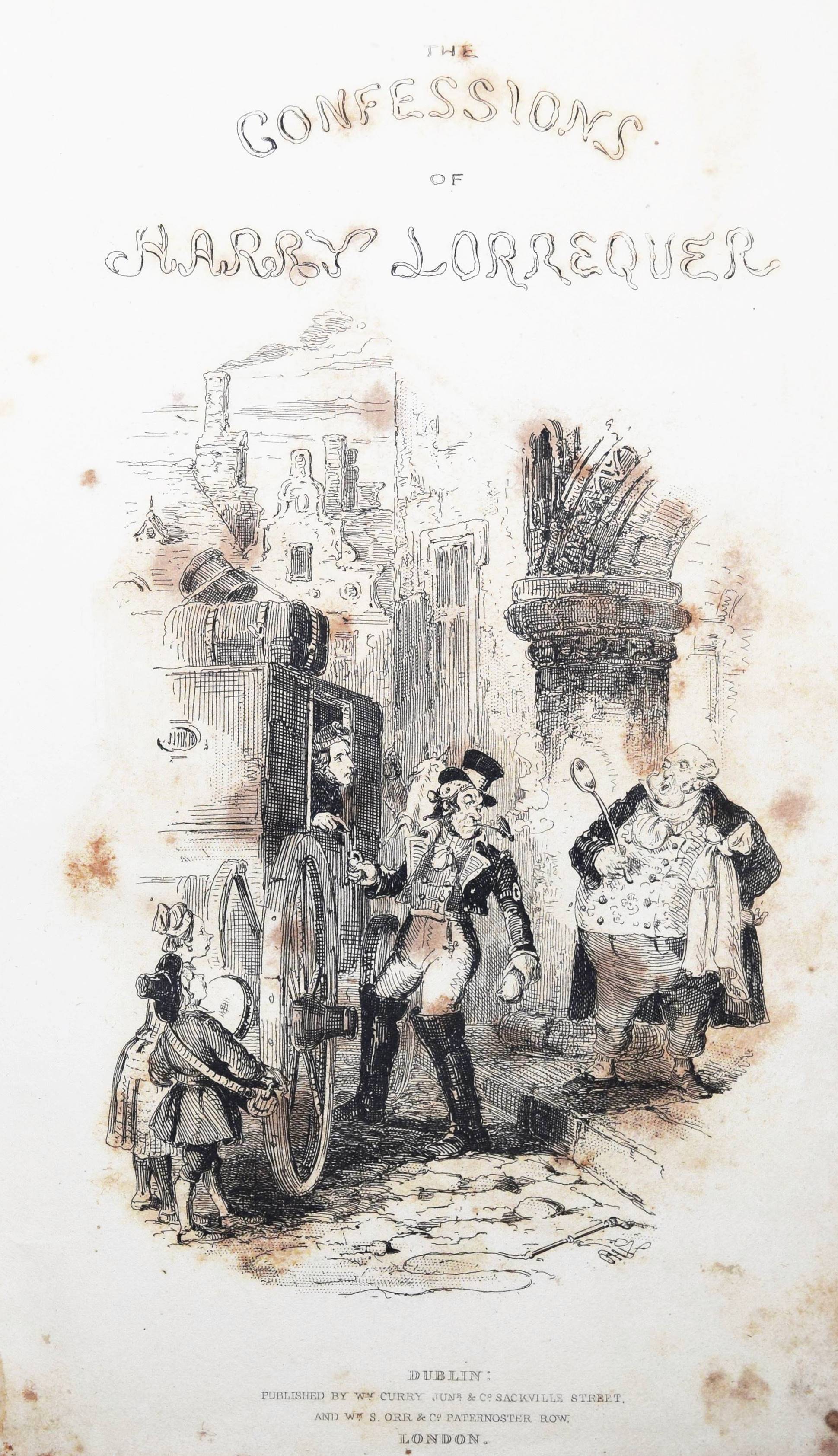 (Lever, Charles James). The confessions of Harry Lorrequer. With numerous illustrations by Phiz (d. i. Hablot Knight Browne). Dublin, W. Curry 1839. 8°. Gestoch. Frontispiz, gestoch. illustr. Titel, XV, 344 S. mit 20 Radierungen. Hldr. d. Zt. mit goldgepr. Rückentitel u. Rückenvergoldung. Seltene erste Buch-Ausgabe des humoristischen Romans, der in Dublin und München spielt. Der Roman wurde zuerst 1837 ff. im Dublin University Magazine veröffentlicht. Es handelt sich um den ersten Roman des irischen Schriftstellers und Mediziners C. J. Lever (1806-1872). – Die seinerzeit sehr erfolgreichen Romane spielen oft im Studenten-Milieu. Lever hatte bevor er sein Medizinstudium in Dublin begann, bereits Kanada und Deutschland bereist, wo er sich in Jena als Student ausgab und Goethe getroffen hat. – Der berühmte englische Illustrator H. K. Browne (Phiz) wurde besonders durch seine Illustrationen der Werke seines Freundes C. Dickens bekannt. – Vord. Innengelenk etwas angeplatzt, das Frontispiz, der illustrierte Titel und die Tafeln teils stärker braunfleckig, gutes dekorativ gebundenes Exemplar.