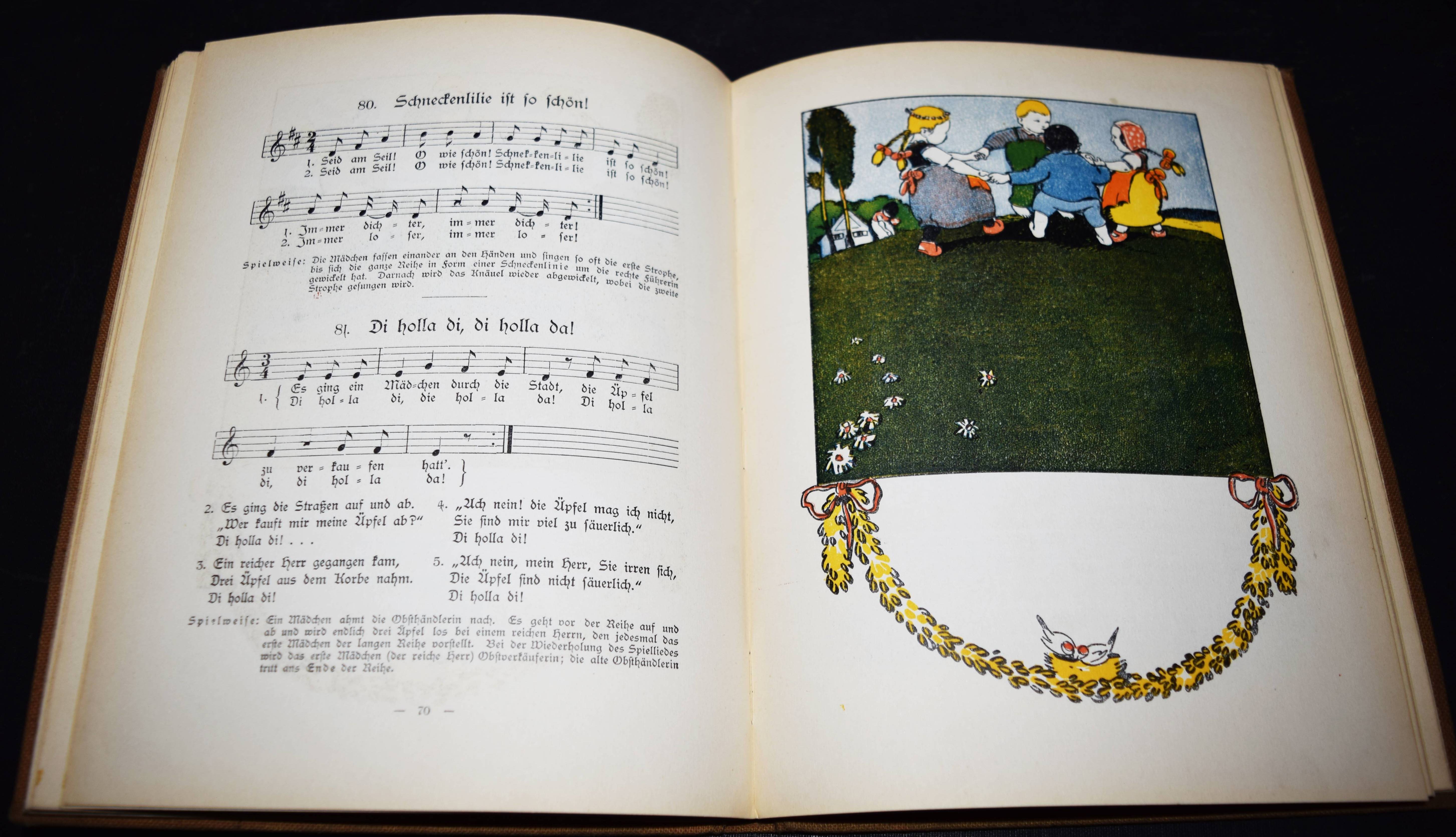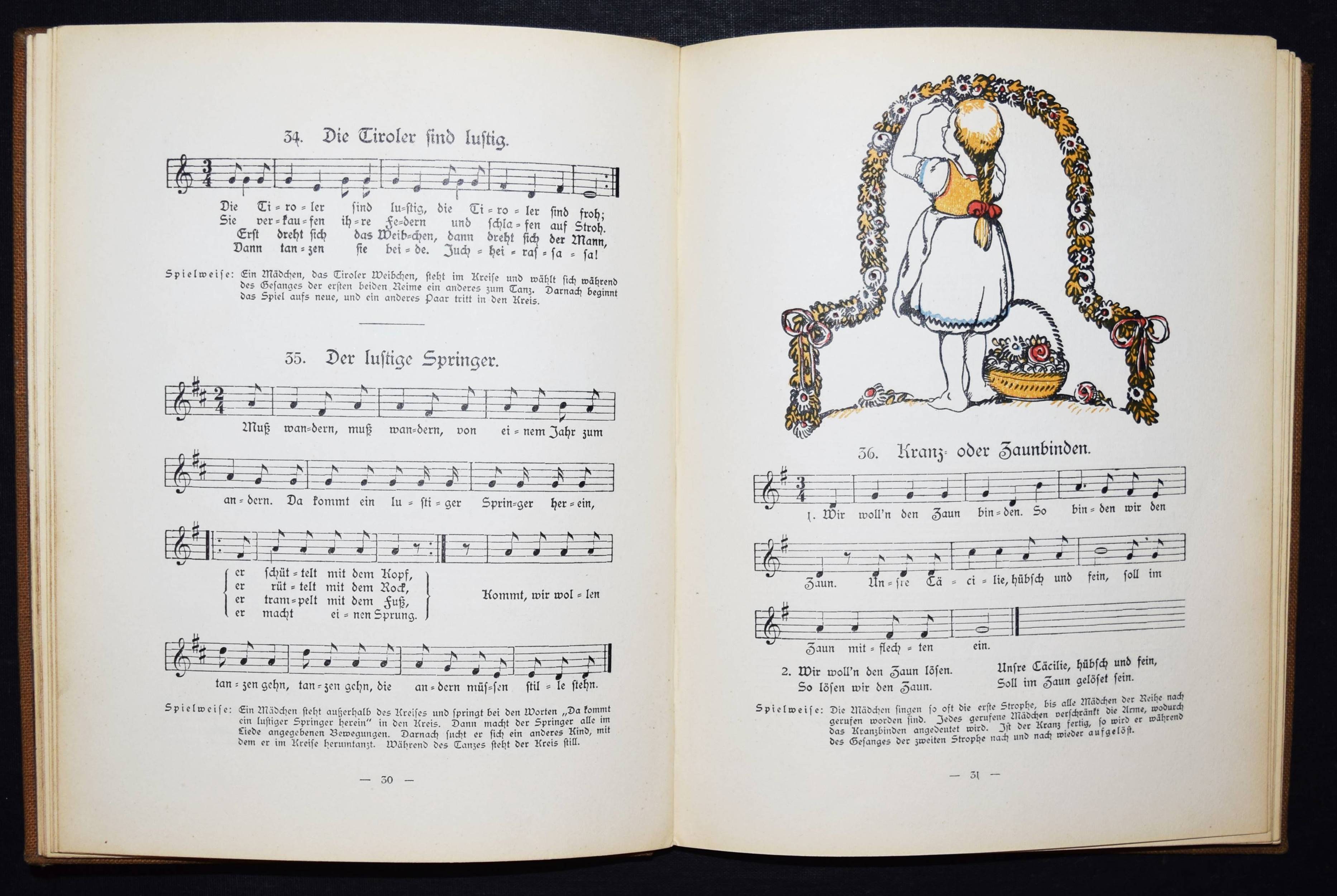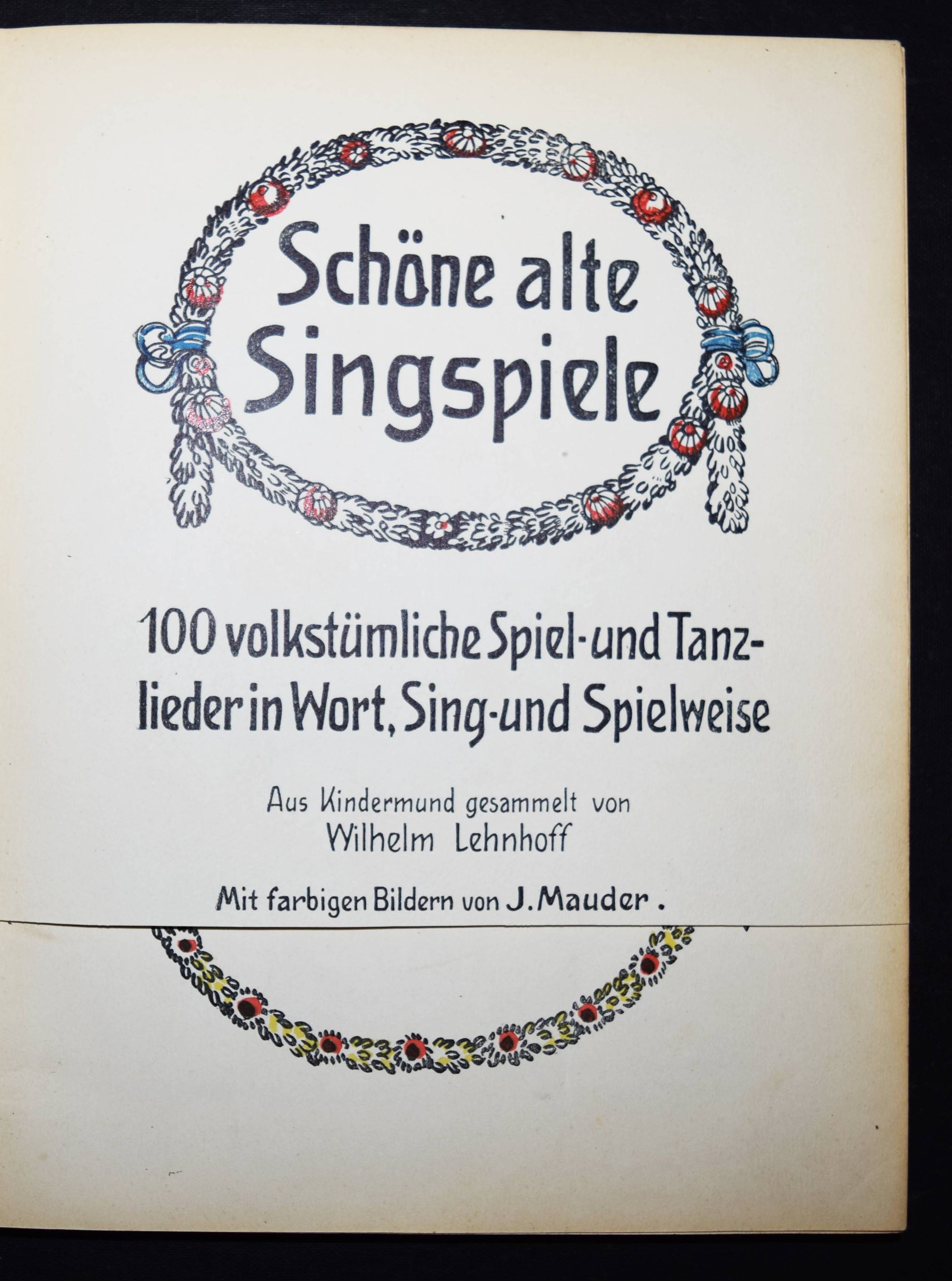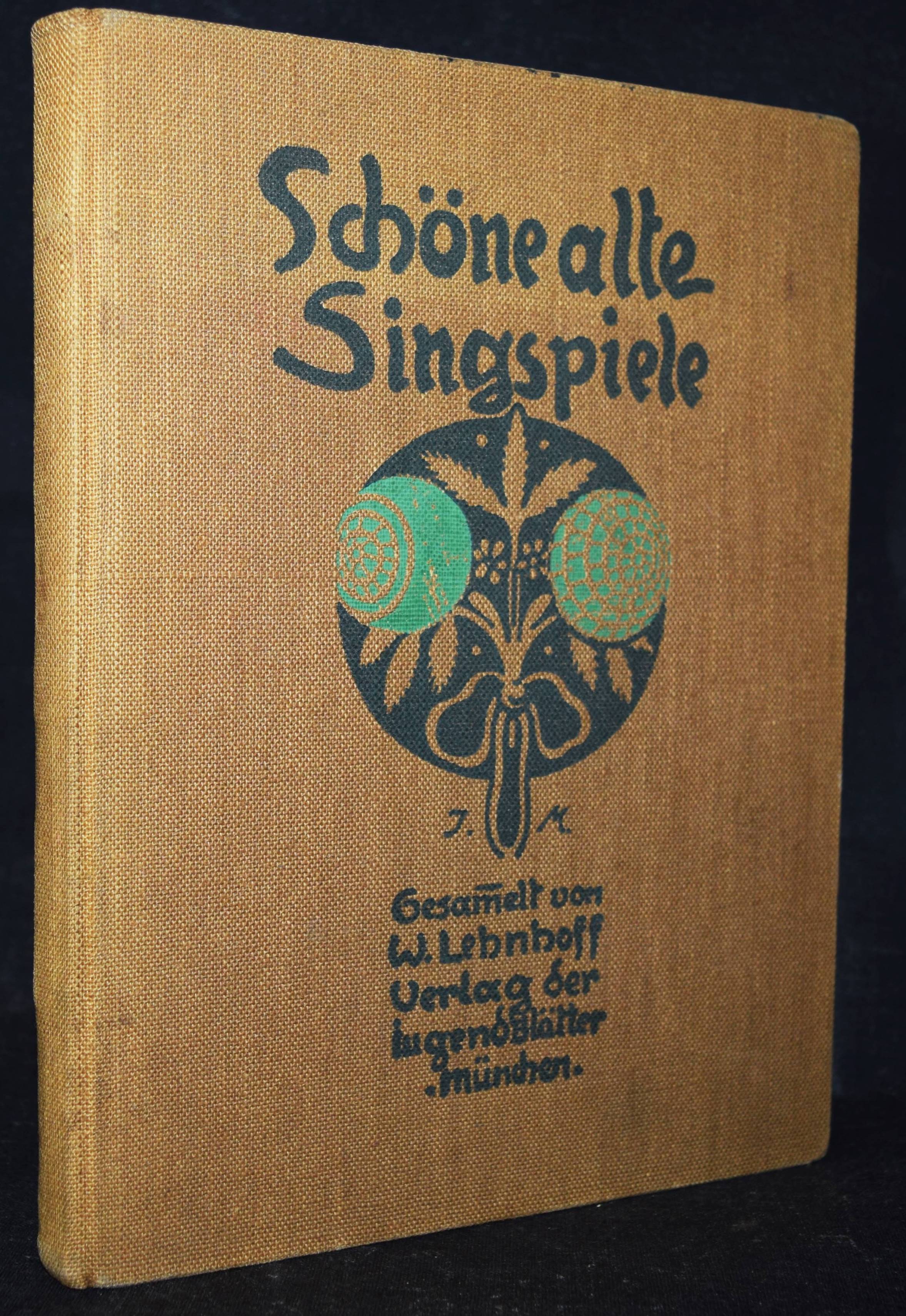 Lehnhoff, Wilhelm (Hrsg.). Schöne alte Singspiele. 100 volkstümliche Spiel- und Tanzlieder in Wort, Sing- und Spielweise. Aus Kindermund gesammelt. Mit farbigen Bildern von J(osef) Mauder. (München, Verlag der Jugendblätter) o. J. (1907). Gr.-8°. 95, (7) S. mit teils ganzs. farblithogr. Illustrationen. Farbig illustr. OLn. Bilderwelt 583. Hobrecker, Braunschweig 4618. LKJ IV, 405. Ries 707, 10. Ries, Mauder S. 13. Seebaß II, 1145. Nicht bei Klotz 4004. – Erste Ausgabe. – „Reizvoll im Jugendstil ausgestattete, auch folkloristisch bemerkenswerte Sammlung. Außer den bunten Bildern finden sich zahlreiche schwarze Vignettchen von Mauder.“ (A. Seebaß). – „Bevorzugt zur Illustration von Lied-, Spruch- und Gedichtsammlungen herangezogen, begriff M. seine Bilder meist als Vignettenkunst, die er in knapper, witziger-dekorativer Weise gestaltet. Sie erfüllen den Begriff des figürlichen Buchschmucks in einer für die beiden ersten Jahrzehnte des 20. Jahrhunderts zeittypischen Art… Ein bayerischer Zug äußert sich in dem herzhaften, temperamentvoll geführten Strich, in einer gewissen Drallheit der Formen und in fröhlich-bunten Farben“ (H. Ries in LKJ). – Einband etwas angestaubt, Titelblatt im unteren Drittel abgeschnitten (Verlust der Verlagsangabe), gutes Exemplar.