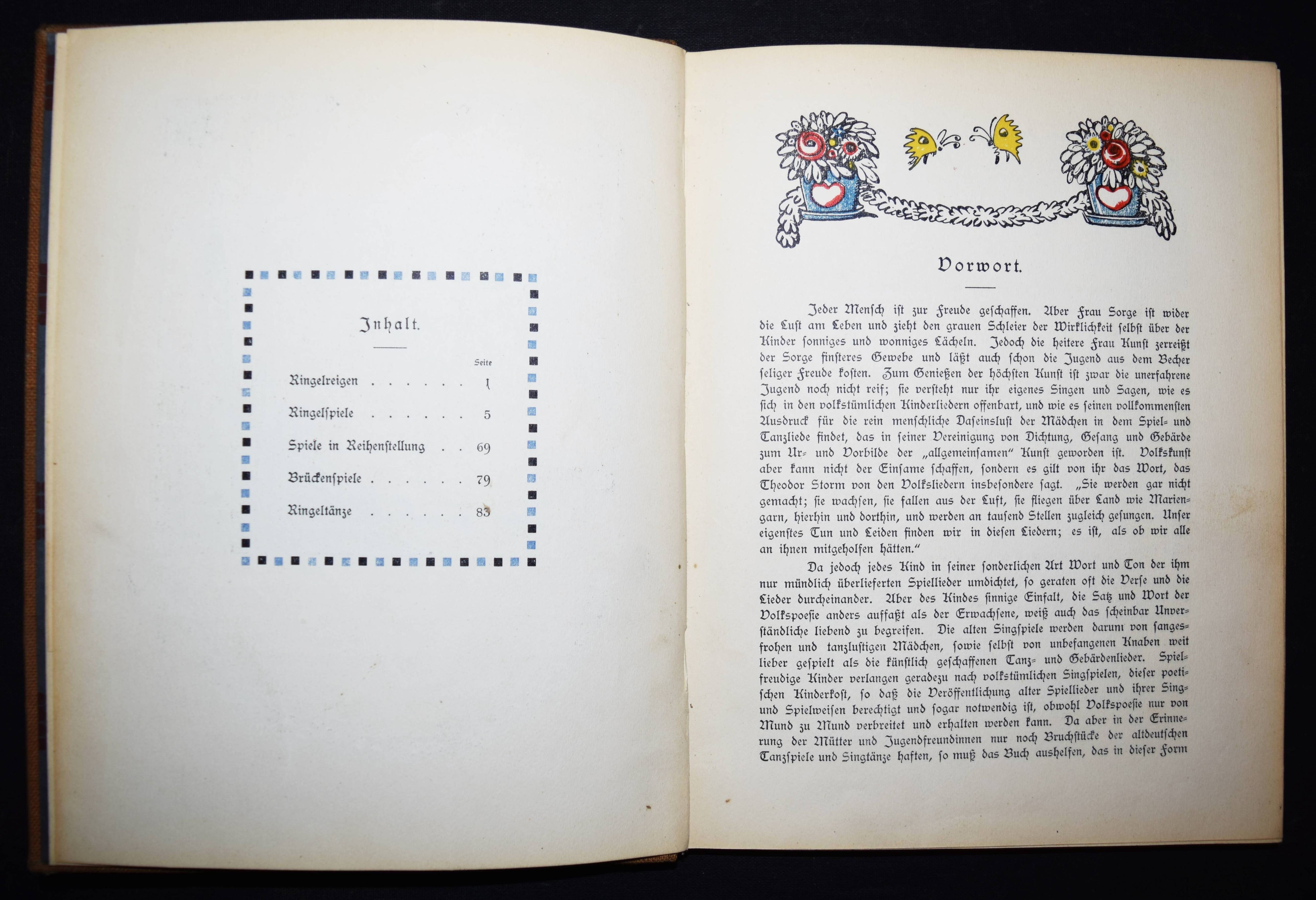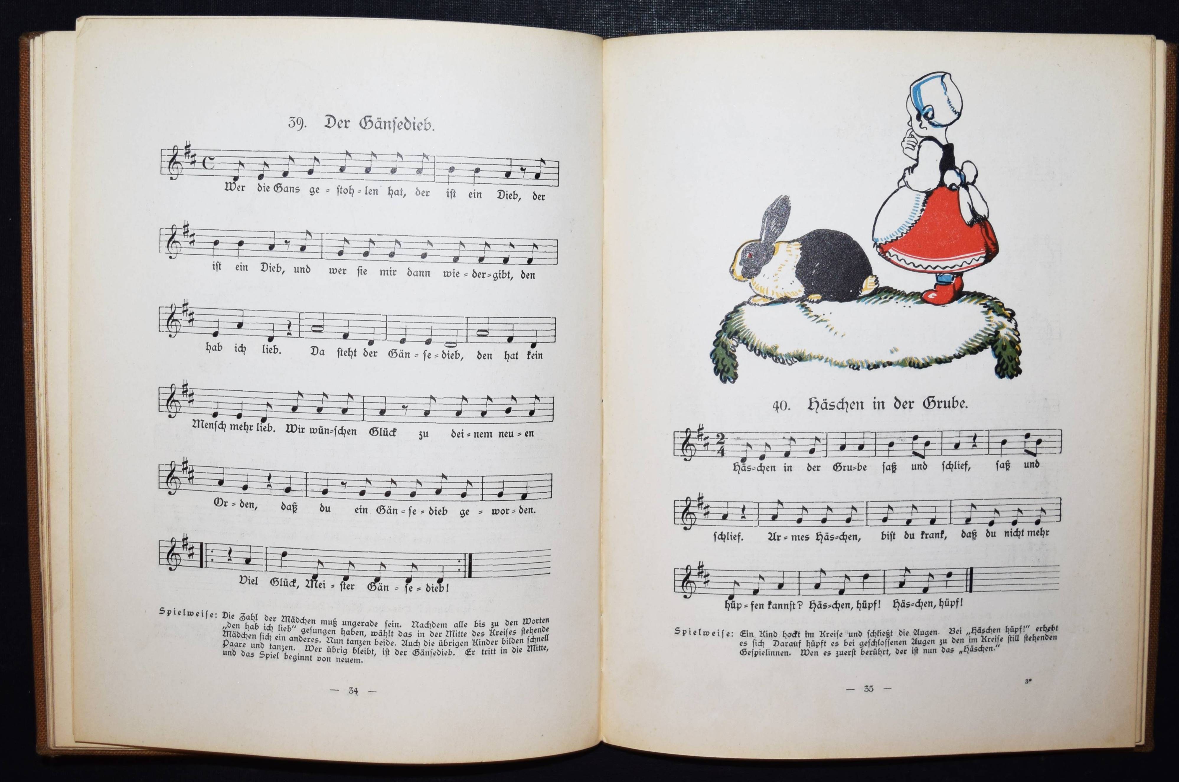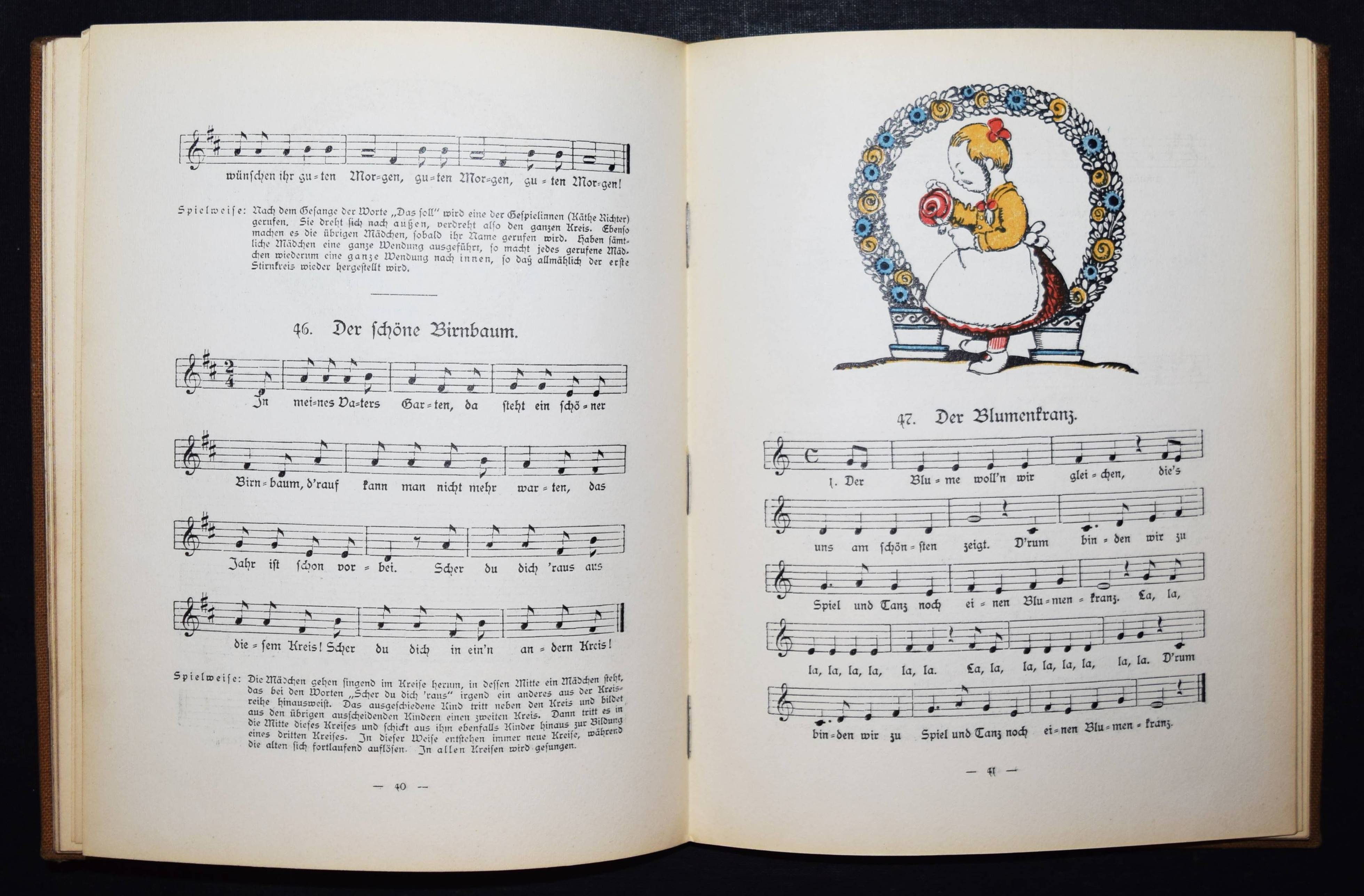 Lehnhoff, Wilhelm (Hrsg.). Schöne alte Singspiele. 100 volkstümliche Spiel- und Tanzlieder in Wort, Sing- und Spielweise. Aus Kindermund gesammelt. Mit farbigen Bildern von J(osef) Mauder. (München, Verlag der Jugendblätter) o. J. (1907). Gr.-8°. 95, (7) S. mit teils ganzs. farblithogr. Illustrationen. Farbig illustr. OLn. Bilderwelt 583. Hobrecker, Braunschweig 4618. LKJ IV, 405. Ries 707, 10. Ries, Mauder S. 13. Seebaß II, 1145. Nicht bei Klotz 4004. – Erste Ausgabe. – „Reizvoll im Jugendstil ausgestattete, auch folkloristisch bemerkenswerte Sammlung. Außer den bunten Bildern finden sich zahlreiche schwarze Vignettchen von Mauder.“ (A. Seebaß). – „Bevorzugt zur Illustration von Lied-, Spruch- und Gedichtsammlungen herangezogen, begriff M. seine Bilder meist als Vignettenkunst, die er in knapper, witziger-dekorativer Weise gestaltet. Sie erfüllen den Begriff des figürlichen Buchschmucks in einer für die beiden ersten Jahrzehnte des 20. Jahrhunderts zeittypischen Art… Ein bayerischer Zug äußert sich in dem herzhaften, temperamentvoll geführten Strich, in einer gewissen Drallheit der Formen und in fröhlich-bunten Farben“ (H. Ries in LKJ). – Einband etwas angestaubt, Titelblatt im unteren Drittel abgeschnitten (Verlust der Verlagsangabe), gutes Exemplar.