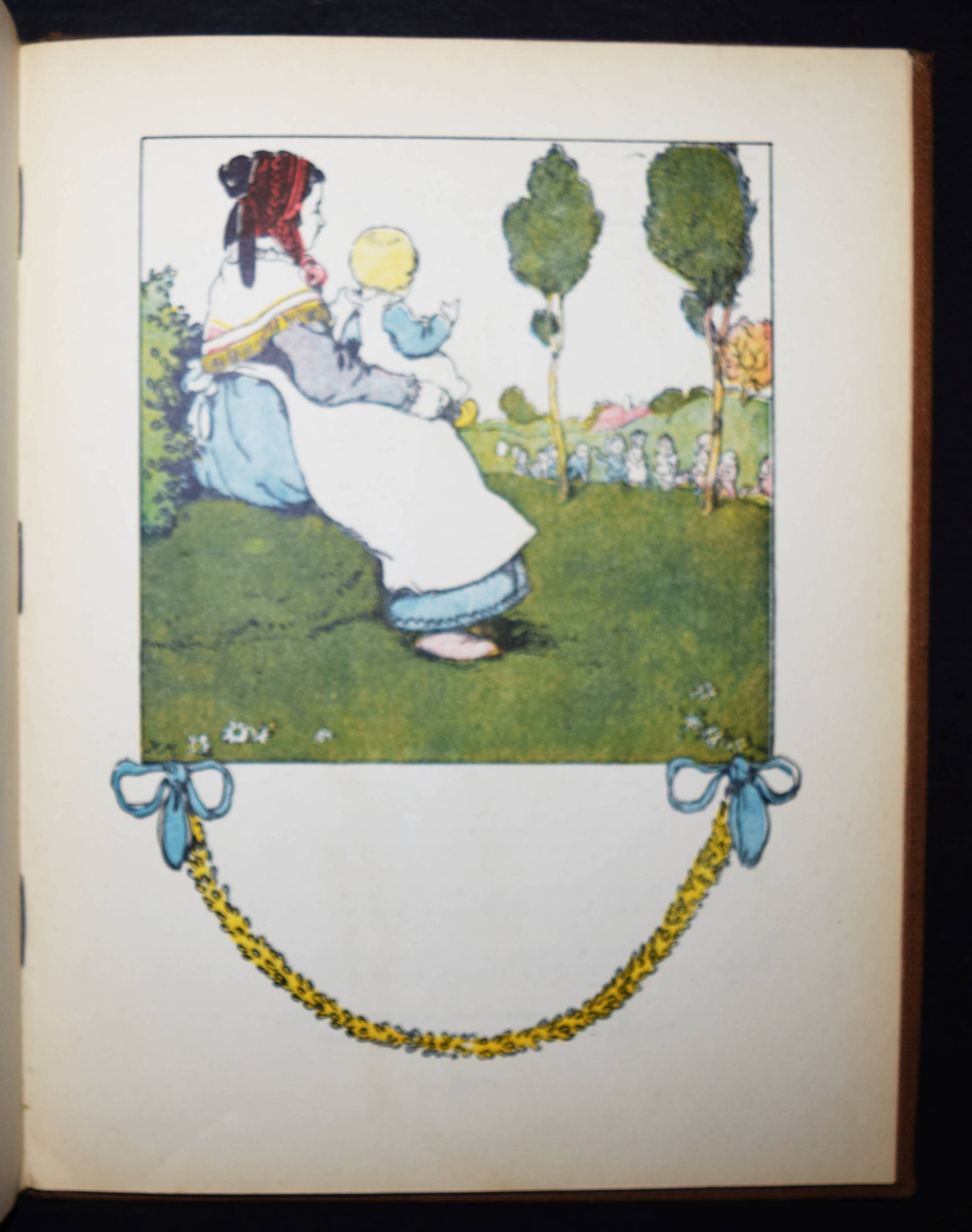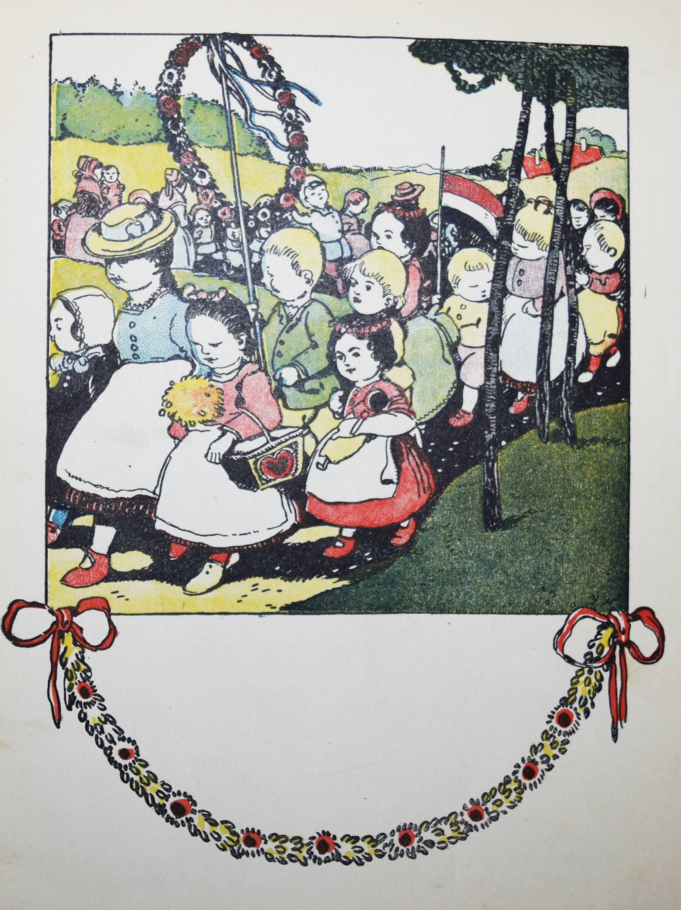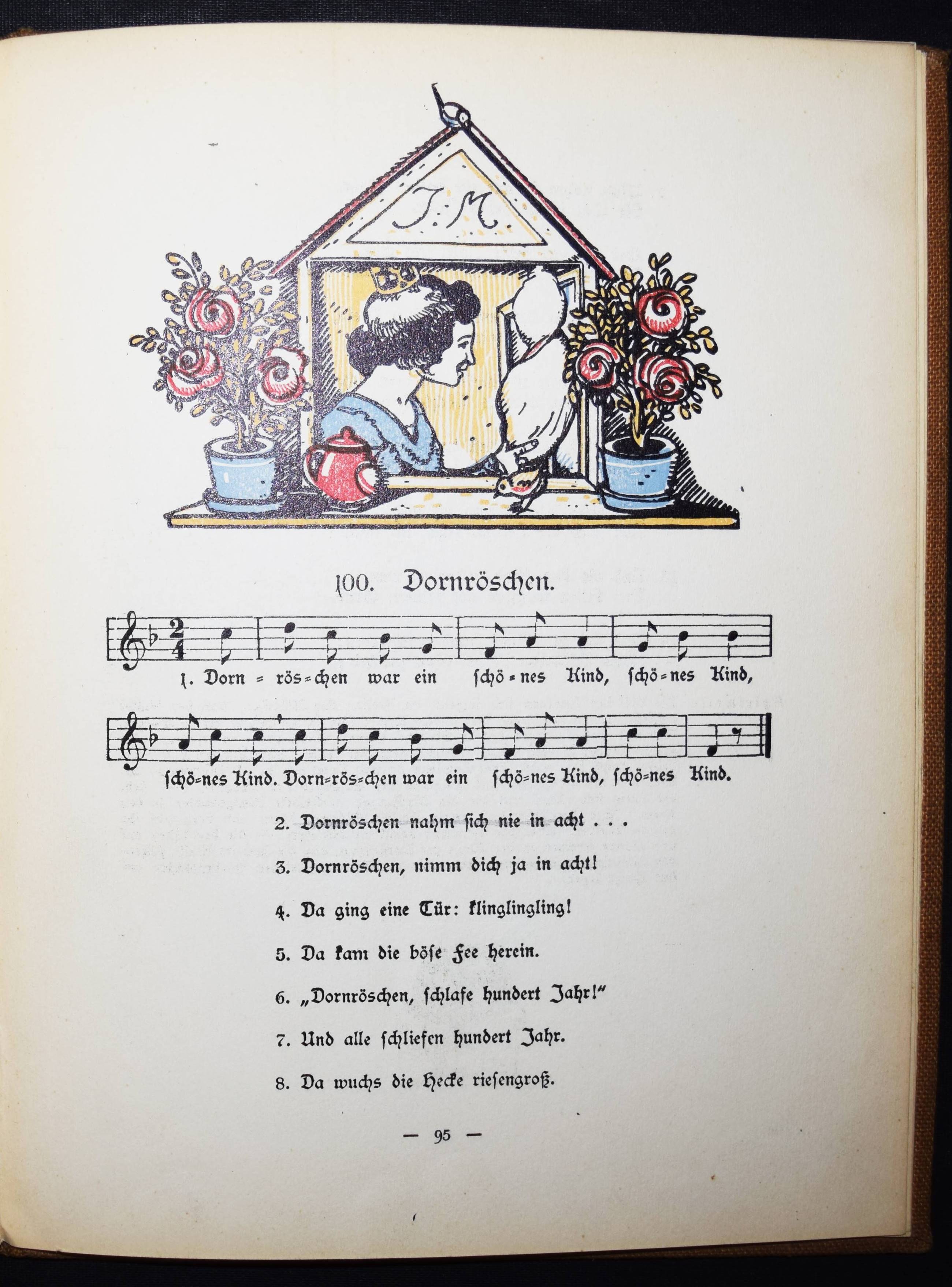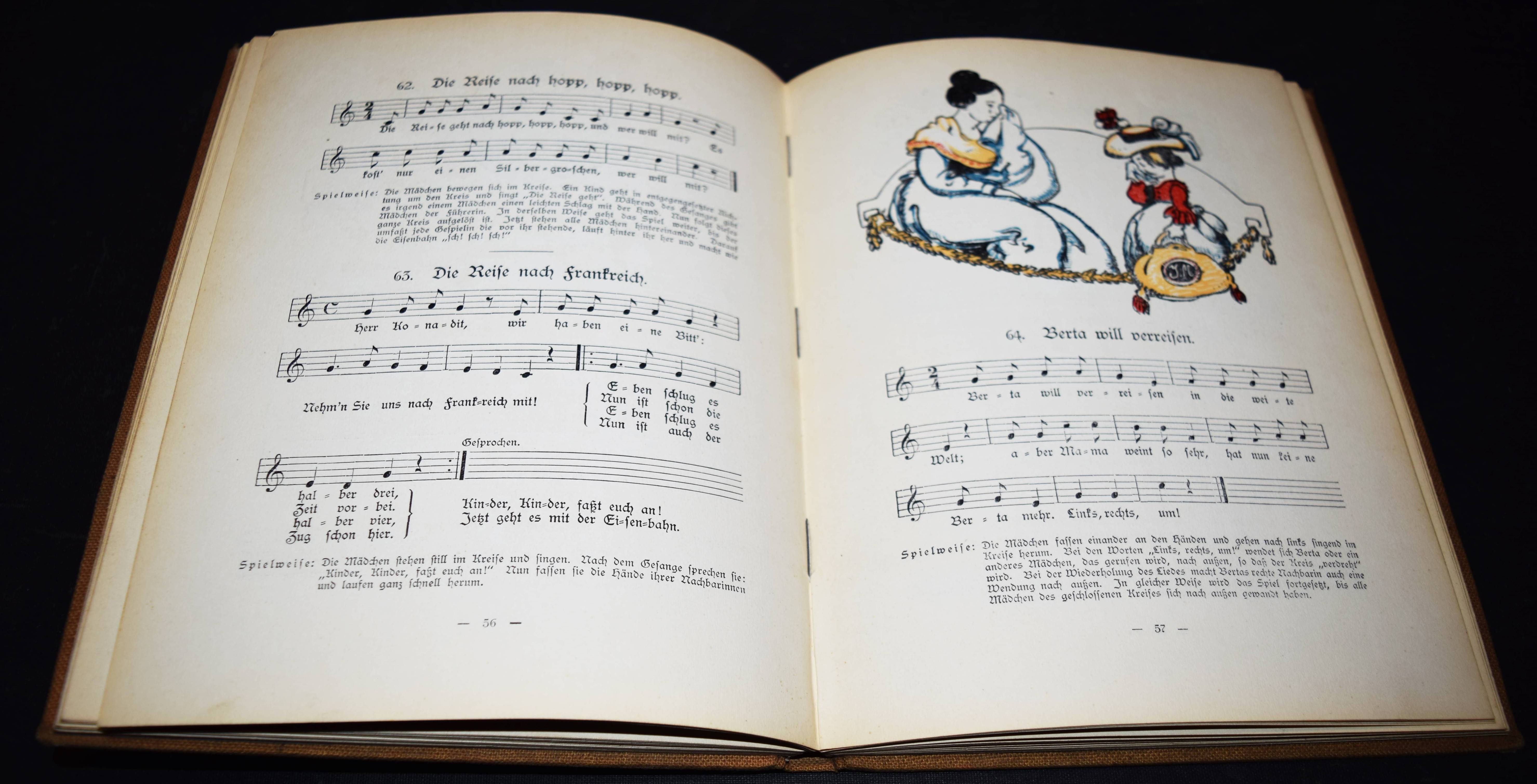 Lehnhoff, Wilhelm (Hrsg.). Schöne alte Singspiele. 100 volkstümliche Spiel- und Tanzlieder in Wort, Sing- und Spielweise. Aus Kindermund gesammelt. Mit farbigen Bildern von J(osef) Mauder. (München, Verlag der Jugendblätter) o. J. (1907). Gr.-8°. 95, (7) S. mit teils ganzs. farblithogr. Illustrationen. Farbig illustr. OLn. Bilderwelt 583. Hobrecker, Braunschweig 4618. LKJ IV, 405. Ries 707, 10. Ries, Mauder S. 13. Seebaß II, 1145. Nicht bei Klotz 4004. – Erste Ausgabe. – „Reizvoll im Jugendstil ausgestattete, auch folkloristisch bemerkenswerte Sammlung. Außer den bunten Bildern finden sich zahlreiche schwarze Vignettchen von Mauder.“ (A. Seebaß). – „Bevorzugt zur Illustration von Lied-, Spruch- und Gedichtsammlungen herangezogen, begriff M. seine Bilder meist als Vignettenkunst, die er in knapper, witziger-dekorativer Weise gestaltet. Sie erfüllen den Begriff des figürlichen Buchschmucks in einer für die beiden ersten Jahrzehnte des 20. Jahrhunderts zeittypischen Art… Ein bayerischer Zug äußert sich in dem herzhaften, temperamentvoll geführten Strich, in einer gewissen Drallheit der Formen und in fröhlich-bunten Farben“ (H. Ries in LKJ). – Einband etwas angestaubt, Titelblatt im unteren Drittel abgeschnitten (Verlust der Verlagsangabe), gutes Exemplar.