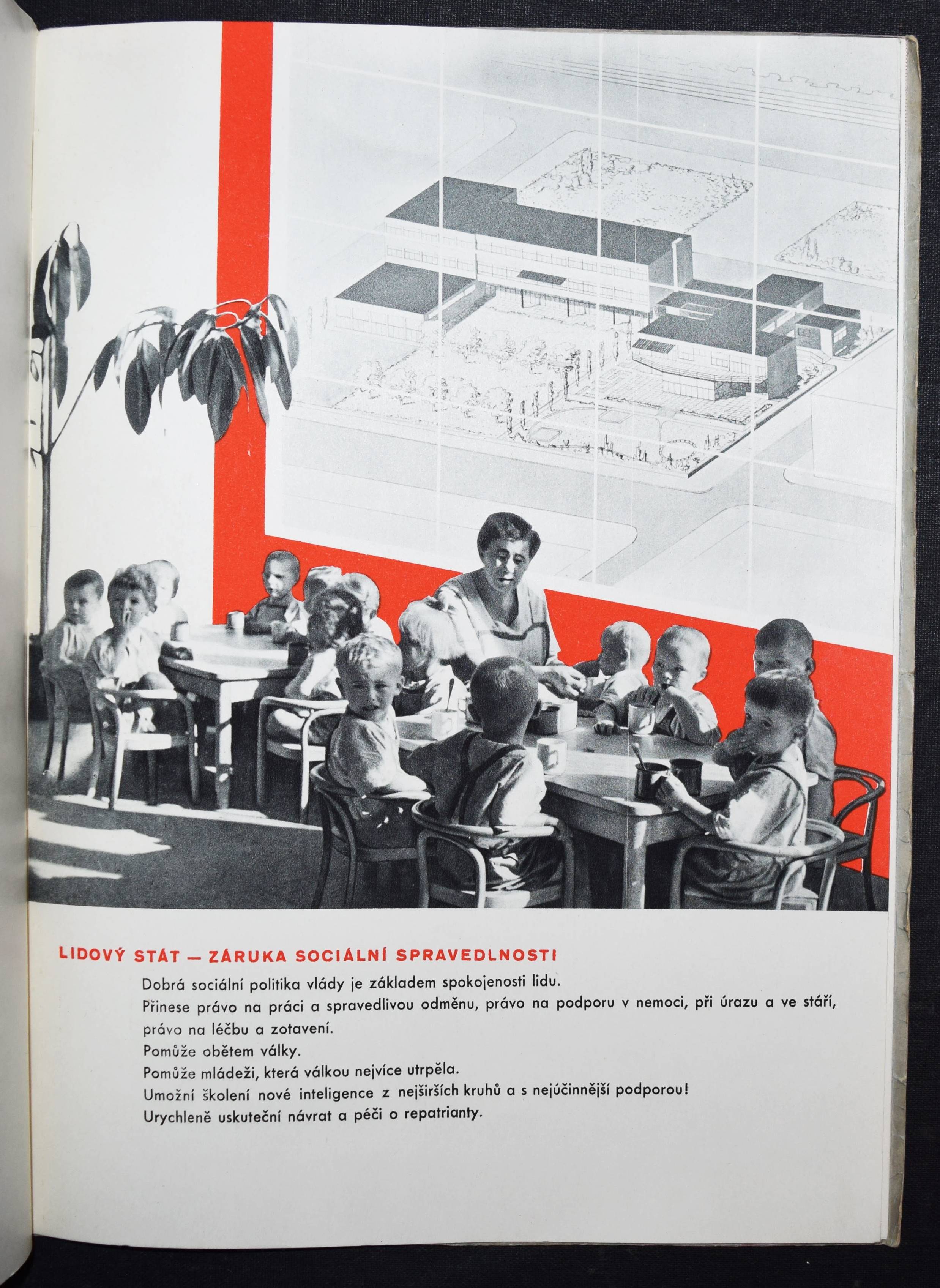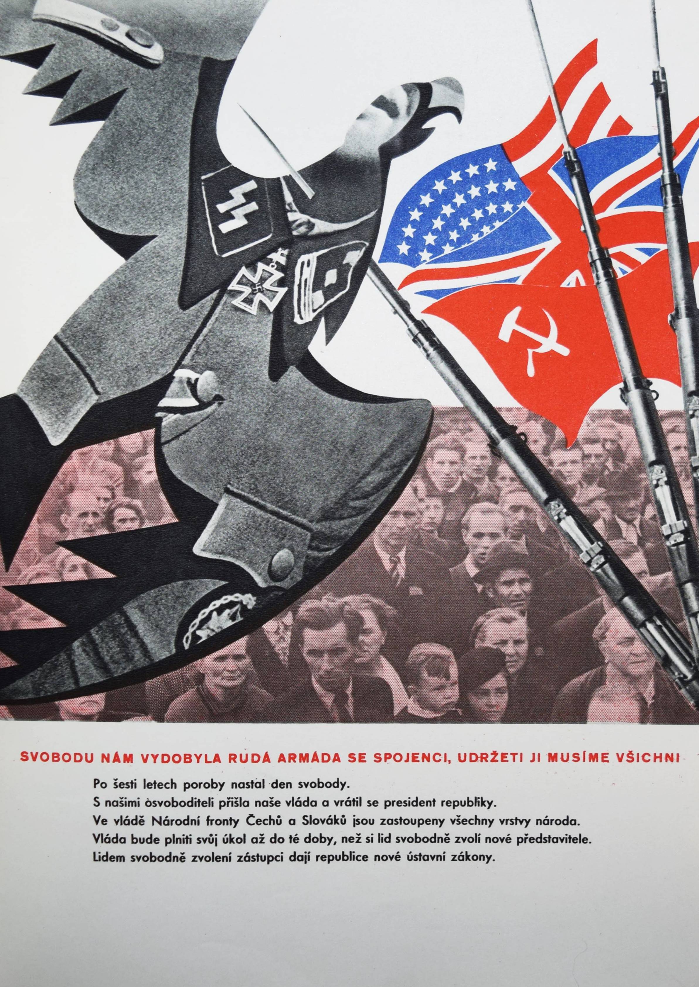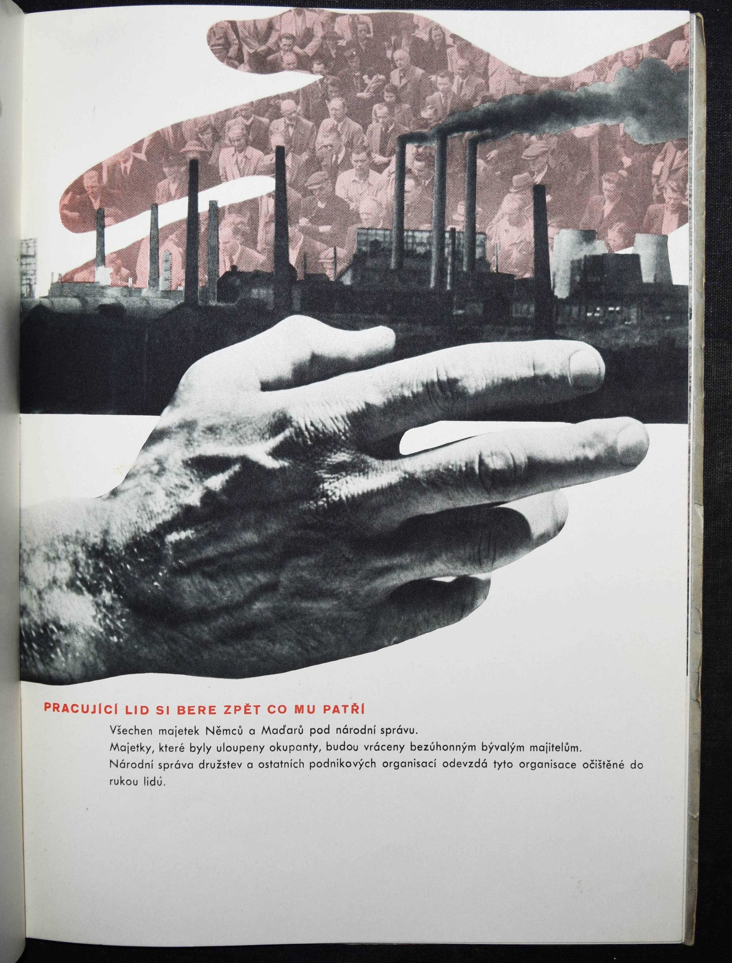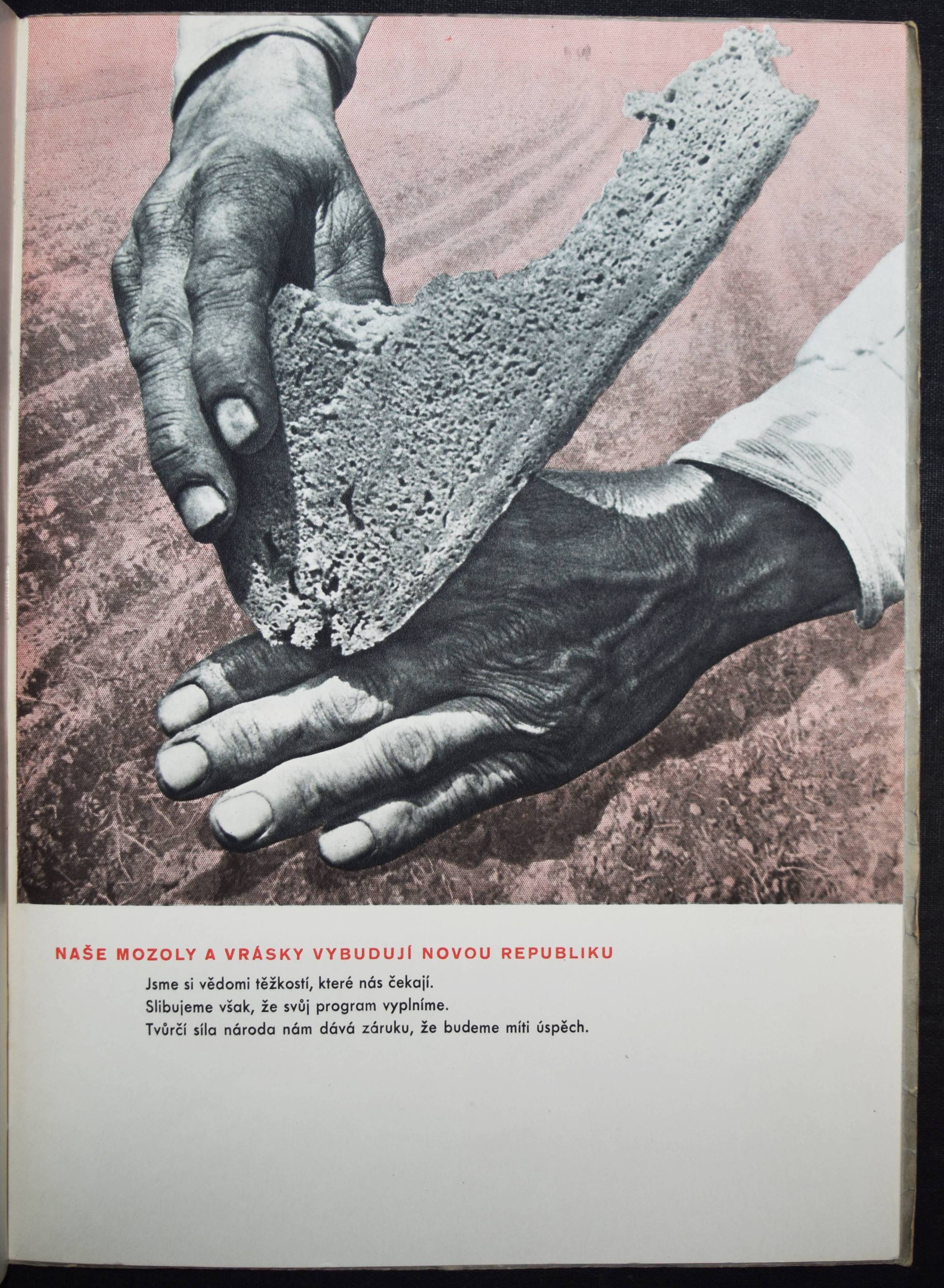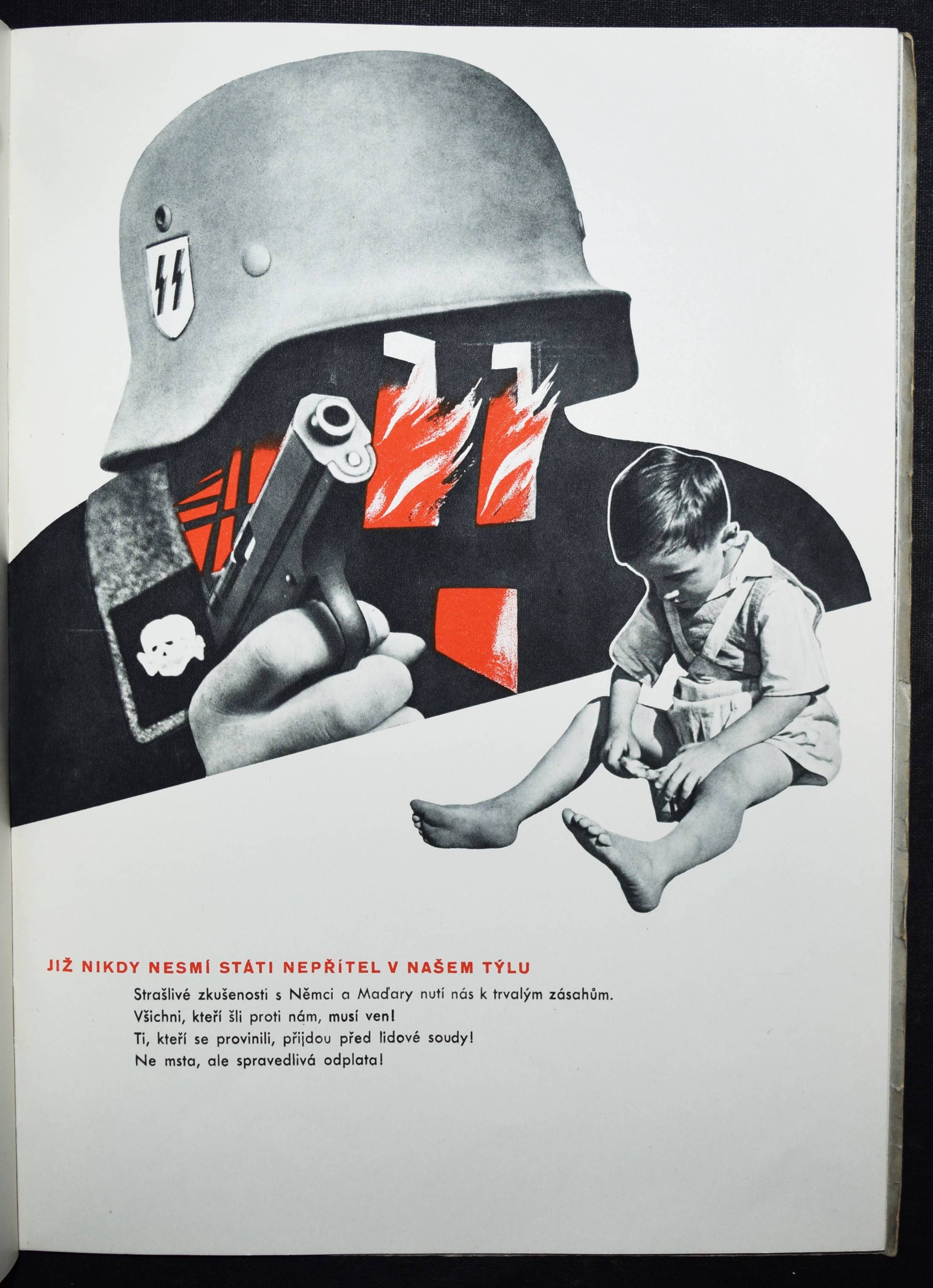 Illek & Paul, Karel Hájek, O. Stanek, K. Parik – Fierlinger, Z(denek), Václav Kopecky, B. Nemec u. a. Košický vládni Program. Program nové Ceskoslovenské vlády národni fronty cechu a slovaku. Prijaty na prvé schuzi vlády dne 1. dubna 1945 v Kosicich Praha (Prag), Svet v Obrazech (1945). 4°. [44] Bl. mit 18 (17 ganzs.) Foto-Montagen, meist in Rot und Schwarz. Farbig illustr. Orig.-Kartonumschlag. Heiting, Czech and Slovak Photo Publikations 266. – Orig.-Ausgabe des seltenen Propagandawerks der neuen tschechischen Regierung anlässlich der Beendigung der nationalsozialistischen Besetzung durch deutsche Truppen und des deutschen Protektorats Böhmen und Mähren. „Bereits am 21. Oktober 1938 hatte Hitler die Wehrmacht angewiesen, sich auf die „Erledigung der Rest-Tschechei“ vorzubereiten. Nach einem deutschen Ultimatum erklärte sich die Slowakei am 14. März 1939 für unabhängig (Slowakischer Staat). Am nächsten Tag erreichte Hitler durch die Androhung einer Bombardierung Prags, dass der bisherige tschechoslowakische Staatspräsident Emil Hácha sein Land „dem Schutz des Deutschen Reiches“ unterstellte“ (Wikipedia). – Die interessanten an J. Heartfield oder Rodtschenko erinnernden Fotomontagen wurden unter Verwendung von Aufnahmen von Alexandr Paul (1907-1981) und Frantisek Illek (1904-1969), (Illek & Paul), Karel Hájek (1900-1978), O. Stanek, K. Parik und Pressefotos gestaltet. – Rücken u. vord. Gelenk etwas berieben, sehr gutes Exemplar. – Original edition of the rare propaganda work of the new Czech government on the occasion of the end of the National Socialist occupation by German troops and the German Protectorate of Bohemia and Moravia. “On October 21, 1938, Hitler had already instructed the Wehrmacht to prepare for the “liquidation of the rest of Czechoslovakia”. Following a German ultimatum, Slovakia declared itself independent (Slovakian state) on March 14, 1939. The next day, by threatening to bomb Prague, Hitler succeeded in getting the previous Czechoslovak President Emil Hácha to place his country “under the protection of the German Reich” (Wikipedia). – The interesting photomontages, reminiscent of J. Heartfield or Rodchenko, were created using photographs by Alexandr Paul (1907-1981) and Frantisek Illek (1904-1969), (Illek & Paul), Karel Hájek (1900-1978), O. Stanek, K. Parik and press photos. – Spine and front hinge somewhat rubbed, very good copy.