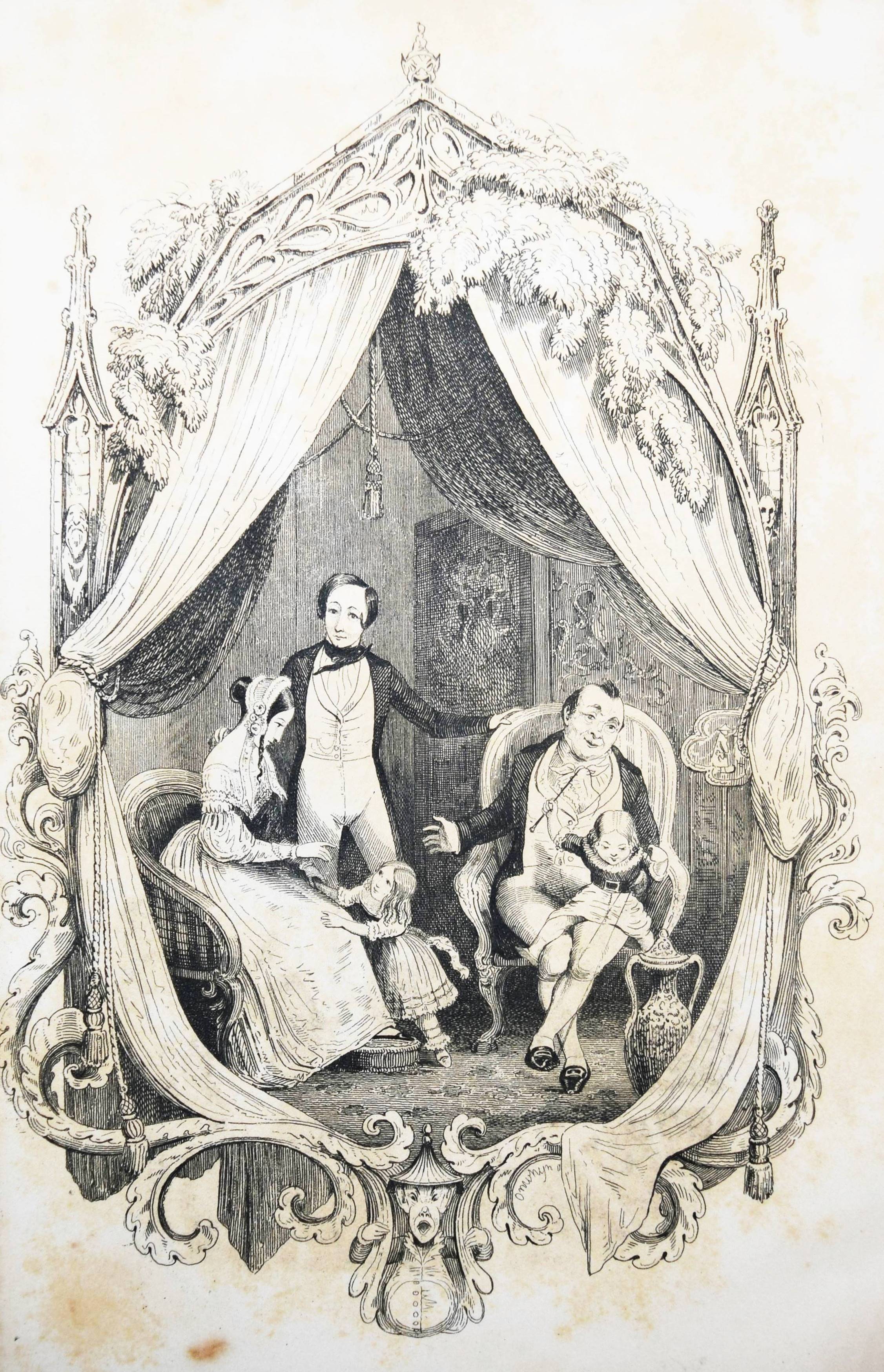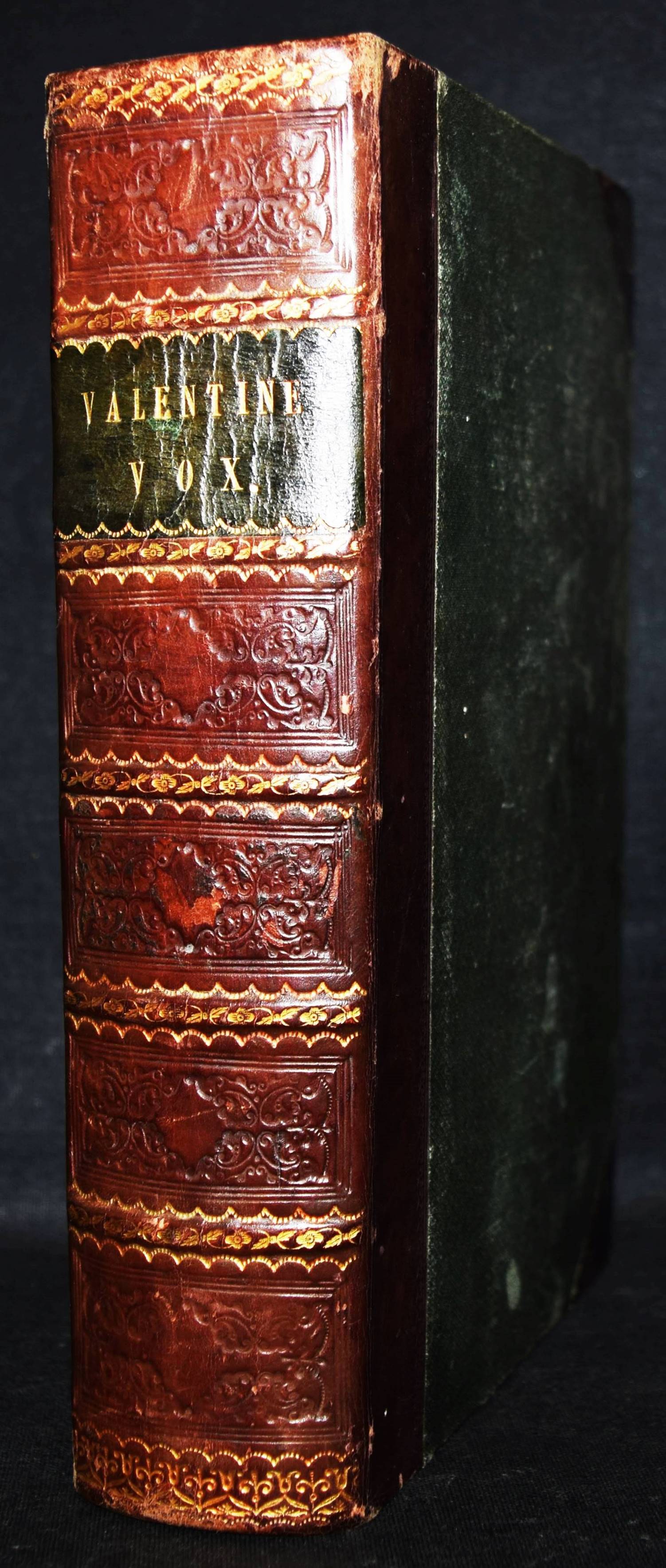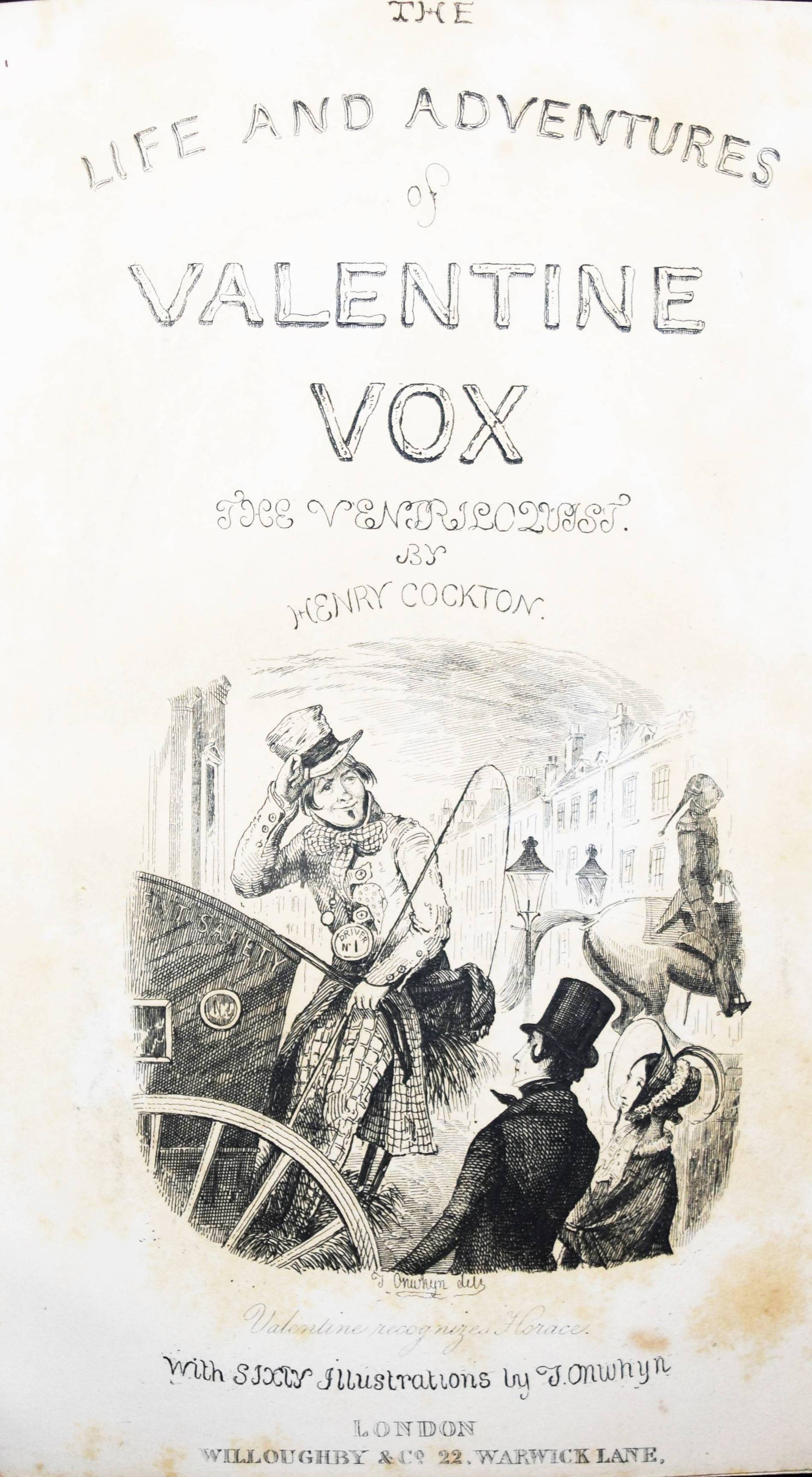 Cockton, Henry. Life and adventures of Valentine Vox, the ventriloquist. London, Willoughby and Co. 1848. 8°. XX, 620 S. mit gestoch. Frontispiz, gestoch. illustr. Titel u. 60 gestoch. Tafeln von T(homas) Onwhyn. Hldr. mit goldgepr. Rückenschild u. Rückenverg. Zweite Ausgabe. – Erschien zuerst 1839 bis 1840 in Lieferungen. – „Popularised by Charles Dickens, it was an immediate success, enjoying great popularity and acclaim. Illustrations by Thomas Onwhyn were a prominent feature of this, and most of Henry Cockton’s later novels. The first three chapters are set ‚in one of the most ancient and populous boroughs in the county of Suffolk‘, a thinly disguised Bury St. Edmunds… Valentine Vox was lauded as one of most amusing and entertaining works of the year, rivalling the popularity of Dickens’s novels“ (Wikipedia). – Frontispiz, der illustr. Titel und die Tafeln etwas fleckig, gutes dekorativ gebundenes Exemplar.