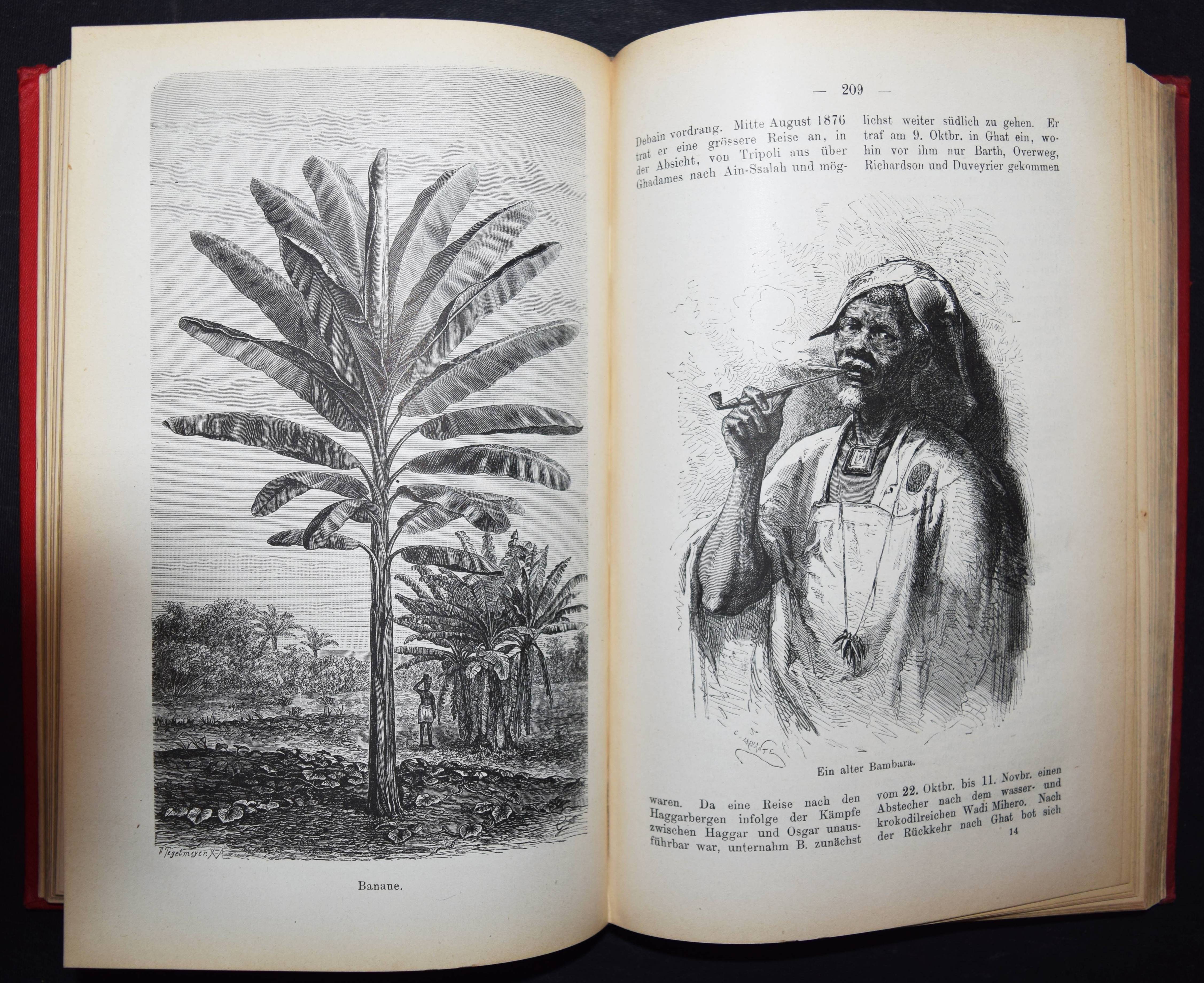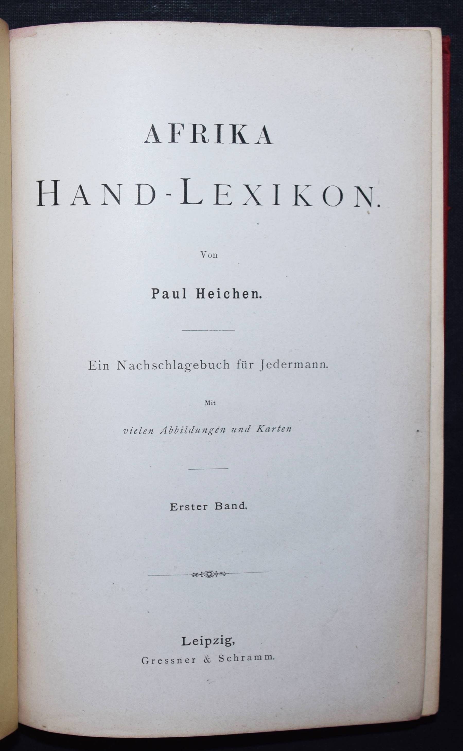 Heichen, Paul. Afrika Hand-Lexikon. Ein Nachschlagewerk für Jedermann. Erster Band (A-G, von 3). Leipzig, Gressner & Schramm (1885). 8°. IV, 480 S. mit zahlr. teils ganzs. Holzstichen u. 2 (1 doppelblattgr.) Karten. Illustr. OLn. Kainbacher³ 165. – Erste Ausgabe. – Seltenes Nachschlagewerk, nicht nur für geographische Begriffe, sondern auch für Reisende und Entdecker, Volksstämme, Tiere, Pflanzen, etc. – Einband angestaubt und am Kapital geringf. beschädigt, sonst gut erhalten.