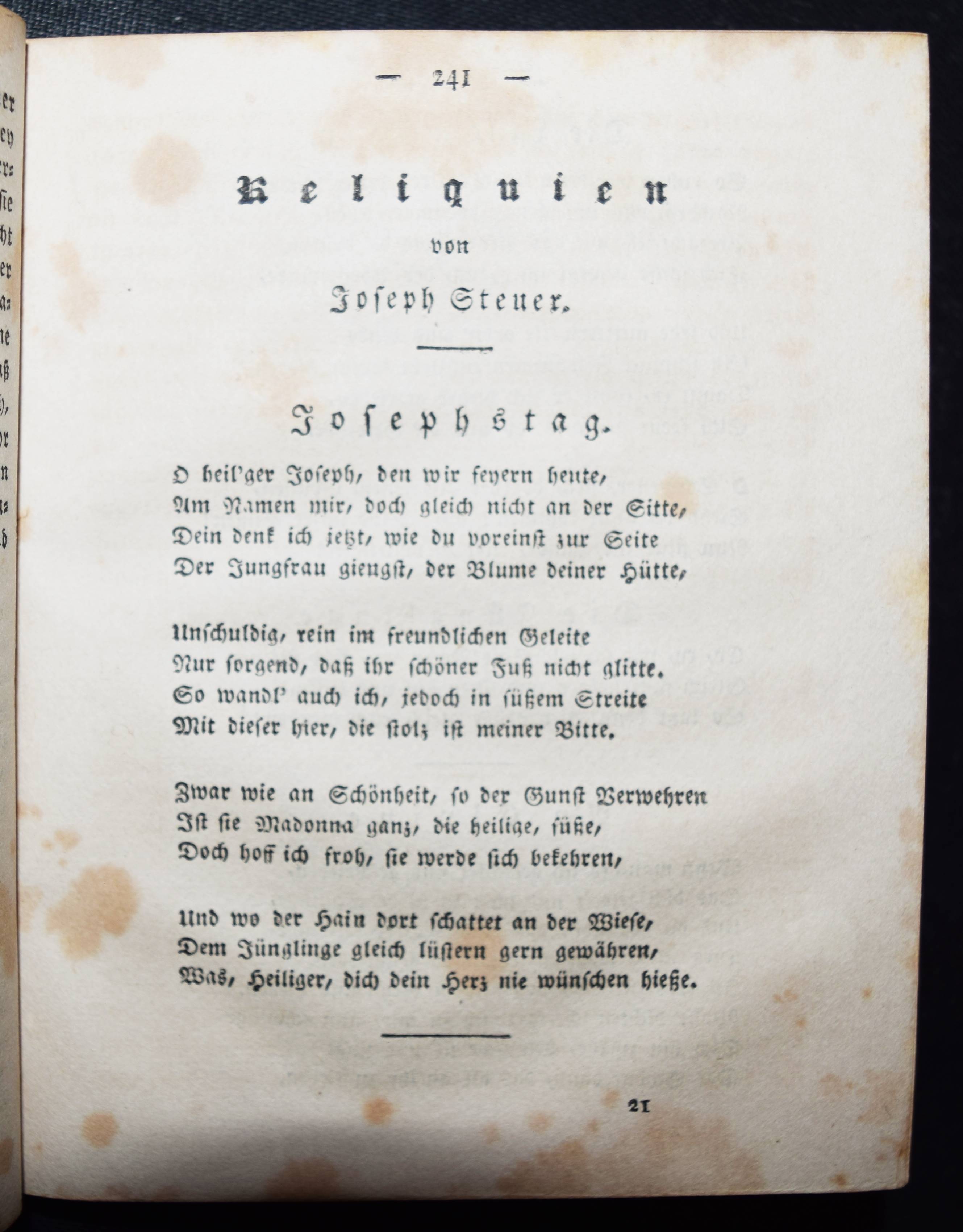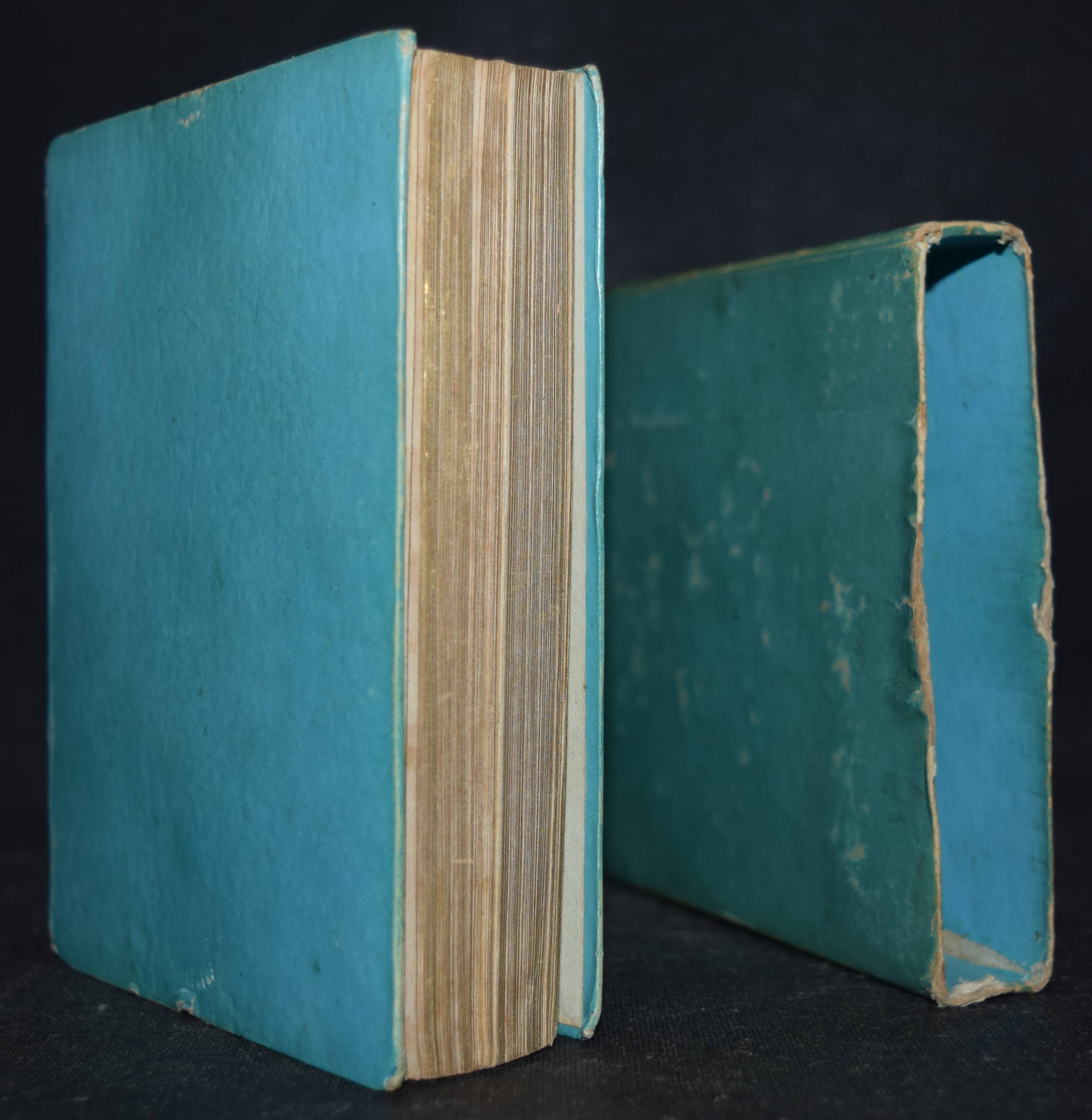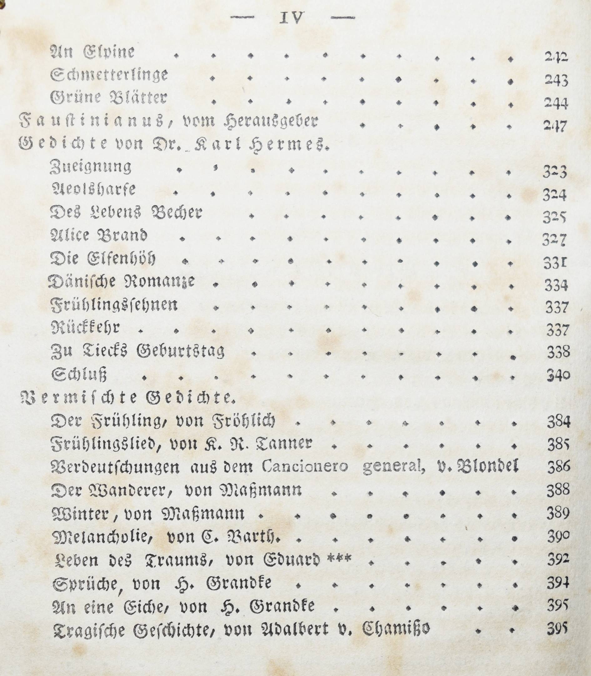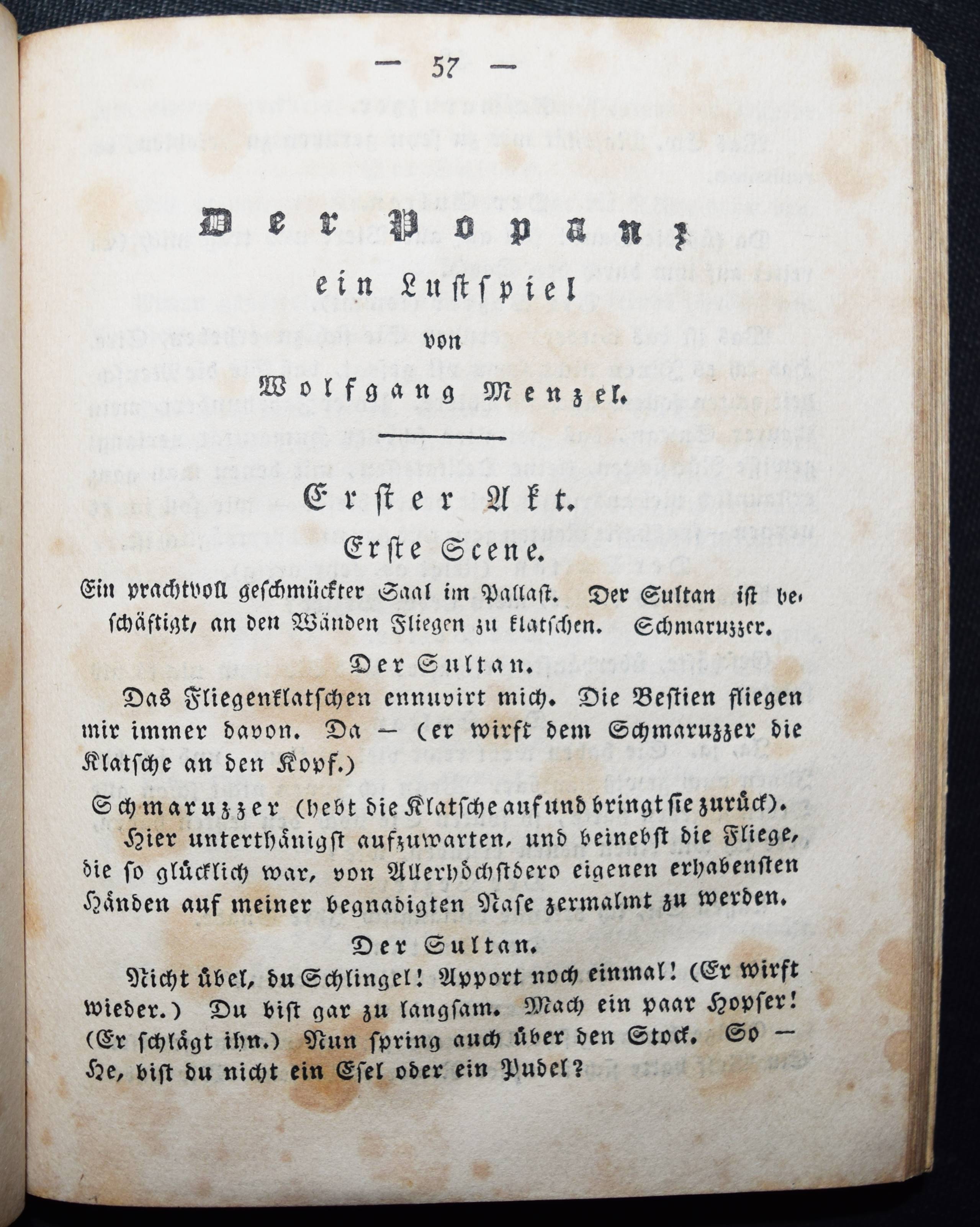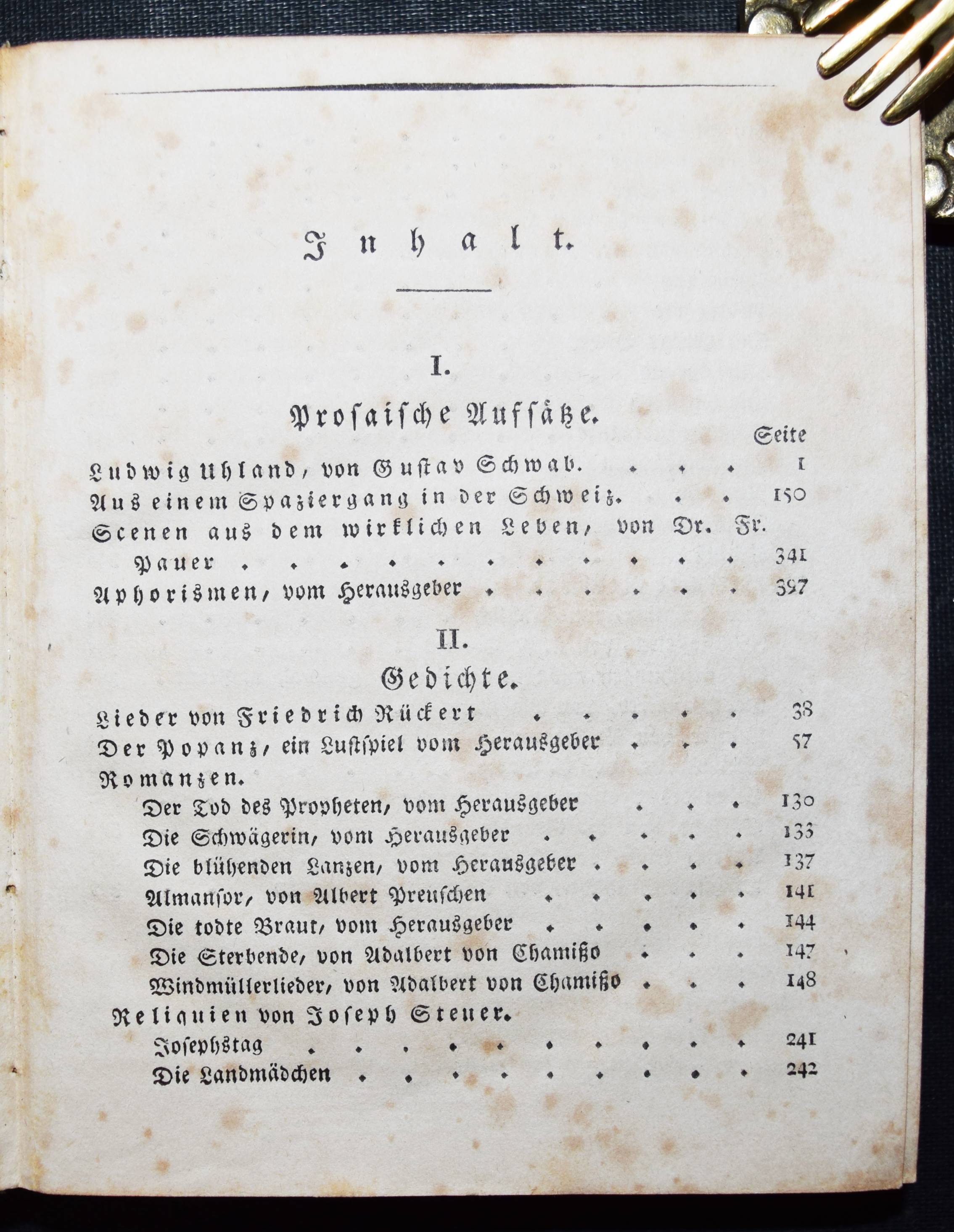 Almanach – Menzel, Wolfgang (Hrsg.). Moosrosen. Taschenbuch für 1826. Stuttgart, Metzler (1825). Kl.-8°. IV, 404 S. mit gestoch. Frontispiz (Ludwig Uhland von Karl August Schwerdgeburth) u. gestoch Titel mit Vignette. Türkisfarb. OPbd. mit Goldschnitt u. Orig.-Pappschuber. Baumgärtel 245. Goedeke VIII, 117, 292. Köhring 80. Lanckoronska-Rümann 97. Musenalm 2286. – Einziger Jahrgang dieses „interessanten Taschenbuchs … Einem Bildnis Uhlands folgt ein ausführlicher Artikel über den Dichter aus der Feder Gustav Schwabs. Wir finden 22 neue Lieder von (Friedrich) Rückert, einiges von (Adalbert v.) Chamisso und von Menzel selbst die Legende ‚Faustinus‘, nach der Kaiserchronik übersetzt. Von Menzel stammen auch einige sehr bemerkenswerte Aphorismen voll scharfer Satire: „Die Deutschen sind Steh-auf-Männchen. So oft man sie auf den Kopf stellt, fallen sie immer wieder auf den dicken Bauch zurück’“ (Lanckoronska-Rümann). – Außerdem Enthält der Almanach 21 Gedichte von Joseph Steuer, 11 Gedichte von Karl Hermes und Beträge von Friedrich Pauer, Karl Rudolf Tanner, Blondel, Hans (Johann) Ferdinand Maßmann und H. Grandke. – Schuber etwas berieben, Rücken an Kapital u. Fuß gering bestoßen, durchgehend braunfleckig und etwas gebräunt.