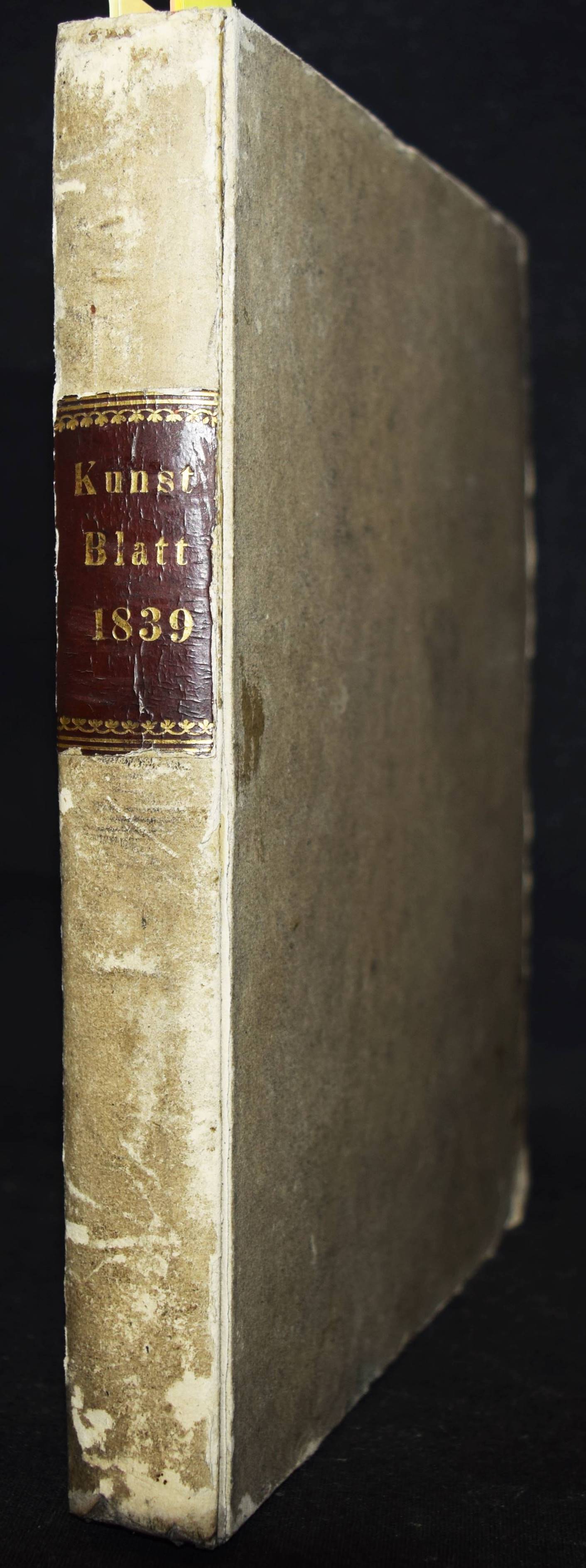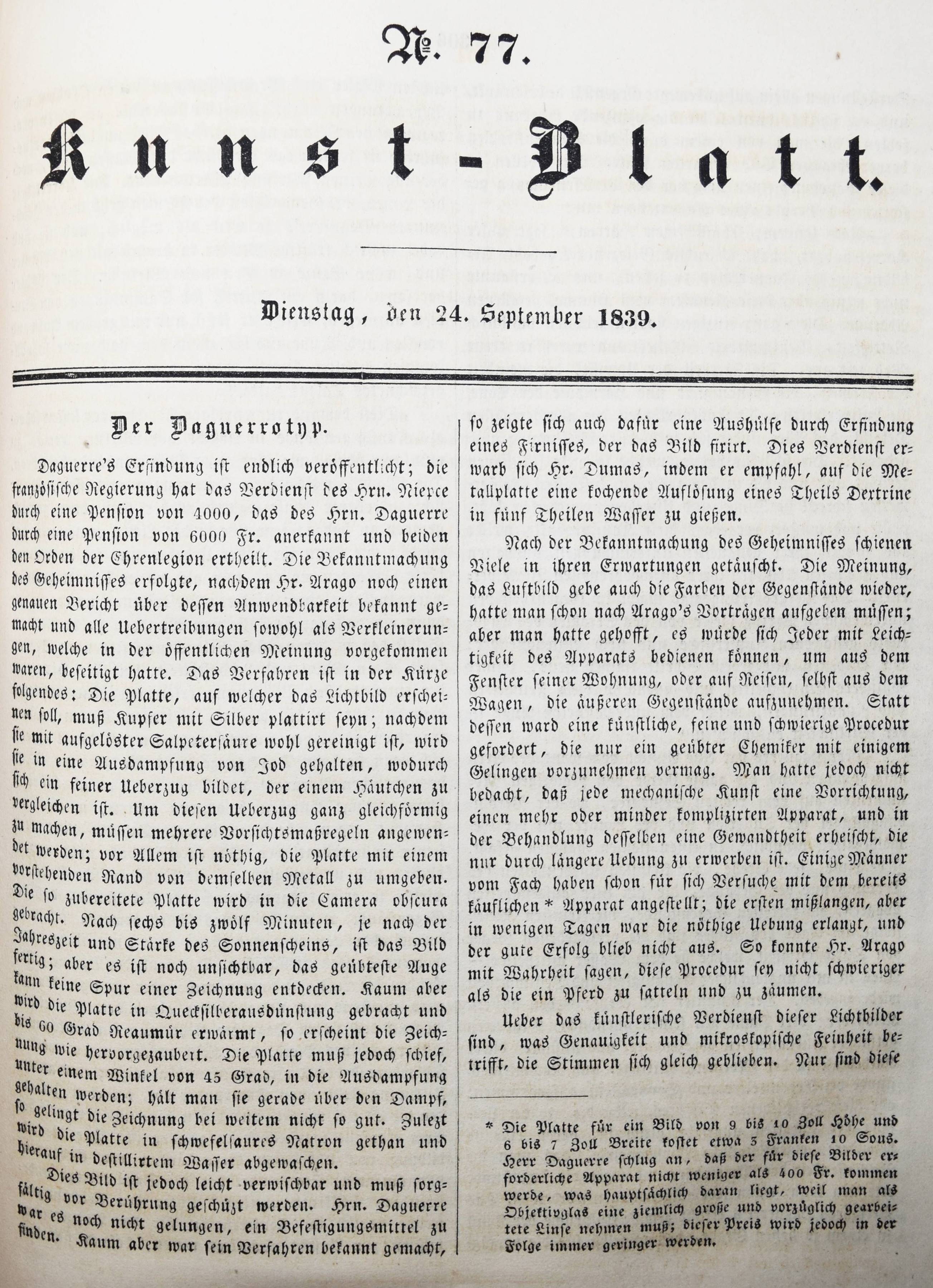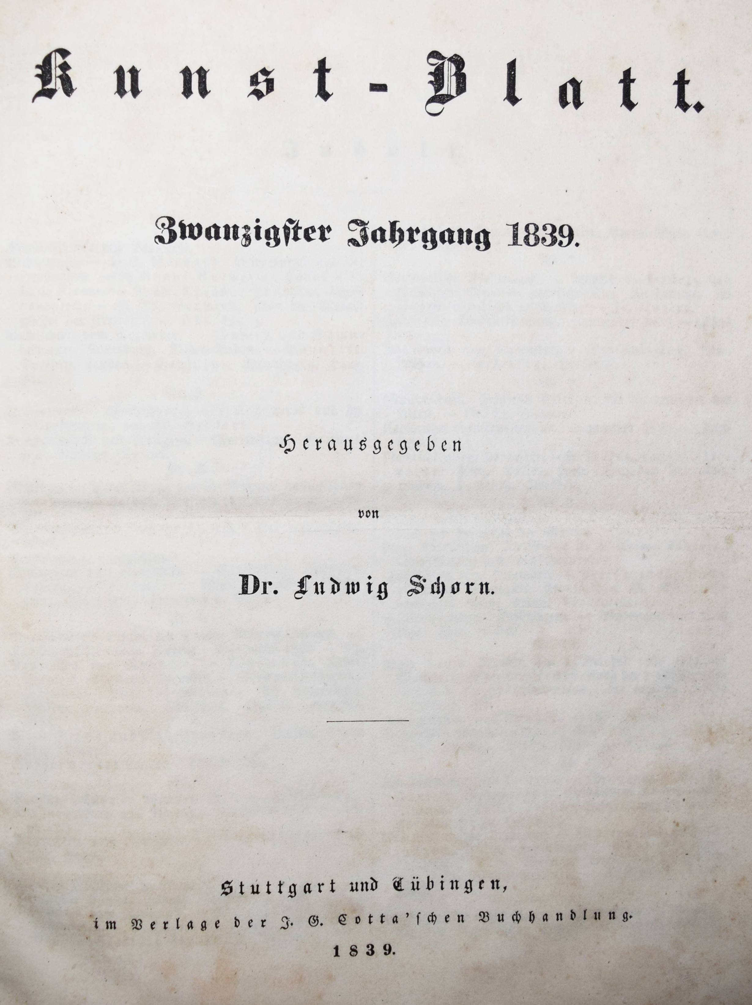 Daguerreotypie – Arago – Erste Bekanntgabe der Erfindung Daguerres durch (François Jean Dominique) Arago in der französischen Akademie der Wissenschaften am 7. Januar 1839 (21. 2. 1839, S. 62-64). Und: Prioritätsansprüche auf die Erfindung durch (William Henry Fox) Talbot, (Philipp) Hoffmeister und (Andreas Friedrich) Gerber (hier wird vermutlich zum ersten Mal der Begriff ″Photographie″ in einer deutschsprachigen Zeitschrift verwendet, 19. 3. 1839, S. 91). – Und: Bekanntgabe der Herstellung eines Daguerrotypes durch den Dresdner Arzt und Chemiker Petzold und Ansprüche des Engländers (Francis) Bauer an der Erfindung von (Joseph Nicéphore) Niépce (18. 4. 1839, S. 127 u. 128 ). – Und: Dioramabrand vom 8. März (23. 4. 1839, S. 132). – Und: (Schorn, Ludwig u. Eduard Koloff). Das Daguerrotyp (24. 9. 1839, S. 305-308 u. 17. 12. 1839, S. 401-403). – In: Kunst-Blatt. Zwanzigster Jahrgang 1839. Herausgegeben von Ludwig Schorn. Stuttgart u. Tübingen, Cotta 1839. Gr.-8°. 10, 420 S. mit 3 (statt 4 ?, 1 gefalt.) Kupfertafeln (nicht zu den Artikeln über Daguerre). Pappband der Zeit mit goldgepr. Rückenschild. Kemp, Theorie der Fotografie I, 55 (mit Abdruck der Artikel „Der Daguerrotyp“). – Erster ausführlicher Zeitschriftenartikel über die Daguerreotypie und die erste Ankündigung von Daguerres Erfindung durch Aragon in Deutschland. – Die Kunst-Zeitschrift enthält noch zahlreiche weitere Artikel zur Daguerreotypie: S. 60, 128, 168, 196, 232, 235, 240, 256, 296, 339, 340, 344, 372, 380, 387, 406-407, 412 u. 415. – „Die zeichnenden Künste haben von dem Daguerrotyp in seiner Jetzigen Ausbildung nicht zu befürchten: es fehlt seinen Erzeignissen die höchste Schönheit eines Kunstwerks, die Seele, der Sinn und Geist des Künstlers…“ (S. 402). – „Durch eine kurze Mitteilung in der Académie des Sciences am 7. Januar 1839 verlieh Arago der Erfindung eine Art offiziellen Status. … Die Nachricht von Daguerres aufsehenerregender Erfindung verbreitete sich im Januar 1839 wie ein Lauffeuer über Europa; noch in den kleinsten Provinzblättern wurde abgeschrieben, was die führenden Zeitungen gemeldet hatten. Die allgemeine Neugier wurde immer wieder neu entfacht durch Gerüchte und Richtigstellungen über die Methode der Daguerreotypie. Sie wurde von den Pariser Korrespondenten mit großem Eifer verbreitet, wobei auch Daguerre selbst, der einen ausgeprägten Sinn für Publikumswirksamkeit besaß, nicht untätig blieb“ (H. Gernsheim, Geschichte der Photographie, S. 58 u. 82). – Der Pariser Korrespondent des Kunst-Blatt Eduard Koloff (1811-1879), war, neben Heinrich Heine, der bedeutendste deutsche Kunstkritiker in Paris. – Einband berieben, etwas bestoßen und stärker angestaubt, eine gefaltete Tafel am Schluß hier nicht beigebunden, stellenweise teils stärker gebräunt (die relevanten Artikel jedoch nicht betroffen), sonst gut erhalten.