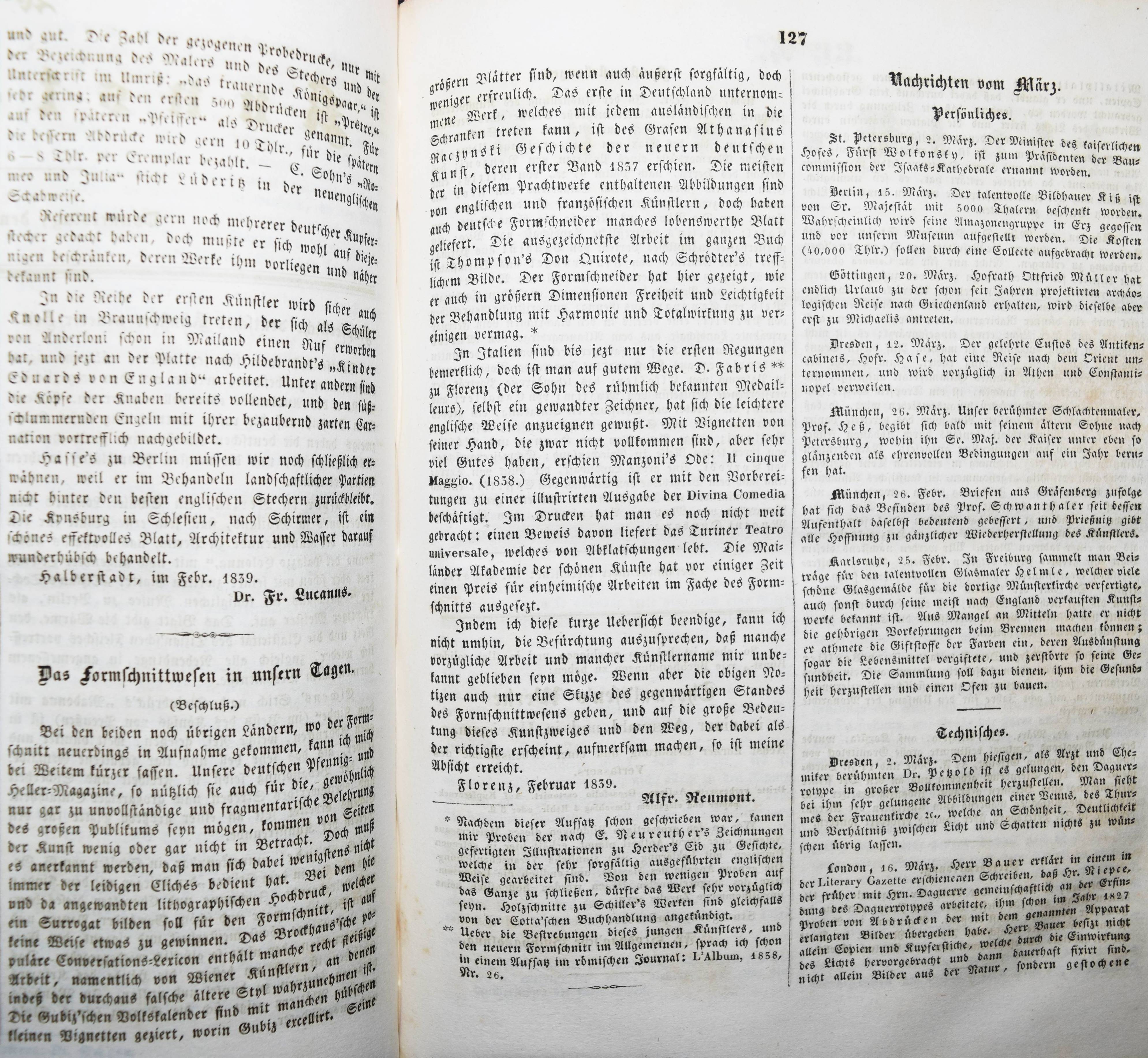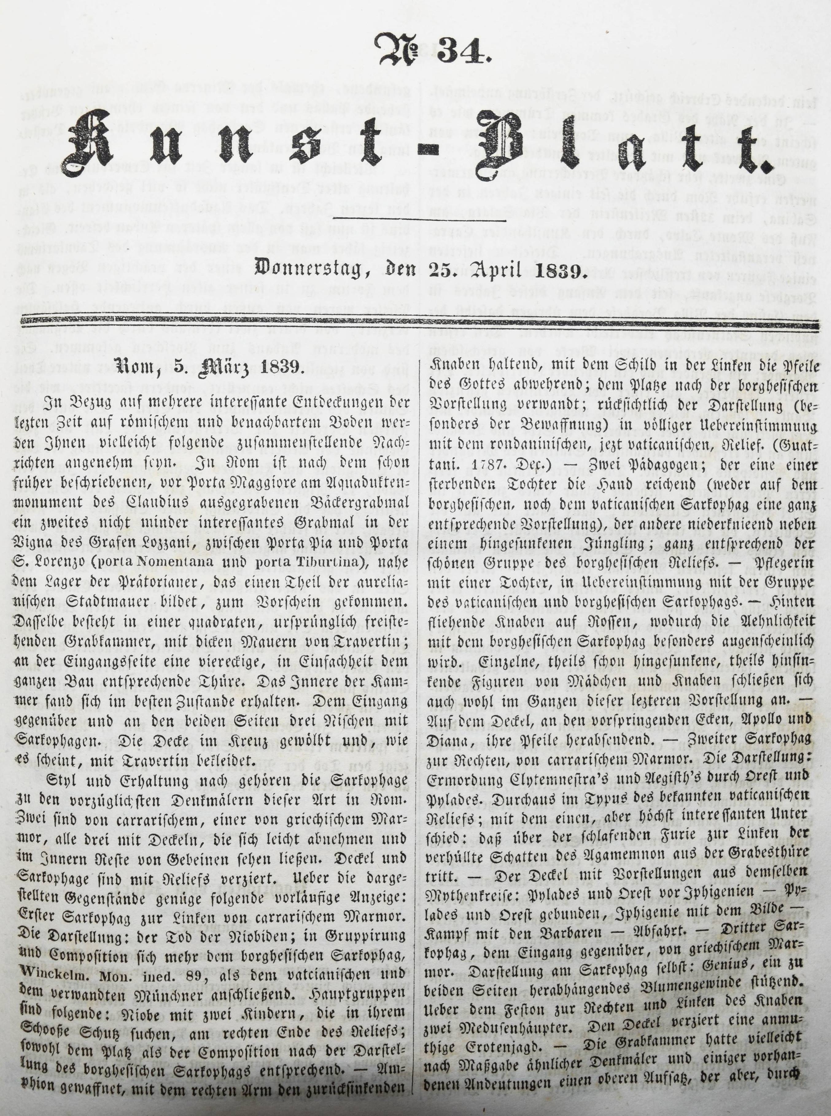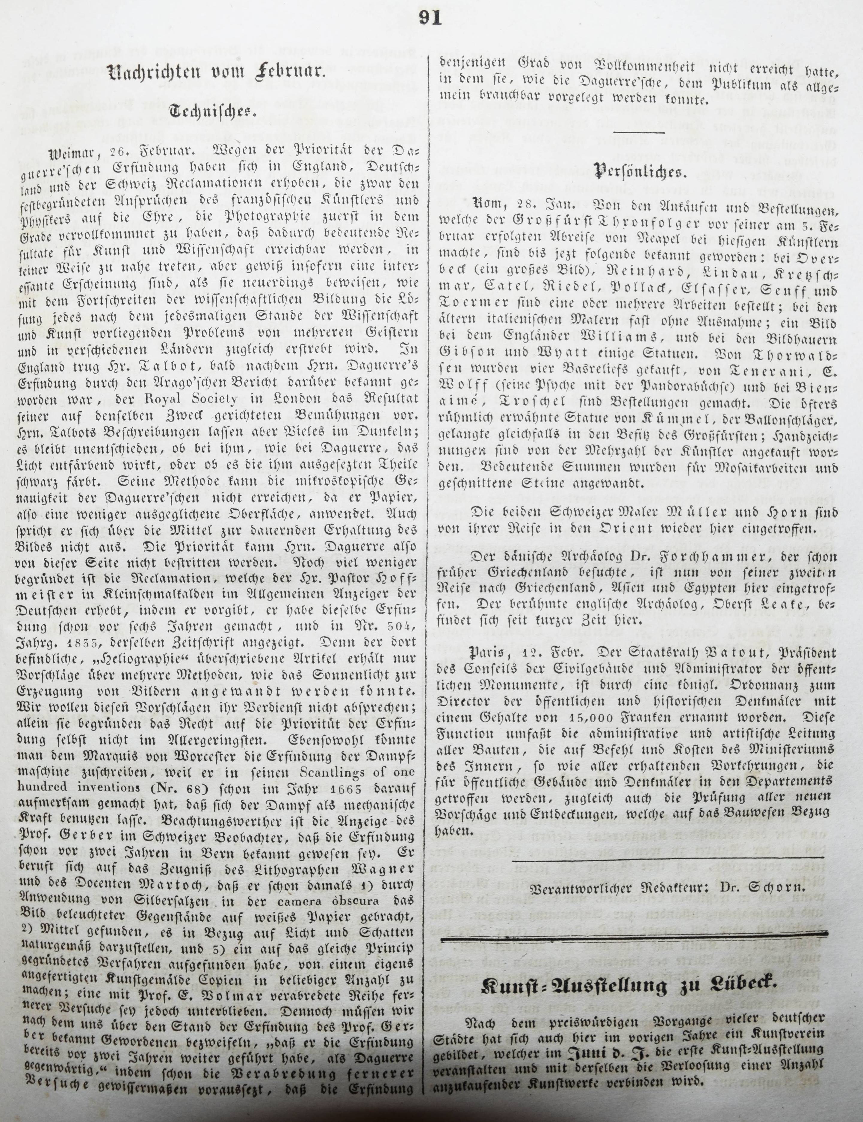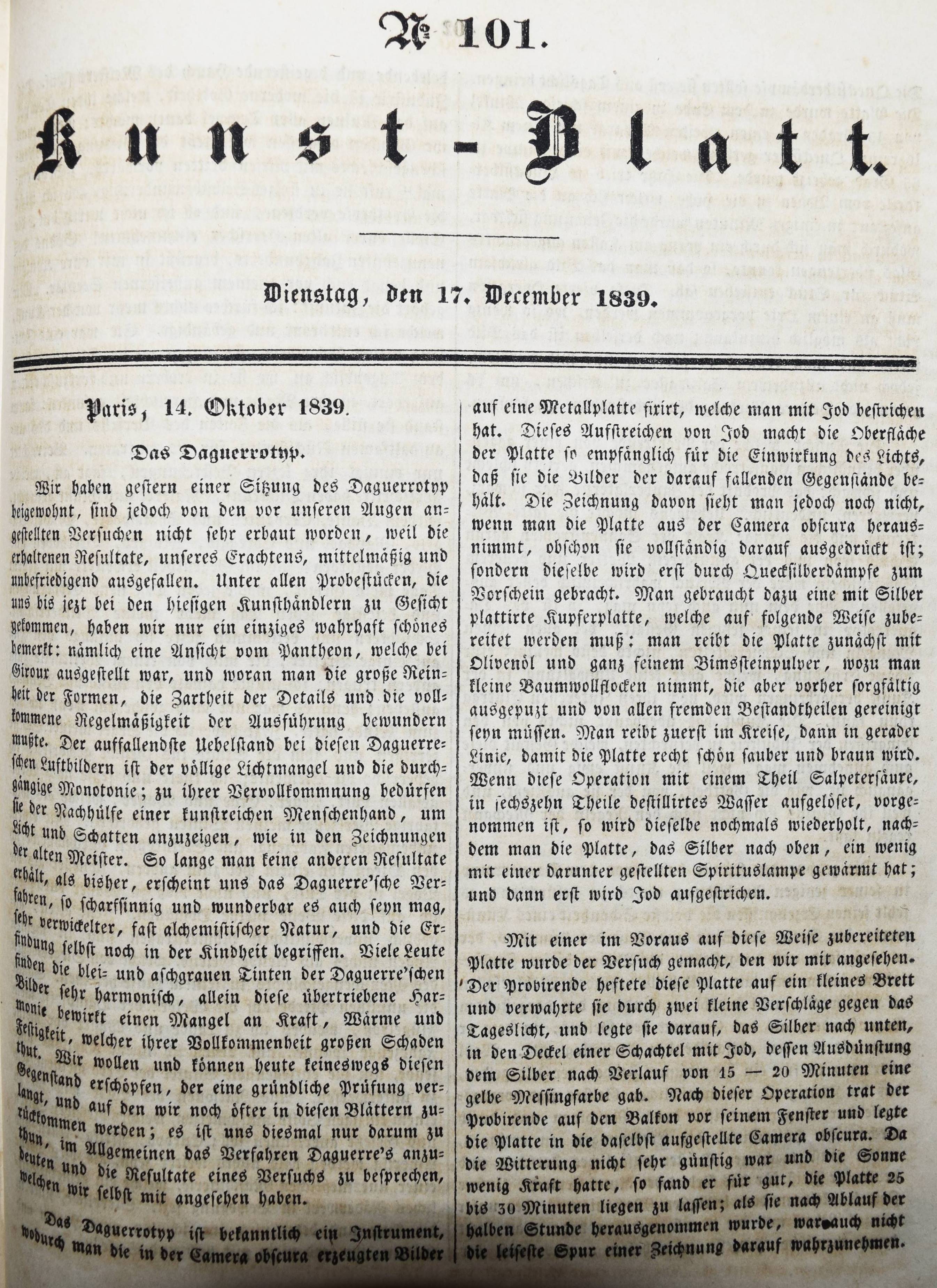 Daguerreotypie – Arago – Erste Bekanntgabe der Erfindung Daguerres durch (François Jean Dominique) Arago in der französischen Akademie der Wissenschaften am 7. Januar 1839 (21. 2. 1839, S. 62-64). Und: Prioritätsansprüche auf die Erfindung durch (William Henry Fox) Talbot, (Philipp) Hoffmeister und (Andreas Friedrich) Gerber (hier wird vermutlich zum ersten Mal der Begriff ″Photographie″ in einer deutschsprachigen Zeitschrift verwendet, 19. 3. 1839, S. 91). – Und: Bekanntgabe der Herstellung eines Daguerrotypes durch den Dresdner Arzt und Chemiker Petzold und Ansprüche des Engländers (Francis) Bauer an der Erfindung von (Joseph Nicéphore) Niépce (18. 4. 1839, S. 127 u. 128 ). – Und: Dioramabrand vom 8. März (23. 4. 1839, S. 132). – Und: (Schorn, Ludwig u. Eduard Koloff). Das Daguerrotyp (24. 9. 1839, S. 305-308 u. 17. 12. 1839, S. 401-403). – In: Kunst-Blatt. Zwanzigster Jahrgang 1839. Herausgegeben von Ludwig Schorn. Stuttgart u. Tübingen, Cotta 1839. Gr.-8°. 10, 420 S. mit 3 (statt 4 ?, 1 gefalt.) Kupfertafeln (nicht zu den Artikeln über Daguerre). Pappband der Zeit mit goldgepr. Rückenschild. Kemp, Theorie der Fotografie I, 55 (mit Abdruck der Artikel „Der Daguerrotyp“). – Erster ausführlicher Zeitschriftenartikel über die Daguerreotypie und die erste Ankündigung von Daguerres Erfindung durch Aragon in Deutschland. – Die Kunst-Zeitschrift enthält noch zahlreiche weitere Artikel zur Daguerreotypie: S. 60, 128, 168, 196, 232, 235, 240, 256, 296, 339, 340, 344, 372, 380, 387, 406-407, 412 u. 415. – „Die zeichnenden Künste haben von dem Daguerrotyp in seiner Jetzigen Ausbildung nicht zu befürchten: es fehlt seinen Erzeignissen die höchste Schönheit eines Kunstwerks, die Seele, der Sinn und Geist des Künstlers…“ (S. 402). – „Durch eine kurze Mitteilung in der Académie des Sciences am 7. Januar 1839 verlieh Arago der Erfindung eine Art offiziellen Status. … Die Nachricht von Daguerres aufsehenerregender Erfindung verbreitete sich im Januar 1839 wie ein Lauffeuer über Europa; noch in den kleinsten Provinzblättern wurde abgeschrieben, was die führenden Zeitungen gemeldet hatten. Die allgemeine Neugier wurde immer wieder neu entfacht durch Gerüchte und Richtigstellungen über die Methode der Daguerreotypie. Sie wurde von den Pariser Korrespondenten mit großem Eifer verbreitet, wobei auch Daguerre selbst, der einen ausgeprägten Sinn für Publikumswirksamkeit besaß, nicht untätig blieb“ (H. Gernsheim, Geschichte der Photographie, S. 58 u. 82). – Der Pariser Korrespondent des Kunst-Blatt Eduard Koloff (1811-1879), war, neben Heinrich Heine, der bedeutendste deutsche Kunstkritiker in Paris. – Einband berieben, etwas bestoßen und stärker angestaubt, eine gefaltete Tafel am Schluß hier nicht beigebunden, stellenweise teils stärker gebräunt (die relevanten Artikel jedoch nicht betroffen), sonst gut erhalten.