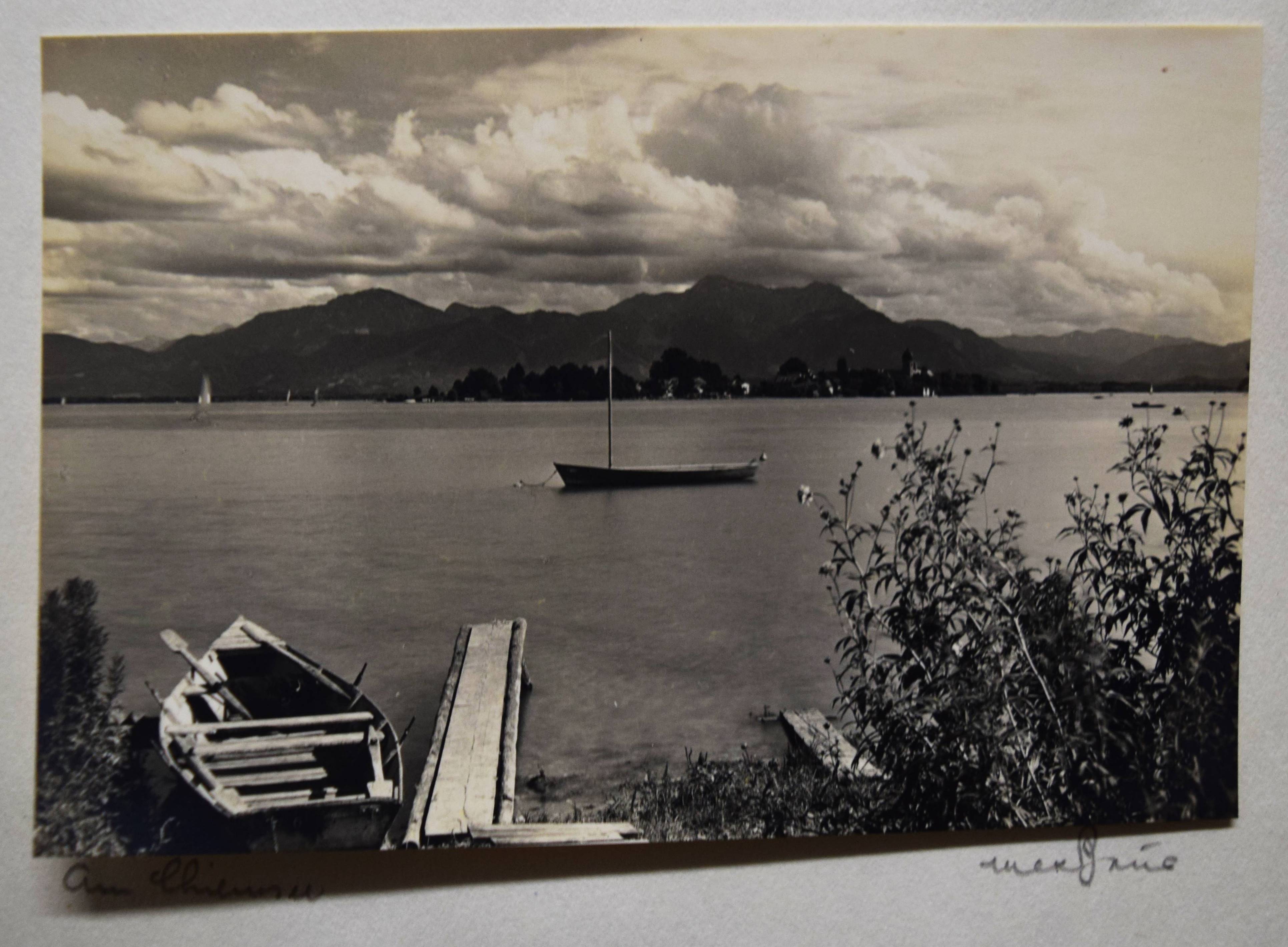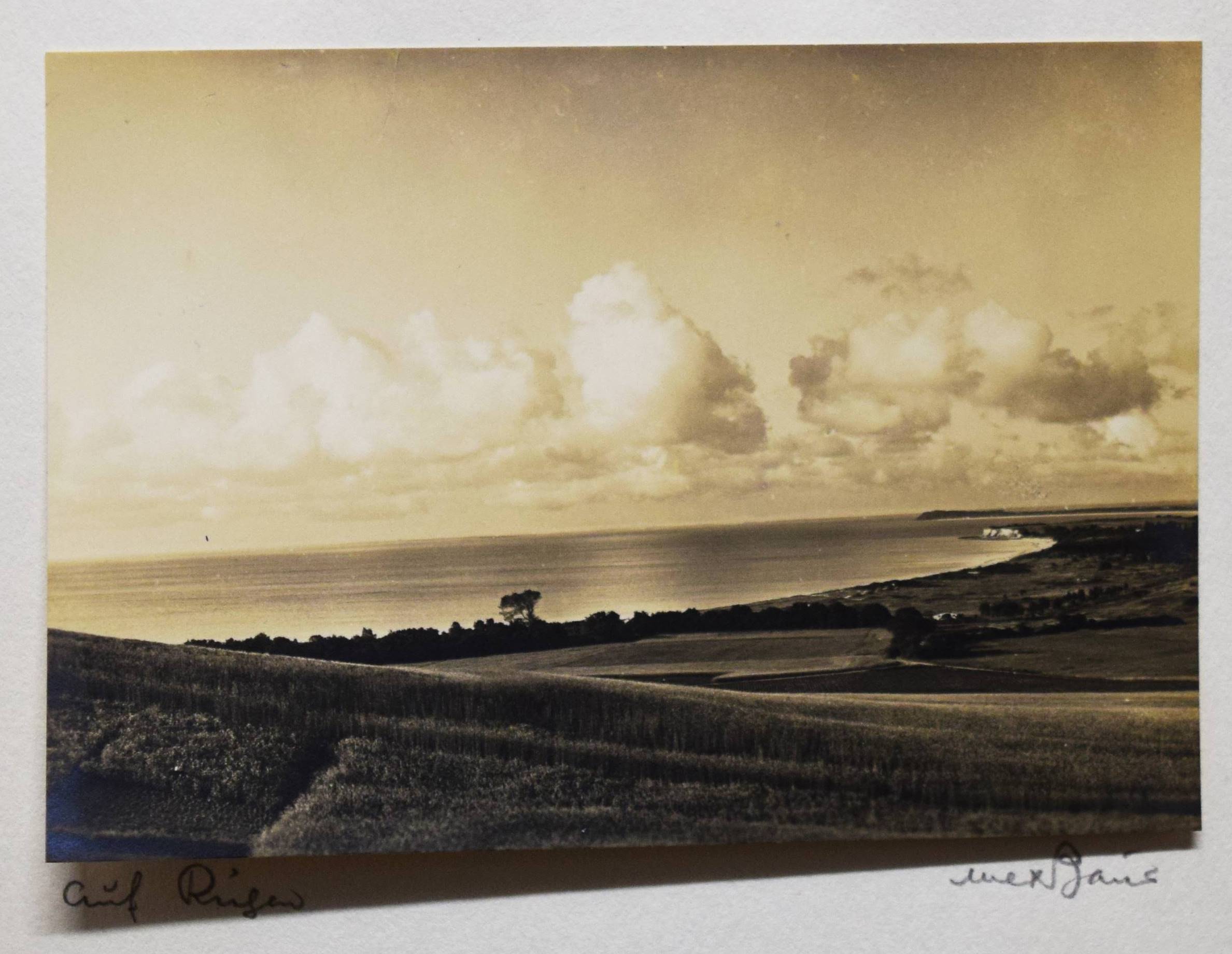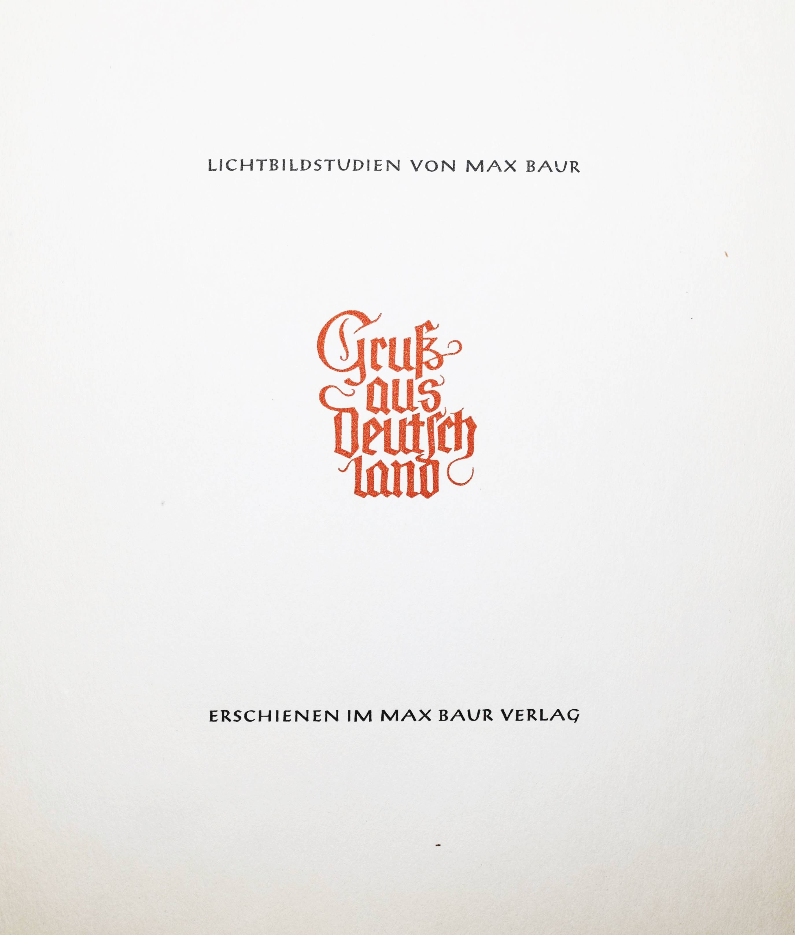 Baur, Max. Gruß aus Deutschland. Lichtbildstudien. (Aschau im Chiemgau), Selbstverlag um 1955. 8°. Titelblatt u. 12 signierte mont. Orig.-Photographien (8 x 11 cm., Quer- u. Hochformat). Orig.-Pappflügelmappe mit Deckelschild. Wohl in kleiner Auflage hergestellter Privatdruck. – Alle Aufnahmen sind von M. Baur eigenhändig bezeichnet und signiert. – Dazu: Ders. Hiddensee. O. O. um 1955. 10 mont. Orig.-Photographien (9 x 6 cm.) in Orig.-Flügelmappe mit Deckelschild (15,5 x 12,5 cm.). – Der bayerische Fotograf M. Baur (1898-1988) studierte nach seiner Buchhändler-Ausbildung Kunstwissenschaft an der Universität München. 1928 gründete einen Postkarten- und Kalender-Verlag und war Geschäftsführer eines Fotoateliers in Wernigerode. 1930 legte er seine Meisterprüfung ab und wurde in die Gesellschaft Deutscher Lichtbildner aufgenommen. Von 1934 bis 1953 arbeitete Baur in Potsdam. In dieser Zeit entstehen seine wichtigsten fotografischen Arbeiten. Wichtig sind besoders seine Landschafts- und Architekturserien. 1954 bis zu seinem Tod lebte Baur in Aschau, wo er auch ein Fotogeschäft betrieb. Seine Arbeiten sind in zahlreichen öffentlichen Sammlungen vertreten. 1998 wurde sein Werk in einer großen Werkschau im Potsdam Museum präsentiert und 2001 erschien: „Max Baur – Photographien 1925-1960“ im Stemmle-Verlag, Zurich. – Mappe am Fuß etwas eingerissen, sonst tadellos – Zusammen 2 Flügelmappen.