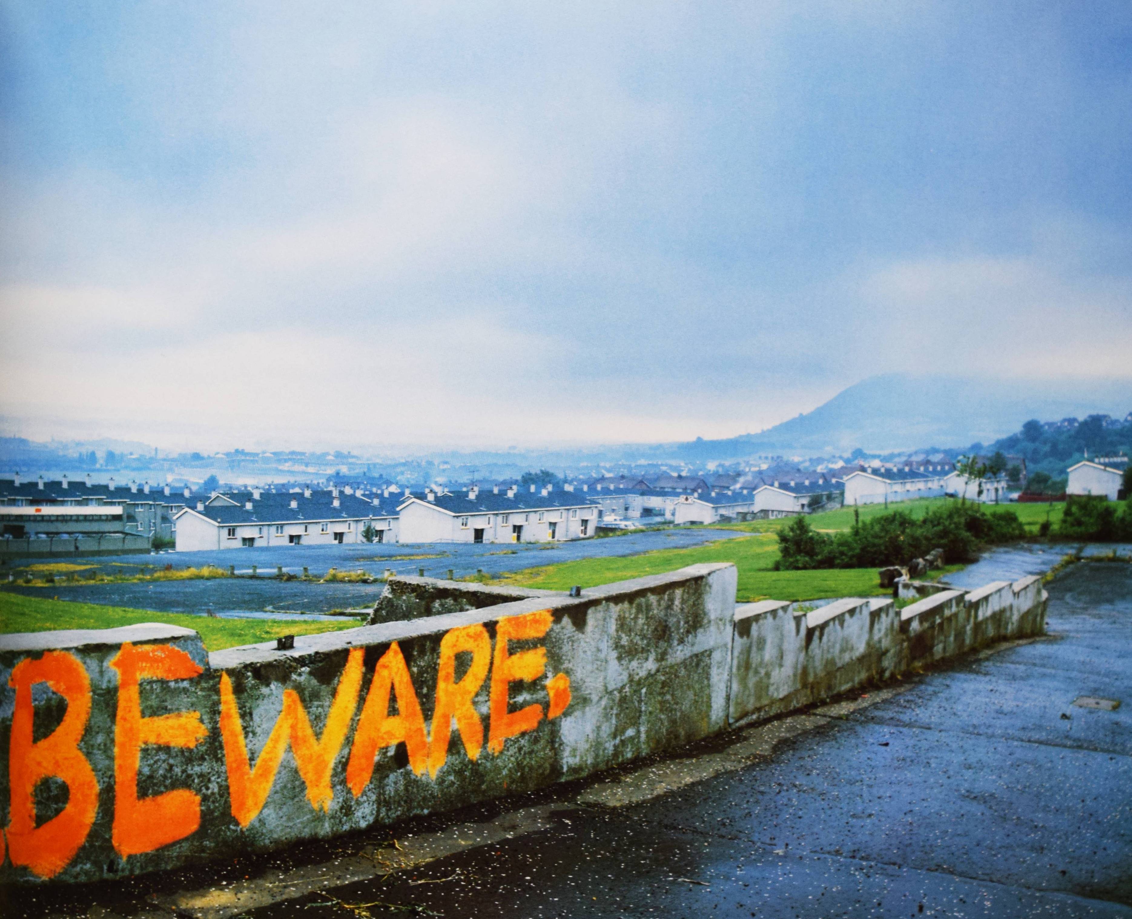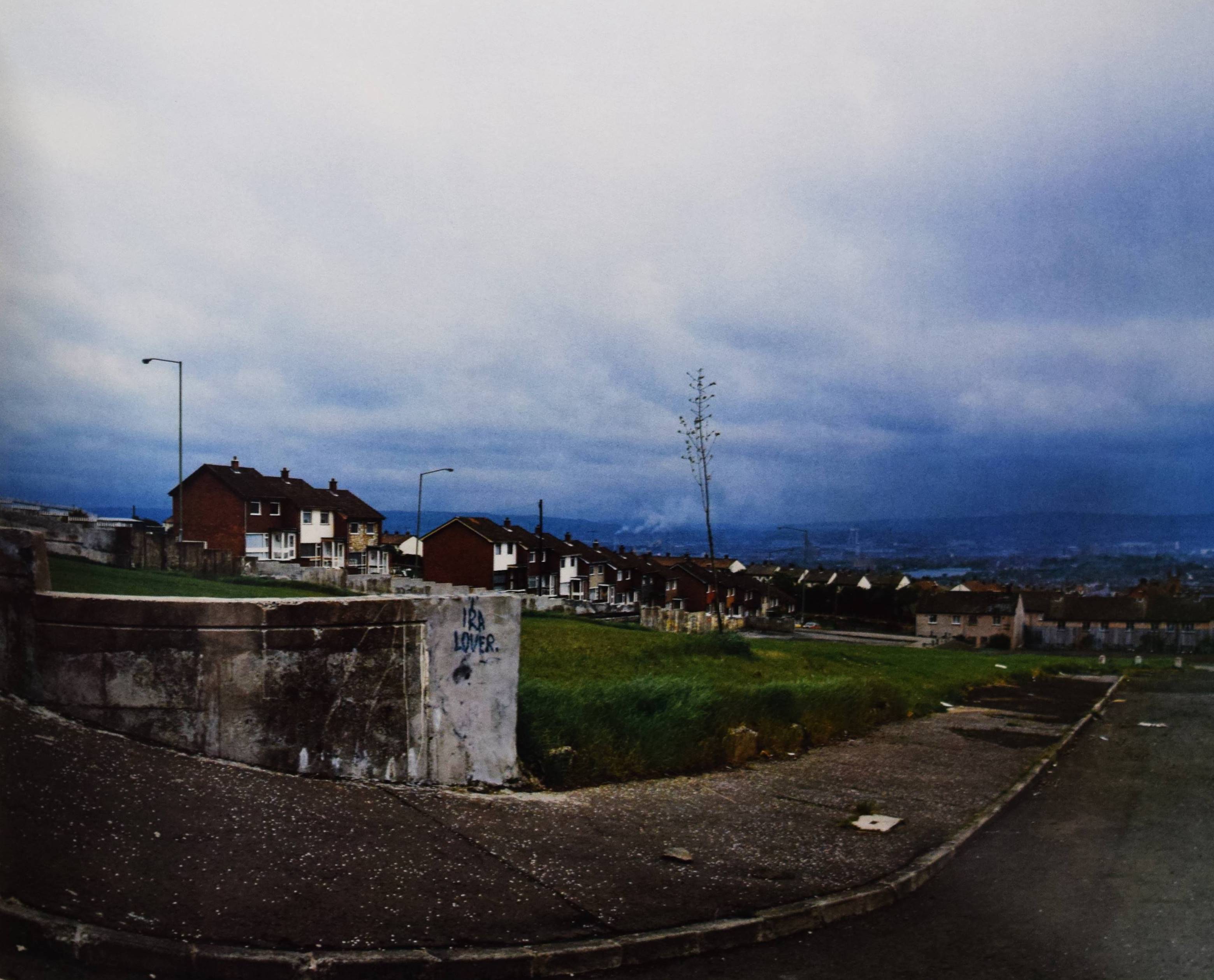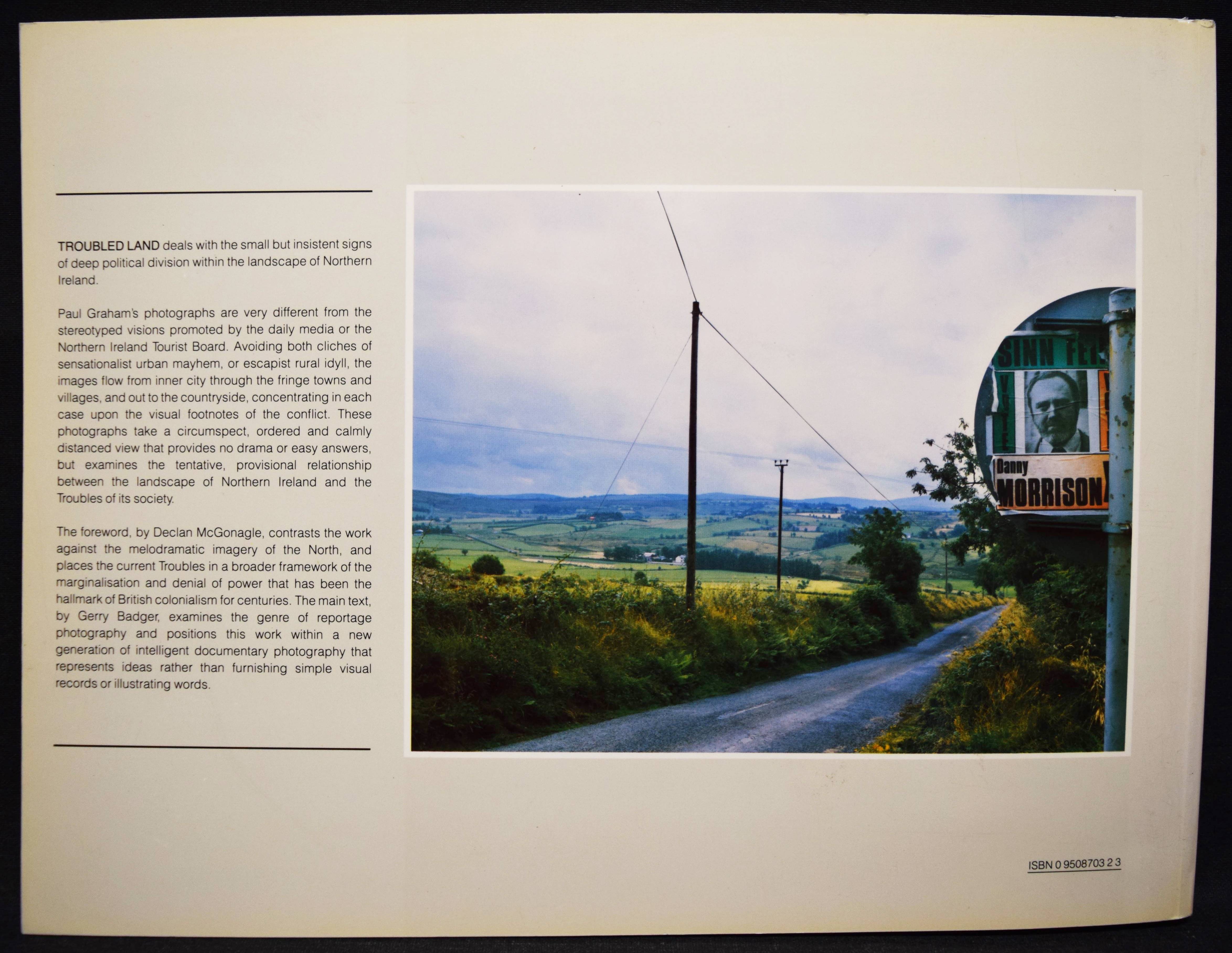 Graham, Paul. Troubled land. The social landscape of Northern Ireland. London, Grey Editions 1987. Quer-4°. [36] Bl. mit 32 Farbtafeln. Farbig illustr. OKart. Erste Ausgabe. – „The third book by English photographer Paul Graham concentrates on land and cityscapes of Northern Ireland, showing with understatement, the small but persistent signs of deep political unrest within the region. From grafitti paint spelling out IRA to political signs and flags, Graham gives us a perspective of the land seldom seen. No out-and-out violence is shown here, just the subtle reminders of a land troubled with seemingly unending political turmoil and division. Each of these color photographs includes these reminders in a straight, documentary fashion to give us a real look at the day-to-day landscape of Northern Ireland. Highly recommended“ (lensculture). – Tadellos.
