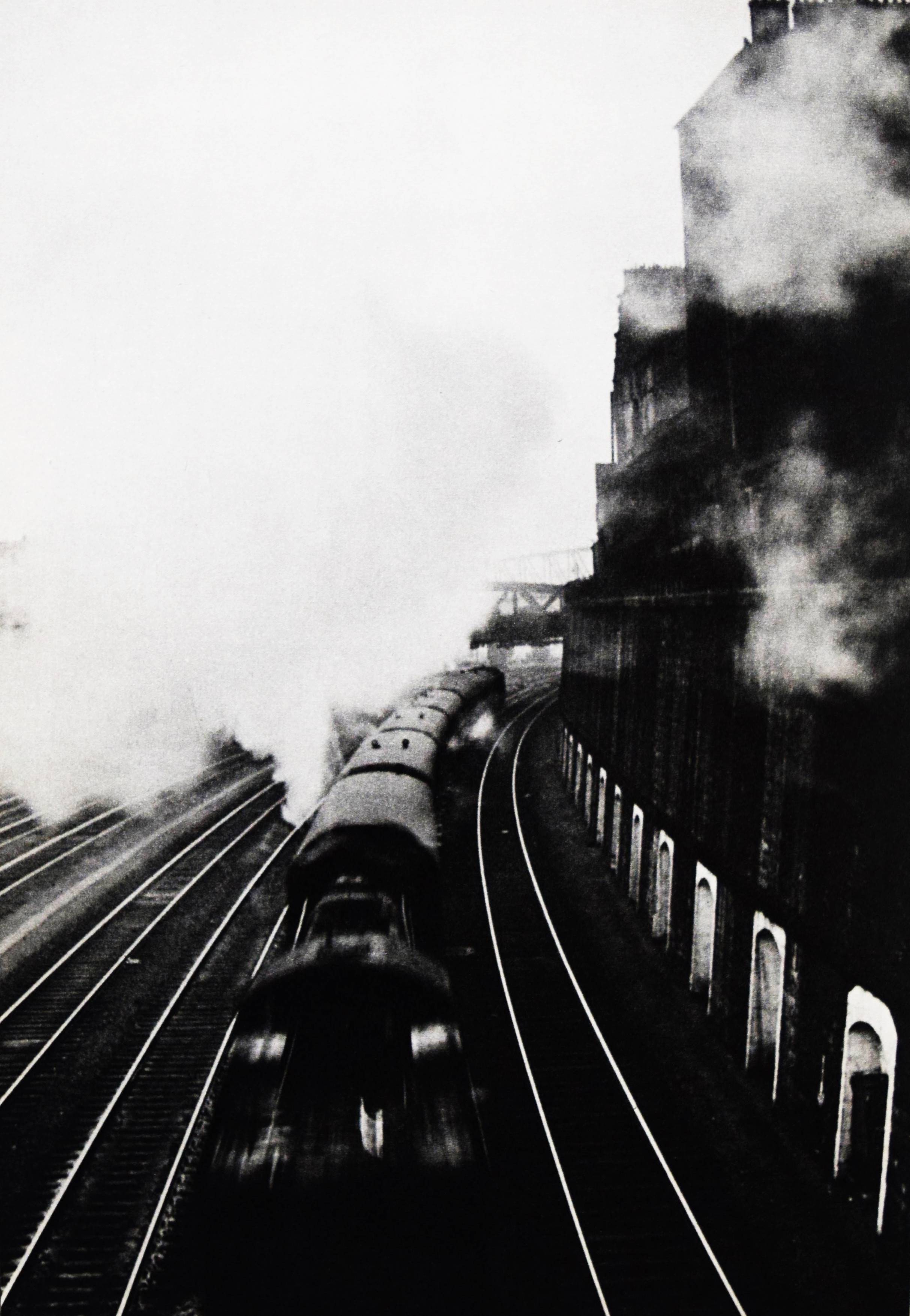Groebli, René. Magie der Schiene. Fotos: René Groebli. Gedicht: Albert Ehrismann. (Nachwort von Hans Ulrich Gasser). Zürich, Kubus-Verlag (1949). Gr.-8°. Portfolio, [8] Doppelbl. mit 12 ganzseit. u. 2 doppelblattgr. Abb. Illustr. Karton-Umschlag mit Bauchbinde (Buchschleife). Auer 335. Heidtmann 12417. Koetzle 176 f. The Open Book 152 f. Parr/Badger I, 204. Schweizer Fotobücher 162 ff. – Eines von 700 num. Exemplaren (GA 1000 Exemplare). – Von R. Groebli im Druckvermerk signiert. – „Die 24 x 18 Zentimeter grosse Mappe … gilt als Meilenstein der Schweizer Nachkriegsfotografie und Fotobuchgestaltung. Schon die rasant bewegungsverwischte Titelfotografie auf dem Umschlag zieht den Betrachter in ihren Bann: Liest man das Motiv der schnellen Einfahrt eines Zugs in das Halbrund eines gähnend schwarzen Tunnels umgekehrt, also als befreiende Ausfahrt aus dem dunkel ans Licht (was auch eine legitime Interpretation des Bildes wäre), so hat man eine starke Metapher für den Aufbruch der jungen Schweizer Fotografie ab 1975 nach der Zeit des Eingeschlossenseins während des Krieges. Eine Generation von Fotografierenden wollte den eingeschränkten Bewegungsradius ausdehnen und begann, international auf Reisen zu fotografieren. Sie suchte dabei auch auf zeitgemässe Weise an die grosse Tradition einer berichtenden Fotografie anzuknüpfen, die in der Schweiz unter anderem bereits um die Zürcher Illustrierte und ihren Chefredakteur Arnold Kübler in den späten 20er-Jahren begonnen hatte. Leonhard von Matt, Werner Bischof, Ernst Scheidegger, Henriette Grindat, Robert Frank, Jean Mohr, Yvan Dalein oder René Burri brachten dabei nicht nur aus der Schweiz auf, um die Welt zu „er-fahren“. Sie suchten oft zugleich eine neue zeitgenössische Bildsprache, eine andere Art von Wirklichkeitsvermittlung, was sie mit vielen internationalen Fotografierenden verband, auch in den USA mit der Life-Fotografie. … Ein Teil der Auflage erhielt eine im Handsatz bedruckte grüne „Bauchbinde“, die Groebli später auch auf dem Printer nachproduzierte (wie bei vorliegendem Exemplar)“ (T. Koenig in Schweizer Fotobücher). – „The 14 photographs, reproduced in fine gravure, are about the experience of train travel, particularly speed and movement. Groebli captured this by making simple, graphic pictures, and constructing a series of formal variations that investigate blurring and freezing movement, sharp and soft focus. The result is an extremely elegant mood piece, a self-assigned protect turned into an immaculate showcase for the talents of all concerned“ (Parr/Badger). – Sehr schönes sauberes Exemplar mit der meist fehlenden Bauchbinde.