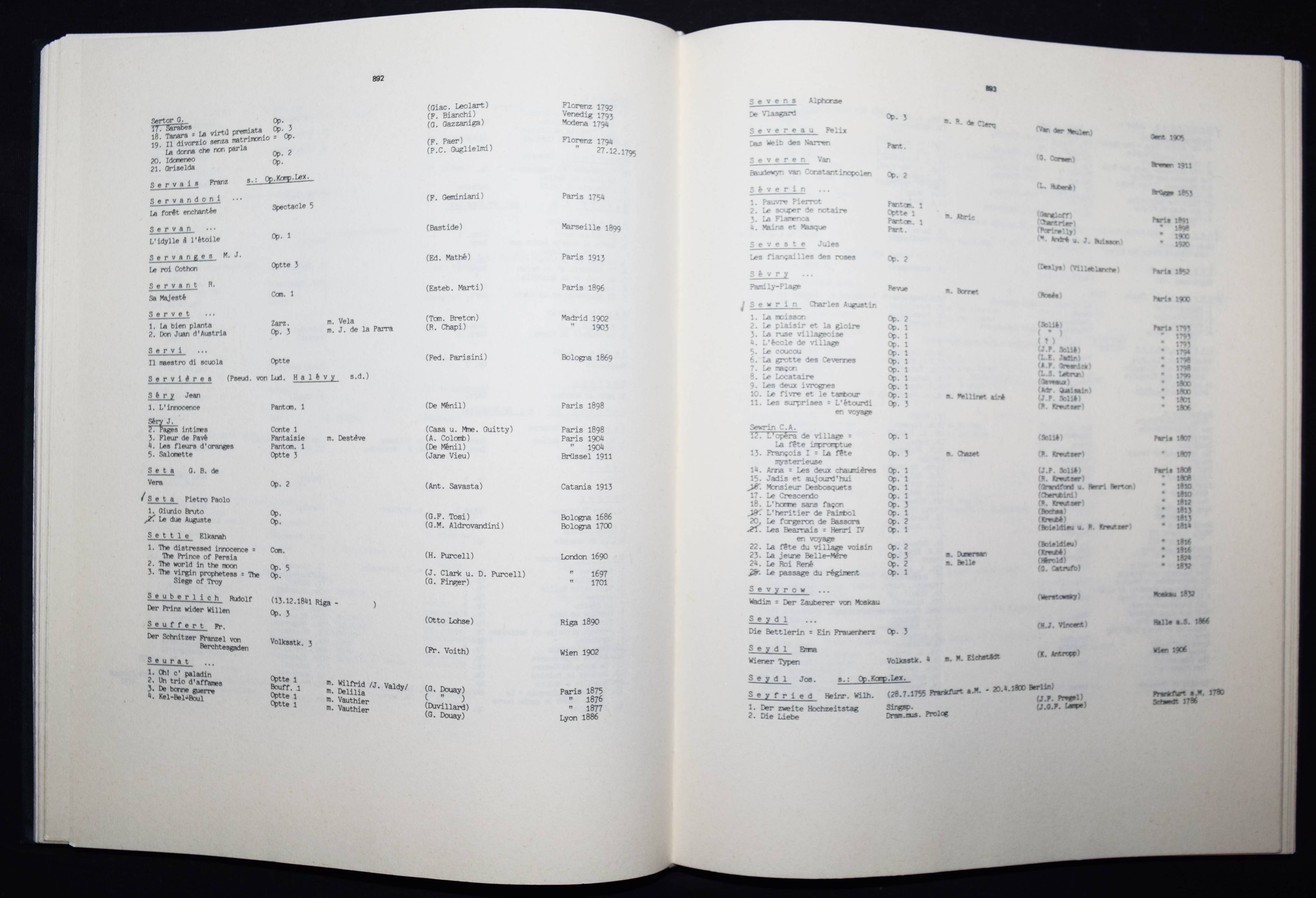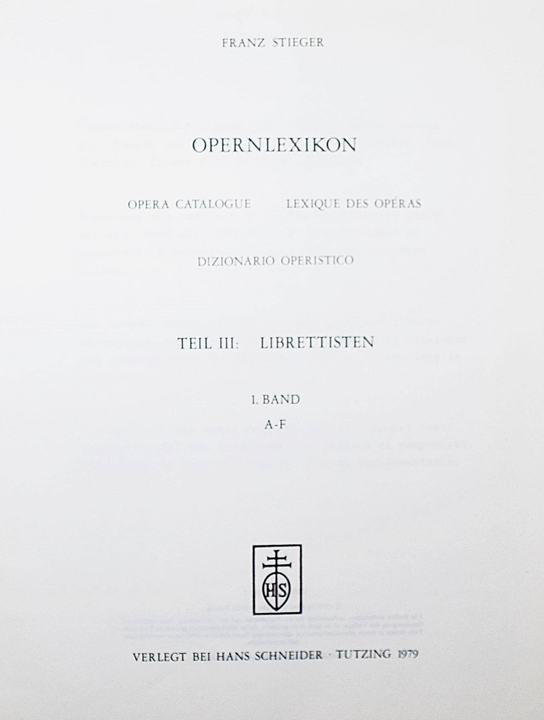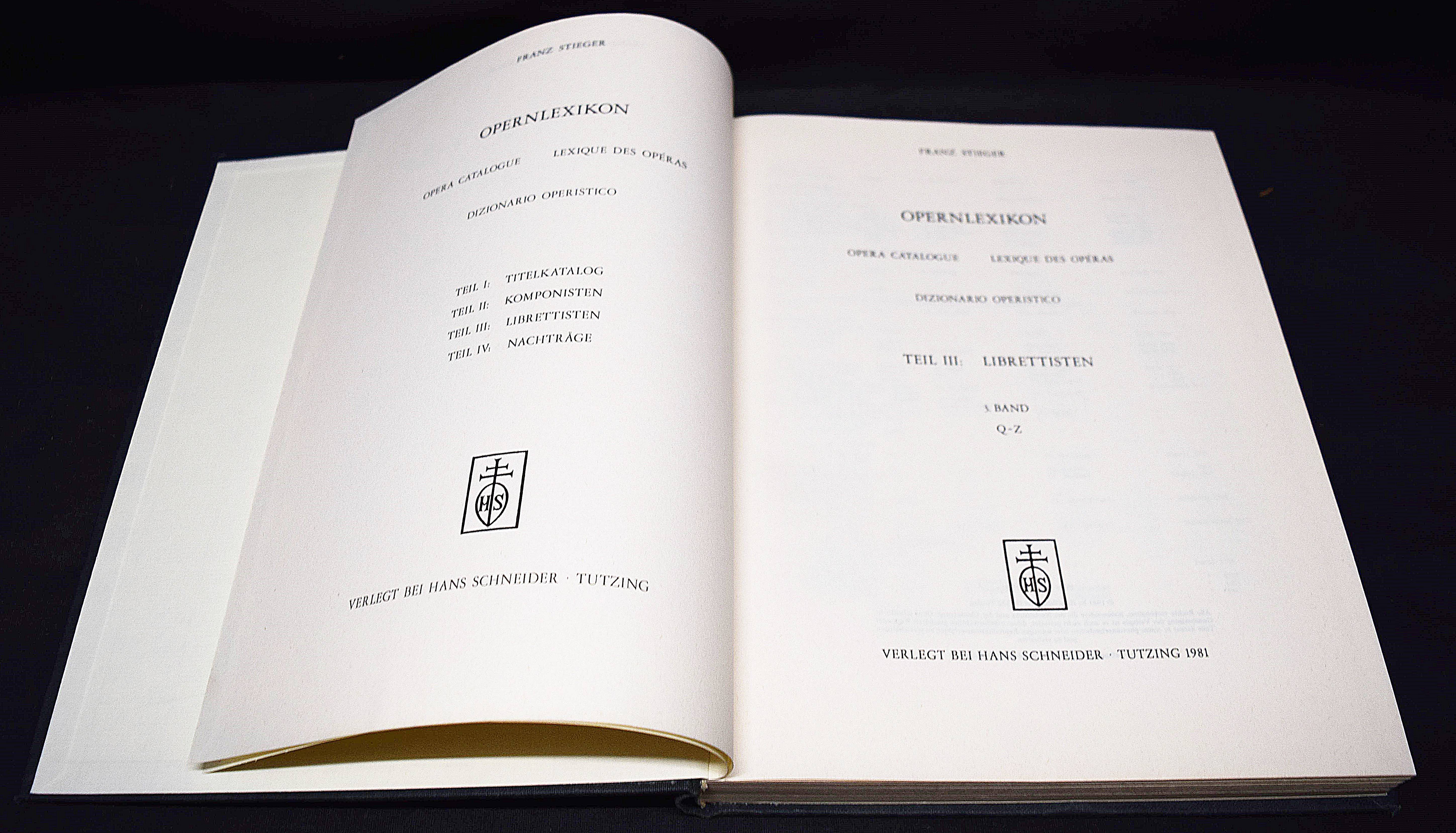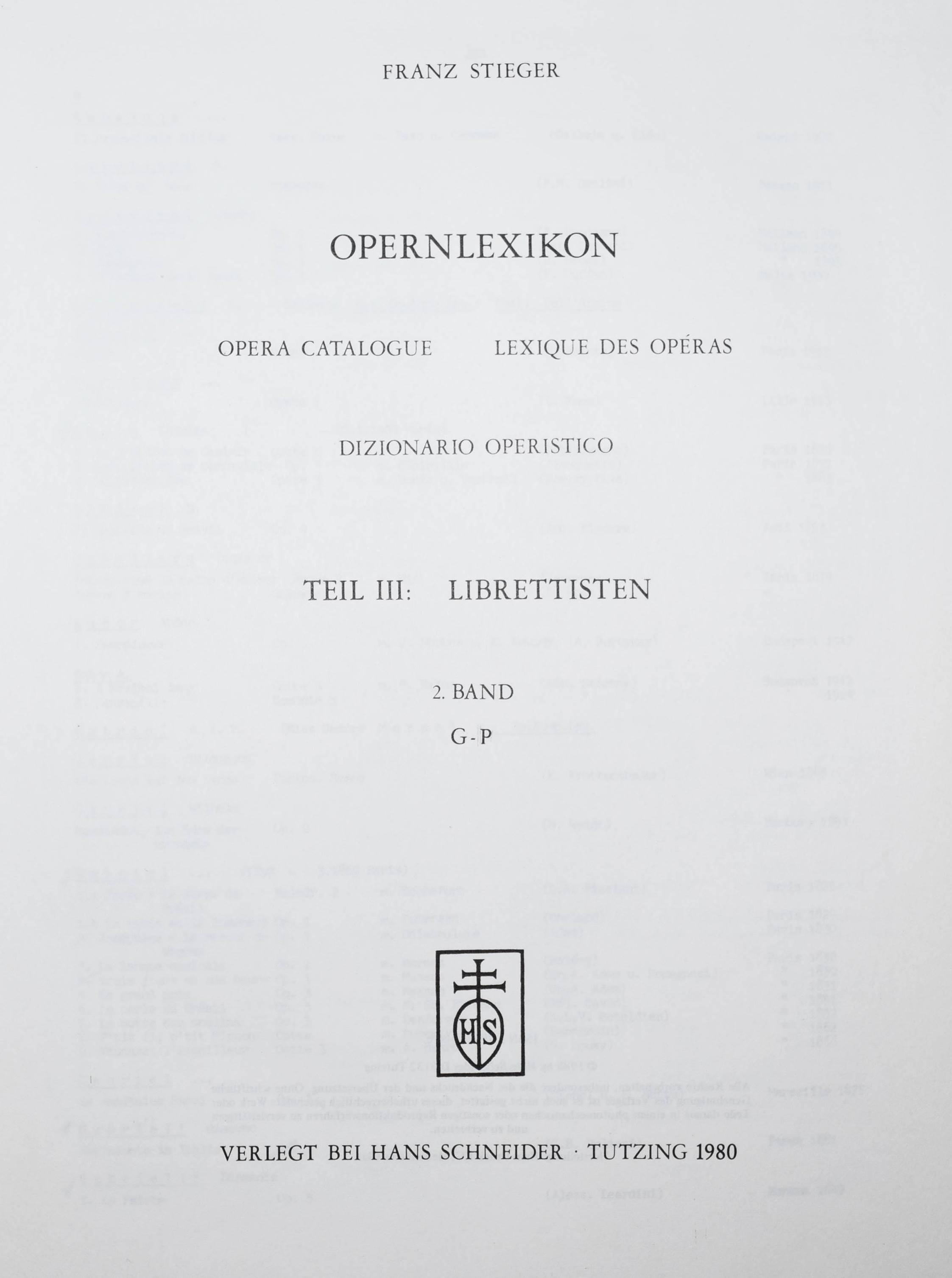Stieger, Franz. Opernlexikon. Opera catalogue – Lexique des opéras – Dizionario operistico. Teil III: Librettisten. 3 Bände. Tutzing, Schneider 1979-1981. 4°. Zus. 1043 S. OLn. mit goldgepr. Rücken- u. Deckeltiteln. Einbände geringf. berieben, gutes Exemplar.