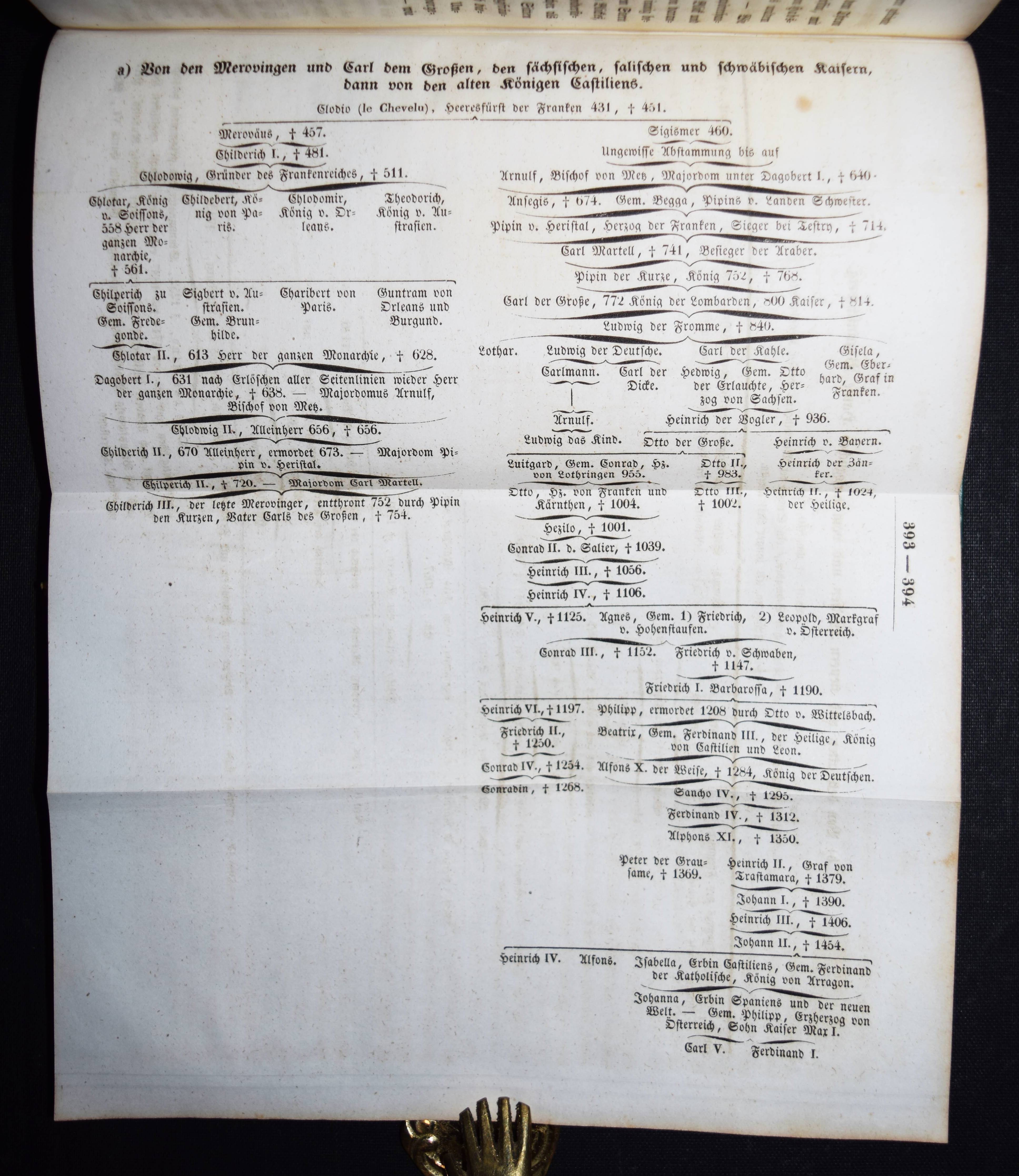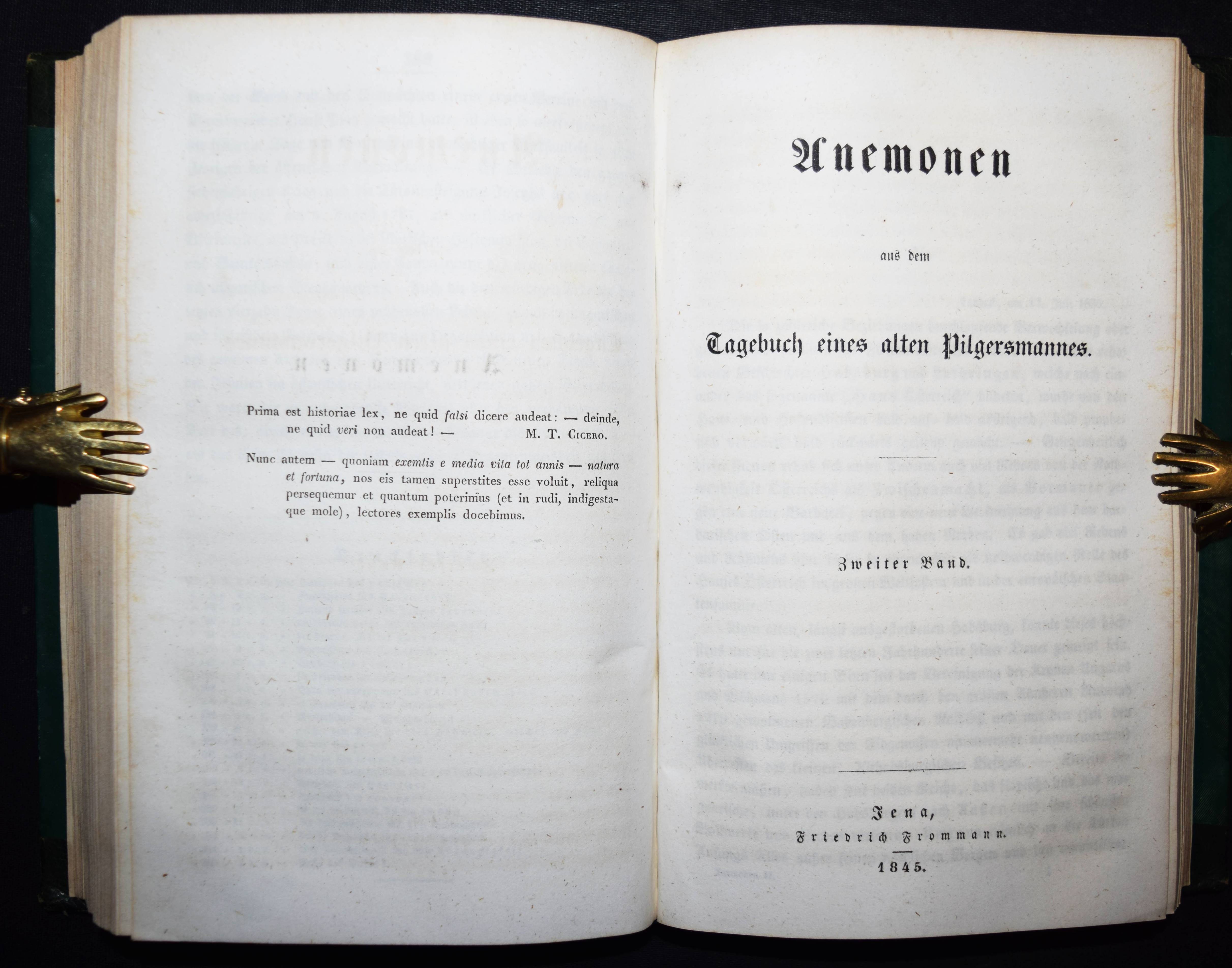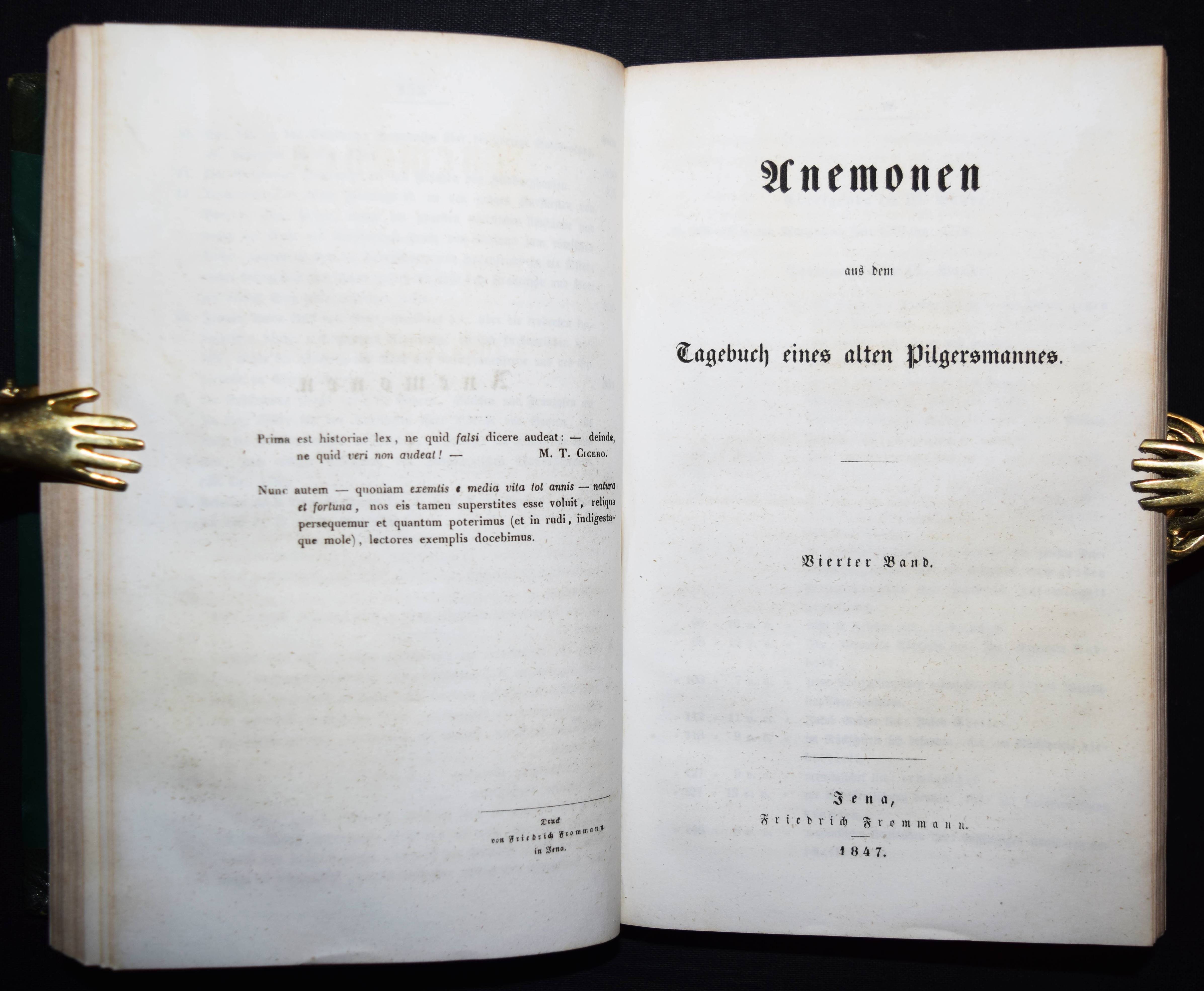 (Hormayr, Joseph v.). Anemonen aus dem Tagebuch eines alten Pilgersmannes. 4 Bände in 2. Jena, Frommann 1845-1847. 8°. [2] Bl., 388 S.; [2] Bl., 370 S.; [2] Bl., 336 S.; [2] Bl., 392 S. mit 12 (7 gefalt.) Stammtafeln. Dunkelgrüne Hldr. d. Zt. mit goldgepr. Rückentiteln u. Romantikerverg. Goed. VI, 345, 34. Holzmann/Bohatta I, 1756. Meyer 5742. NDB IX 626. – Erste Ausgabe des Hauptwerks. – J. v. Hormayr (1781-1848) „war ein mit phänomenalem Gedächtnis ausgezeichnetes Wunderkind“ (NDB). – Bereits mit 26 Jahren bekam er das Direktorat des Geheimen Hausarchivs in Wien übertragen. In antinapoleonische Querelen verstrickt, verlor er dieses Amt, wurde jedoch nach einer Rehabilitation im Jahr 1816 zum österreichischen Reichshistoriographen ernannt, wobei man ihm allerdings den Zutritt zu seiner einstigen Wirkungsstätte verwehrte. 1828 verließ er Österreich, ein Jahr vor seinem Tod wurde er Vorstand des allgemeinen Reichsarchivs in München. Der verdienstvolle, wenn auch umstrittene Archivar, Historiograph und Publizist gehörte zu den emsigen Förderern des Archivwesens und war einer der ersten, die die Bedeutung von Archiven für die Geschichtswissenschaft erkannten. – Seine ‚Anemonen‘ enthalten vorwiegend historiographische Anmerkungen zur europäischen Geschichte seit dem Mittelalter sowie genealogische Studien zu europäischen Herrscherhäusern (u. a. Hohenzollern). Hormayr gibt auch zahlreiche Urkunden im Wortlaut wieder. – Mehrere Exlibris in beiden Bänden, nur leicht gebräunt und vereinzelt gering fleckig, sehr schönes dekorativ gebundenes Exemplar.