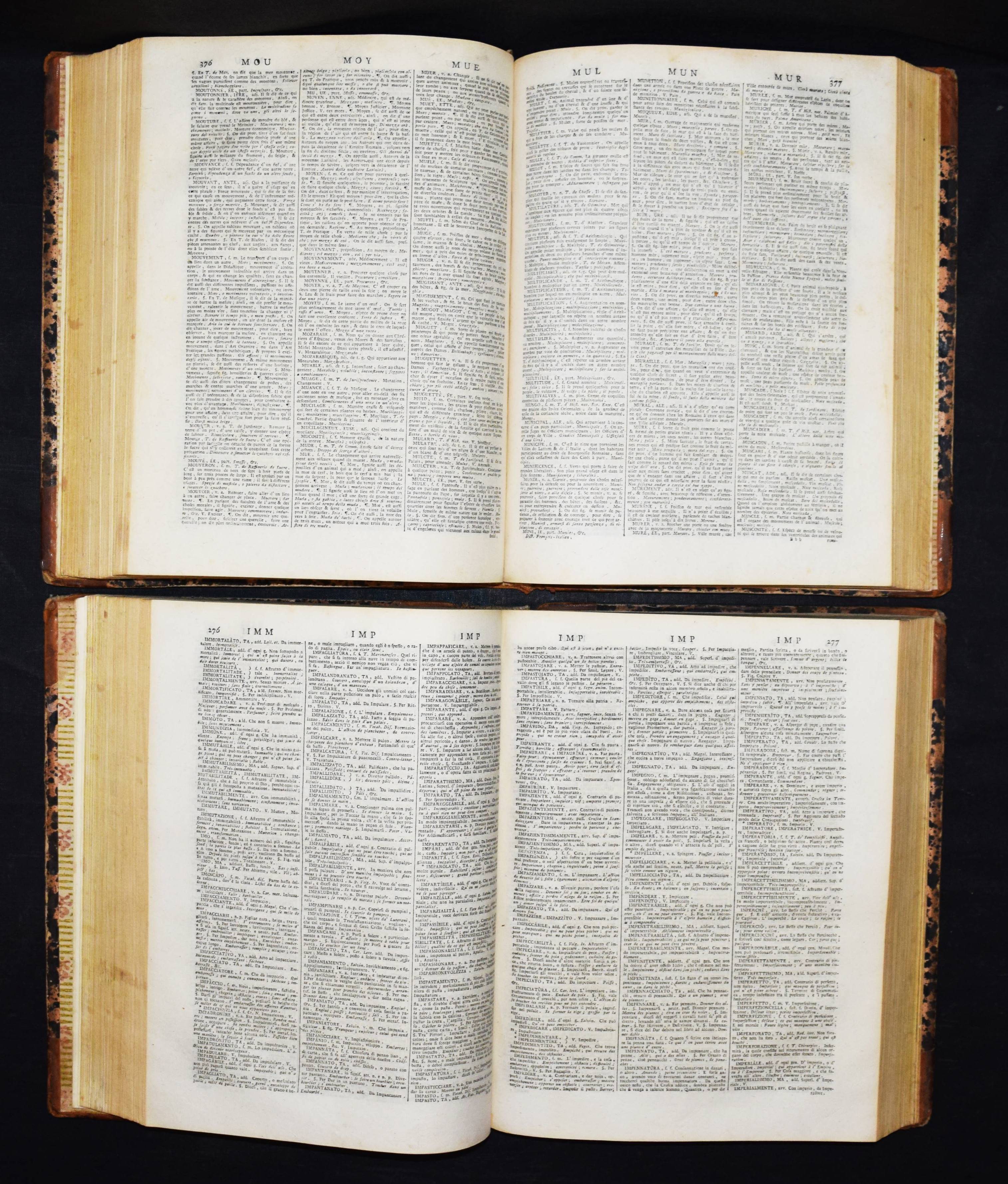 Alberti di Villanuova, Francesco. Nouveau Dictionnaire françois-italien. (Et) Nuovo dizionario italiano-francese. 2 Bände. Bassano u. Venedig, Remondini 1777. 4°. XX, 650 S.; XXIV, 678 S. Hldr. d. Zt. mit goldgepr. Rückensch. u. Linienverg. Zaunmüller 208. – Erste italienische Ausgabe, erschien zuerst 1771 in Paris und Marseille. Erst 1826-28 erschien eine Neuausgabe. – Einbände berieben und etwas bestoßen, zeitgenöss. Besitzvermerk a. V., St.a.T., nur vereinzelt leicht braunfleckig, gutes dekorativ gebundenes Exemplar.