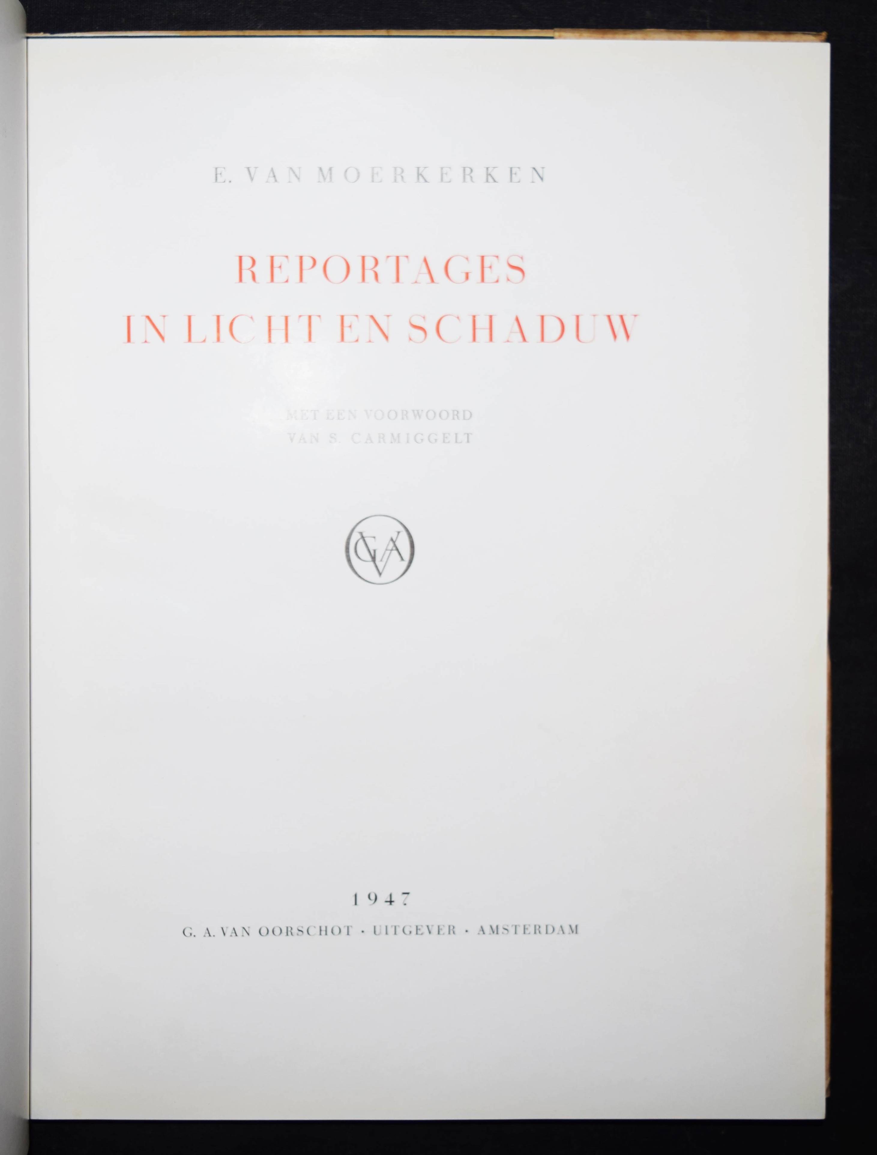 Moerkerken, E(miel) van. Reportages in licht en schaduw. Amsterdam, G. A. van Oorschot 1947. 4°. [110] S. mit 106 Abb. auf Tafeln. OLn. mit farbig illustr. OU. Auer 329. Gierstberg/Suermondt 192. – Erste Ausgabe. – Schutzumschlag angestaubt und mit kl. Randläsuren, sonst gut erhalten.