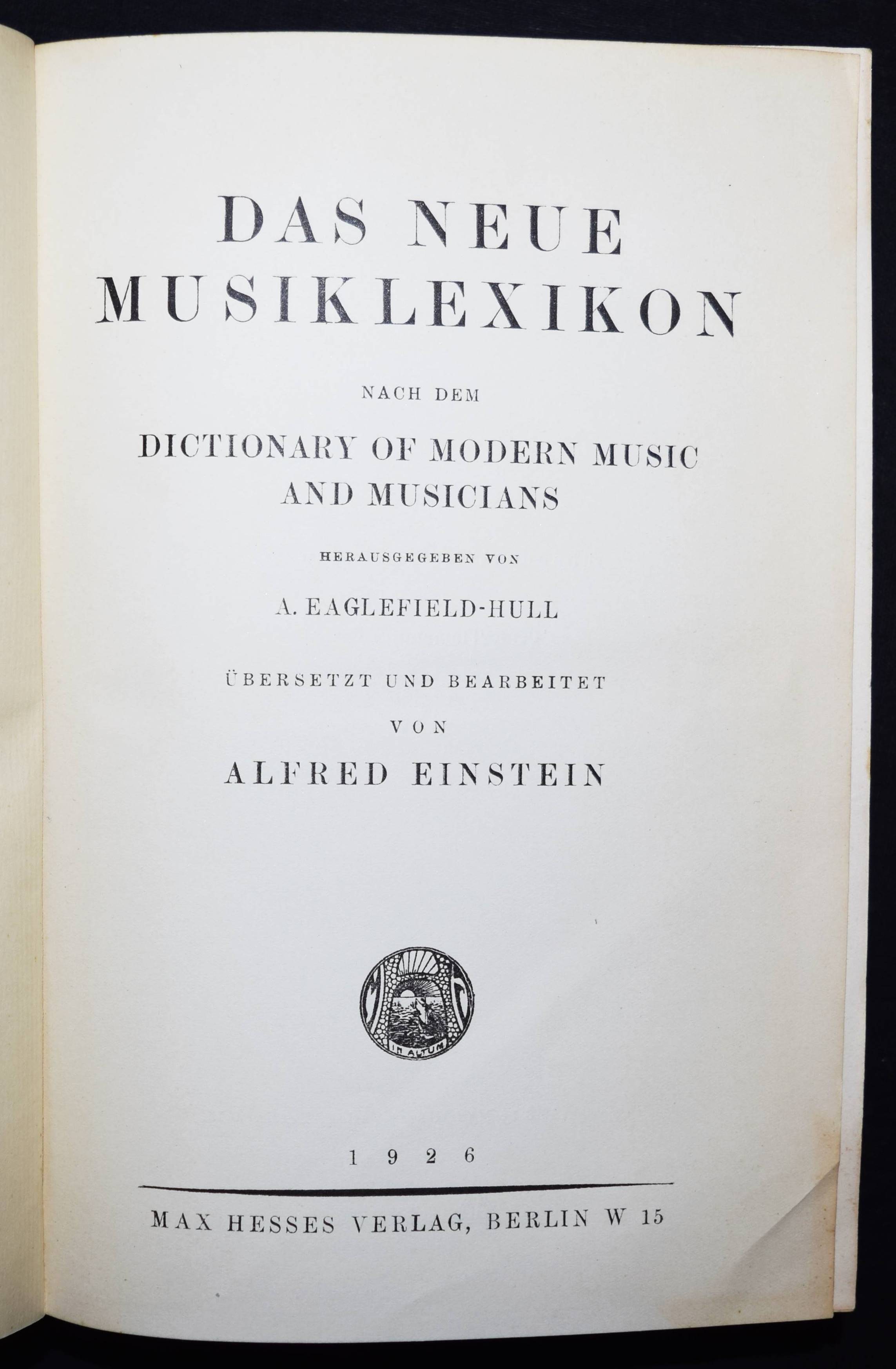 Einstein, Alfred. Das neue Musiklexikon. Nach dem Dictionary of modern music and musicians. Herausgegeben von A(rthur) Eaglefield-Hull, übersetzt und bearbeitet. Berlin, Max Hesse 1926. Gr.-8°. XXV, 729 S. OHldr. mit goldgepr. Rückenschild, dekorativer Rückenverg. u. Kopfgoldschnitt (Entwurf: Walter Tiemann). Erste deutsche Ausgabe. – Rücken wie meist etwas aufgehellt, gutes Exemplar der schönen Halblederausgabe.