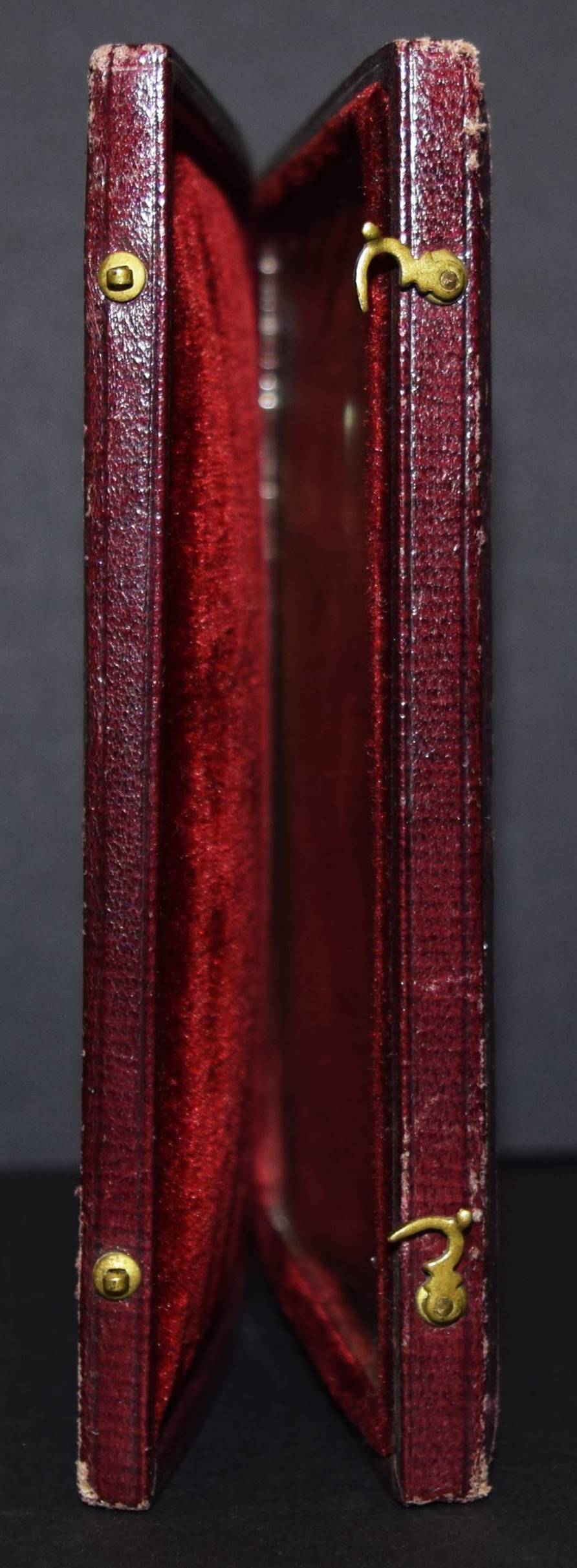 Portrait eines jungen Mannes, auf einem Stuhl sitzend, nach links dem Betrachter zugewandt. Handkolorierte Orig.-Photographie (Albuminabzug). London, The London School of Photography um 1865. 9,5 x 6,5 cm. unter goldfarb. Passepartout. Dunkelrotes Orig.-Lederetui, mit Samt gefüttert u. goldgepr. Adresse auf dem Rückendeckel. Schönes Studioportrait eines blonden Mannes mit Backenbart in Frack und mit Blau kolorierter Fliege, daneben ist ein Buch auf einem Beistelltisch zu sehen. – Sehr gut erhalten.