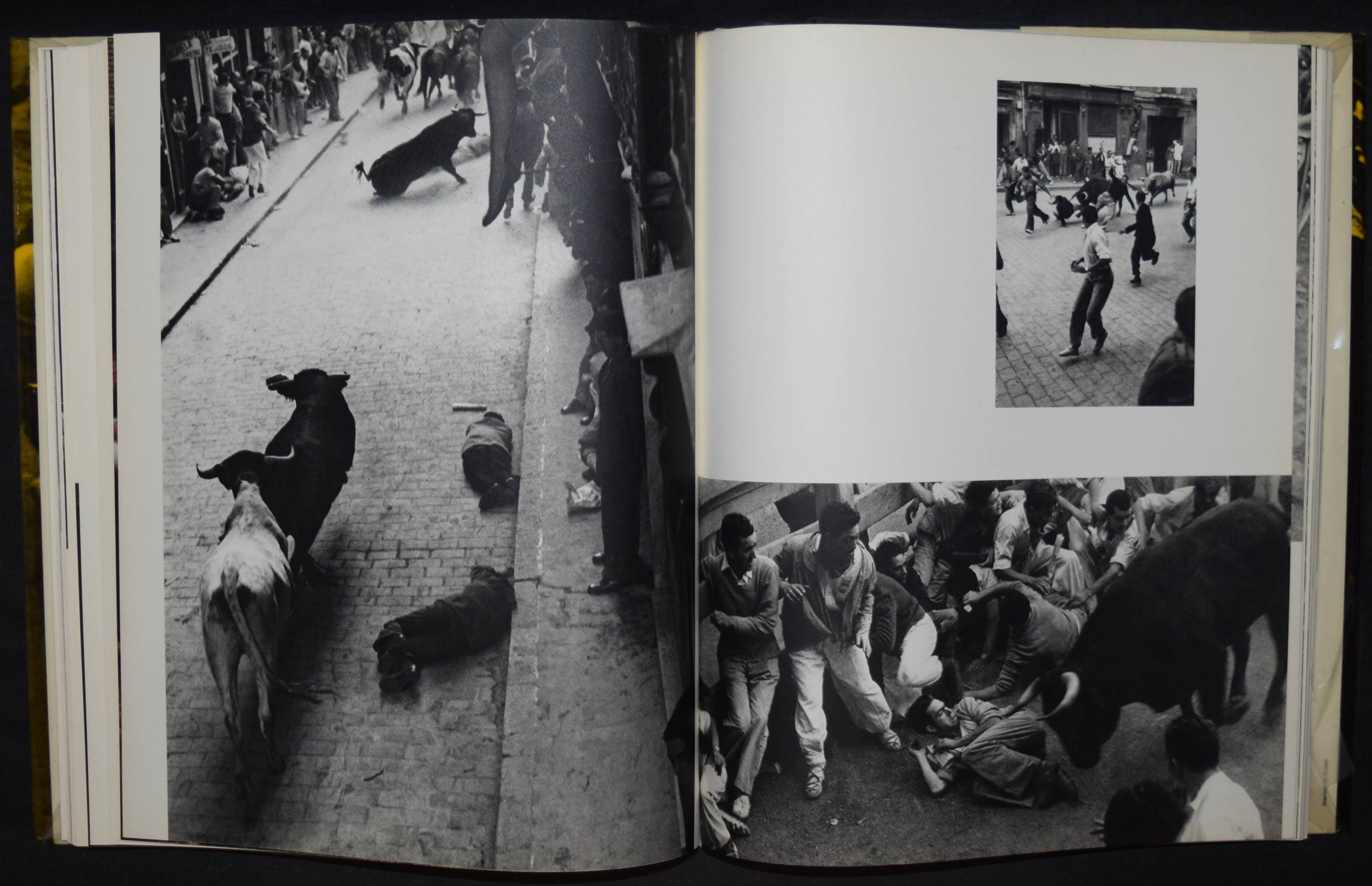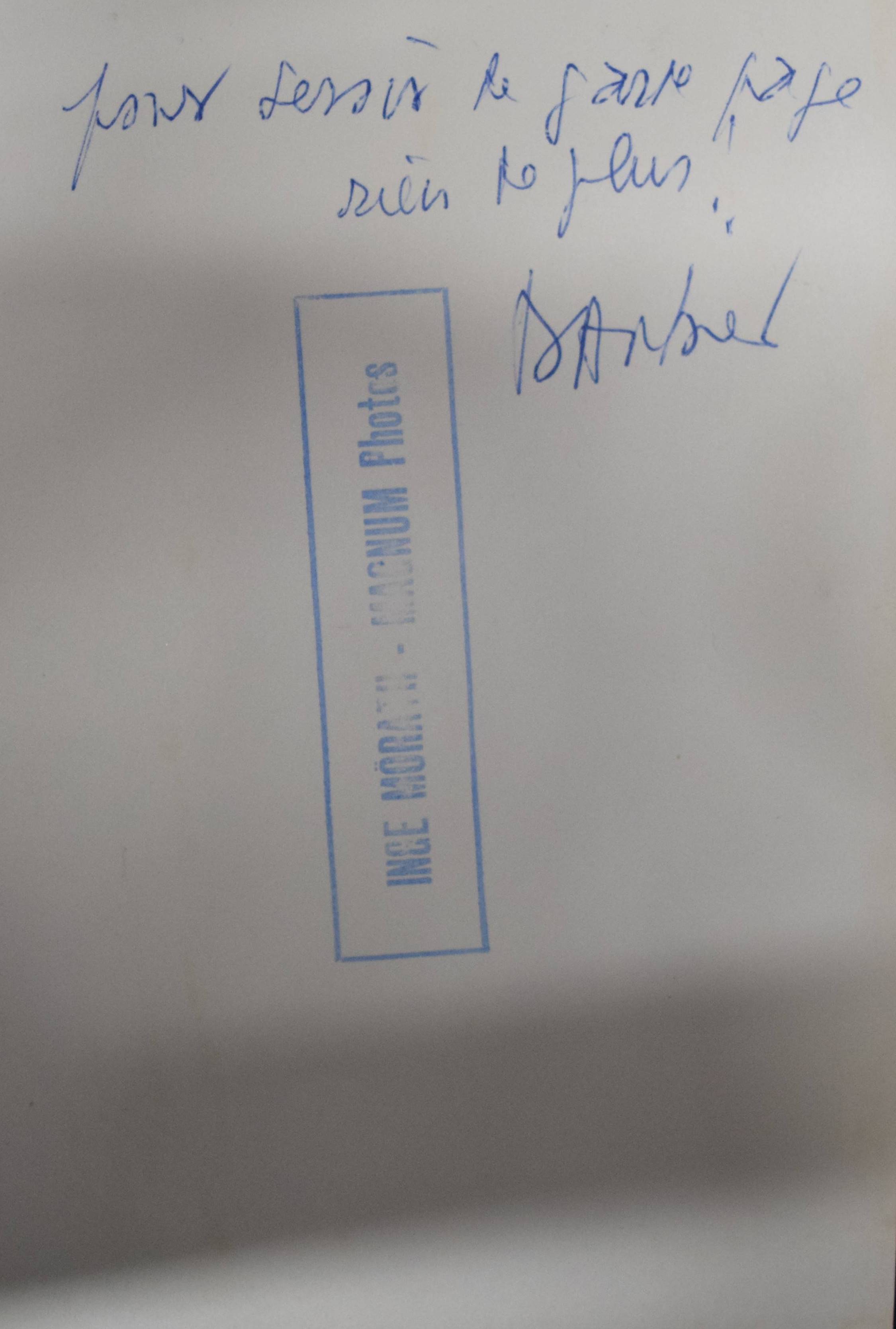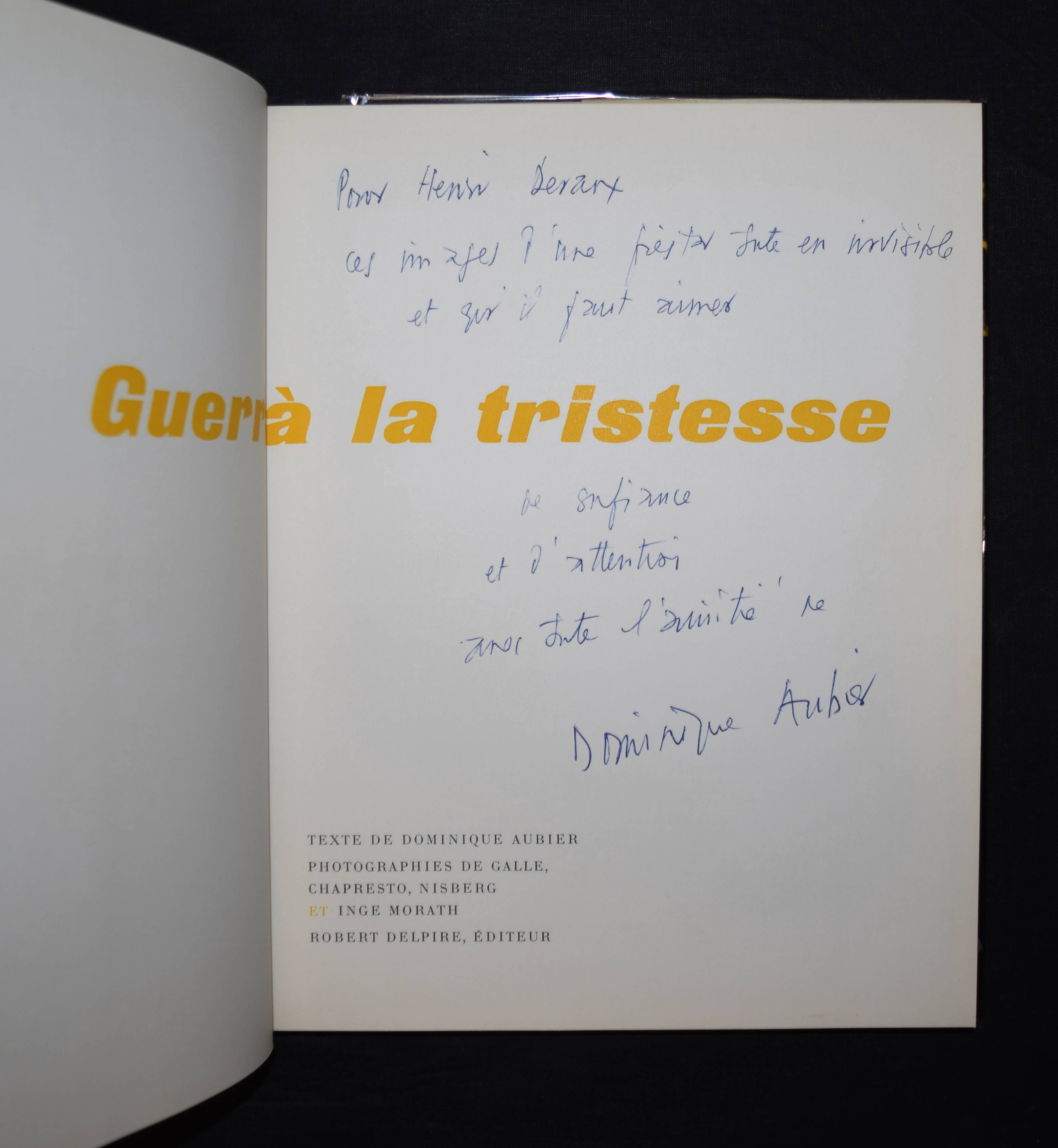 Morath – Aubier, Dominique (d. i. Marie-Louise Labiste). Guerre à la tristesse. Photographies de Galle, Chapresto, Nisberg et Inge Morath. (Paris), Delpire (1955). 4°. [129 S. mit zahlr. teils farb. Abb. auf Tafeln. OLn. mit farbig illustr. OU. Koetzle 312. Lederman/Yatskevich 132 f. – Erste Ausgabe der ersten Buch-Veröffentlichung der österr. Magnum Fotografin I. Morath (1923-2002). – Mit eigenhändiger Widmung von D. Aubier auf dem Titel und Orig.-Photographie, Portrait der Autorin von Inge Morath (17,5 x 12 cm.), rücks. mit eigenhändiger Widmung von D. Aubier und Stempel der Fotografin. – Erschien im selben Jahr auch in deutscher Übersetzung mit dem Titel „Fiesta in Pamplona“ bei Manesse in Zürich. – „Ihr fotographisches Handwerkszeug stammt aus der ‚Schule‘ von Henri Cartier-Bresson und der Magnum-Fotografie der 50er Jahre. … Inge Morath war und ist in diesem Sinne eine Reise- und Reportagefotografin, deren Bildmaterial für die Printmedien vorgesehen ist. Doch daneben entsteht als direkte Antwort auf das ‚bestellte‘ Bild eine Flut von ‚freien‘ Bildern, ein Reservoir an intimen und persönlichen Fotos, deren Zweckfreiheit ihnen eine gleichsam novelistische Erzählebene ermöglicht“ (M. Zuckriegl in Koetzle). – „Aubier’s text that filled with observations – at times philosophical – and anecdotes about Spanisch daily life and the rituals of the bullfight that further deepen Morath’s personal and intimate photographs. Through the interplay of words and images the viewer senses the tradition, ceremony and anticipation that underlie the San Fermin Festival“ (Lederman/Yatskevich). – Die franz. Schriftstellerin D. Aubier (1922-2014) lebte seit 1960 in Carboneras (Provinz Almeria). – Sehr gutes Exemplar.