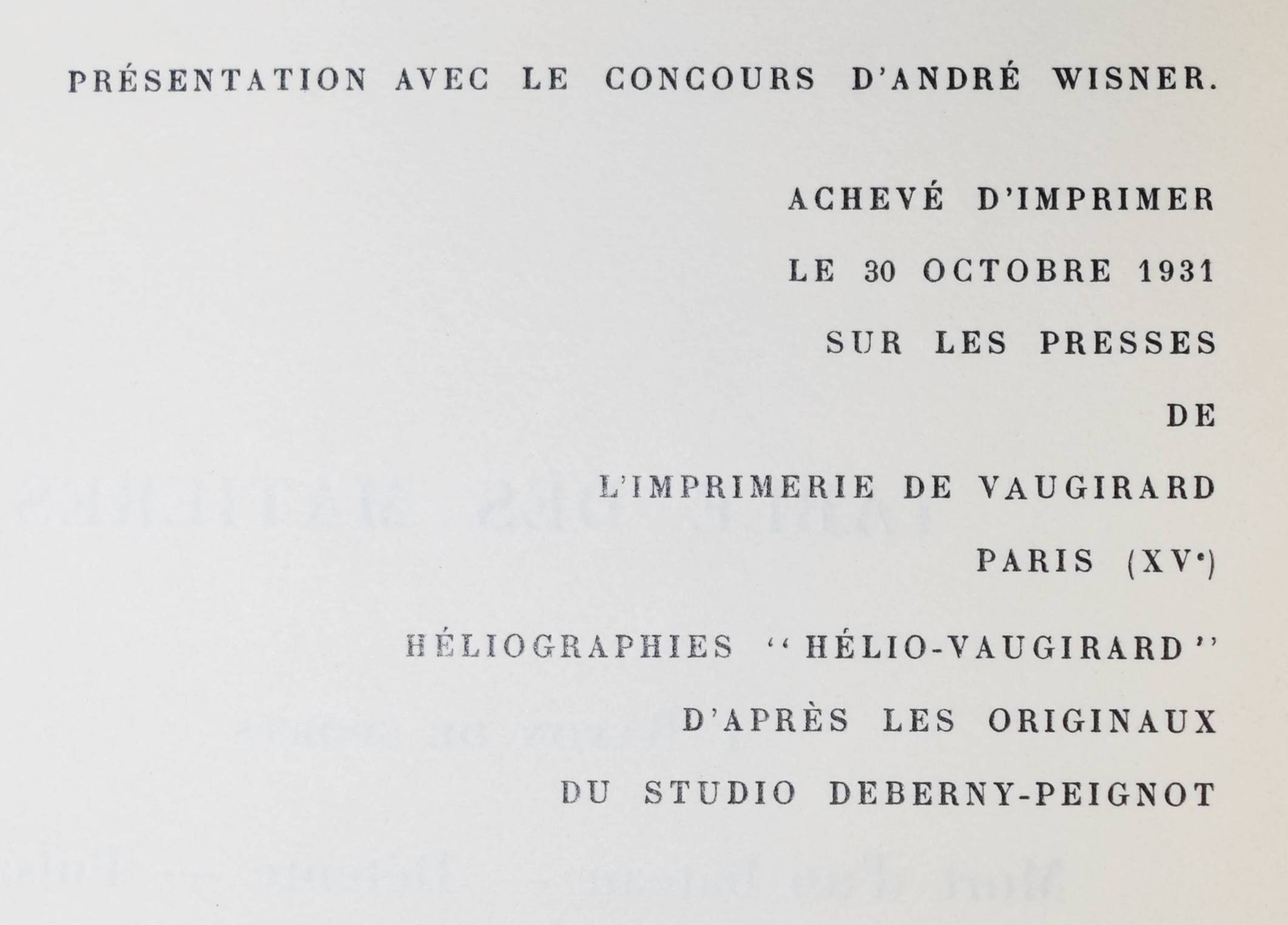 (Rothschild, Baron Georges) Philippe de. Diagrammes. (Présentation avec le concours d’André Wisner). Paris, Selbstverlag (Imprimerie de Vaugirard) (1931). 4°. 66 S., [2] Bl. mit 9 Tafeln in Heliogravure. Orig.-Pappband mit illustr. Schutzumschlag in Pappschuber. Nicht in den einschlägigen Bibliographien. – Eines von 225 num. Exemplaren auf Papier de Rives. – „Tirage limité à 225 exemplaires, dont 25 exemplaires sont nominatifs et 2 exemplaires d’auteur, celui-ci est justifié par le numéro 38. Achevé d’imprimer le 30 octobre 1931 sur les presses de l’Imprimerie de Vaugirard (Paris XVe). Héliographies « Hélio-Vaugirard » d’après les originaux du studio Deberny-Peignot.“ – Mit hervorragenden Aufnahmen des berühmten franz. Unternehmers, Automobilrennfahrers, Kunstmäzens und Weingut-Besitzers. Die Aufnahmen illustrieren literarische Texte des Barons I. Rayon de sports (Mort d’un bateau – Détente – Pulsation). II. Autre triptyque (Dissolution – Nocturne – Dentaire). III. Ciel et terre (Lourdes – Kippour Paris – Mort de Diaghileff). – G. P. de Rothschild (1902-1988), war der Ur-Enkel von Baron Nathaniel de Rothschild, der 1853 das Weingut als Château Brane Mouton erworben und in „Château Mouton-Rothschild“ umbenannt hatte, führte in den 20er und 30er Jahren ein Leben als Playboy, nahm seit 1928 an Grand Prix Rennen (Grand Prix de Nizza, 24 Stunden von Le Mans, Circuit de Monaco) und als Segler an den Olympischen Spielen 1928 in Amsterdam teil. Nach dem Zweiten Weltkrieg wird das Etikett des Château Mouton-Rothschild in jedem Jahr von einem zeitgenössischen Künstler gestaltet. Salvador Dalí (1958), Joan Miró (1969), Marc Chagall (1970), Pablo Picasso (1973) und Georg Baselitz (1989, das „Mauerfall“-Etikett). – Schuber an den Kanten berieben und an einer Kante etwas eingerissen, Rücken berieben und angestaubt, Teile der Deckel durch eine Aussparung des Schubers angestaubt, sonst sehr gut erhalten. – Not in the relevant bibliographies. – One of 225 num. Copies on paper de Rives. – “Tirage limité à 225 exemplaires, dont 25 exemplaires sont nominatifs et 2 exemplaires d’auteur, celui-ci est justifié par le numéro 38. Achevé d’imprimer le 30 octobre 1931 sur les presses de l’Imprimerie de Vaugirard (Paris XVe). Héliographies “ Hélio-Vaugirard ” d’après les originaux du studio Deberny-Peignot.” – With excellent photographs of the famous French businessman, automobile racer. With excellent photographs of the famous French entrepreneur, automobile racer, patron of the arts and winery owner. The photographs illustrate literary texts by the Baron I. Rayon de sports (Mort d’un bateau – Détente – Pulsation). II. Autre triptyque (Dissolution – Nocturne – Dentaire). III Ciel et terre (Lourdes – Kippour Paris – Mort de Diaghileff). – G. P. de Rothschild (1902-1988), was the great-grandson of Baron Nathaniel de Rothschild, who had acquired the estate as Château Brane Mouton in 1853 and renamed it “Château Mouton-Rothschild”, led a life as a playboy in the 1920s and 1930s, took part in Grand Prix races from 1928 (Grand Prix de Nice, 24 Hours of Le Mans, Circuit de Monaco) and as a sailor in the 1928 Olympic Games in Amsterdam. After the Second World War, the Château Mouton-Rothschild label was designed by a contemporary artist every year. Salvador Dalí (1958), Joan Miró (1969), Marc Chagall (1970), Pablo Picasso (1973) and Georg Baselitz (1989, the “Fall of the Wall” label). – Slipcase rubbed at the edges and somewhat torn at one edge, spine rubbed and dusty, parts of the covers dusty due to a recess in the slipcase, otherwise in very good condition.