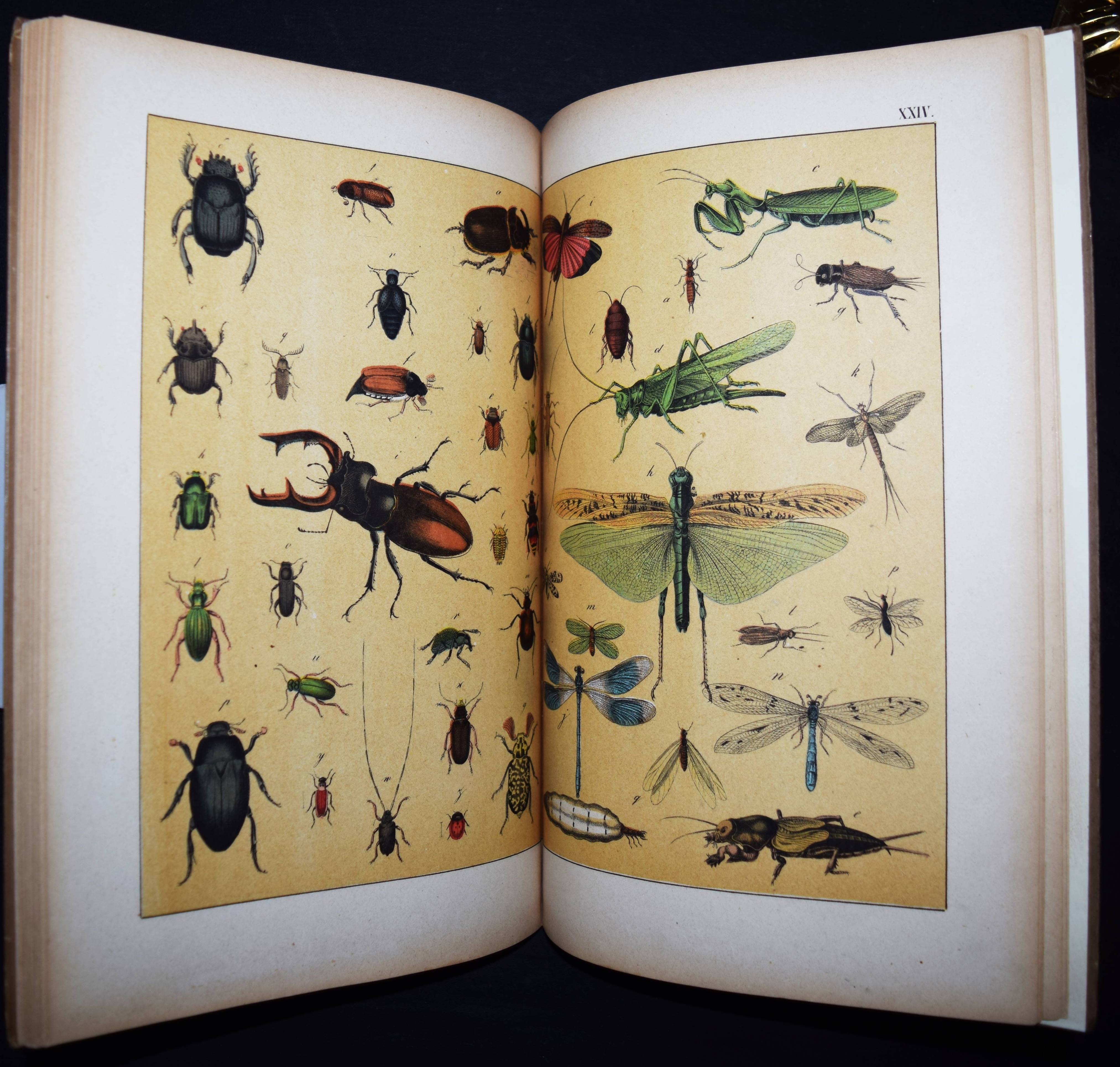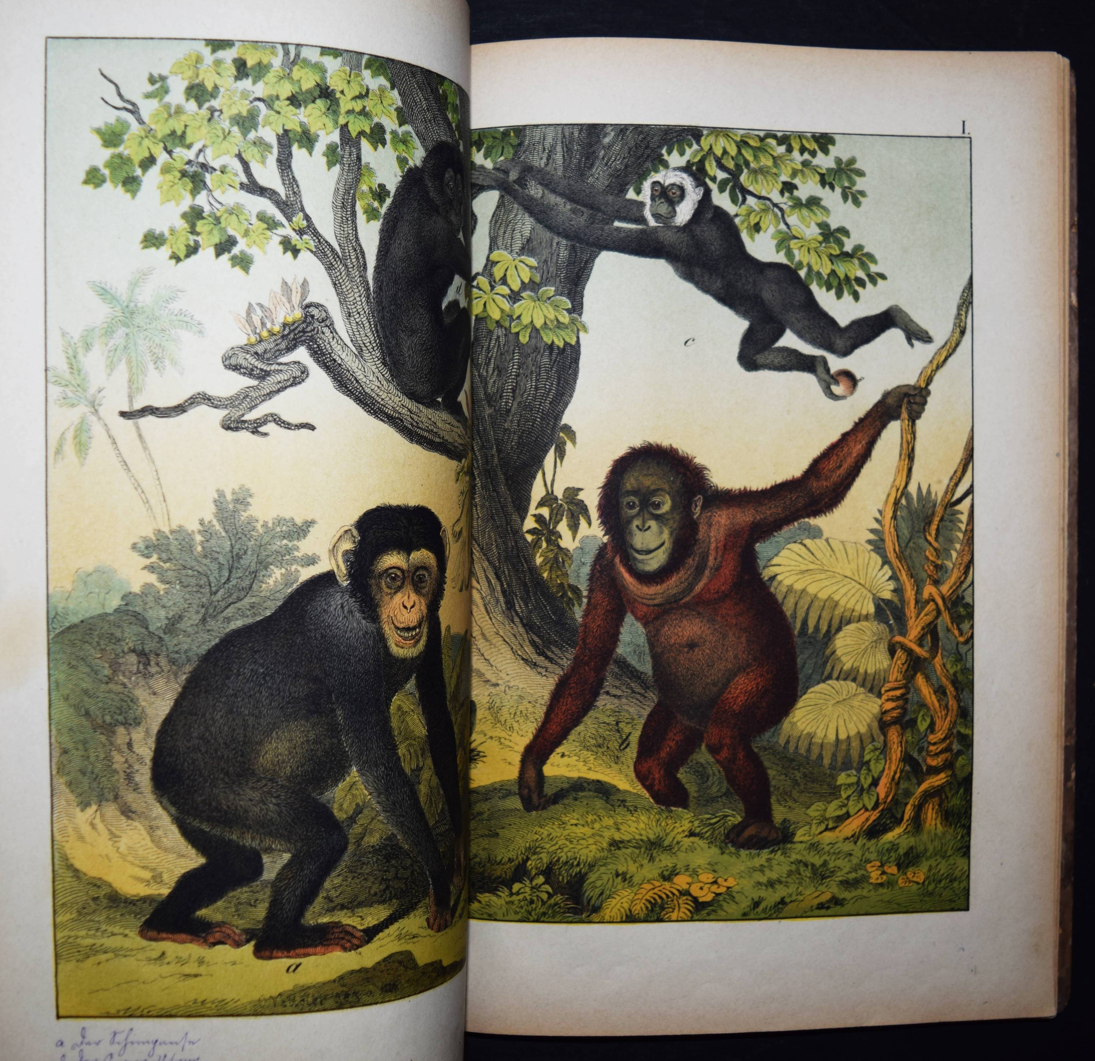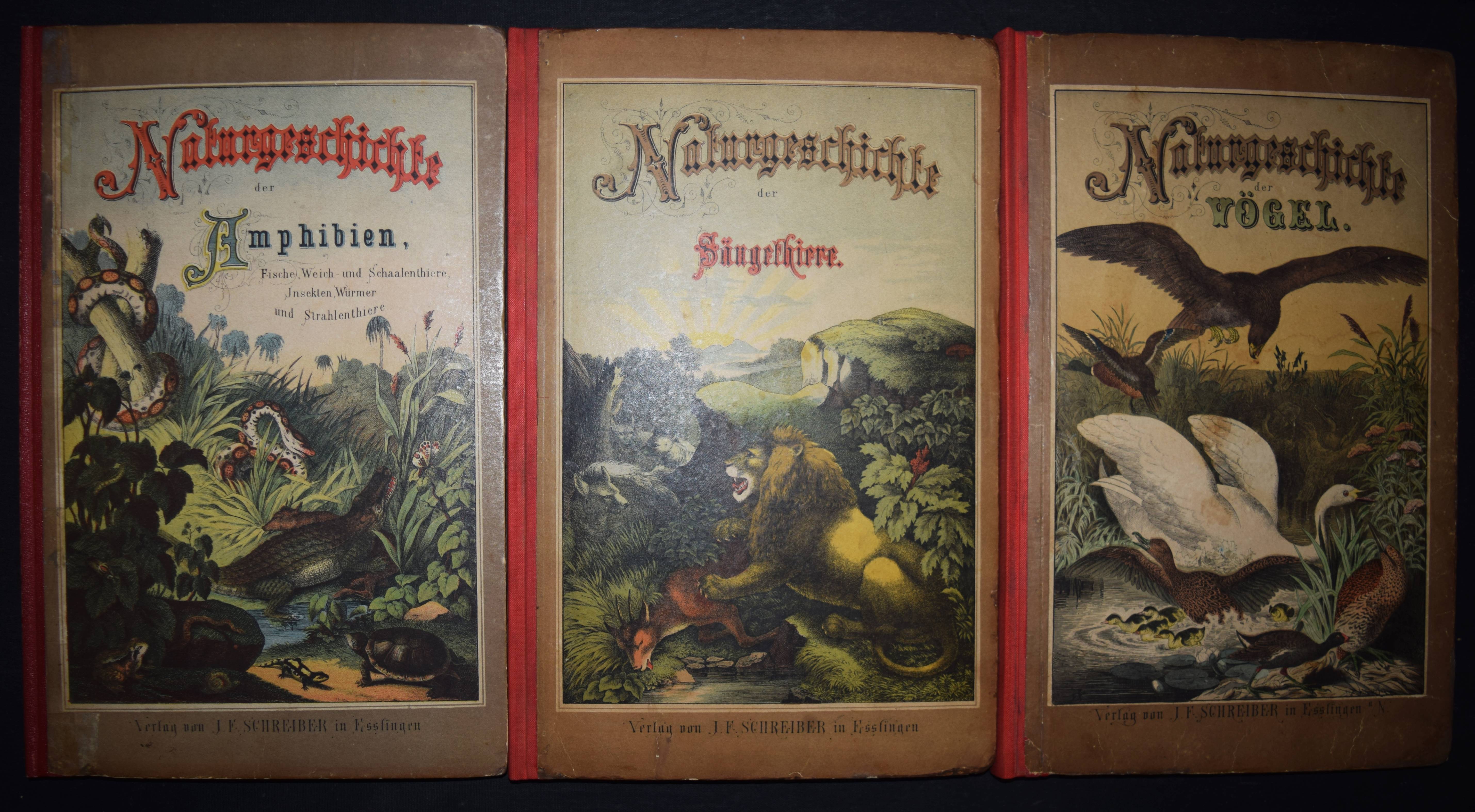 Schubert, G(otthilf) H(einrich) v. Naturgeschichte des Thierreichs in drei Theilen. I. Theil: Säugetiere. – II. Theil: Vögel. – III. Theil: Amphibien, Fische, Weich- und Schalenthiere, Insekten, Würmer und Strahlenthiere. Mit 696 Abbildungen auf 90 Tafeln. 8., 7. u. 9. Aufl. 3 Bände. Esslingen, J. F. Schreiber 1872, 1873 u. 1877. 4°. [1] Bl., 22 S. u. 30 doppelblattgr. farblithogr. Tafeln; [3] Bl., 11, (1) S. u. 30 doppelblattgr. farblithogr. Tafeln; [4] Bl., 27 S. u. 30 doppelblattgr. farblithogr. Tafeln. Farbig illustr.OHln. (Naturgeschichte des Thier-, Pflanzen- und Mineralreichs in colorirten Bildern, nebst erläuterndem Text. Erste Abtheilung). Wegehaupt II, 2292 (I), 2295 (II), 2290 (III) u. 2300 (I-III). Vgl. Slg. Breitschwerdt 271 (spätere Ausgabe der kompletten Reihe). HKJL 657. Nissen, ZBI 3760-3761 u. Vogelbücher 836. – Komplette Folge der ersten Abteilung. – Die naturwissenschaftlichen Anschauungsbücher von G. H. v. Schubert erschienen seit ca. 1869 in dieser Ausstattung. – Der Arzt, Naturwissenschaftler und Jugendbuchautor G. H. v. Schubert (1780-1860) war seit 1819 Professor für Naturgeschichte in Erlangen und seit 1827 in München. – „In seinen naturwissenschaftlichen Arbeiten zeigte er sich nicht nur am Detail interessiert, sondern war besonders darum bemüht, den Zusammenhang der inneren und äußeren, der sichtbaren und unsichtbaren Kräfte zu beschreiben und zu erklären“ (R. Stach in LKJ IV, 493). – Rücken u. Vorsätze fachgerecht erneuert, 2 Tafeln von Band I im Bug restauriert, einige Tafeln mit zeitgenöss. handschr. Namensverz. im w. Rand, sonst von geringen Alterspuren abgesehen alle Bände sehr gut erhalten.