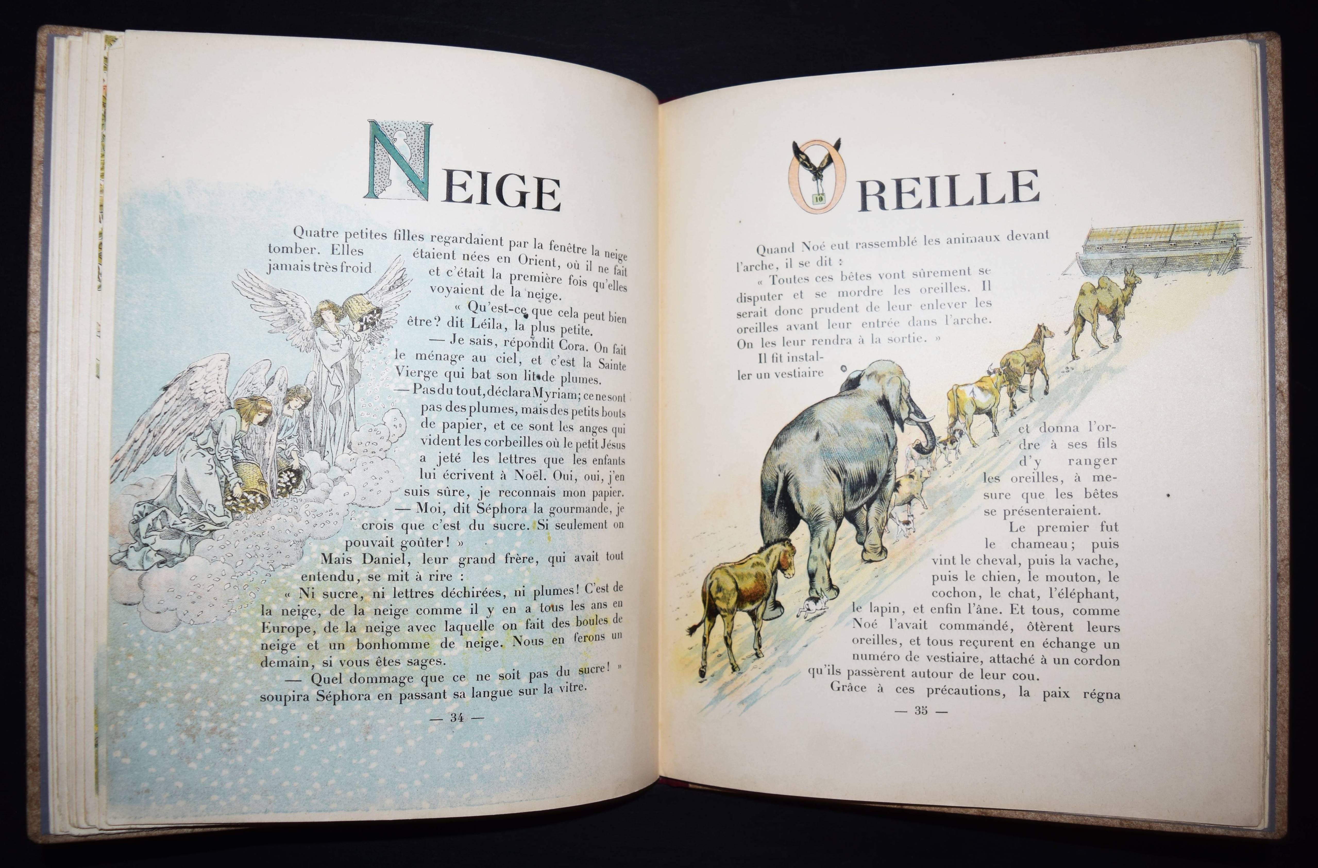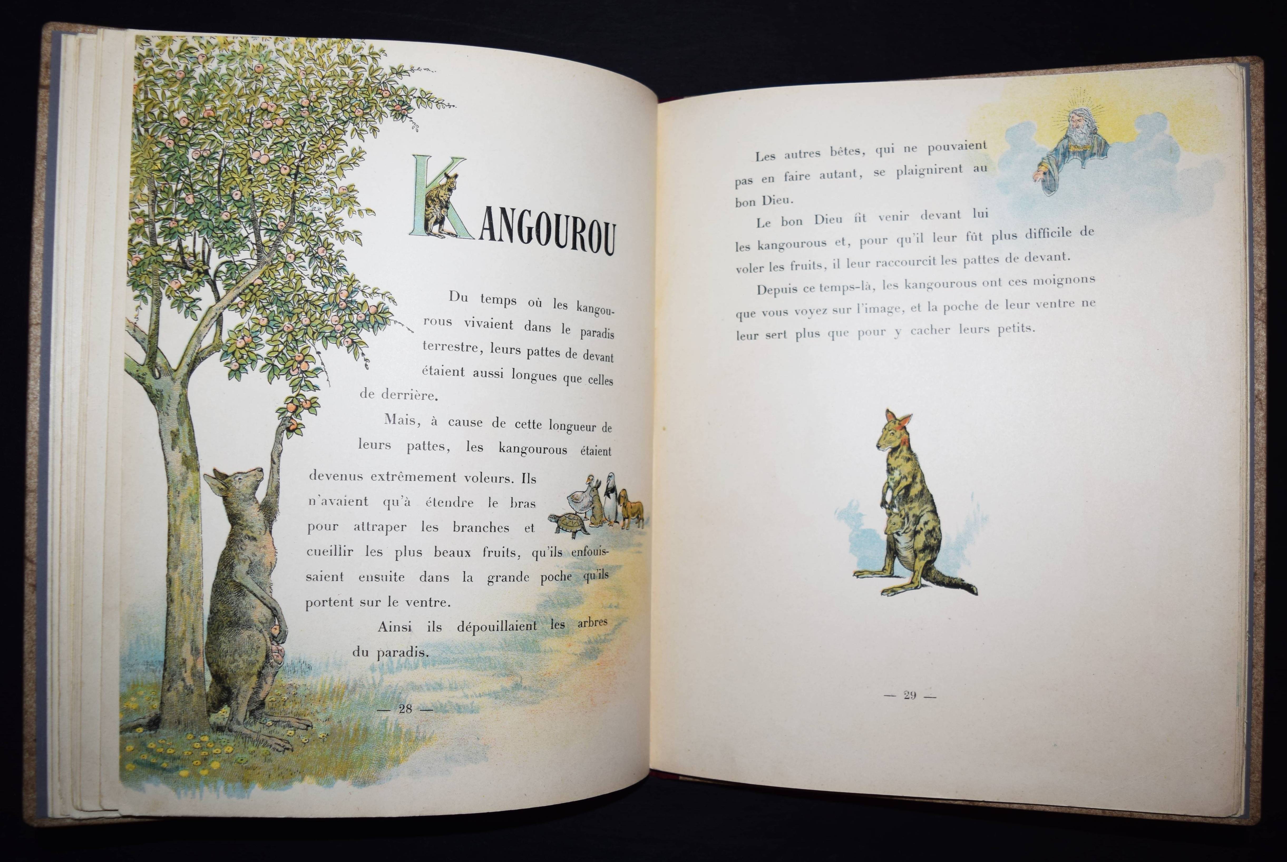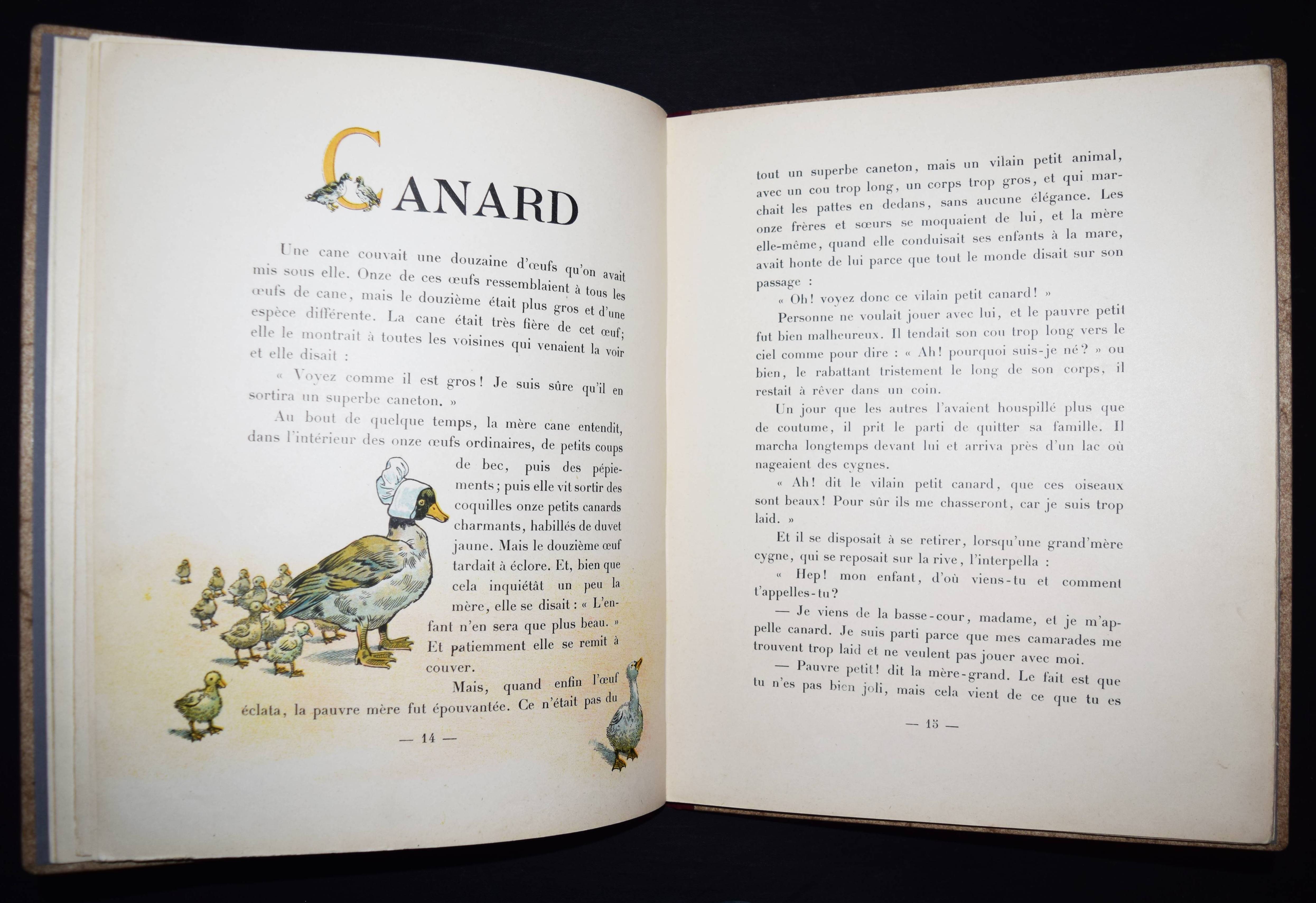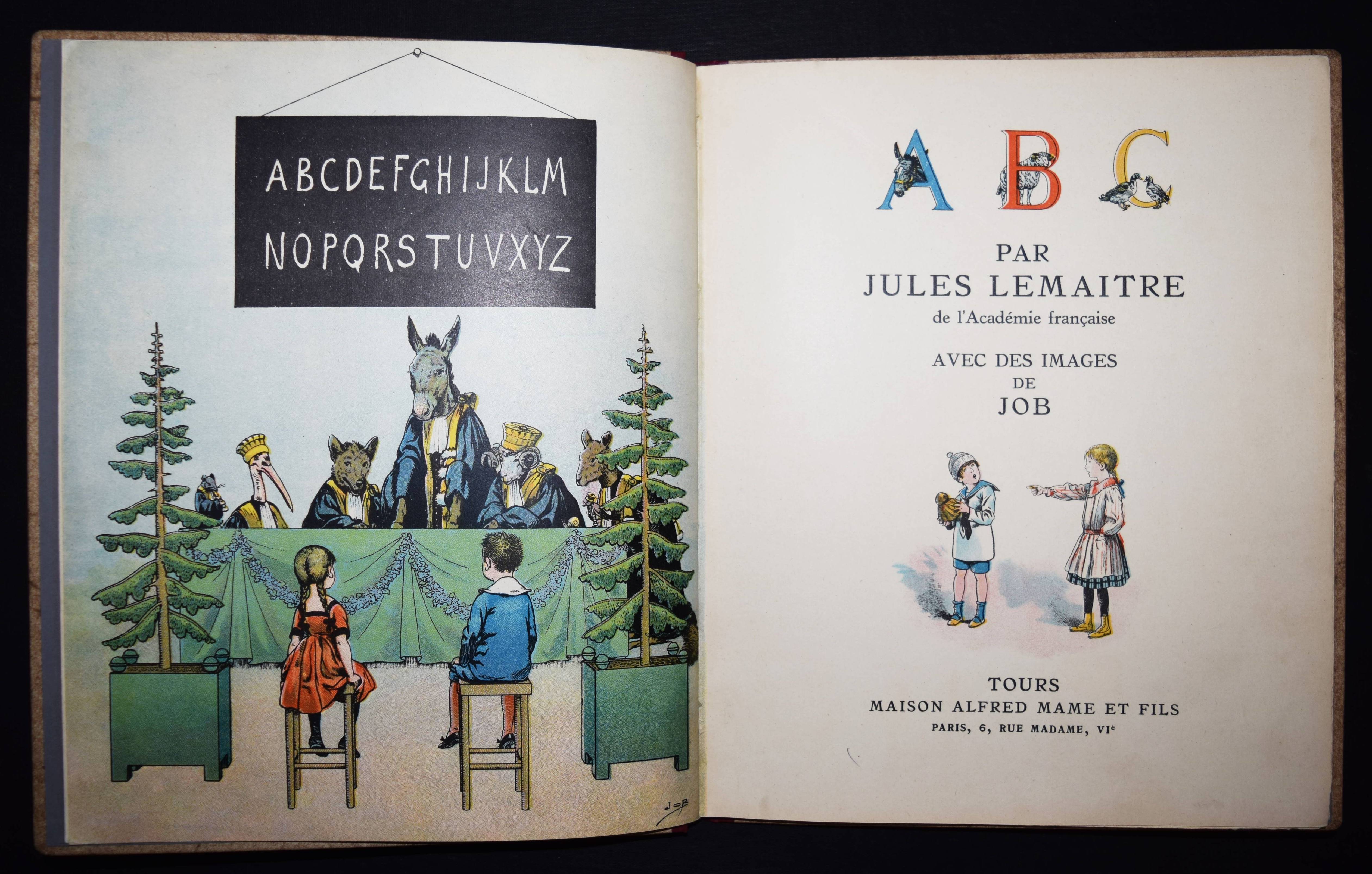 ABC – Lemaitre, Jules. ABC. (Deckeltitel zusätzl.:) Petits Contes. Avec des images de Job (d.i. Jaques-Marie-Gaston Onfray de Bréville). Tour, Mame et fils o. J. (1921). 4°. 54 S. mit farblithogr. Illustrationen. Hln. mit mont. farb. Deckelbildern. Erste Ausgabe. – Reizvoll illustriertes ABC-Bilderbuch des bekannten franz. Illustrators (vgl. Bénézit VI, 76). Mit einem Vorwort von Myriam Harry (dat. 1919), aus dem hervorgeht das das Buch bereits 1914 erscheinen sollte, was aber wegen des 1. Weltkriegs nicht realisiert werden konnte. – Nach einem farbigen Bilderalphabet folgt zu jedem Buchstaben ein kurzes Märchen, meist mit Tieren als Hauptfiguren (Ane, Bélier, Canard etc.).– Das dekorative Frontispiz zeigt eine Gerichtsszene mit Tieren als Richtern und Kindern als Angeklagte, die unter einer Schiefertafel sitzen. – Einband fachgerecht erneuert, gutes sauberes Exemplar.