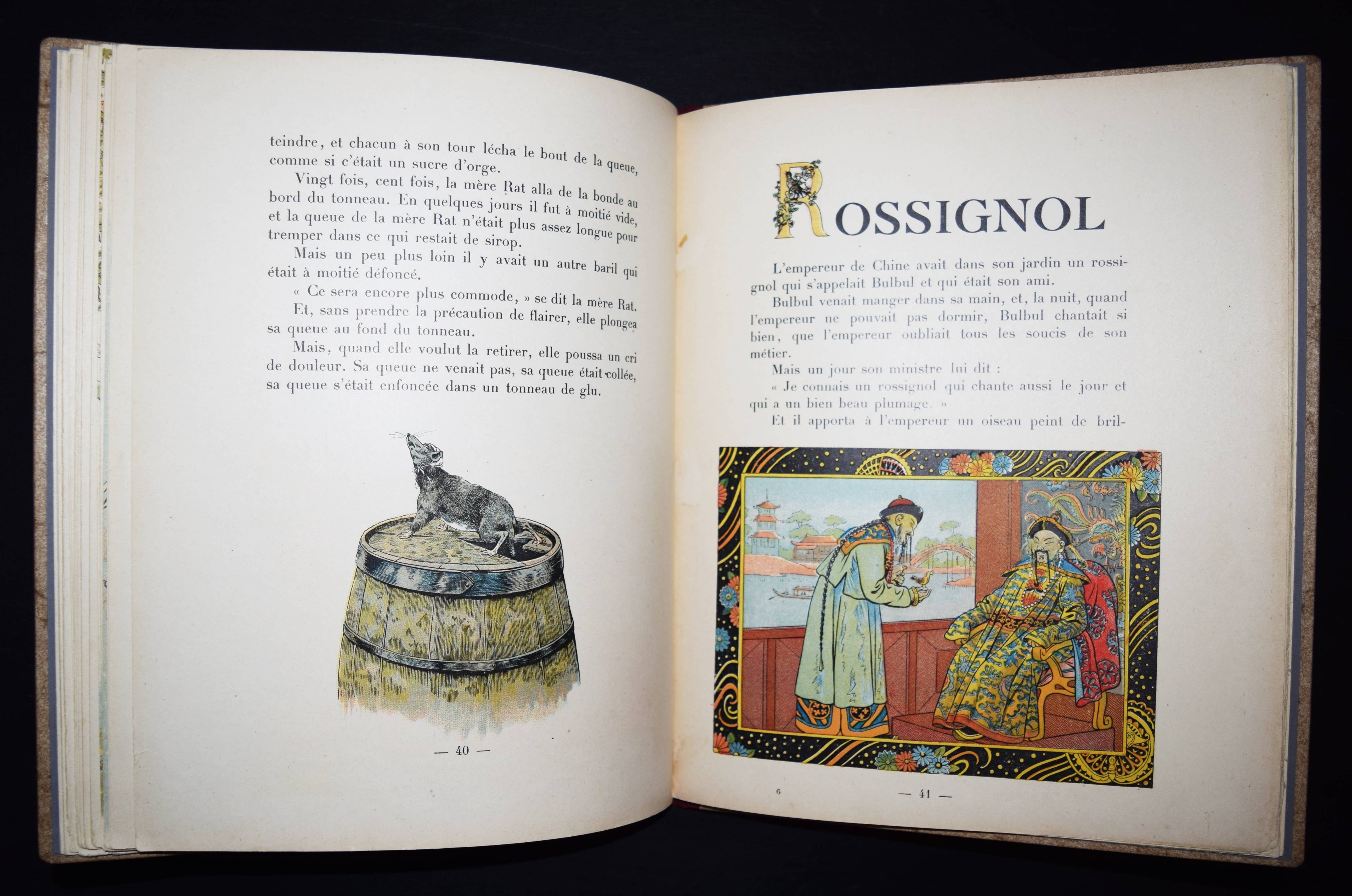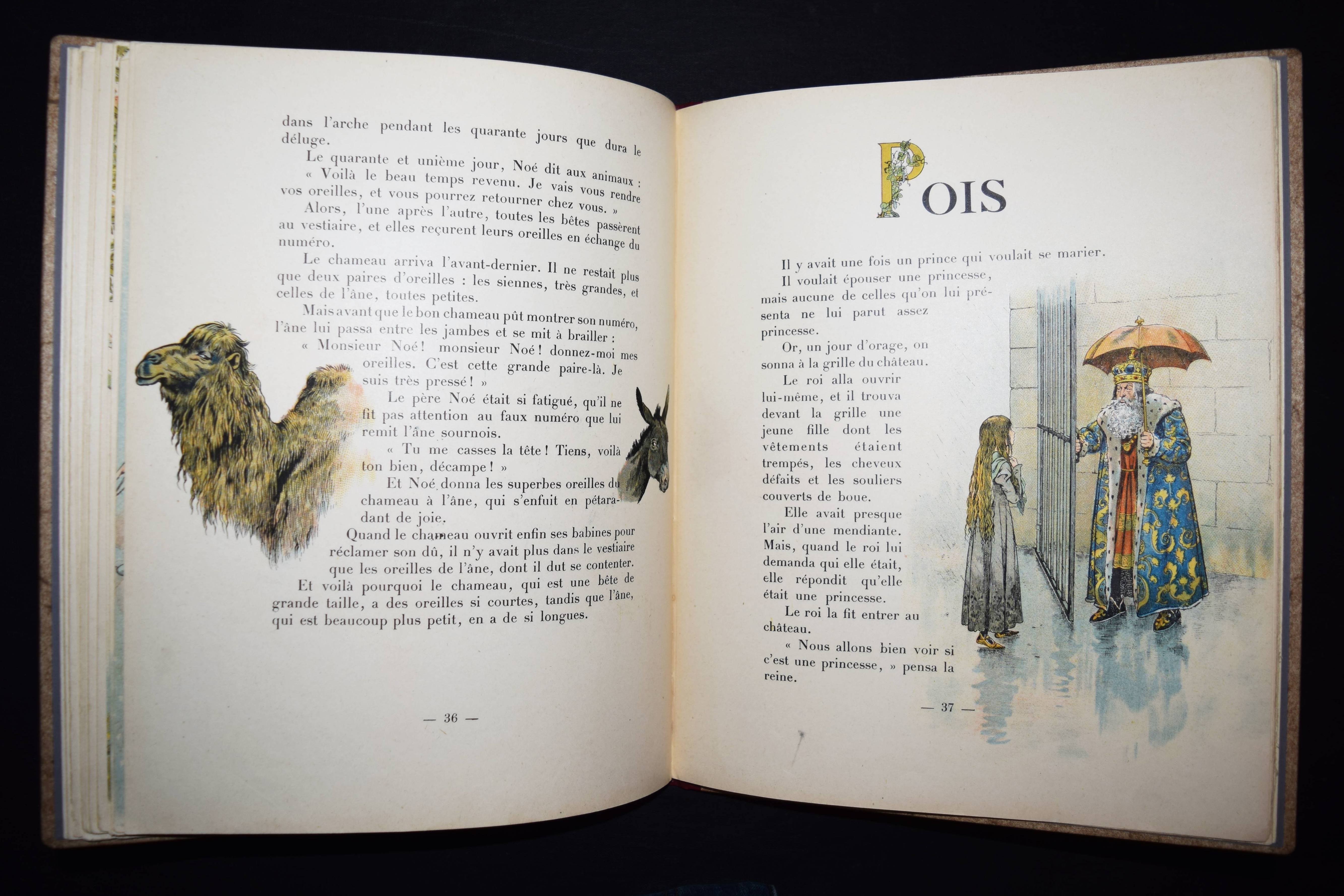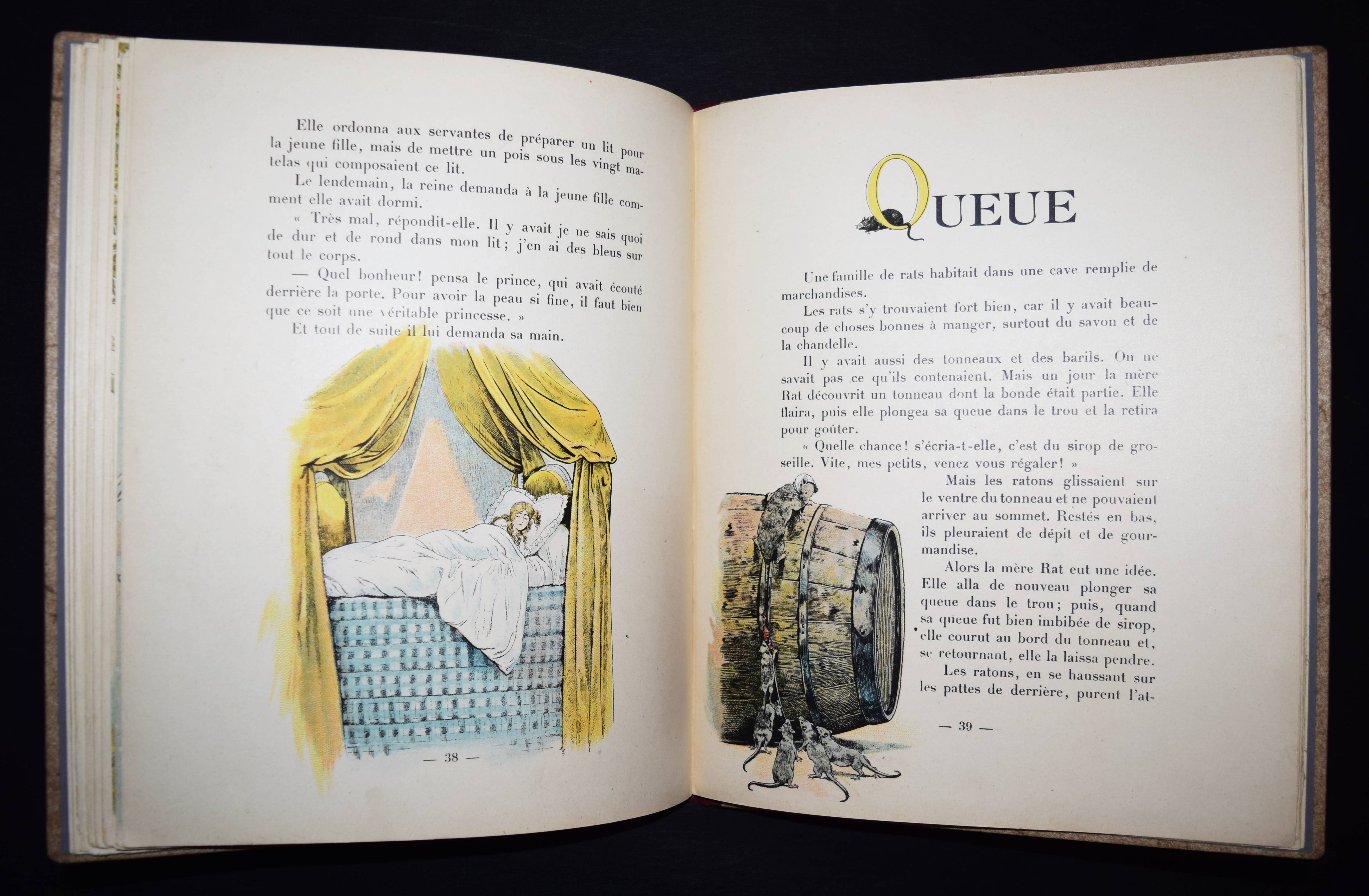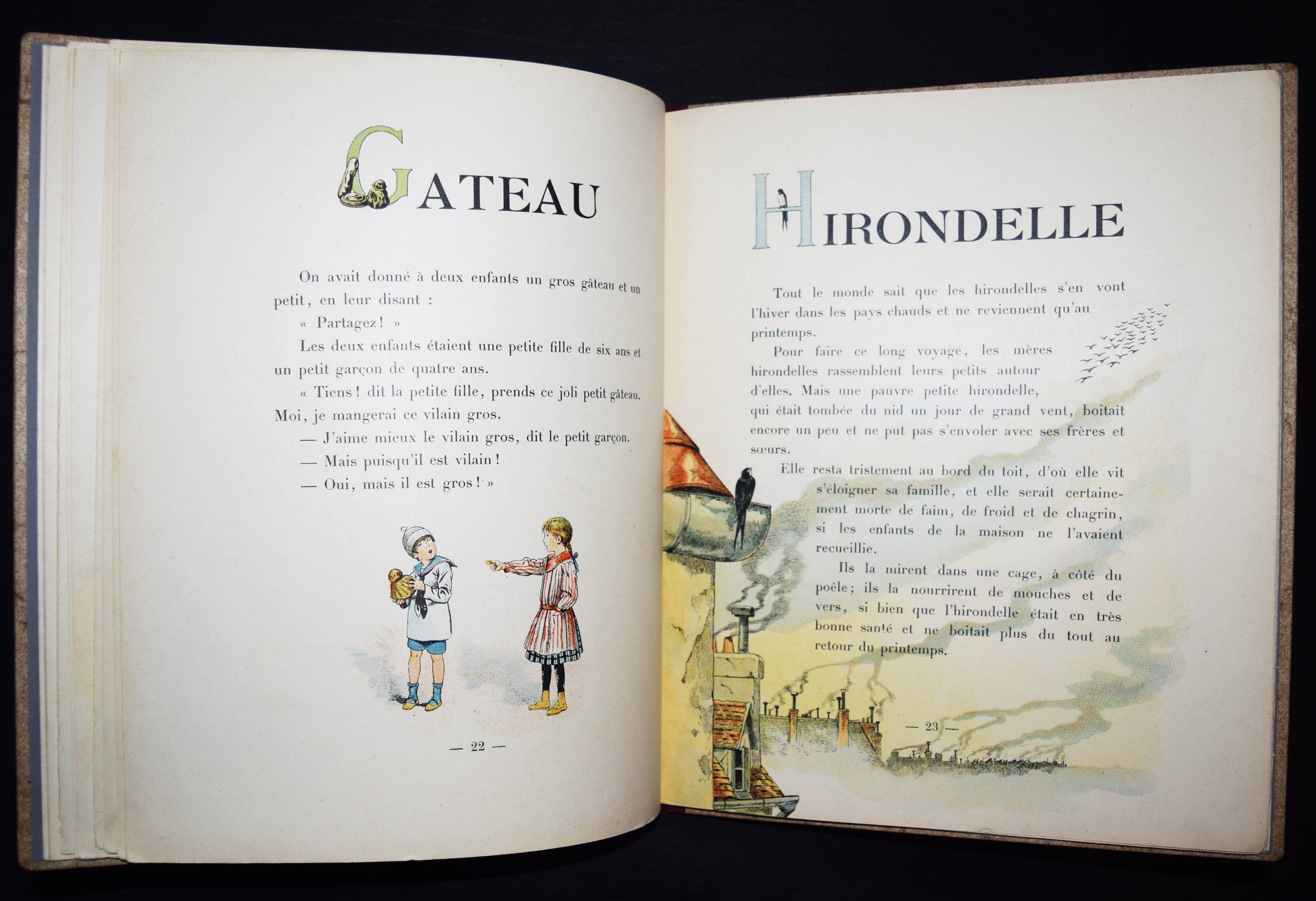 ABC – Lemaitre, Jules. ABC. (Deckeltitel zusätzl.:) Petits Contes. Avec des images de Job (d.i. Jaques-Marie-Gaston Onfray de Bréville). Tour, Mame et fils o. J. (1921). 4°. 54 S. mit farblithogr. Illustrationen. Hln. mit mont. farb. Deckelbildern. Erste Ausgabe. – Reizvoll illustriertes ABC-Bilderbuch des bekannten franz. Illustrators (vgl. Bénézit VI, 76). Mit einem Vorwort von Myriam Harry (dat. 1919), aus dem hervorgeht das das Buch bereits 1914 erscheinen sollte, was aber wegen des 1. Weltkriegs nicht realisiert werden konnte. – Nach einem farbigen Bilderalphabet folgt zu jedem Buchstaben ein kurzes Märchen, meist mit Tieren als Hauptfiguren (Ane, Bélier, Canard etc.).– Das dekorative Frontispiz zeigt eine Gerichtsszene mit Tieren als Richtern und Kindern als Angeklagte, die unter einer Schiefertafel sitzen. – Einband fachgerecht erneuert, gutes sauberes Exemplar.