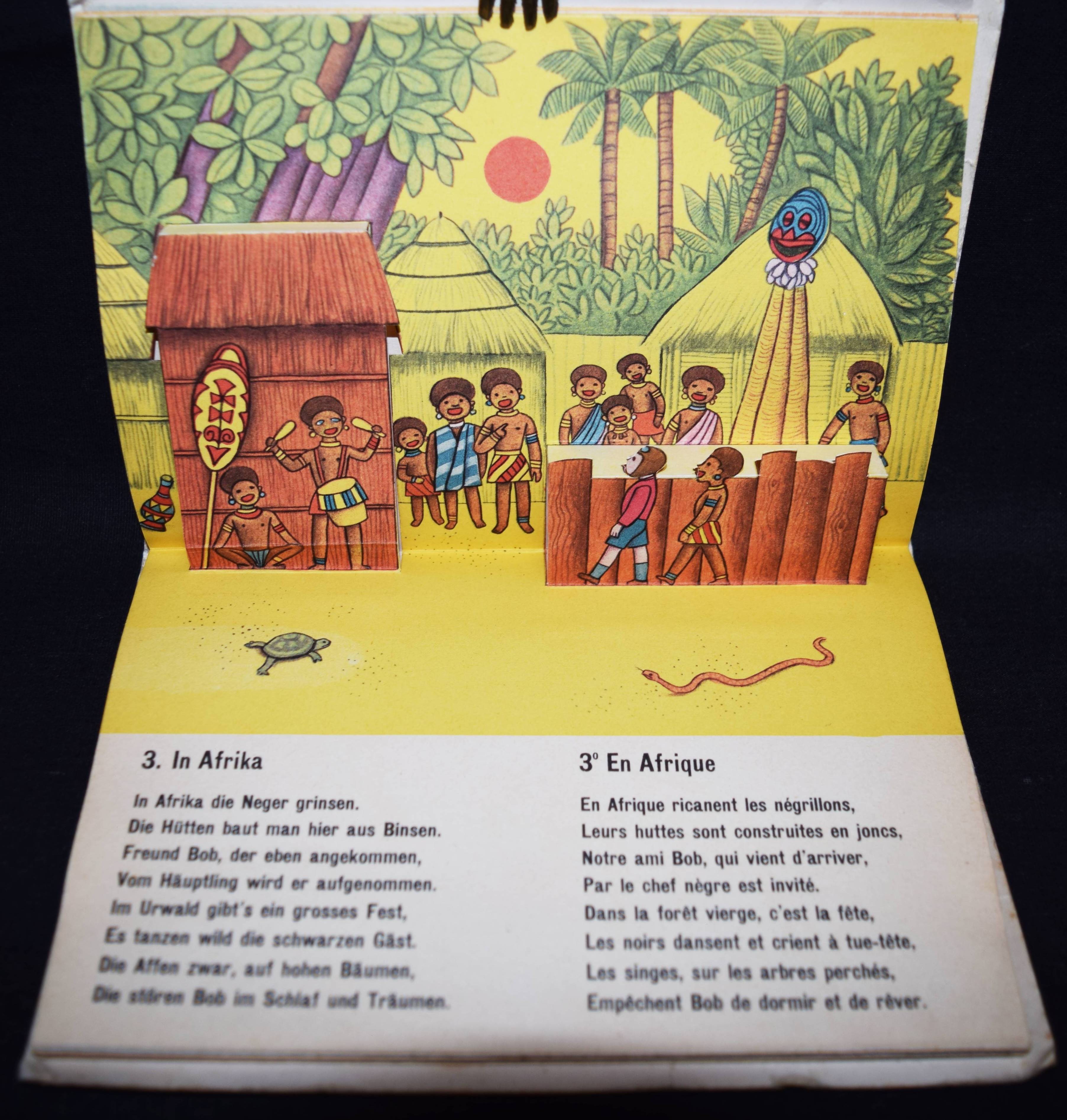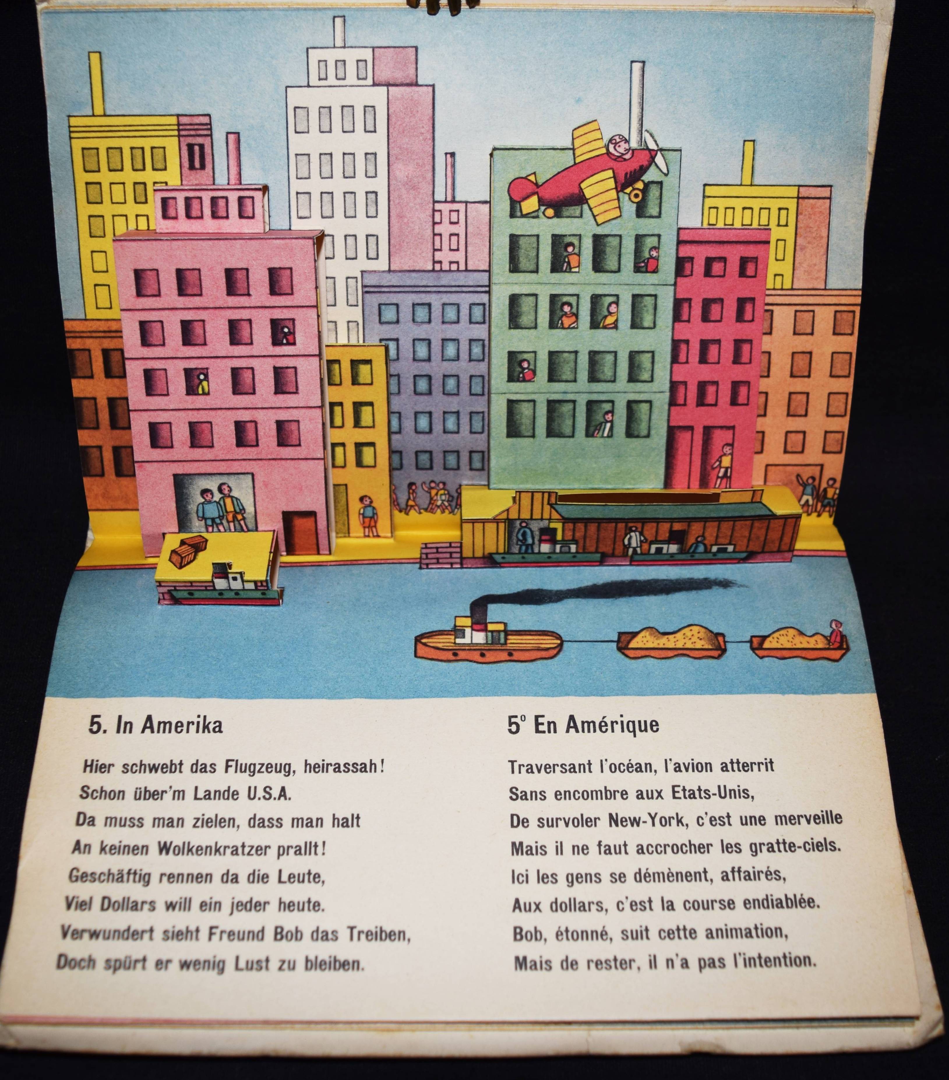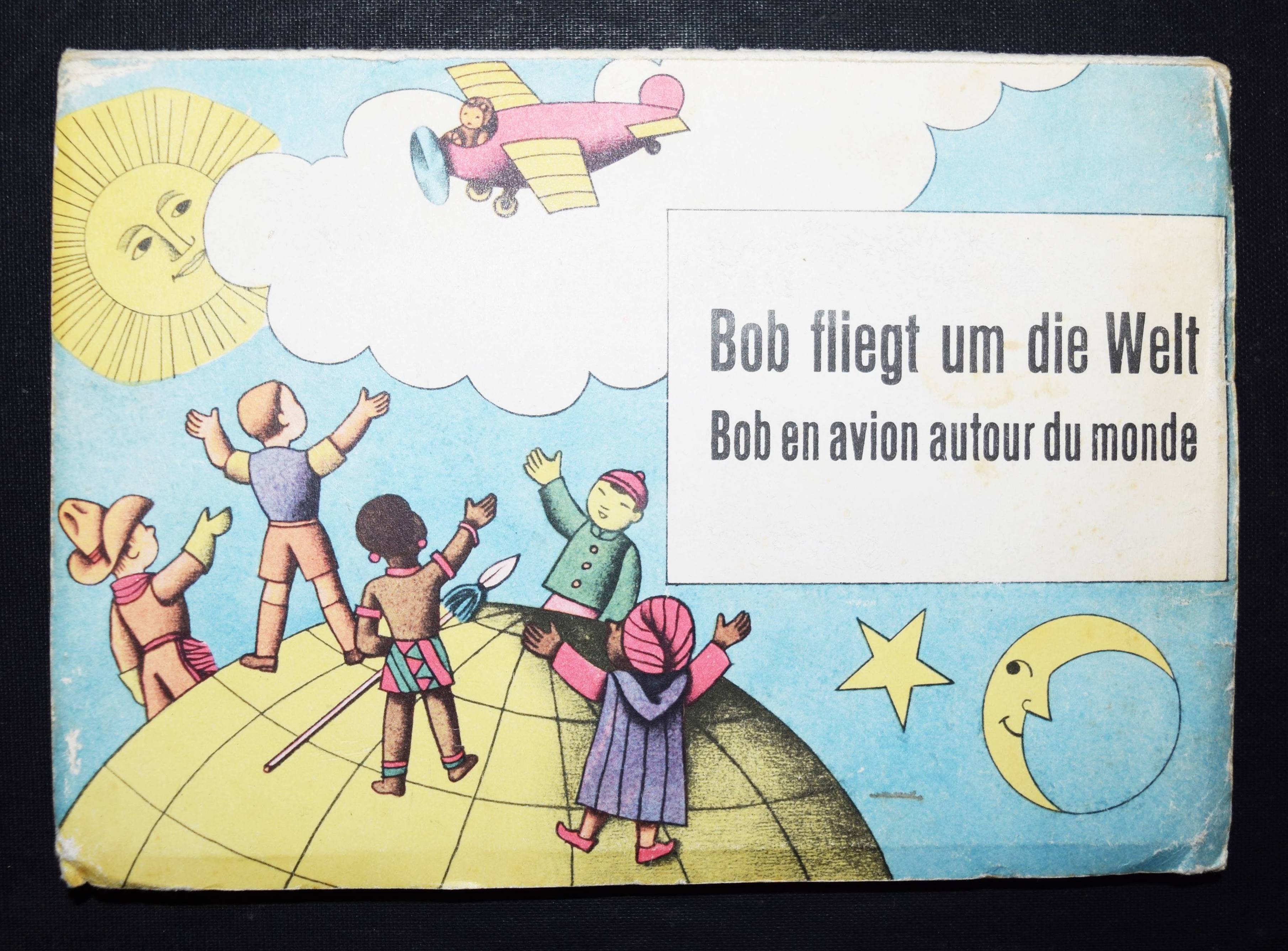 Bachmann, P(aul). Bob fliegt um die Welt. Bob en avion autour du monde. (Zürich), Papyria o. J. (1946). Quer-Kl.-8°. 7 Bl. mit 8 farb. Aufstellbildern. Farbig illustr. OKart. Muck II, 678 (dat. 1947). SBI 126 u. S. 5. Weismann 26. – Spielbilderbuch mit flächigen plakativen Illustrationen des schweizer Graphikers P. Bachmann (1896-1971). Text zweisprachig deutsch/französisch. – Umschlag etwas berieben und leicht fleckig, sonst gut erhalten.