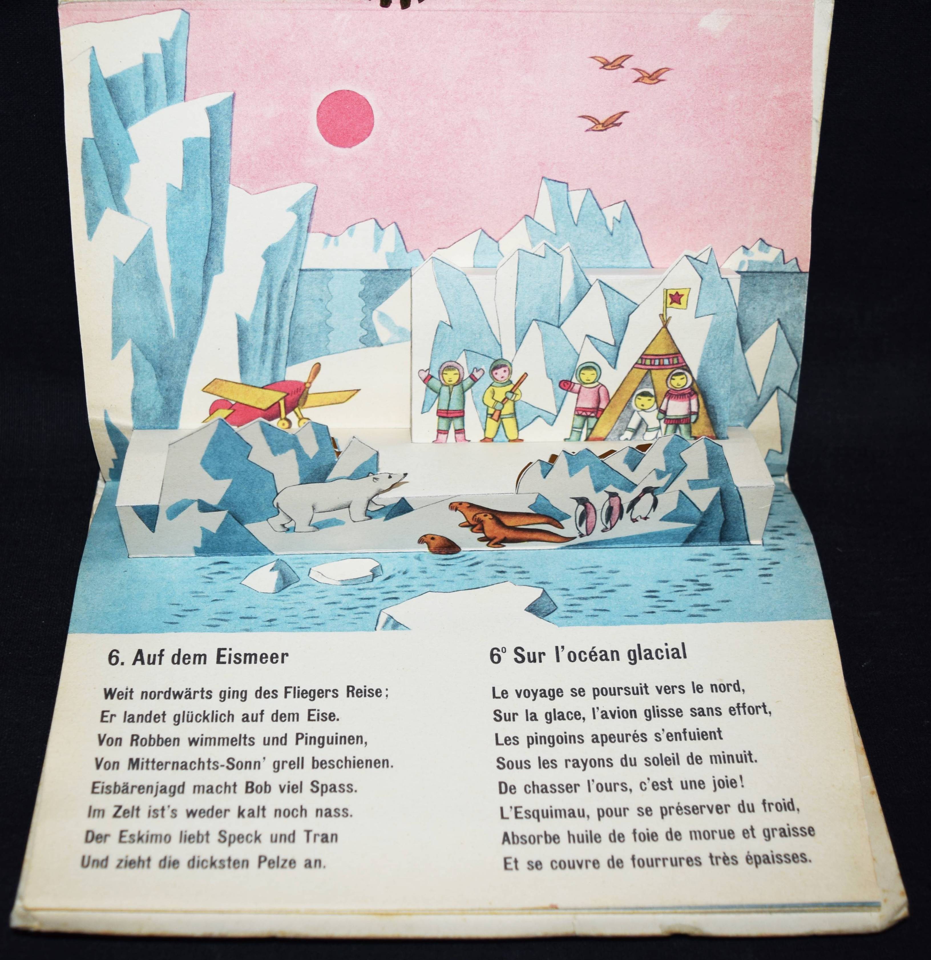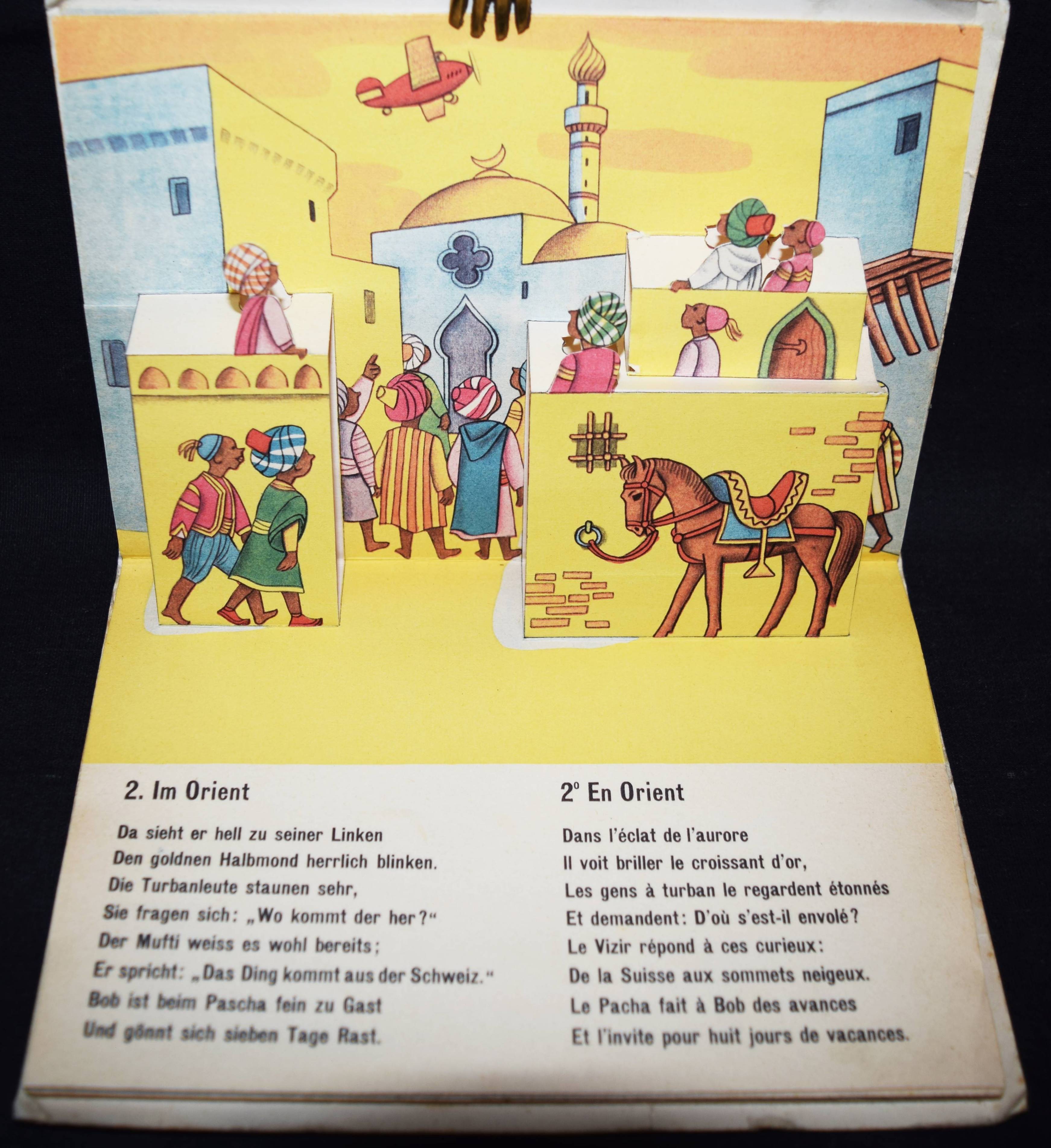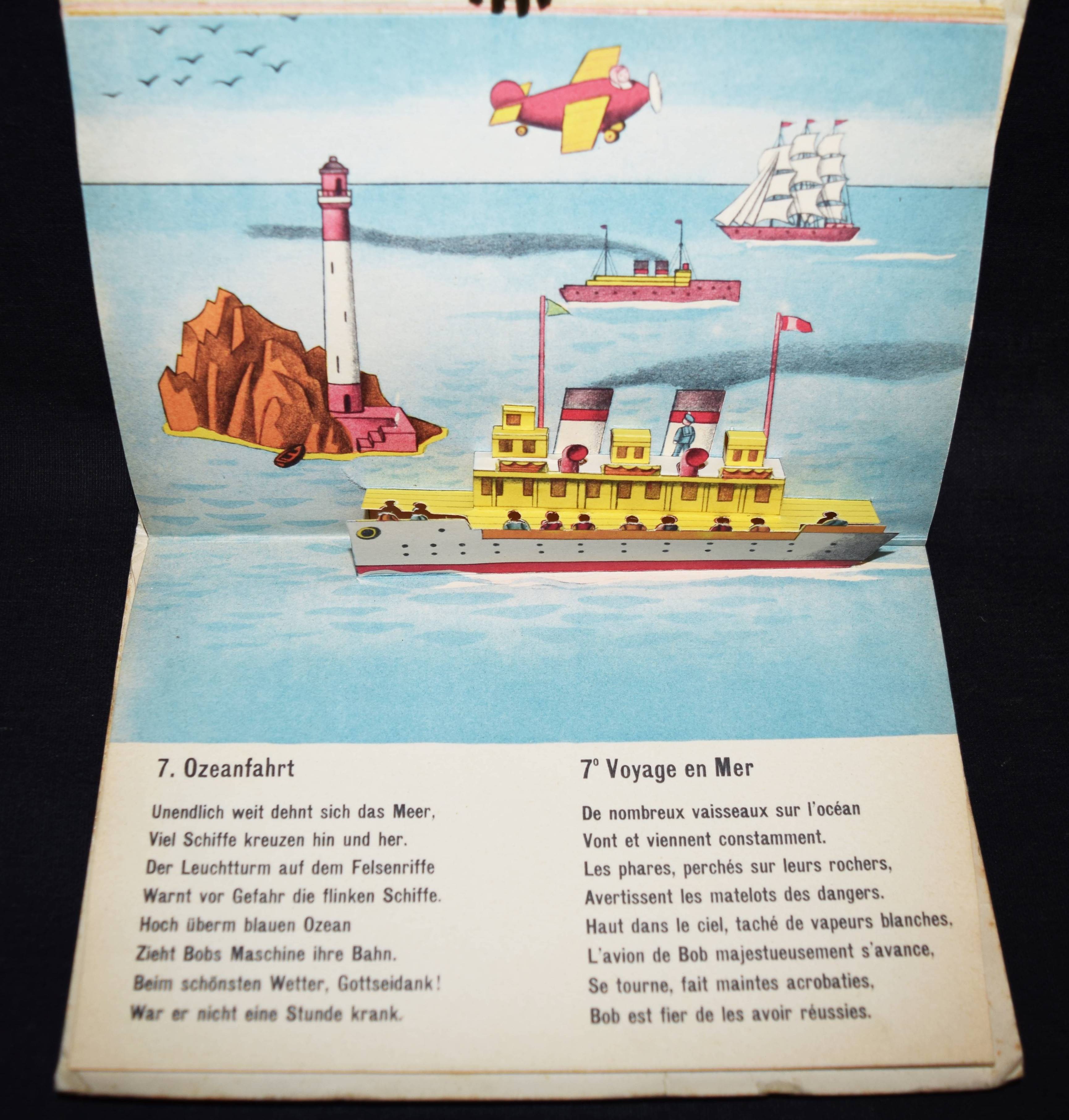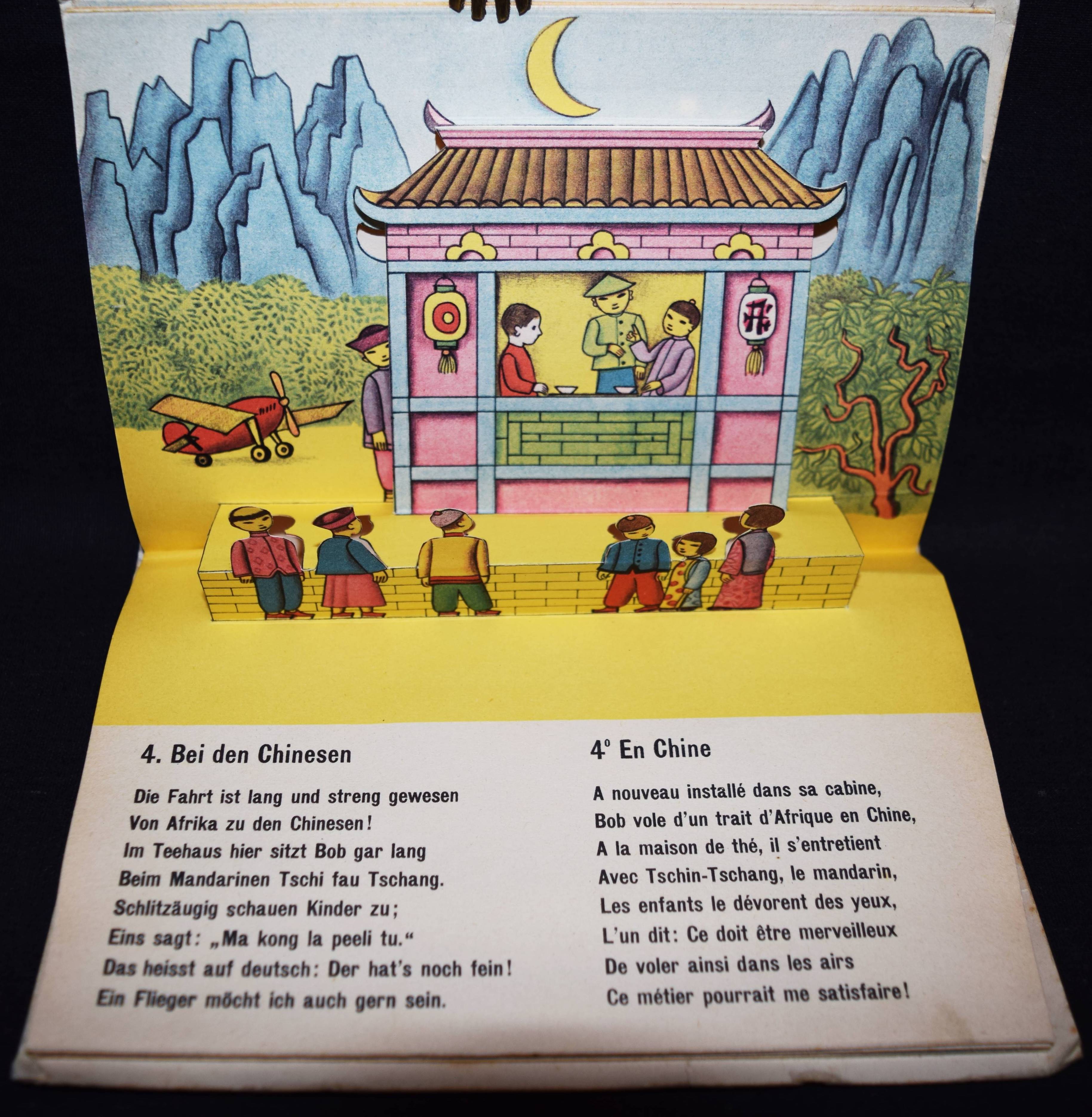 Bachmann, P(aul). Bob fliegt um die Welt. Bob en avion autour du monde. (Zürich), Papyria o. J. (1946). Quer-Kl.-8°. 7 Bl. mit 8 farb. Aufstellbildern. Farbig illustr. OKart. Muck II, 678 (dat. 1947). SBI 126 u. S. 5. Weismann 26. – Spielbilderbuch mit flächigen plakativen Illustrationen des schweizer Graphikers P. Bachmann (1896-1971). Text zweisprachig deutsch/französisch. – Umschlag etwas berieben und leicht fleckig, sonst gut erhalten.