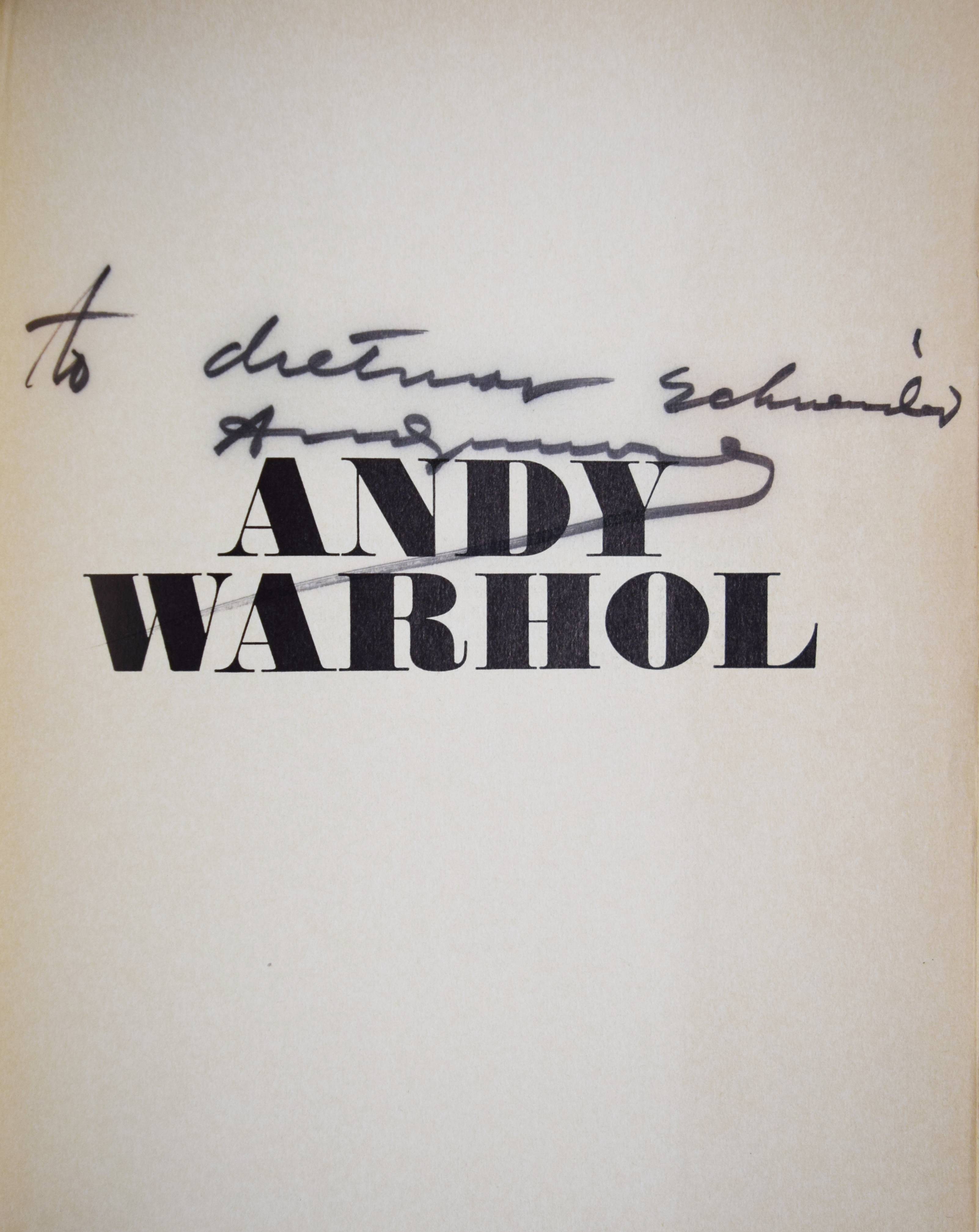 Warhol – Andy Warhol. (Publication on the occasion of the Andy Warhol Exhibition at Moderna Museet in Stockholm, February-March 1968). Second edition. Malmö, Melin, Svensson, Arbman (1969). Gr.-8°. [327] Bl. mit über 300 meist ganzs. Abb. nach Photographien von Rudolph Burckhardt, Eric Pollitzer und John D. Schiff. Farbig illustr. Orig.-Pappband mit Orig.-Versandkarton. Crone 81. Parr/Badger II, 144 f. The Open Book 238 f. – Von Andy Warhol, Kaspar König, Pontus Hultén und Olle Granath herausgegeben. – Mit eigenhändiger Widmung von A. Warhol „to Dietmar Schneider Andy Warhol“. – „The Moderna Museet book is a worthy adjunct to Index (Book), an exhibition catalogue that transcends any limitations that might be suggested by this genre. It is a fine example of the catalogue-as-artist’s-book, a form that ostensibly began with the Dadaists and Surrealists, and is produced with some of the roughest reproductions ever seenm which are entirely appropriate, and supplemented by a long sections of Factory snapshots again by Billy Name. The genre was revitalized by the Pop movement, and Warhol in particular, which demonstrates his position as a latter-day Dadaist. If you could only have one Warhol-inspired photobook, the Index must rank first, but the Moderna Museet book is close behind“ (Parr/Badger). – „Die Fotografie und das Fotografieren bilden das Zentrum des Werks von Andy Warhol“ (U. M. Schneede in Koetzle). – Der meist fehlende Versandkarton mit Gebrauchsspuren, papierbedingt wie immer gebräunt, sehr gutes Exemplar. – Edited by Andy Warhol, Kaspar König, Pontus Hultén and Olle Granath. – With handwritten dedication by A. Warhol “to Dietmar Schneider Andy Warhol”. – The mostly missing shipping carton with traces of use, browned paper as usual, very good copy.