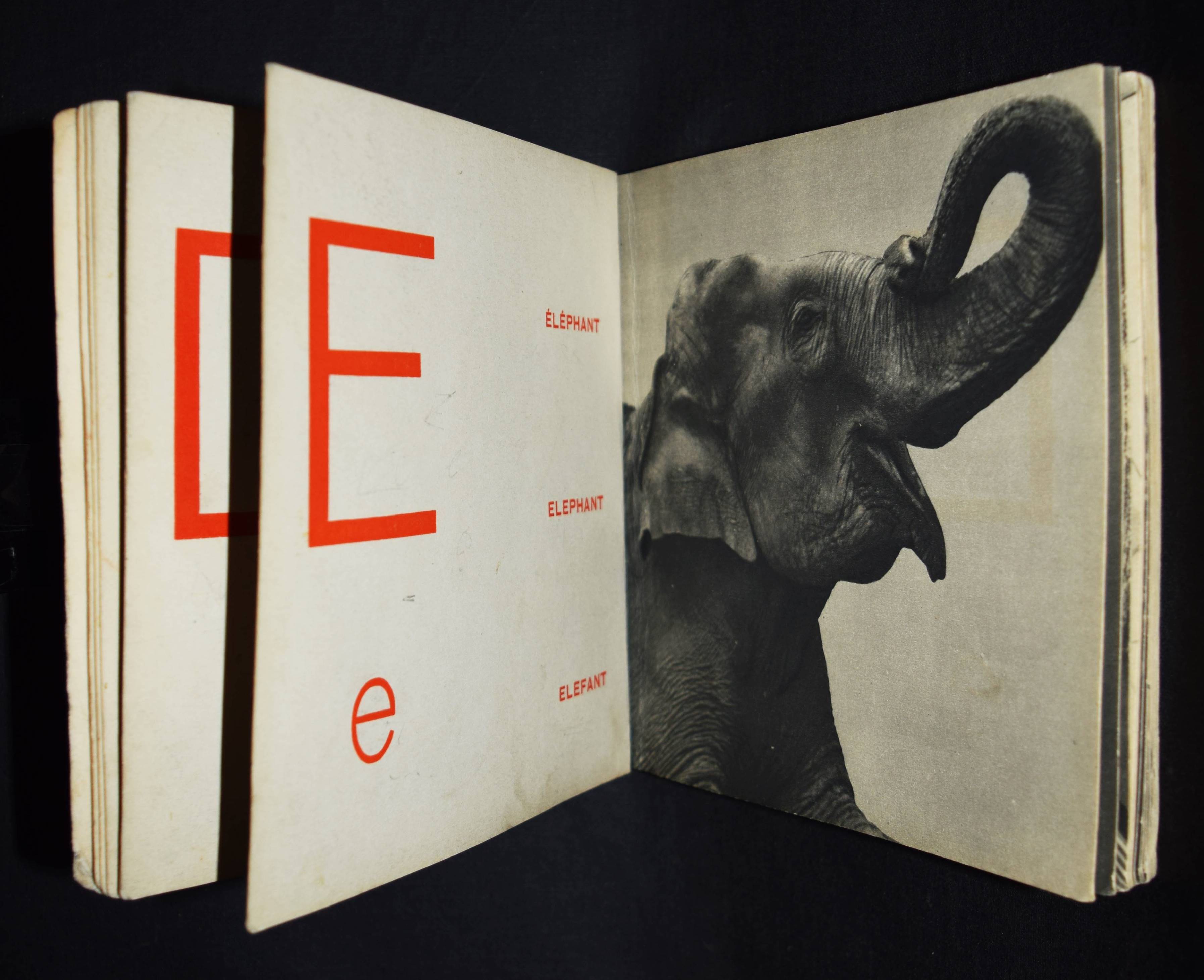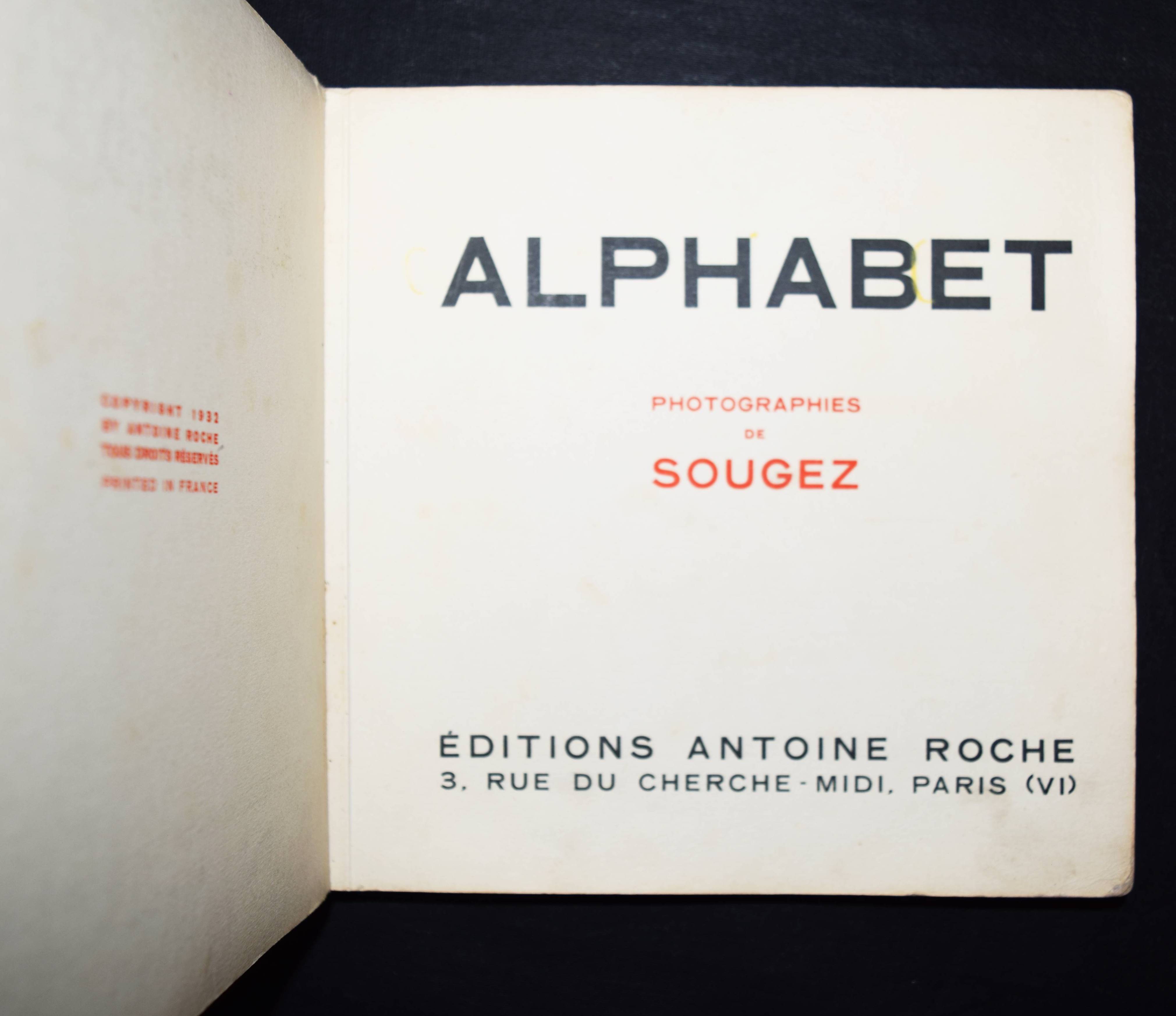 Sougez, (Emmanuel). Alphabet. Photographies. Paris, Éditions Antoine Roche (1932). Quer-8°. [52] S. mit 26 Tafeln in Heliogravure. Illustr. Orig.-Pappband. Auer 194. Bouqueret, Paris 114 f. Koetzle 430 f. – Einzige Ausgabe, sehr selten. – Neben „Regarde!“ (1931) und Steichens „First Picture Book“ (1930) das wichtigste Photo-Bilderbuch der Vorkriegszeit. – „En 1932 Sougez puplie chez deux éditeurs différents deux ouvrages à destination des très jeunes enfants. Dans les deux cas, le photographe semble s’être plié à la vision de l’éditeur et aux attentes présumées du public visé. On peine à retrouver sa magie en effet. Comparé à celui de Maurice Cloche, son abécédaire ne s’élève par example jamais au-dessus de l’illustration“ (C. Bouqueret). – „During the 1930s, especially, publishers showed great enterprise in employing photography to illustrate books for children, commissioning some oft he finest photographers, and utilized the medium in both a realistic and a fantastic way. The children’s photobook of that era is a serious study in itself, and is largely outside our remit. … The great thing about children’s photobooks from this period of high modernism was that publishers gave photographers a freer rein than they might have enjoyed if illustrating adult books, were their audiences had much more rigid expectations of what they wanted to see“ (Parr/Badger I, 102 zu „Regarde!“). – E. Sougez (1889-1972) ist die „Graue Eminenz“ (H.-M. Koetzle) der französischen Fotografie um 1940. „Wenn es Sougez gelungen ist, der Geschichte der französischen Fotografie seinen Stempel aufzudrücken, dann verdankt er dies seinen Stillleben(,) … die, wie er selbst schreibt, ‚den wesentlichen Teil (seines) Werkes ausmachen‘ und ihn als den führenden Kopf der reinen Fotografie in Frankreich ausweisen“ (S. Rochard in Koetzle). – Umschlag mit unauffällig restaurierten Abriebstellen und leichten Knickspuren, wenige Textseiten mit noch schwach sichtbaren Bleistiftspuren, vereinzelt geringf. fingerfleckig, noch sehr gutes Exemplar des empfindlichen Kleinkind-Bilderbuchs. – Single issue, very rare. – Alongside “Regarde!” (1931) and Steichen’s “First Picture Book” (1930), this is the most important photo picture book of the pre-war period. – – Cover with inconspicuously restored abrasions and slight creases, a few text pages with still faintly visible pencil marks, occasional minor fingerstaining, still a very good copy of this delicate picture book for small children.
