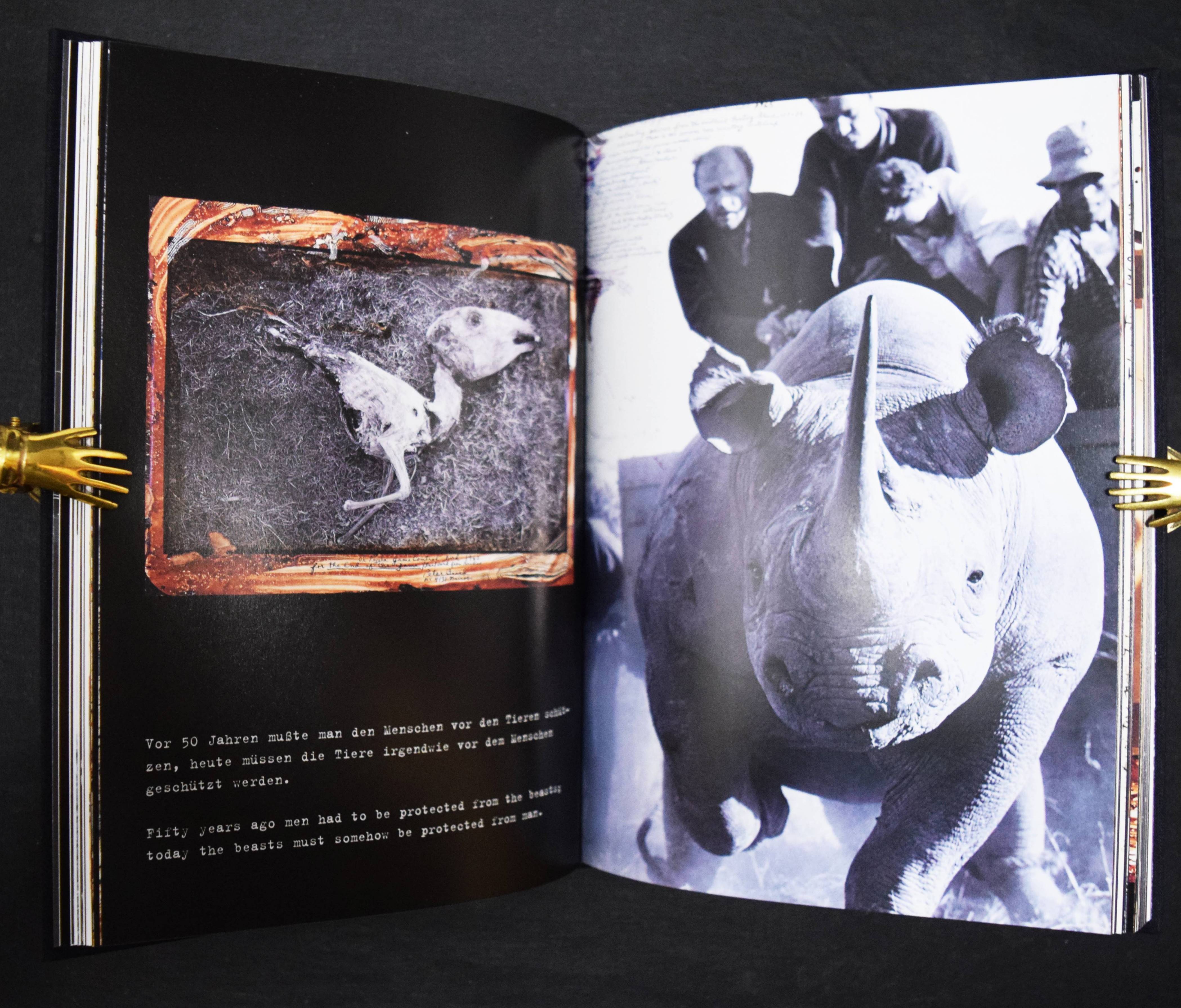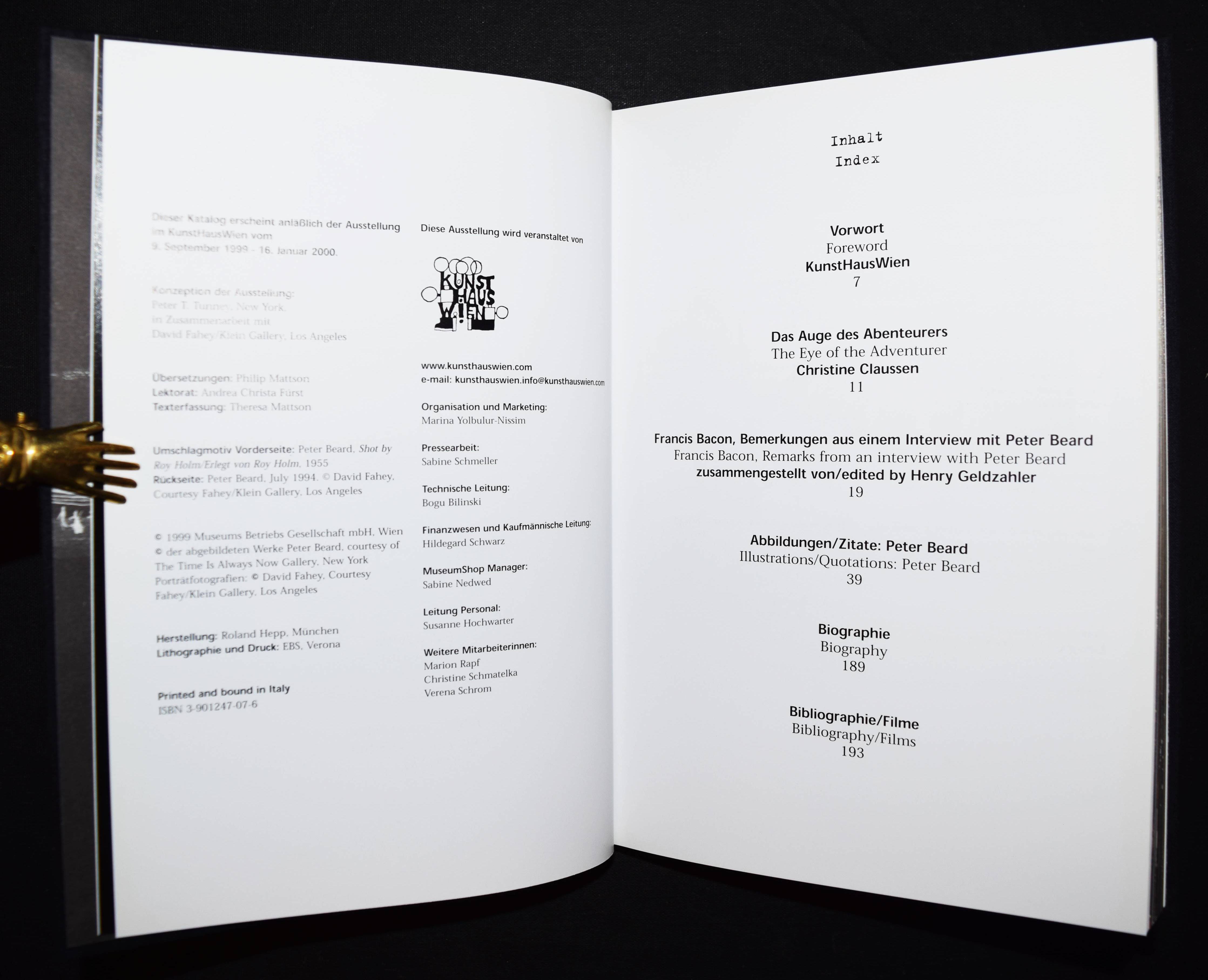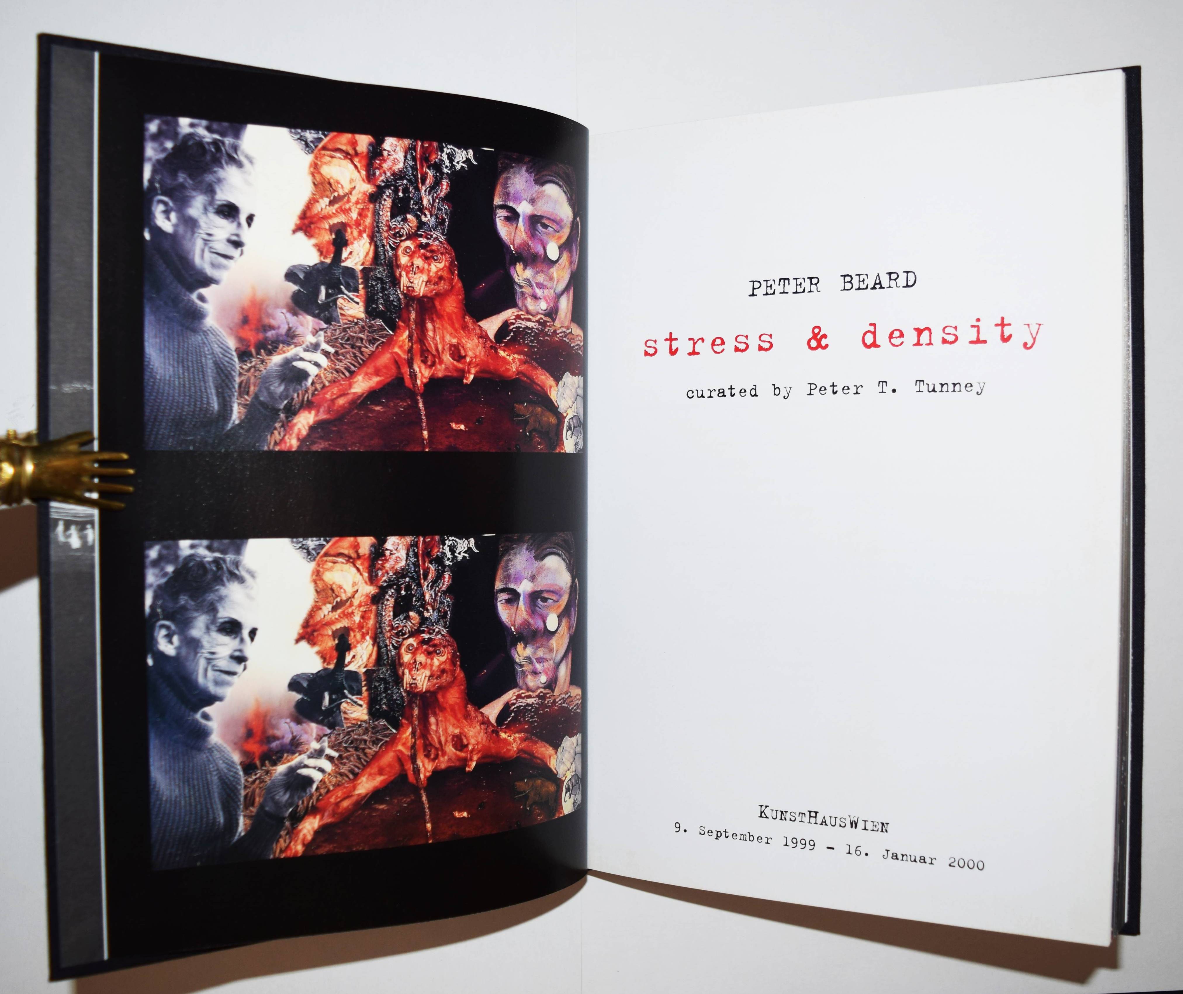 Beard, Peter (Hill). Stress & density. Curated by Peter T. Tunney. (Katalogbuch zur Ausstellung: Kunsthaus Wien, 9. September 1999 – 16. Januar 2000). Wien, Kunsthaus 1999. 8°. 193 S. mit 192 Farbtafeln. OLn. mit farb. Deckelbild u. mont. Portrait. Koetzle 37 f. (mit 2 Abb.). – Texte in deutsch und englisch. – „Seit 1961 ist Peter Beards ganze Existenz fest mit Afrika und Tieren verknüpft. Elefanten natürlich, aber auch Krokodile, Zebras, Büffel, Löwen, Nashörner, Antilopen, elegante Giraffen, herrlich majestätische Adler und schwerfällige Flusspferde bevölkern eine Welt, in welcher der Mensch einen natürlichen Platz einnimmt. Ohne das Gewalttätige in der Natur zu beschönigen, hinterfragt Peter Beard die selbstmörderische Torheit des Menschen – jene, die wir Fortschritt nennen und die auf der erbärmlichen Verehrung von Kommerz und Profit, von falschen Fassaden und äußerem Schein beruht“ (C. Caujolle in Koetzle). – Tadellos.