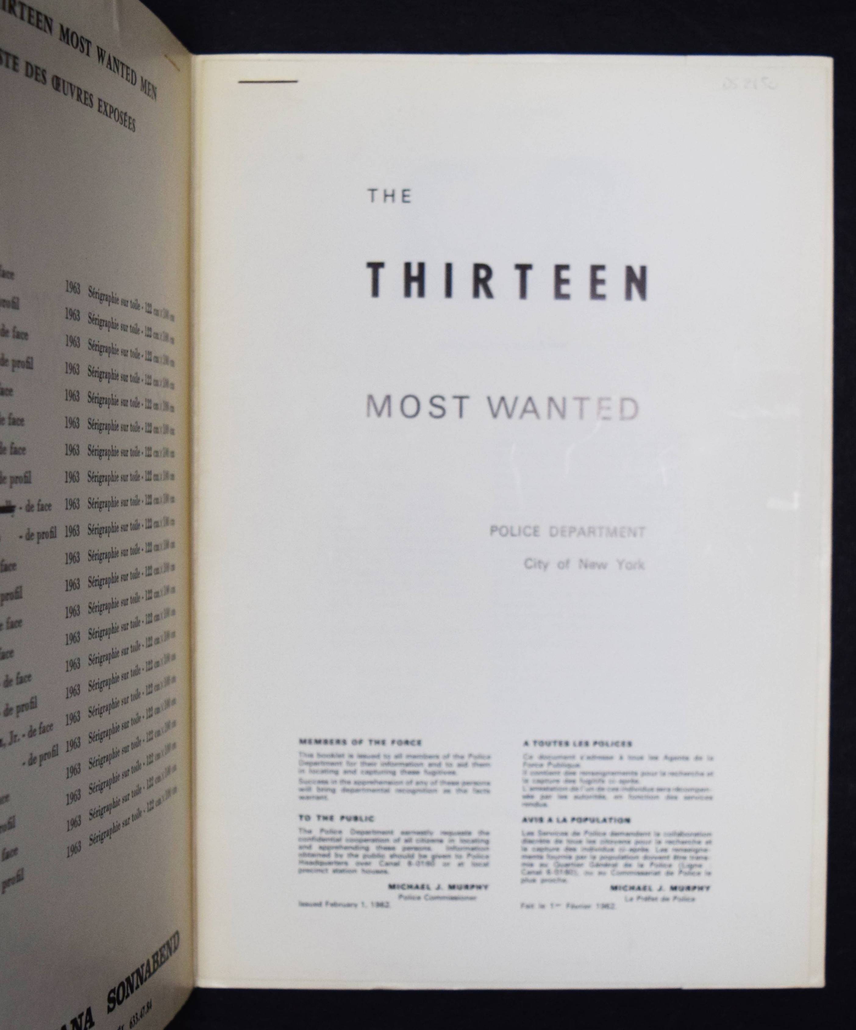 Warhol, Andy. The thirteen most wanted men. Dossier N° 2357. Paris, Galerie Ileana Sonnabend (1967). 4°. [6] Bl. und 1 Orig.-Serigraphie. Klammerheftung in Orig.-Umschlagkarton. McShine-Sharre 461. Vgl. Crone 404 (mit Abb. 405). – Seltener Katalog der Galerie Sonnabend in Form eines Polizeidossiers mit Verzeichnis von 22 Arbeiten von A. Warhol und einem Text „Rembrandt vidé de Rembrandt“ von Otto Hahn. Mit dem Motto von Robert Delaunay „La photo est un art criminel“. – Enthält die Serigraphie „One of the 13 most wanted men, n° 11: John Joseph H.“ – Umschlag geringf. angestaubt und im Rand leicht gebräunt, sehr gutes Exemplar. – Rare catalog of the Sonnabend Gallery in the form of a police dossier with a list of 22 works by A. Warhol and a text “Rembrandt vidé de Rembrandt” by Otto Hahn. With the motto by Robert Delaunay “La photo est un art criminel”. – Contains the serigraph “One of the 13 most wanted men, n° 11: John Joseph H.” – Cover slightly dusty and slightly browned in margins, very good copy.