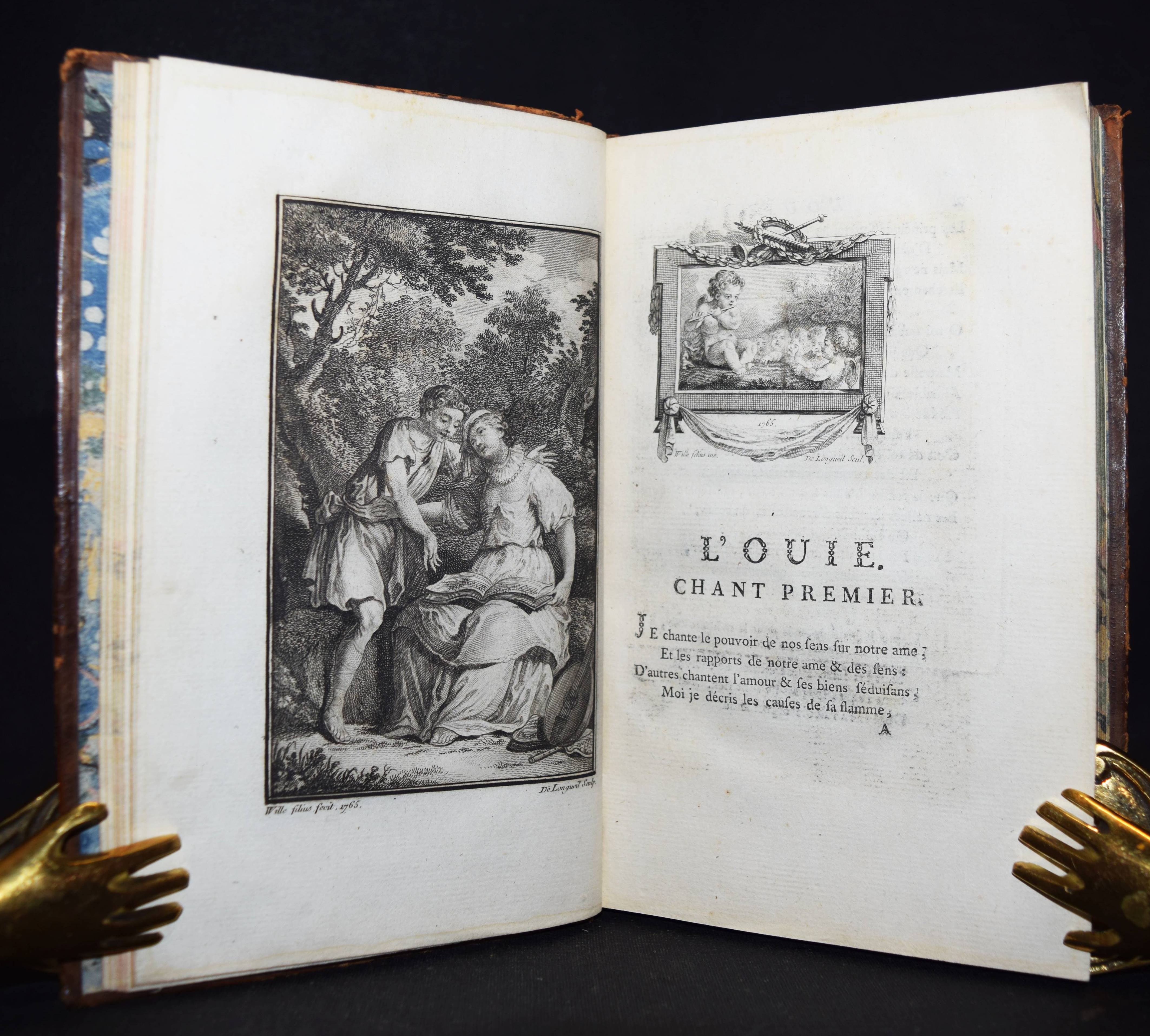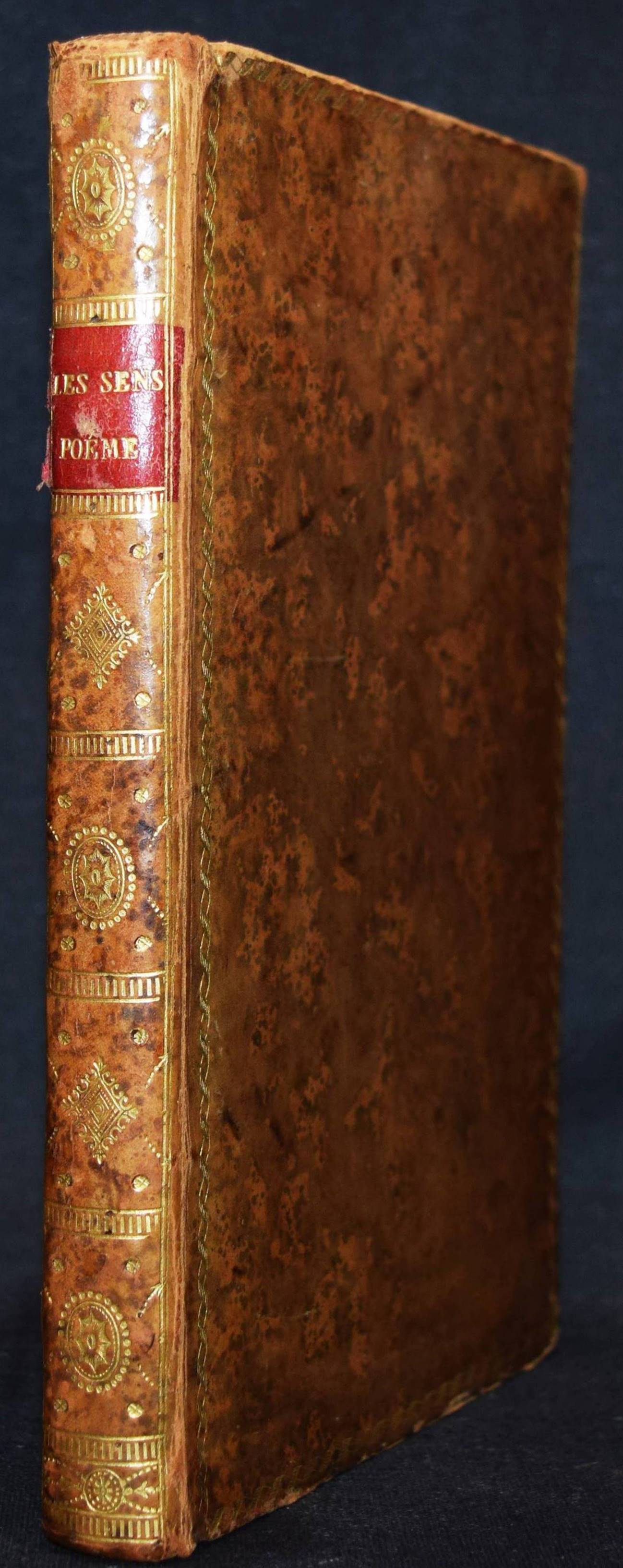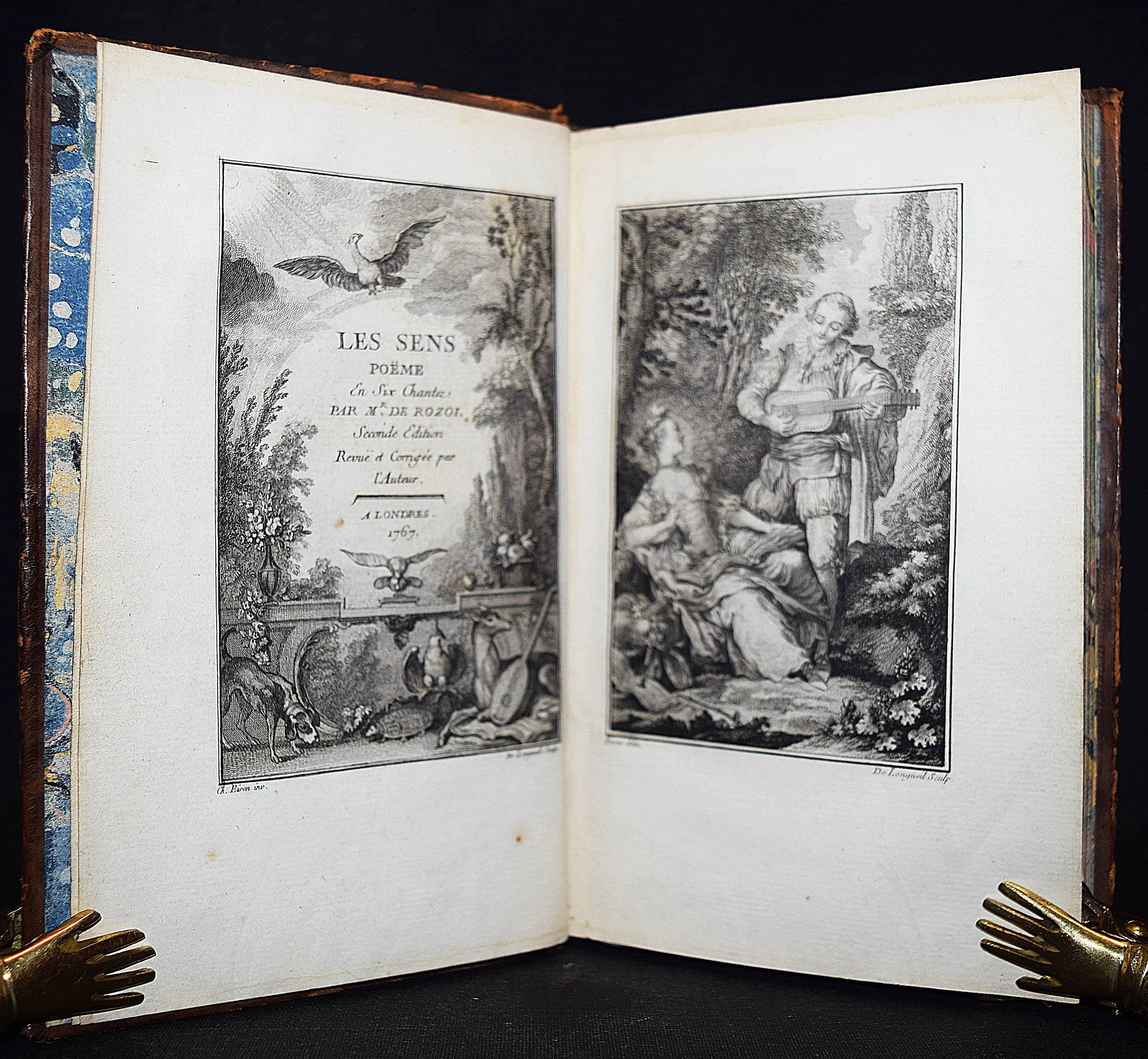 Rozoi, (Barnabé Farmian) de. Les Sens. Poème en six chants. – Beigebunden: Ders. Épitre au verrou de ma porte. Londres (d. i. Paris), o. Dr. 1767. Kl.-8°. Gestoch. Frontispiz, gestoch. illustr. Titel, XVI, 174 S. mit 1 Musikbeilage, 6 Kupfertafeln von de Longueil nach Charles Eisen (4) und P. A. Wille (3) u. 8 gestoch. Vignetten nach Charles Eisen und P. A. Wille. Ldr. d. Zt. mit goldgepr. Rückenschild, dekorativer Rückenverg. u. Deckelfiletten. Cohen/Ricci Sp. 340. Gay-Lemonnyer III, 1095. Salomons S. 94. Sander 594. Vgl. Cioranescu 57739 (nicht diese Ausgabe). – 2. Aufl. mit neuem Titelblatt. – Reizend illustriertes, galantes Buch des franz. Rokoko, das in 6 Gesängen die Sinne und „La Jouissance“ verherrlicht. – Schönes dekorativ gebundenes und sauberes Exemplar.