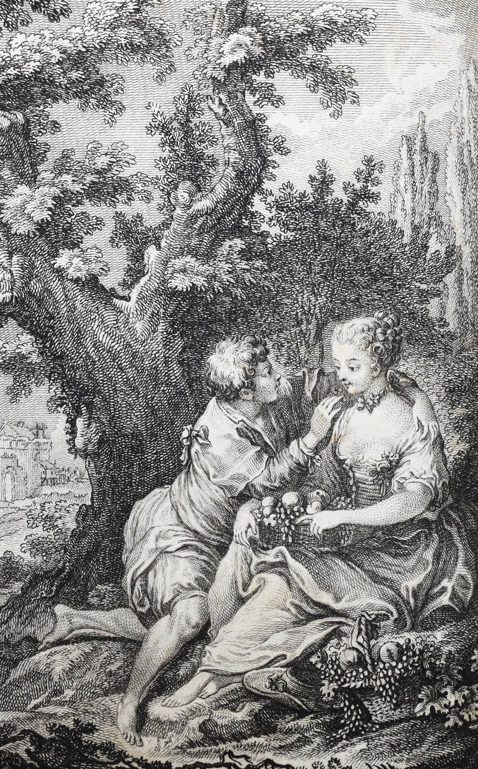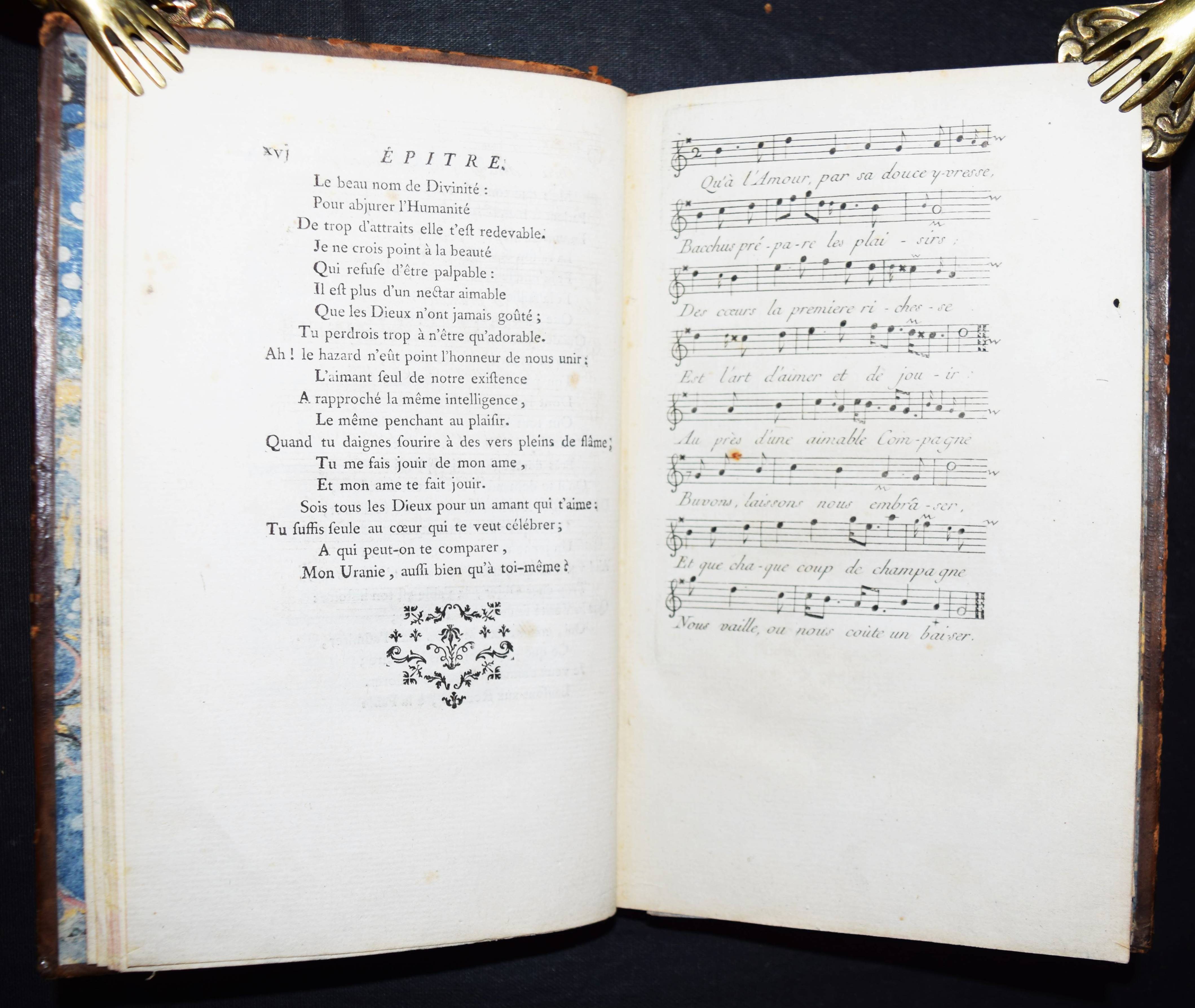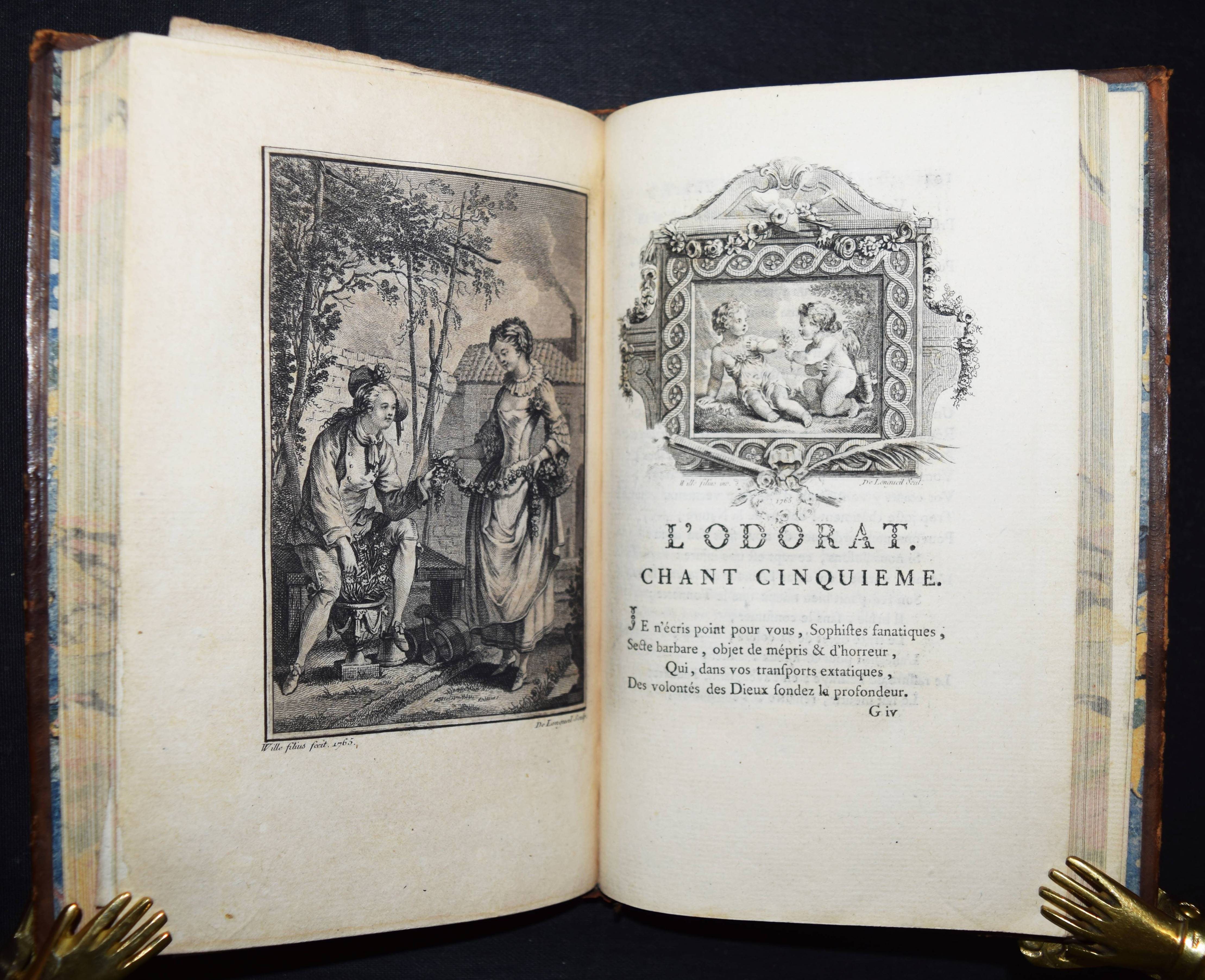 Rozoi, (Barnabé Farmian) de. Les Sens. Poème en six chants. – Beigebunden: Ders. Épitre au verrou de ma porte. Londres (d. i. Paris), o. Dr. 1767. Kl.-8°. Gestoch. Frontispiz, gestoch. illustr. Titel, XVI, 174 S. mit 1 Musikbeilage, 6 Kupfertafeln von de Longueil nach Charles Eisen (4) und P. A. Wille (3) u. 8 gestoch. Vignetten nach Charles Eisen und P. A. Wille. Ldr. d. Zt. mit goldgepr. Rückenschild, dekorativer Rückenverg. u. Deckelfiletten. Cohen/Ricci Sp. 340. Gay-Lemonnyer III, 1095. Salomons S. 94. Sander 594. Vgl. Cioranescu 57739 (nicht diese Ausgabe). – 2. Aufl. mit neuem Titelblatt. – Reizend illustriertes, galantes Buch des franz. Rokoko, das in 6 Gesängen die Sinne und „La Jouissance“ verherrlicht. – Schönes dekorativ gebundenes und sauberes Exemplar.