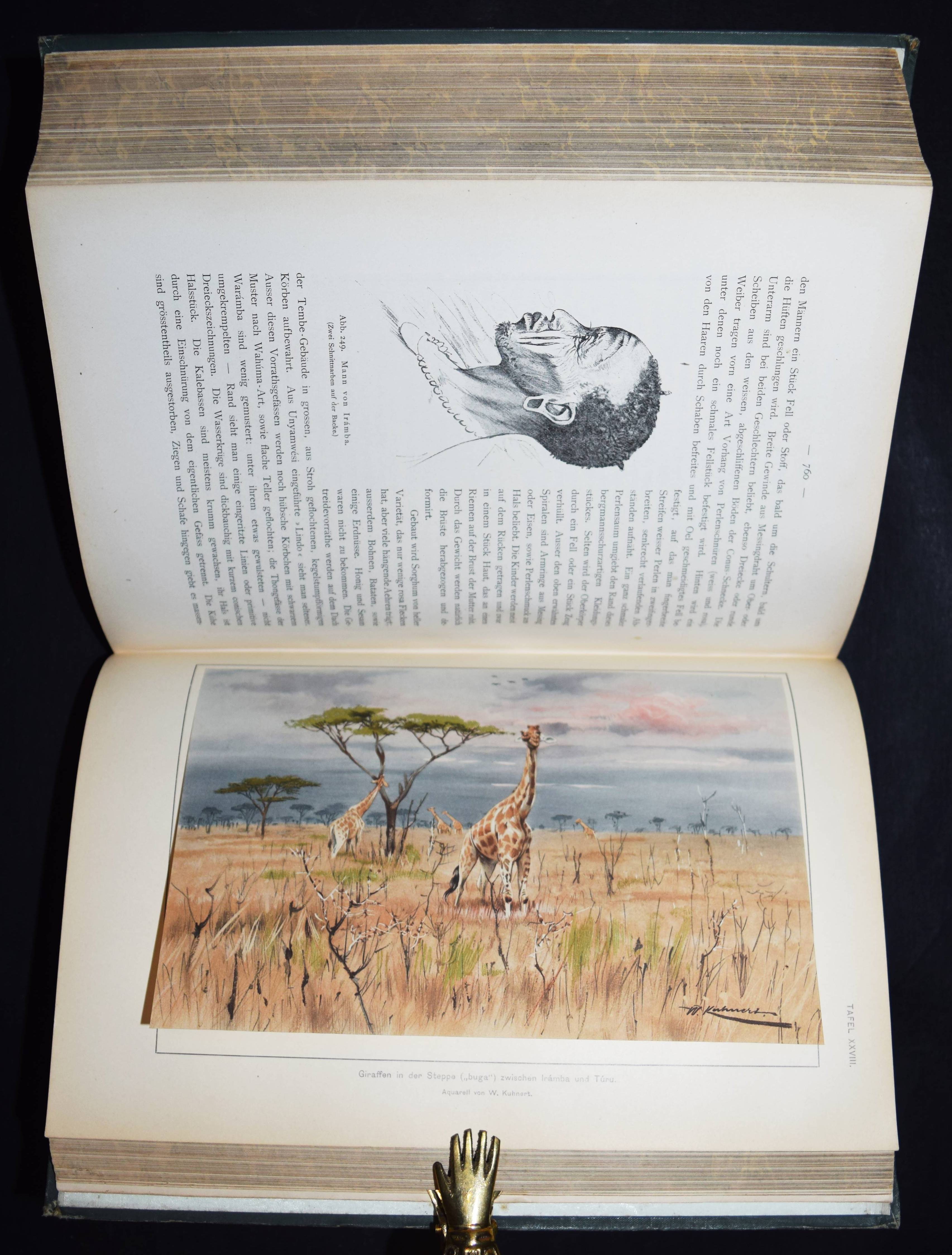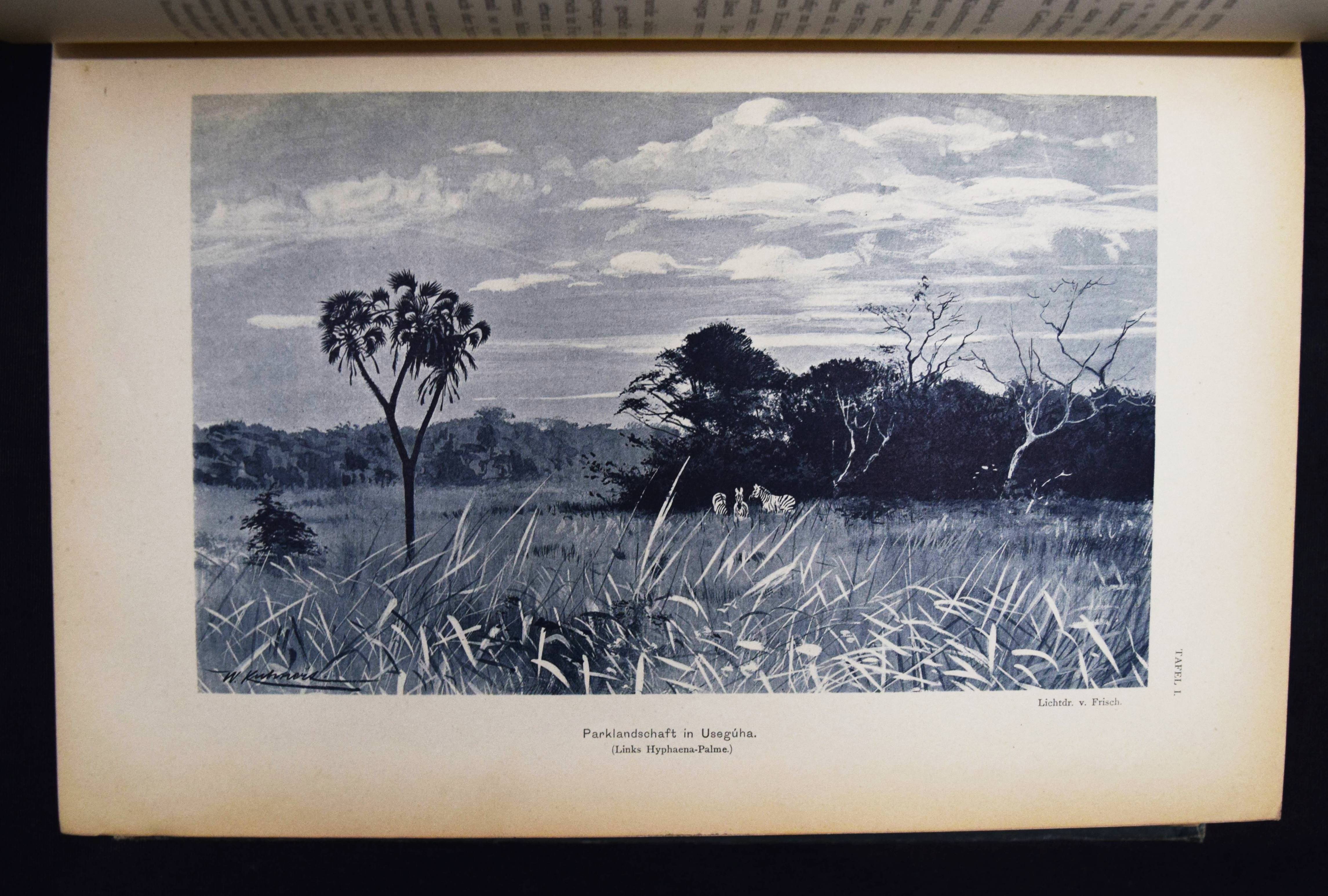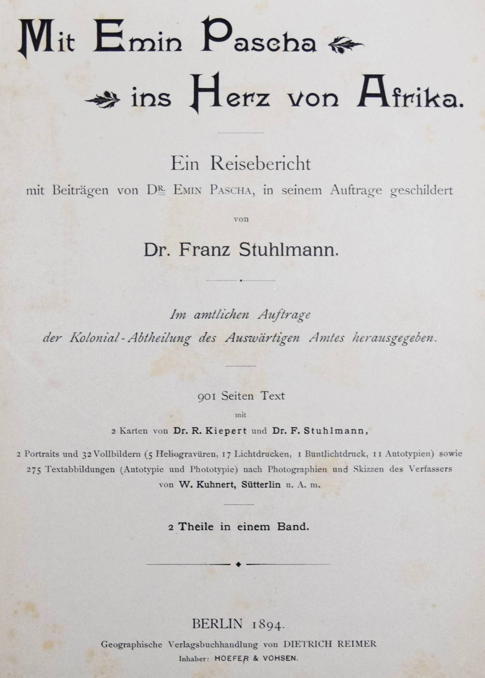 Stuhlmann, Franz. Mit Emin Pascha ins Herz von Afrika. Ein Reisebericht mit Beiträgen von Emin Pascha (d. i. Eduard Schnitzer), in seinem Auftrage geschildert. Im amtlichen Auftrage der Kolonial-Abtheilung des Auswärtigen Amtes herausgegeben. 2 Teile in 1 Band. Berlin, Reimer 1894. 4°. 1 Bl., XXI, (1), 1 Bl., 901 S. mit 2 Porträts, 32 (1 farbige, 2 gefalt.) Tafeln, 275 Textabb. u. 2 mehrf. gefalt. farblithogr. Karten. Illustr. OLn. mit goldgepr. Rücken- u. Deckeltitel, Kopfgoldschnitt. Kainbacher I, 136. NDB IV, 482. – Einzige Ausgabe dieses bedeutenden Werks über die Erforschung Ostafrikas. – Der Hamburger Zoologe Franz Stuhlmann nahm zusammen mit Hauptmann Langheld an der wohl bedeutendsten Ostafrika-Expedition in der deutschen Kolonialzeit teil, die unter Leitung von Emin Pascha von Bagamojo an die Westküste des Viktoriasees bis in das Kongogebiet führte. Nachdem Langheld als Chef der neu errichteten Station Bukoba am Viktoriasee zurückblieb, marschierten Emin Pascha und Stuhlmann nach Karagwe und Mpororo. „Die Nachricht, sudanesische Soldaten seiner ehemaligen Provinz seinen in der Nähe, bestimmte Emin Pascha zum Eindringen in das Gebiet des Kongo-Staates. Proviantschwierigkeiten zwangen ihn jedoch, nach Undusuma umzukehren… Der schwer erkrankte und fast blind gewordene Emin Pascha schickte Stuhlmann mit den Gesunden (der Mannschaft) zur Ostküste zurück. Emin Pascha selbst… konnte erst im März 1892 mit einer Araberkarawane in westliche Richtung aufbrechen,… fand aber auf dieser Reise den Tod…“ (L. Vajda in NDB). – „…Stuhlmanns großes Reisewerk bietet eine Riesenfülle von wichtigen Beobachtungen über die Landesnatur Deutsch-Afrikas zwischen der Küste und Unjamwesi sowie der Landschaften im Süden und Westen des Viktoriasees und im nördlichen Zwischenseegebiet. Durch Vielseitigkeit und wissenschaftliche Gründlichkeit überragt Stuhlmann alle seine Vorgänger von Ostafrika.“ (H. Mayer in „Das deutsche Kolonialreich“, I, S. 7 f.). – Gelenke u. Kanten etwas berieben, Frontispiz u. Titelblatt etwas stockfleckig, gutes Exemplar.