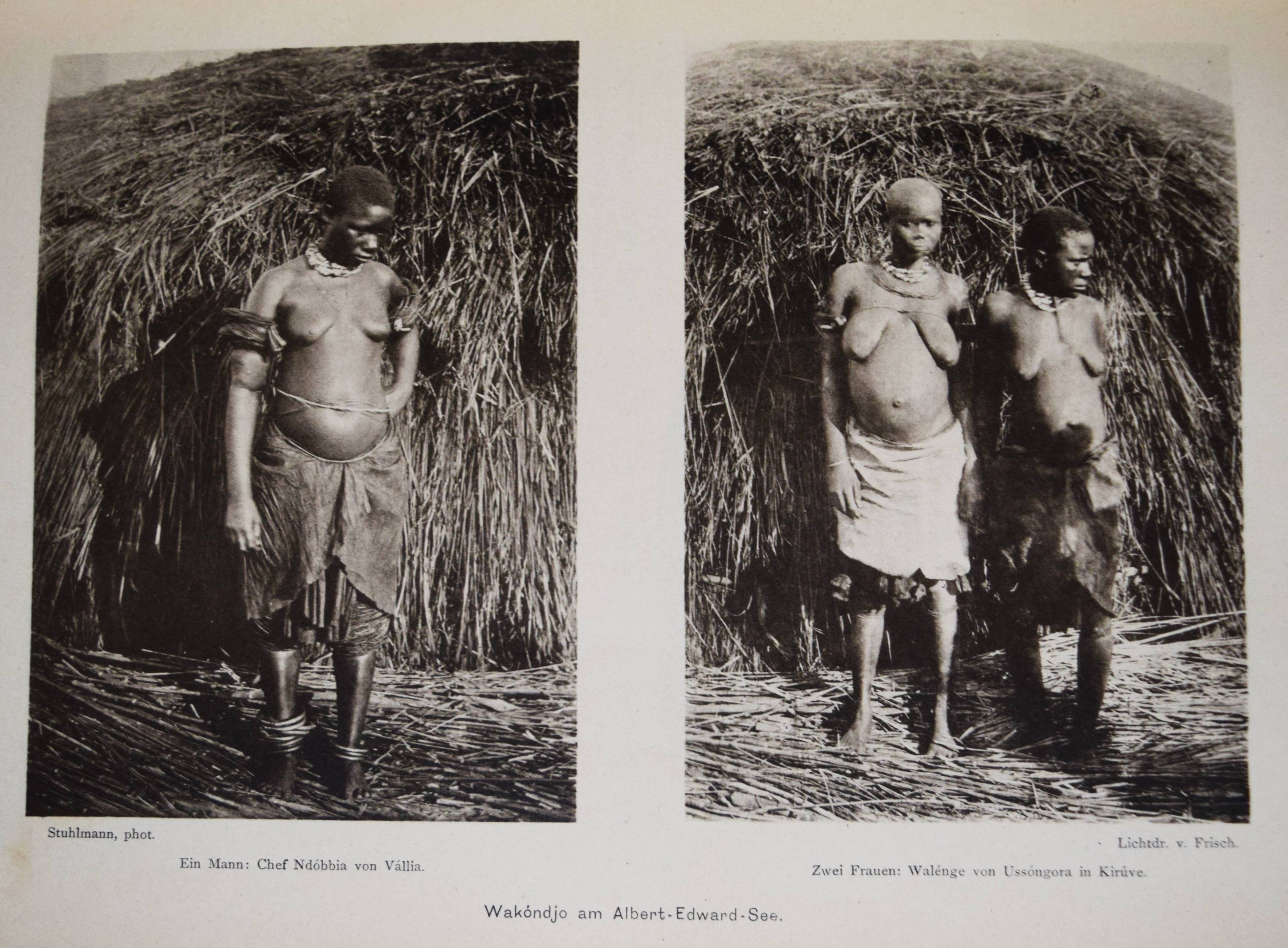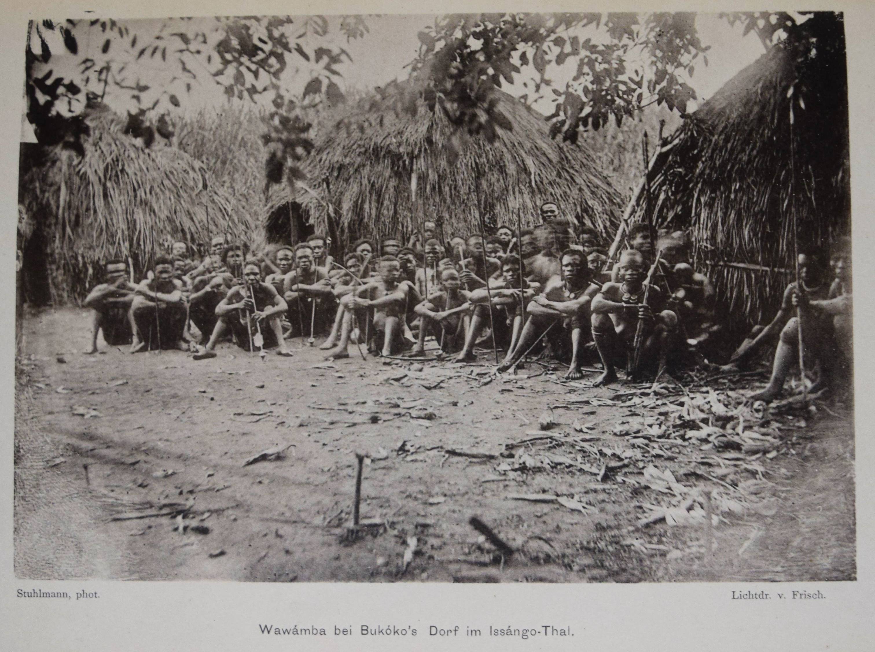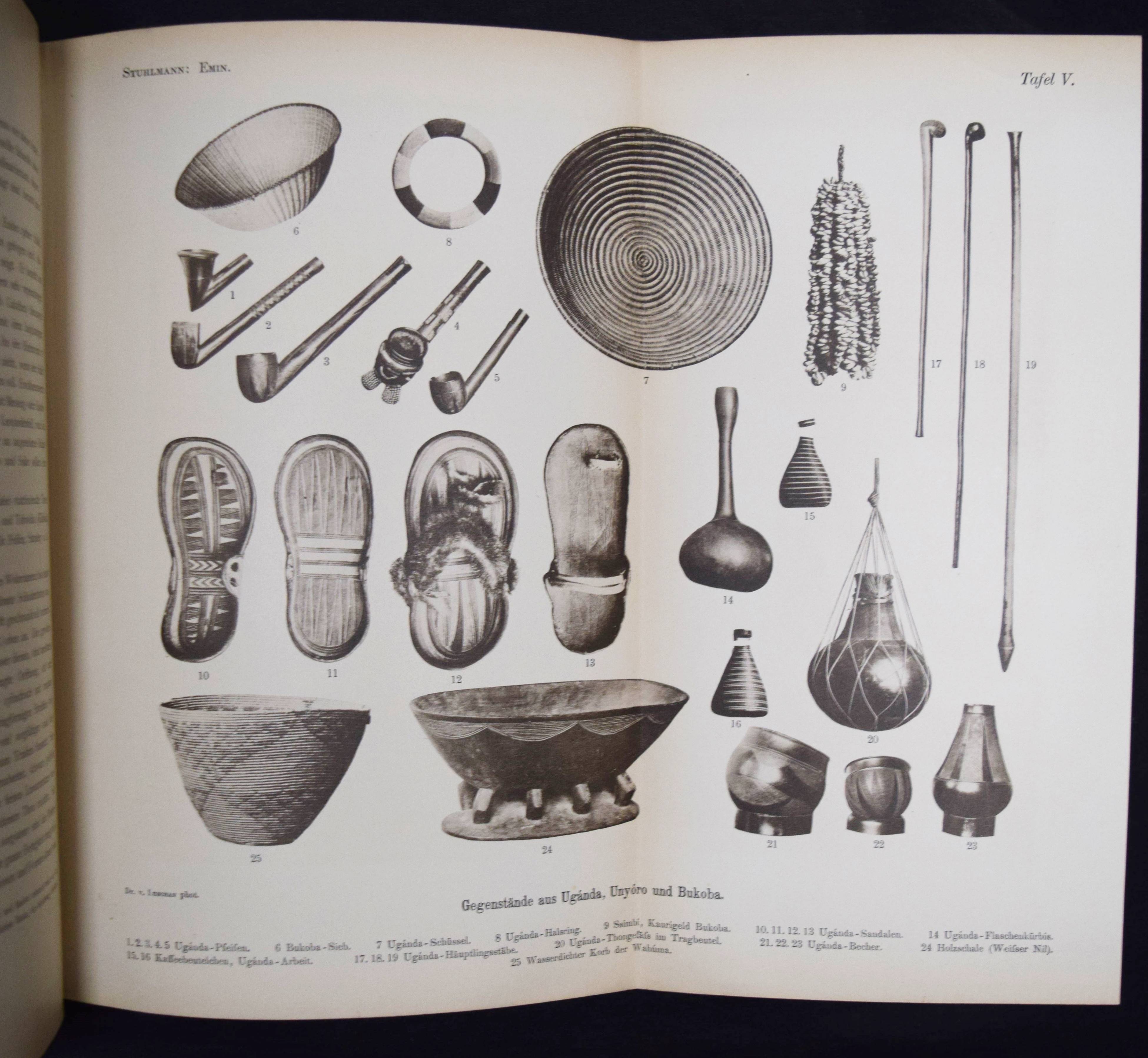 Stuhlmann, Franz. Mit Emin Pascha ins Herz von Afrika. Ein Reisebericht mit Beiträgen von Emin Pascha (d. i. Eduard Schnitzer), in seinem Auftrage geschildert. Im amtlichen Auftrage der Kolonial-Abtheilung des Auswärtigen Amtes herausgegeben. 2 Teile in 1 Band. Berlin, Reimer 1894. 4°. 1 Bl., XXI, (1), 1 Bl., 901 S. mit 2 Porträts, 32 (1 farbige, 2 gefalt.) Tafeln, 275 Textabb. u. 2 mehrf. gefalt. farblithogr. Karten. Illustr. OLn. mit goldgepr. Rücken- u. Deckeltitel, Kopfgoldschnitt. Kainbacher I, 136. NDB IV, 482. – Einzige Ausgabe dieses bedeutenden Werks über die Erforschung Ostafrikas. – Der Hamburger Zoologe Franz Stuhlmann nahm zusammen mit Hauptmann Langheld an der wohl bedeutendsten Ostafrika-Expedition in der deutschen Kolonialzeit teil, die unter Leitung von Emin Pascha von Bagamojo an die Westküste des Viktoriasees bis in das Kongogebiet führte. Nachdem Langheld als Chef der neu errichteten Station Bukoba am Viktoriasee zurückblieb, marschierten Emin Pascha und Stuhlmann nach Karagwe und Mpororo. „Die Nachricht, sudanesische Soldaten seiner ehemaligen Provinz seinen in der Nähe, bestimmte Emin Pascha zum Eindringen in das Gebiet des Kongo-Staates. Proviantschwierigkeiten zwangen ihn jedoch, nach Undusuma umzukehren… Der schwer erkrankte und fast blind gewordene Emin Pascha schickte Stuhlmann mit den Gesunden (der Mannschaft) zur Ostküste zurück. Emin Pascha selbst… konnte erst im März 1892 mit einer Araberkarawane in westliche Richtung aufbrechen,… fand aber auf dieser Reise den Tod…“ (L. Vajda in NDB). – „…Stuhlmanns großes Reisewerk bietet eine Riesenfülle von wichtigen Beobachtungen über die Landesnatur Deutsch-Afrikas zwischen der Küste und Unjamwesi sowie der Landschaften im Süden und Westen des Viktoriasees und im nördlichen Zwischenseegebiet. Durch Vielseitigkeit und wissenschaftliche Gründlichkeit überragt Stuhlmann alle seine Vorgänger von Ostafrika.“ (H. Mayer in „Das deutsche Kolonialreich“, I, S. 7 f.). – Gelenke u. Kanten etwas berieben, Frontispiz u. Titelblatt etwas stockfleckig, gutes Exemplar.