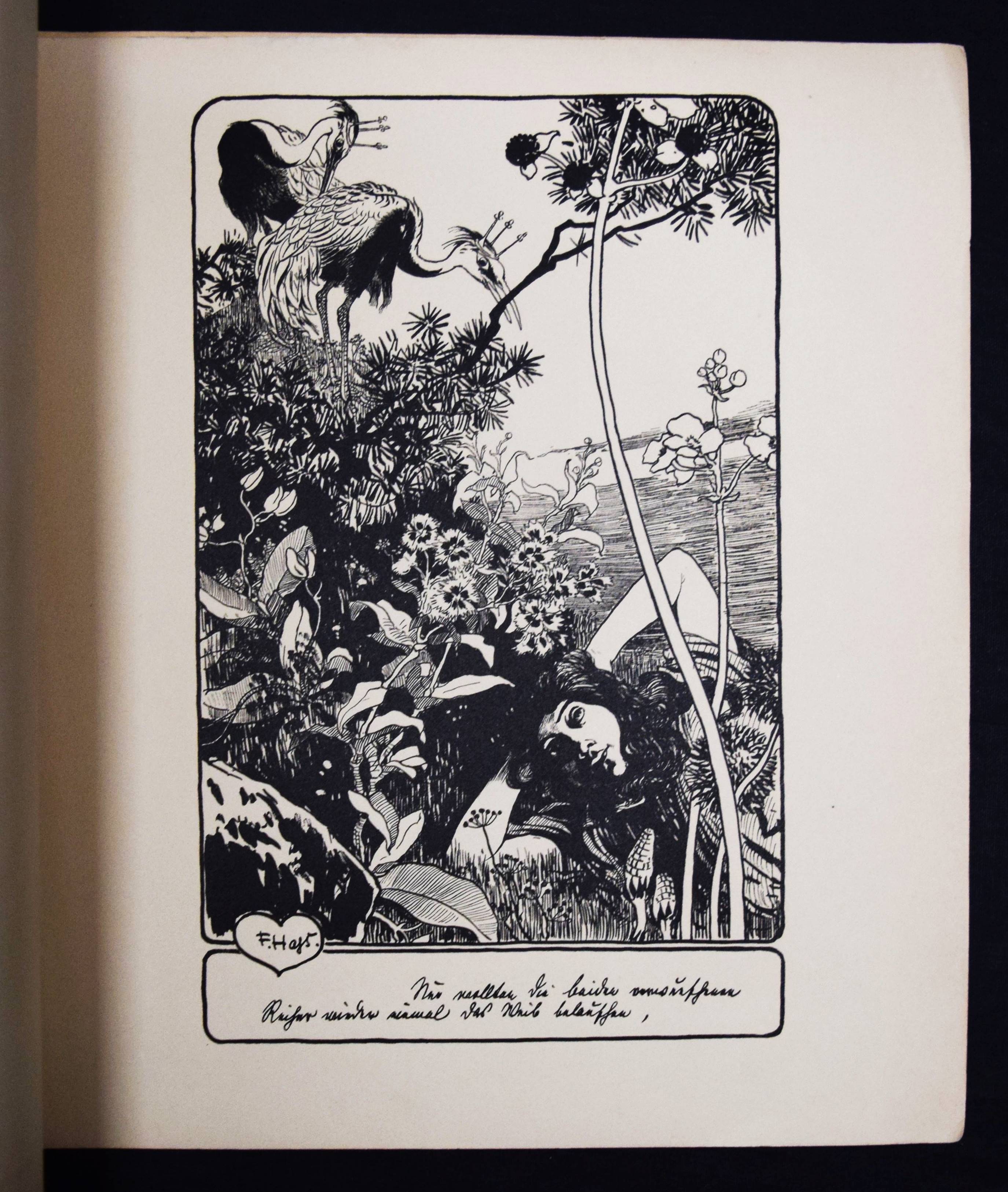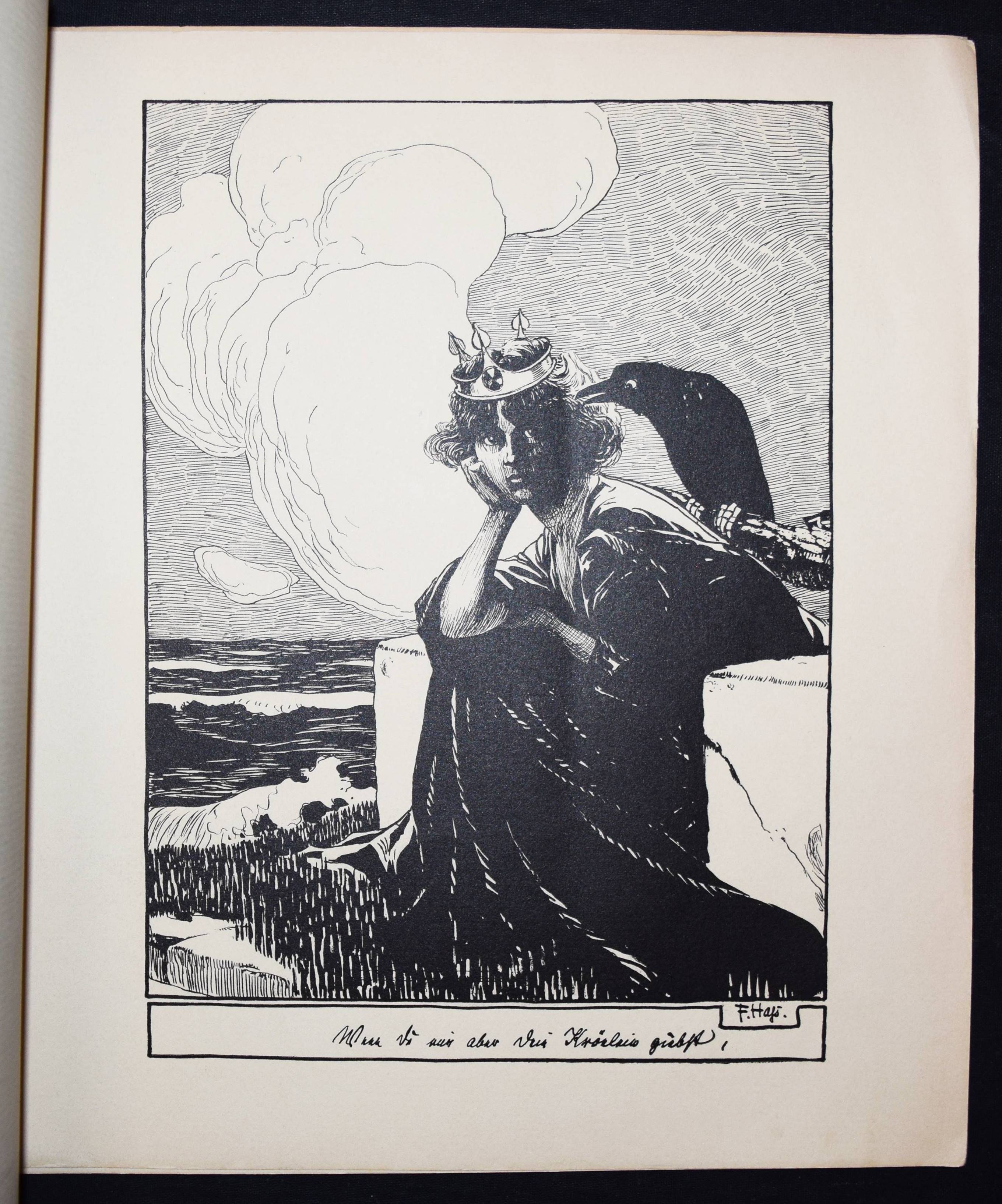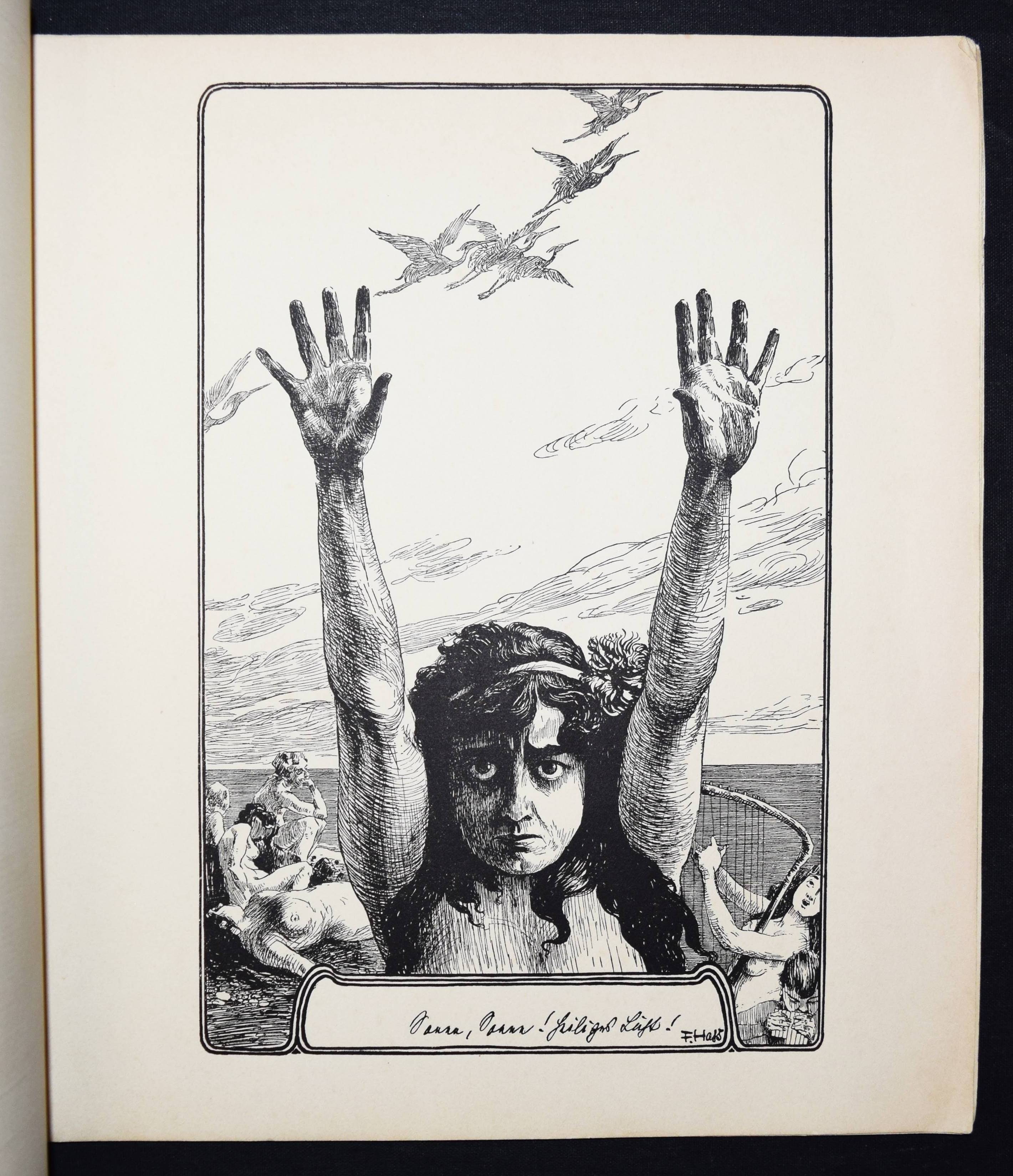 Hass, F(ritz). Sonnen-Märchen. 10 Zeichnungen. Berlin, Fischer und Franke o. J. (1901). 4°. 10 Tafeln, lose in Farbig illustr. OKart.-Umschlag. (Teuerdank. Fahrten und Träume deutscher Maler, Folge 15). Umschlag etwas angestaubt, sonst gut erhalten.
