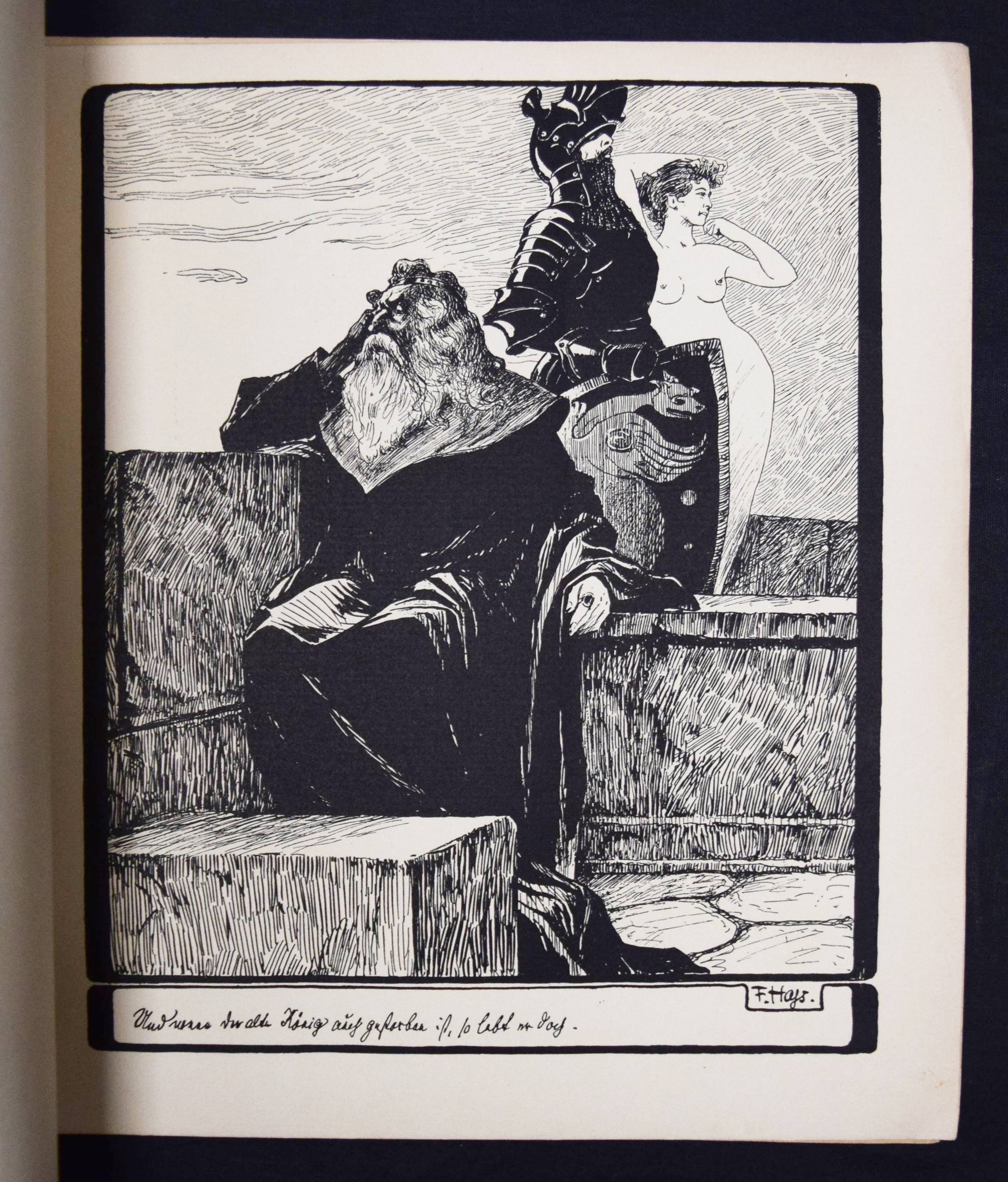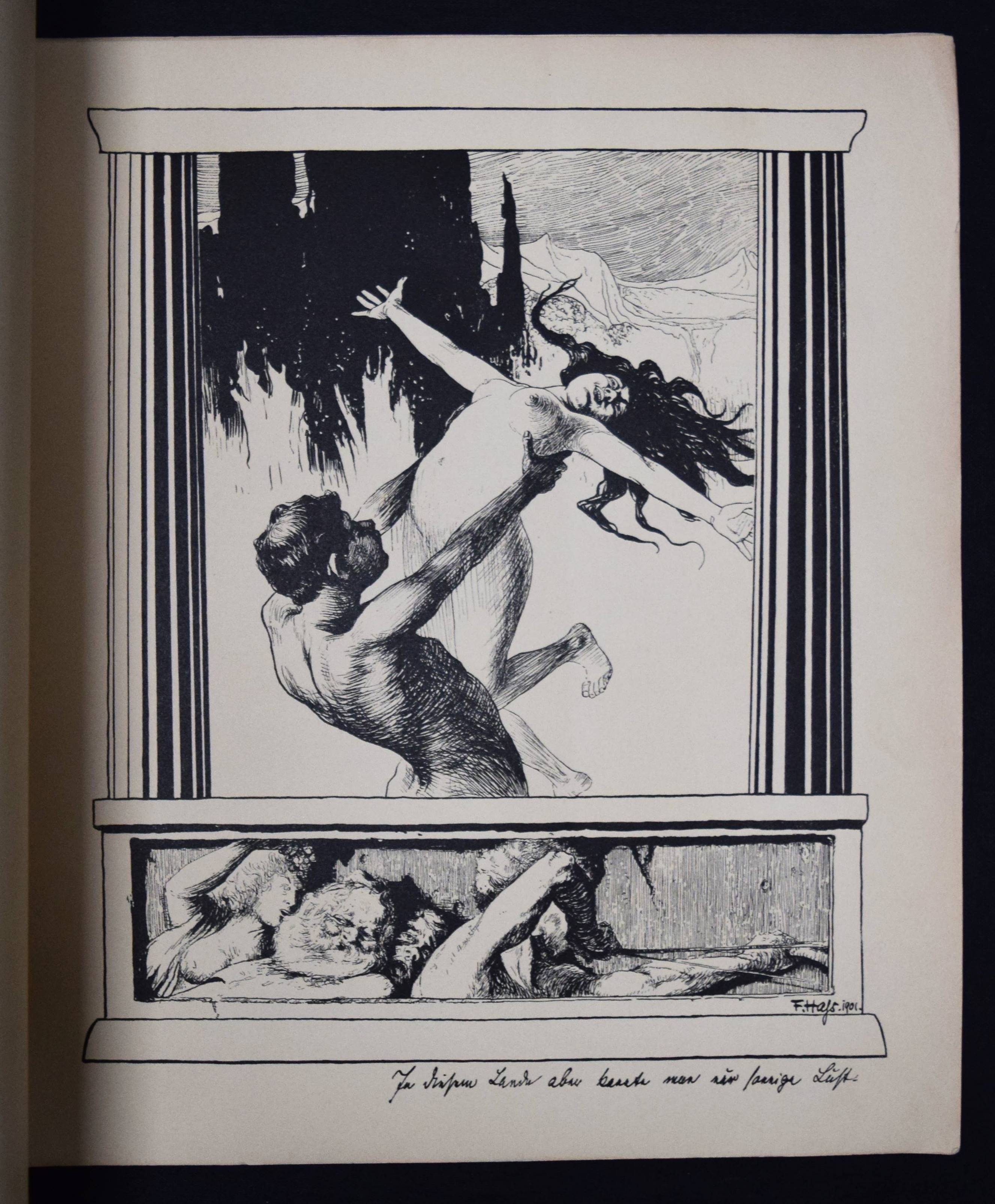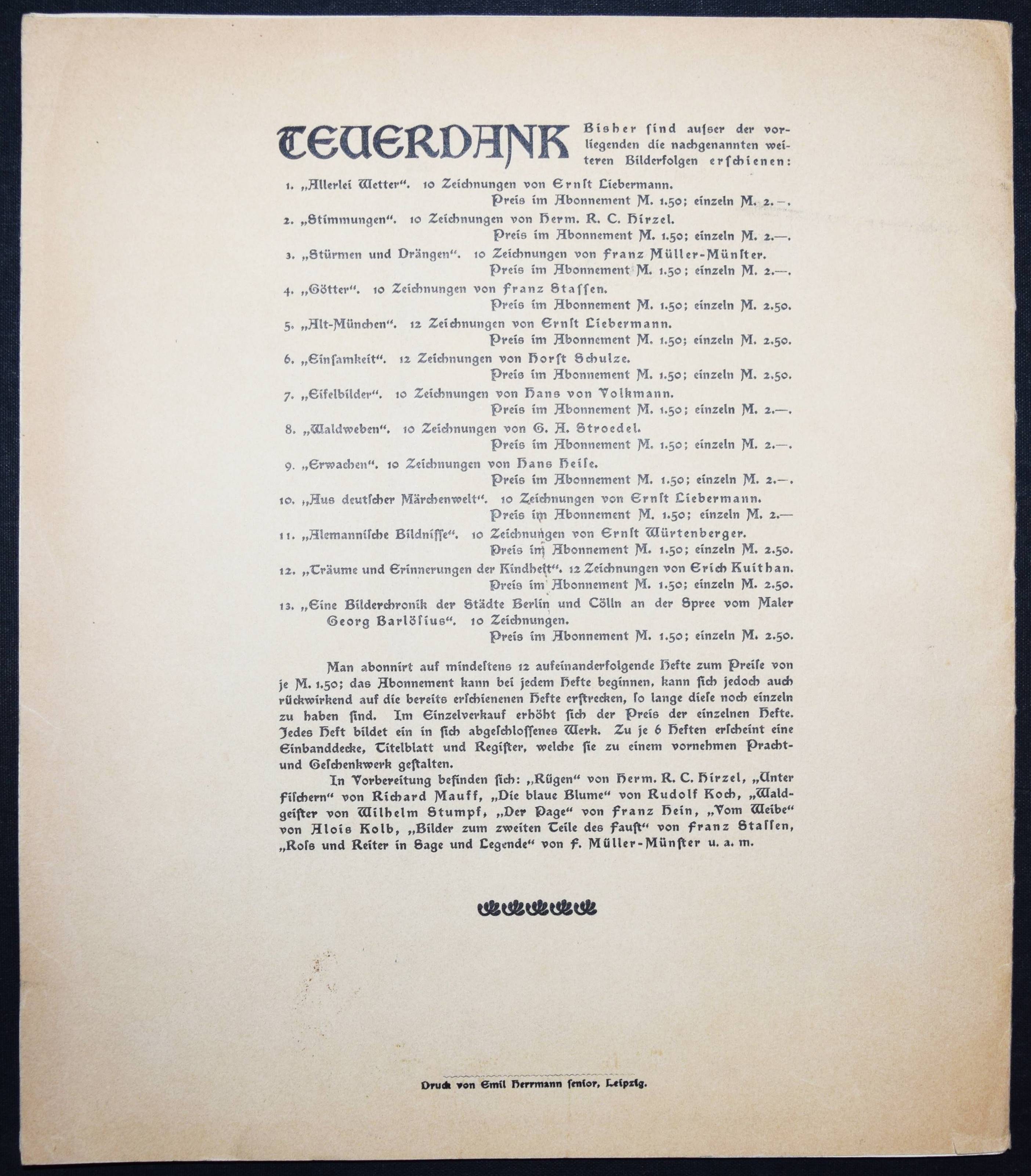 Hass, F(ritz). Sonnen-Märchen. 10 Zeichnungen. Berlin, Fischer und Franke o. J. (1901). 4°. 10 Tafeln, lose in Farbig illustr. OKart.-Umschlag. (Teuerdank. Fahrten und Träume deutscher Maler, Folge 15). Umschlag etwas angestaubt, sonst gut erhalten.