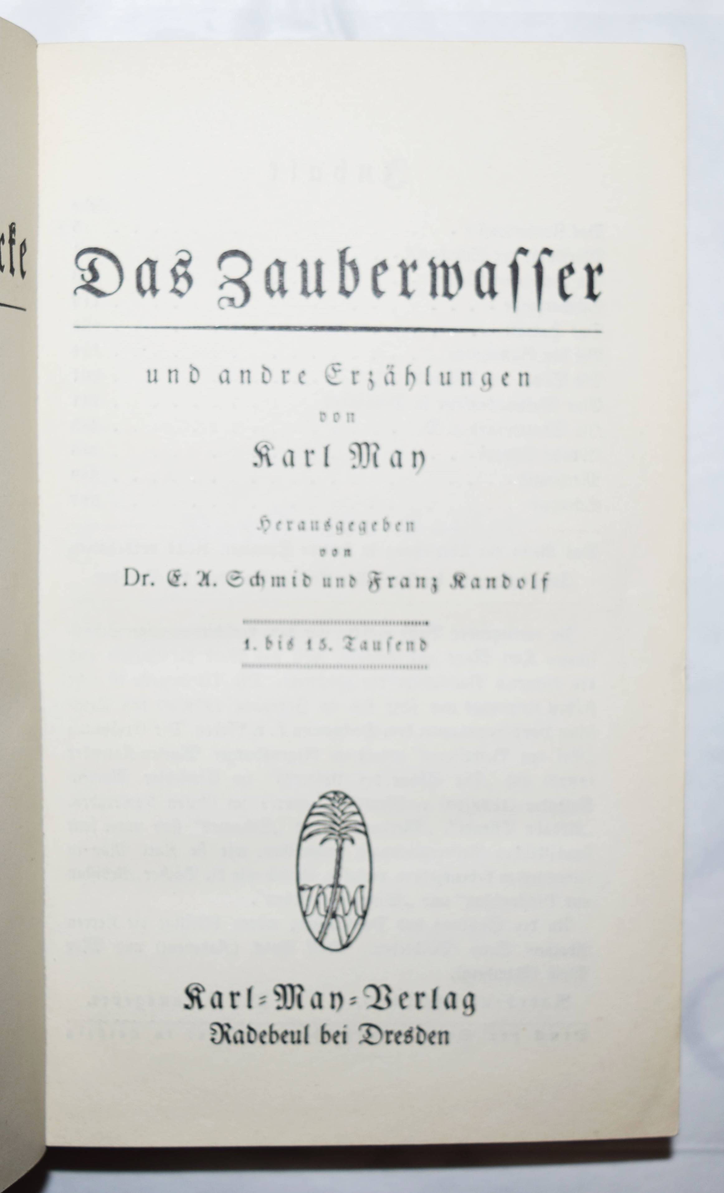 May, Karl. Das Zauberwasser und andere Erzählungen. Herausgegeben von E. A. Schmid und Franz Kandolf. 1.-15. Tsd. Radebeul, Karl-May-Verlag o. J. (1927). Kl.-8°. 484 S. Illustr. OLn. (Karl May’s Gesammelte Werke, Band 48). Hermesmeier/Schmatz GW 48.1. – Erste Ausgabe. – Gutes Exemplar.