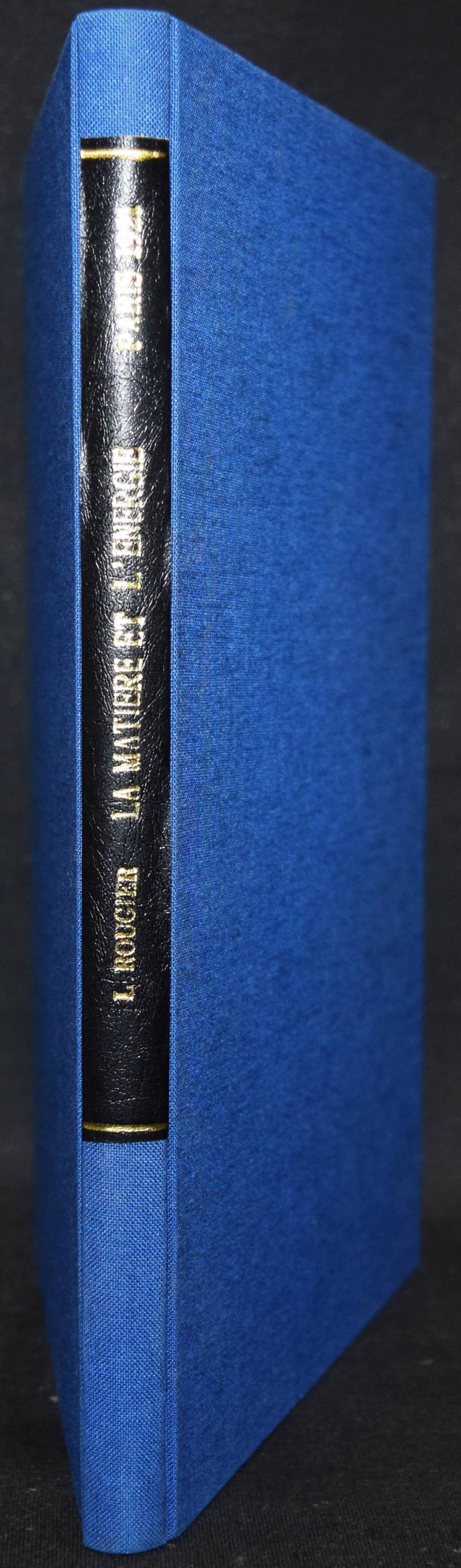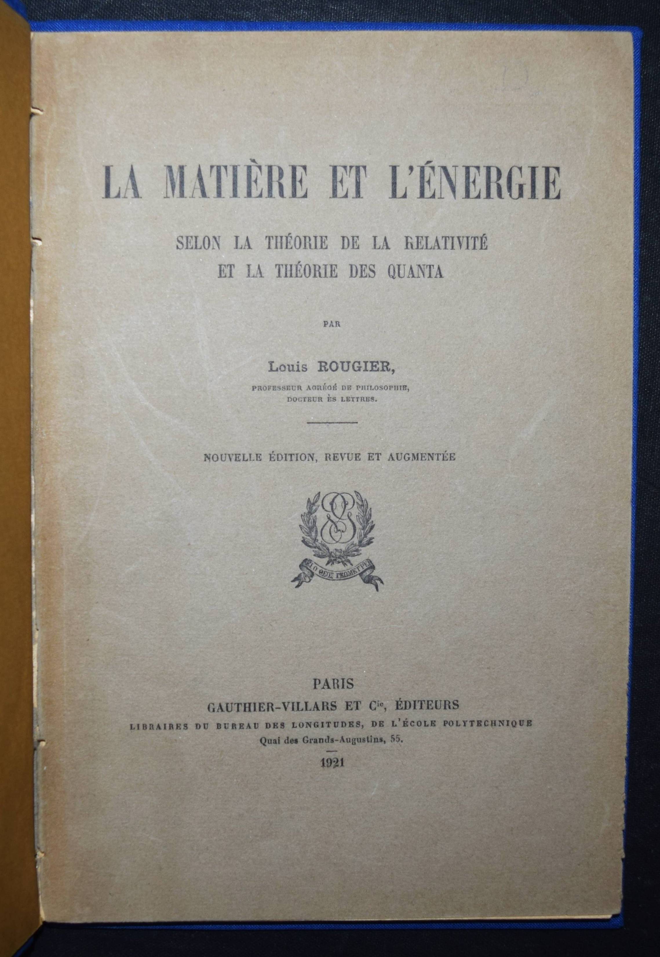 Rougier, Louis. La matière et l’énergie selon la théorie de la relativité et la théorie des quanta. Nouvelle édition, revue et augmentée. Paris, Gauthier-Villars 1921. Gr.-8°. XI, 112 S. Mod. Ln. mit goldgepr. Rückenschild (Orig.-Umschlag beigebunden). Edition augmentée et corrigée de la première publication „La Matérialisation de l’Énergie“ (Paris 1919). – Les Français importants Philosophe et physicien L. Rougier (1889-1982) „publie en 1921 un ouvrage très interessant ‚La matière et l‘énergie selon la théorie de la relativité et la théorie des quanta’. Il tente d’etablir un lien entre les nouvelles découvertes (sensationnelles !) de la physique et les préoccupations des philosophes…“ (J. C. Baudet, Les agitateurs d’idées en France: De Montaigne à Zemmour, Paris 2015). – Sehr gutes Exemplar.