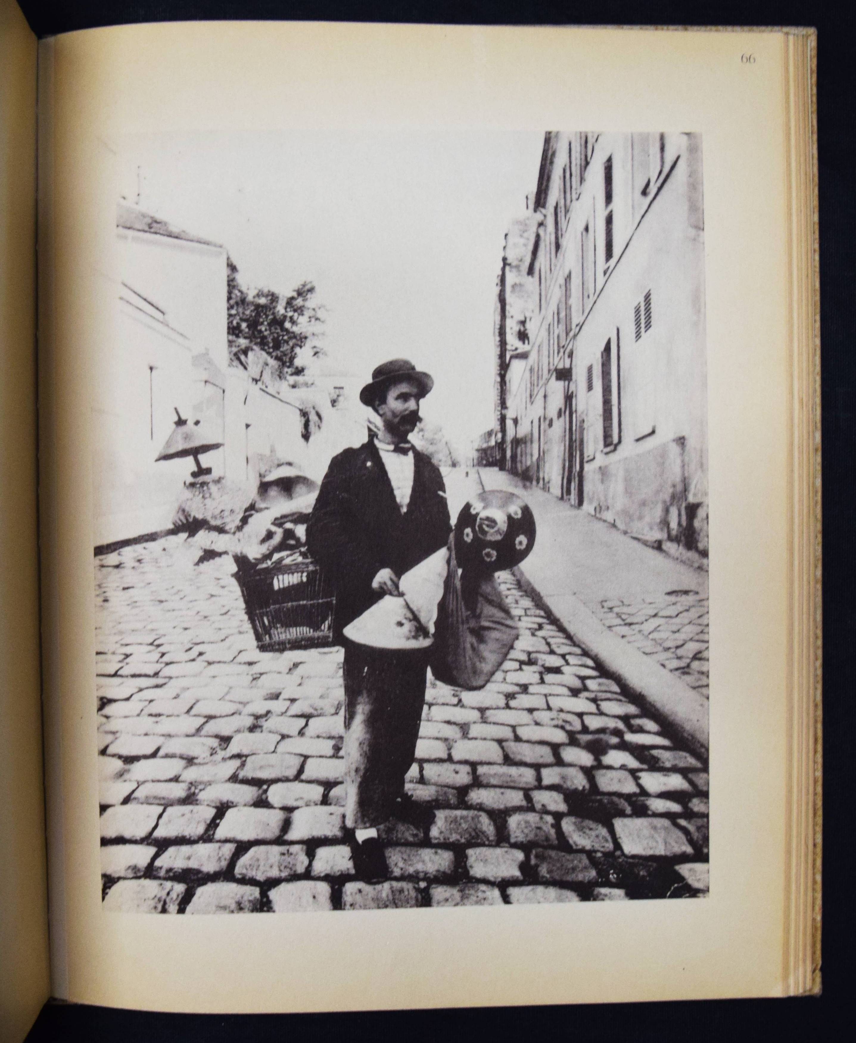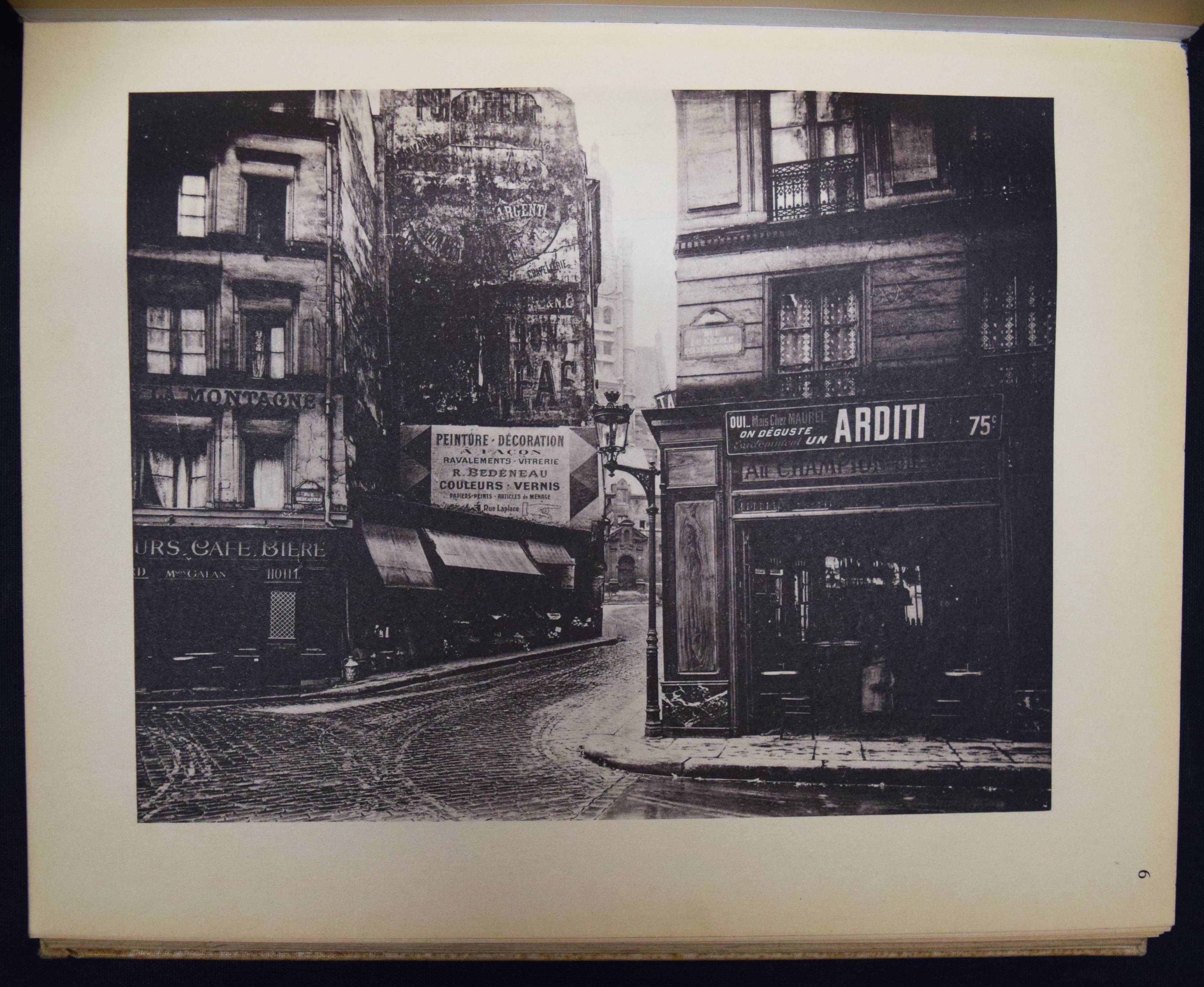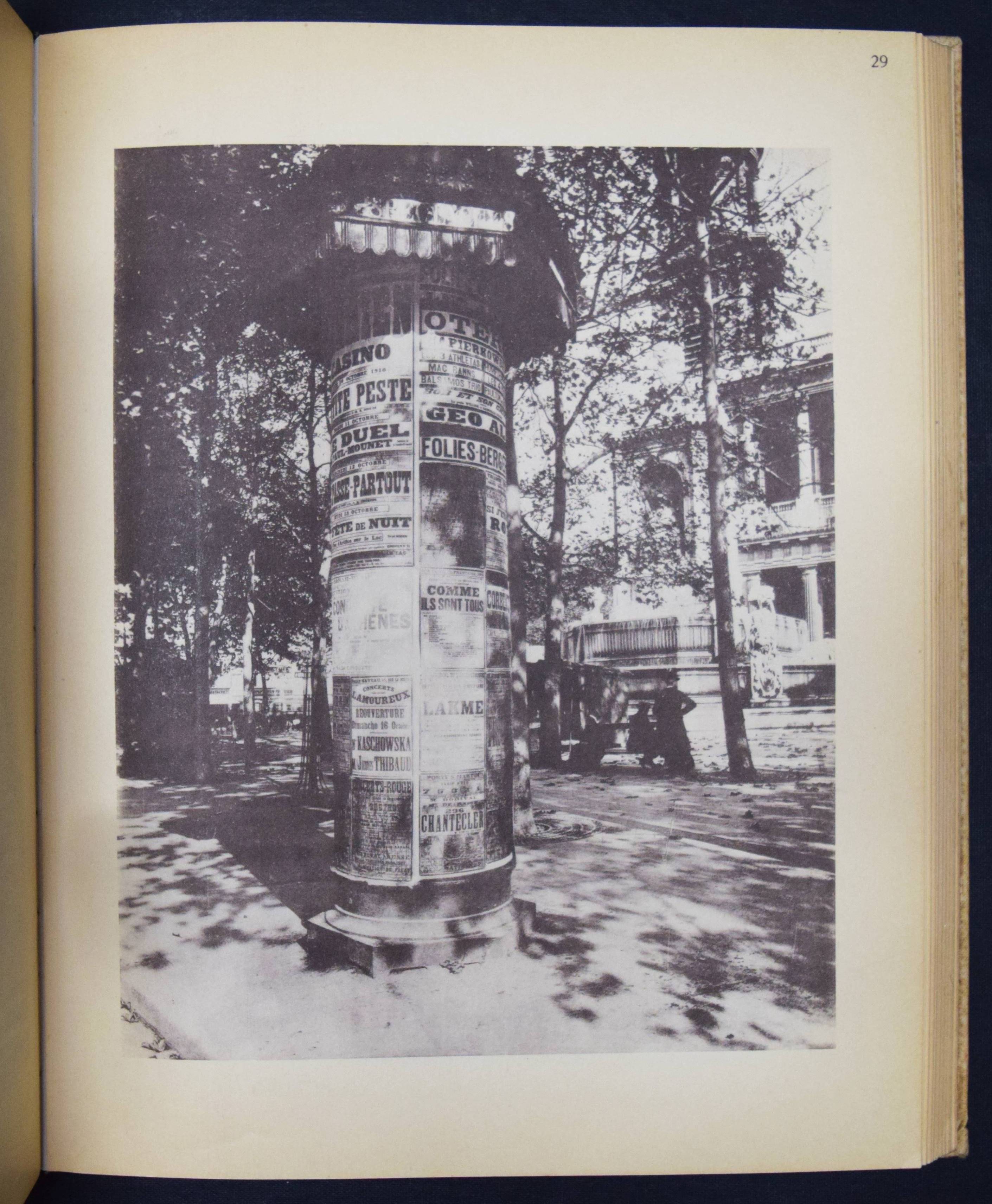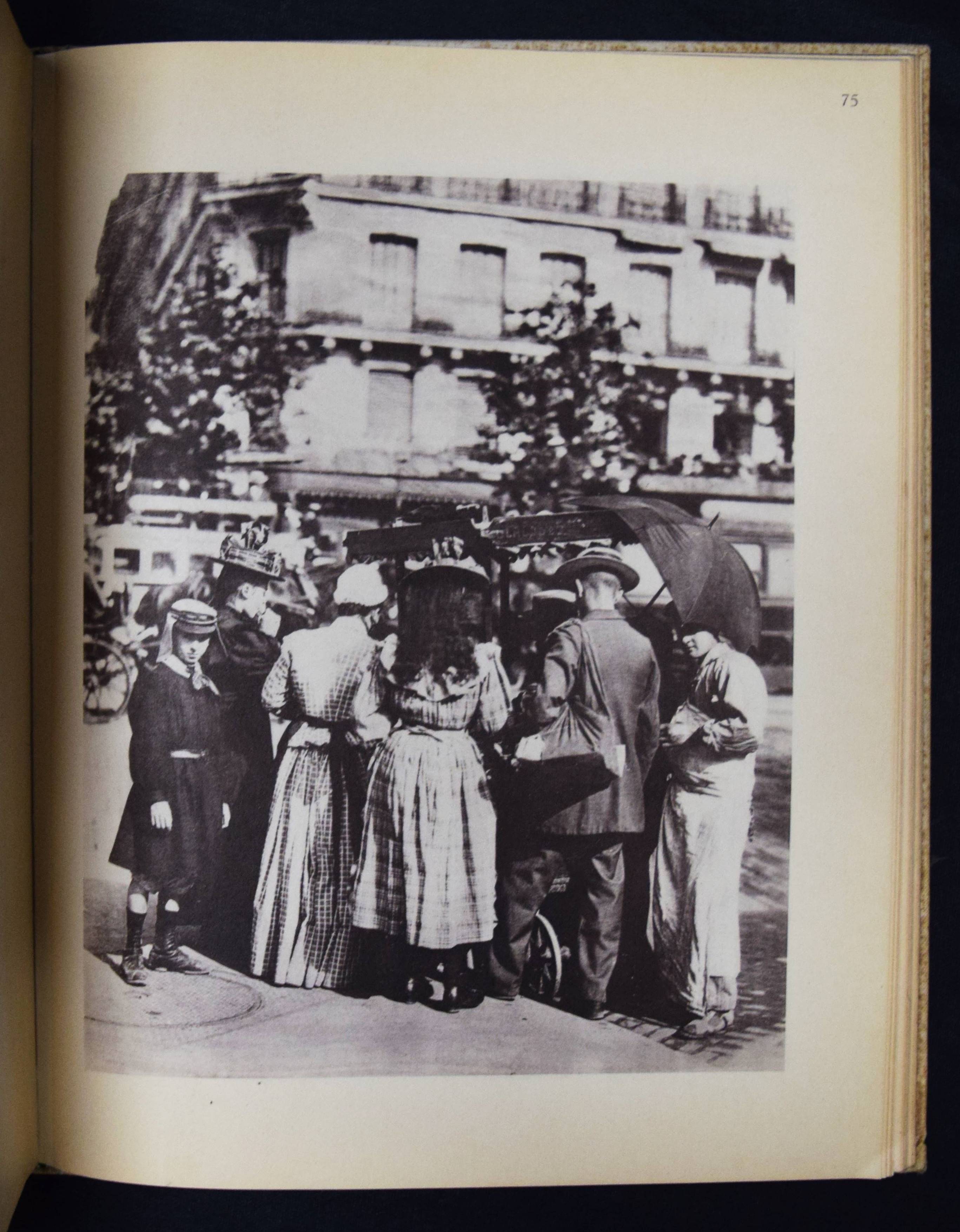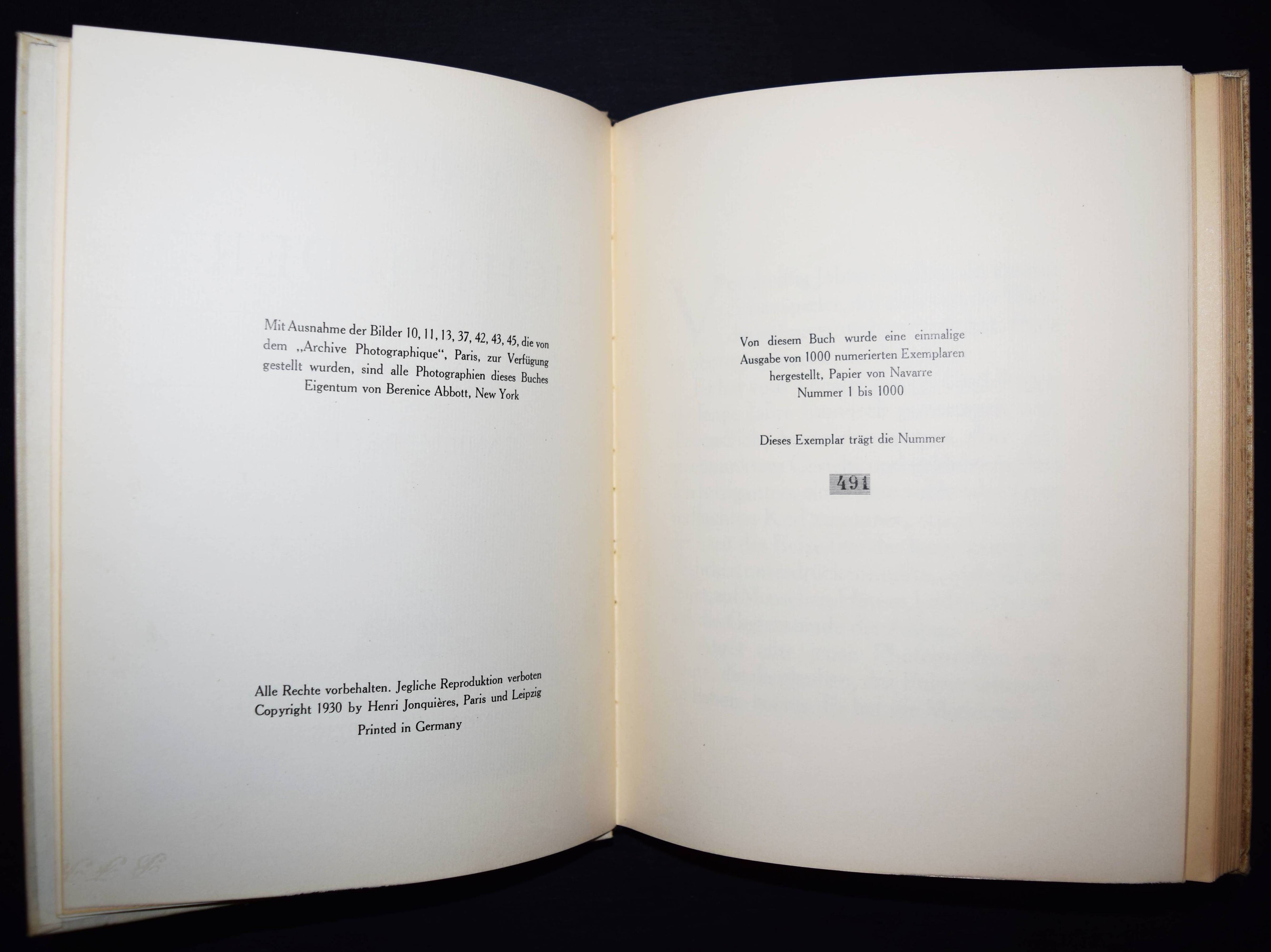 Atget, E(ugène). Lichtbilder. Eingeleitet von Camille Recht. (Herausgegeben von Berence Abbott). Paris u. Leipzig, Henri Jonquières (1930). Gr.-8°. Portrait (Photographie von B. Abbott), 34 S. u. 96 Tafeln (Kollotypien) mit 1 ausfaltbaren Bilderverzeichnis am Schluß. OLn. Auer 154. Bouqueret, Paris 72 ff. Koetzle, Eyes on Paris 88 ff. The Open Book 90 f. Parr/Badger I, 127. Roth, The Book of 101 Books 60 f. (Alle franz. Ausgabe). – Eines von 1000 num. Exemplaren auf Papier von Navarre. – Erste deutsche Ausgabe der ersten Monographie über den bedeutenden französischen Photographen. – „In a contemporary review of the book, the young Walker Evans expressed a clear idea of what Atget at least meant to photographers and documentary/modernist practise: ’His general note is lyrical understanding of the street, trained observation of it, special feeling for patina, eye for revealing detail, over all of which is not „the poetry of the street“ or „the poetry of Paris“ but the projection of Atget’s person“ (Parr/Badger). – „Es ist eine moderne, neuzeitliche Lesart, mit der Abbott die Bilder für den Band ausgewählt und in eine Abfolge gebracht hat. Dies in dem Bemühen, Atget, den Buchhalter des alten Paris, als Kronzeugen für einen künstlerischen Aufbruch zu gewinnen. … Am Ende begegnen wir hier keinem Paris-Buch. Noch nicht einmal einen über Atget. Sondern der Papier gewordenen Sehnsucht, die Fotografie im Kunstkontext zu etablieren“ (H.-M. Koetzle). – „En réalité, Atget appartient entirèment au XIXr siècle, il est le dernier des grands pionniers et résume presque à lui seul toute une part de l’évolution de la photographie“ (C. Bouqueret). – E. Atget (1857-1927) arbeitete zuerst als Schauspieler und begann 1888 zu photographieren. In den 20er-Jahren lernte er Man Ray kennen, dieser erwarb 40 Aufnahmen und veröffentlichte einige von ihnen in der Zeitschrift „La Revolution surréaliste“. Man Rays Assistentin Berence Abbott publizierte nach Atgets Tod Bilder aus seinem Nachlaß und verkaufte die Fotos schließlich an das Museum of Modern Art in New York, wo sie amerikanische Kollegen wie Walker Evans oder Lee Friedländer beeinflussten. – Walter Benjamin bezeichnete Atget, dessen einziges Sujet das alte Paris und dessen Bewohner war, als Vorläufer der surrealistischen Photographie. – Der helle Einband wie meist etwas fleckig und leicht angestaubt, gutes Exemplar.