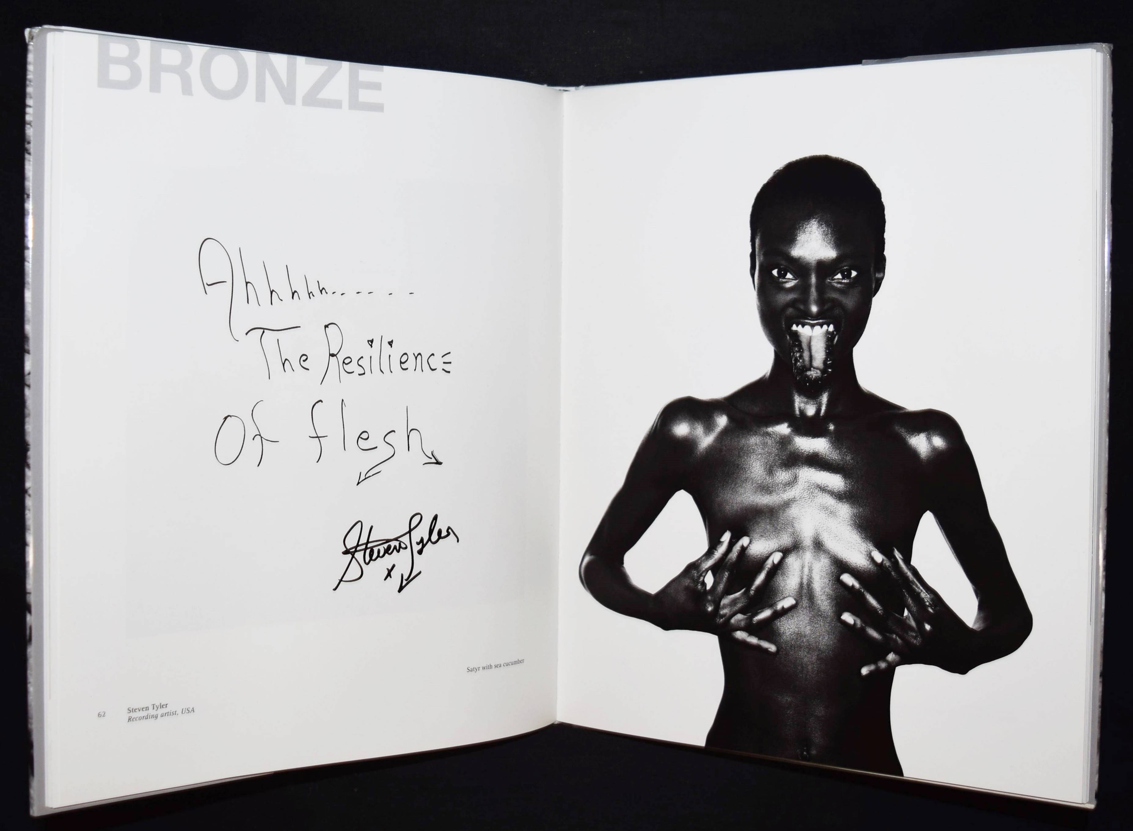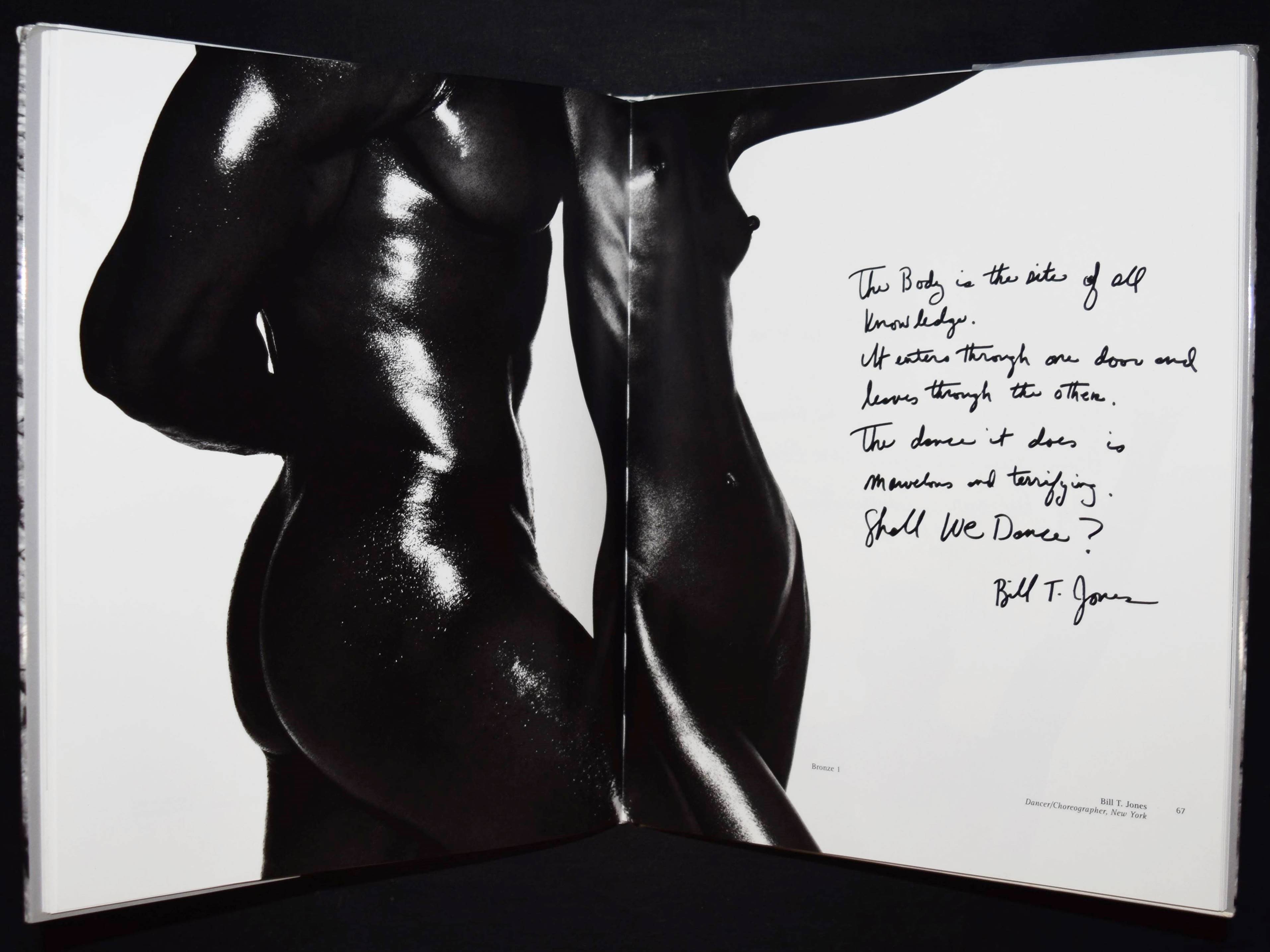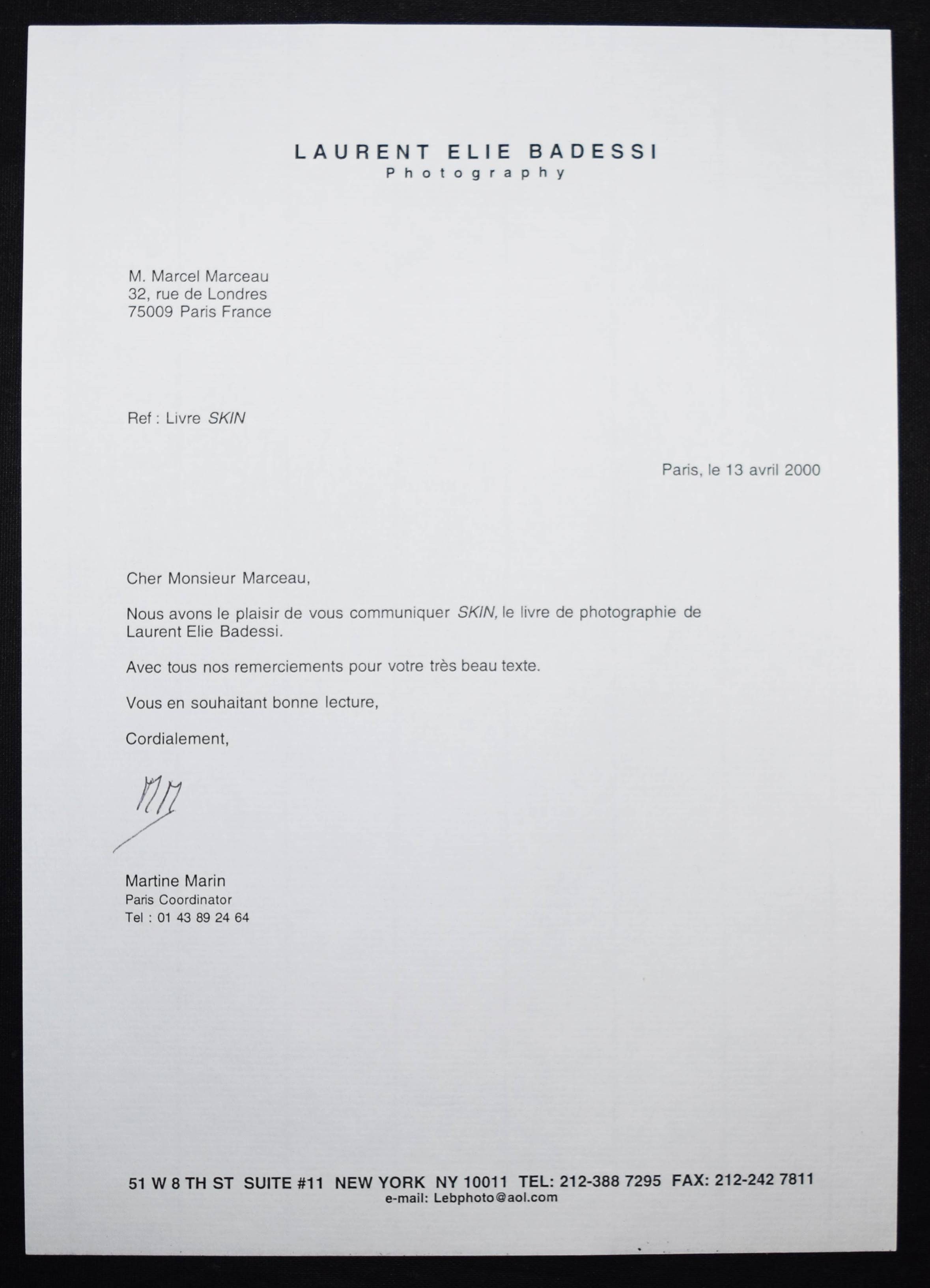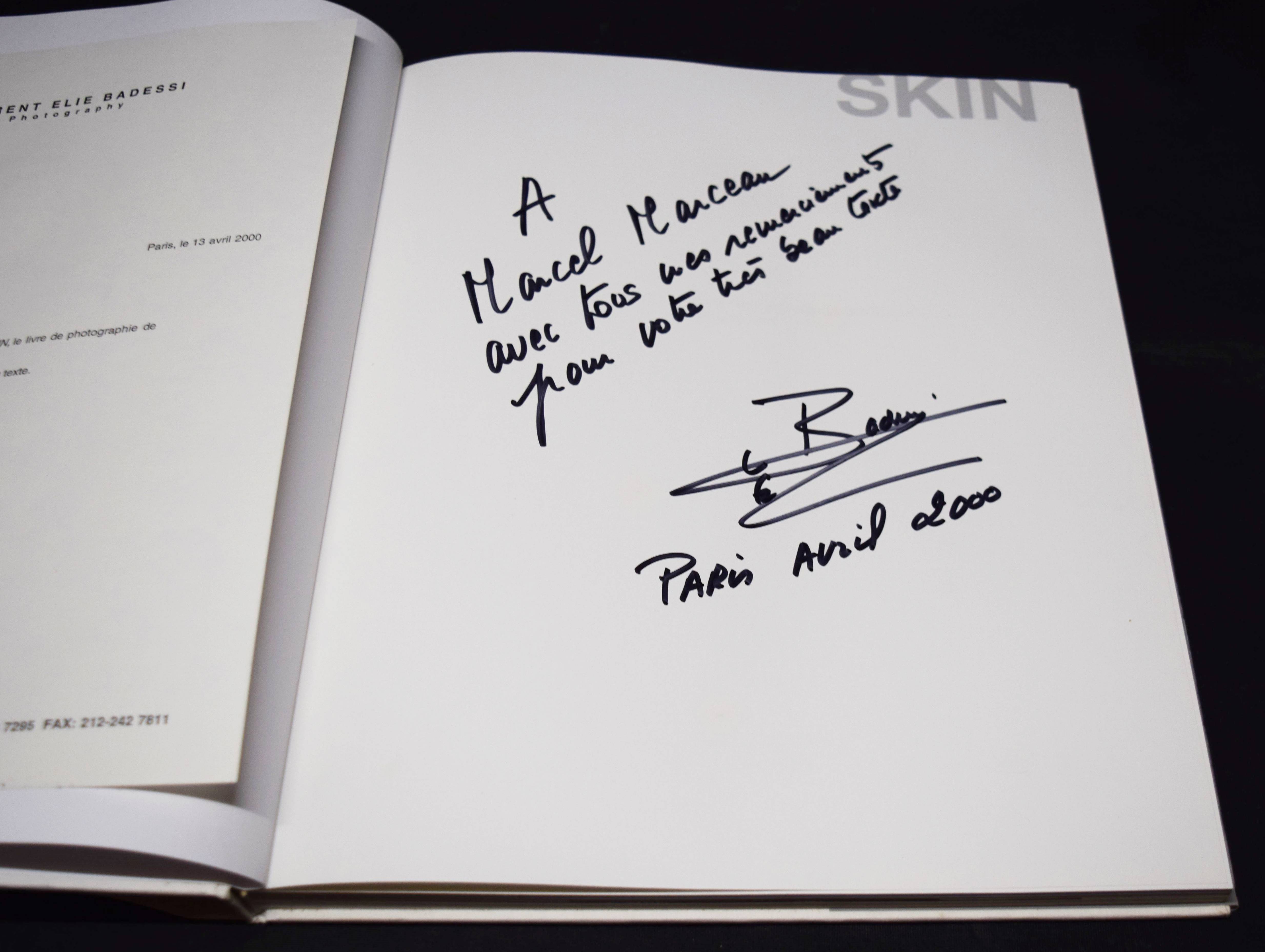 Badessi, Laurent Elie. Skin. With texts by Laurent Elie Badessi and Sondra Gilman. Zurich, New York, Edition Stemmle (2000). Gr.-4°. 143 S. mit 63 Duetone-Tafeln. Orig.-Pappband mit illustr. Schutzumschlag. Erste Ausgabe. – Mit eigenhändiger Widmung von L. E. Badessi für Marcel Marceau und beil. maschinenschr. Brief des Fotoateliers Badessi, New York (unterschr. von Martine Marin, Paris Coordinator). – L. E. Badessi (geb. 1964) ist der Sohn des franz. Fotografen Elie Badessi. Er arbeitet seit den 90er Jahren in New York. – „Laurent Elie Badessi has succeeded in constaining his lens to exploit all the effects of light. It is trough the medium of the human body that he has decided to express himself, and to manifest his desire for perfection… seeking the precise balance between aesteticism and emotion, light and darkness, dawn and daylight“ (Pierre Cardin). – Der berühmte französische Pantomime Marcel Marceau (1923-2007) war seinem Publikum als der tragische Clown „Bip“ im Ringelhemd mit dem weiß geschminkten Gesicht, dem zerbeulten Seidenhut und der roten Blume bekannt. Seine „Compagnie de Mime Marcel Marceau“ war einzigartig auf der Welt und führte zahlreiche bekannte Theaterstücke als Mimodramen auf. Marceau, der auch in zehn Filmen mitwirkte, beeinflusst bis heute zahlreiche Künstler aus allen Genres, durch die ihm eigene Art gilt er als Erneuerer der Pantomime. – Sehr gutes Exemplar.