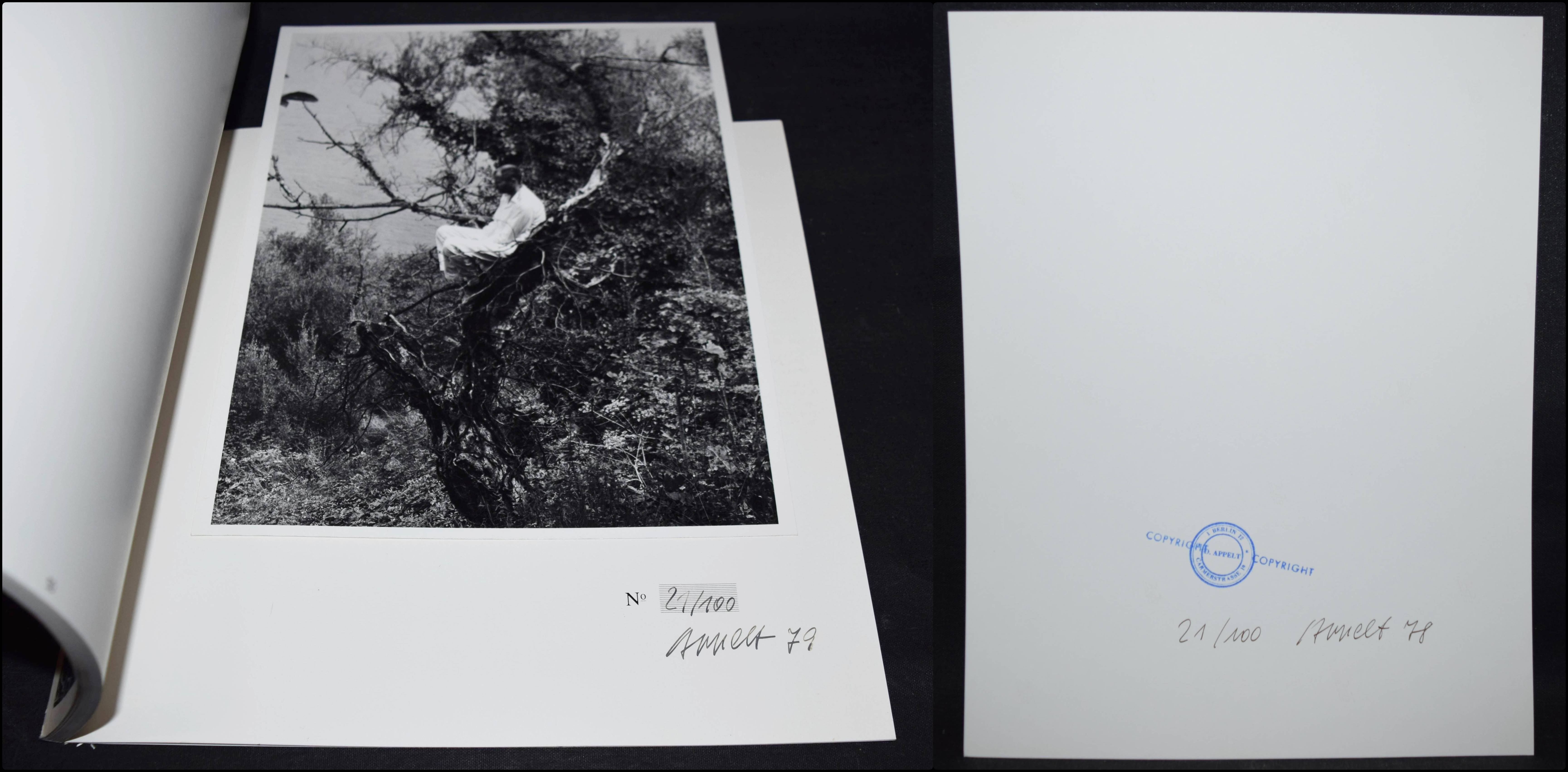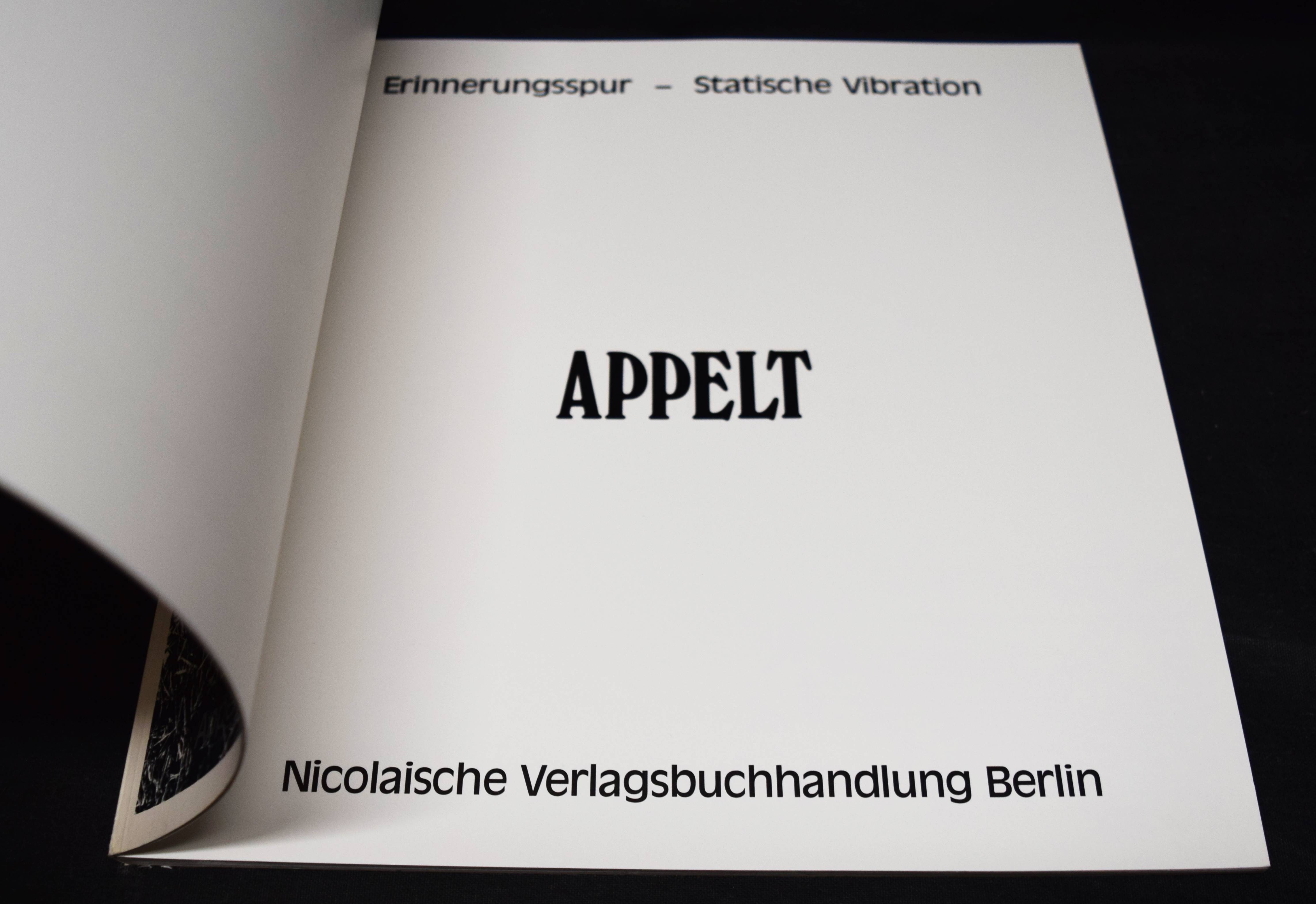 Appelt, Dieter. Erinnerungsspur – Statische Vibration. Berlin, Nicolai 1979. Quer-4°. 50 S. mit 36 Tafeln u. 1 signierten Orig.-Photographie (Silbergelatine, 30,5 x 24 cm.). Illustr. OKart. Auer 621. – Eines von 100 nummerierten und von Appelt signierten Exemplaren der Vorzugsausgabe mit der lose beiligenden Orig.-Photographie (abbgebildet auf S. 13), ebenfalls signiert (Gesamtauflage: 1100). – Mit Aufnahmen aus den Jahren 1977 bis 1979 und Texten von Günther Gercken und Eberhard Roters. – Der Photo-, Film-, Objekt- und Aktionskünstler D. Appelt (geb. 1935 in Niemegk/Brandenburg) wurde 1999 mit der David-Octavius-Hill Medaille der Deutschen Fotografischen Gesellschaft und 2005 mit dem Knight Purchase Prize for Photographic Media des Akron Art Museum, Ohio, USA ausgezeichnet. – Tadellos.