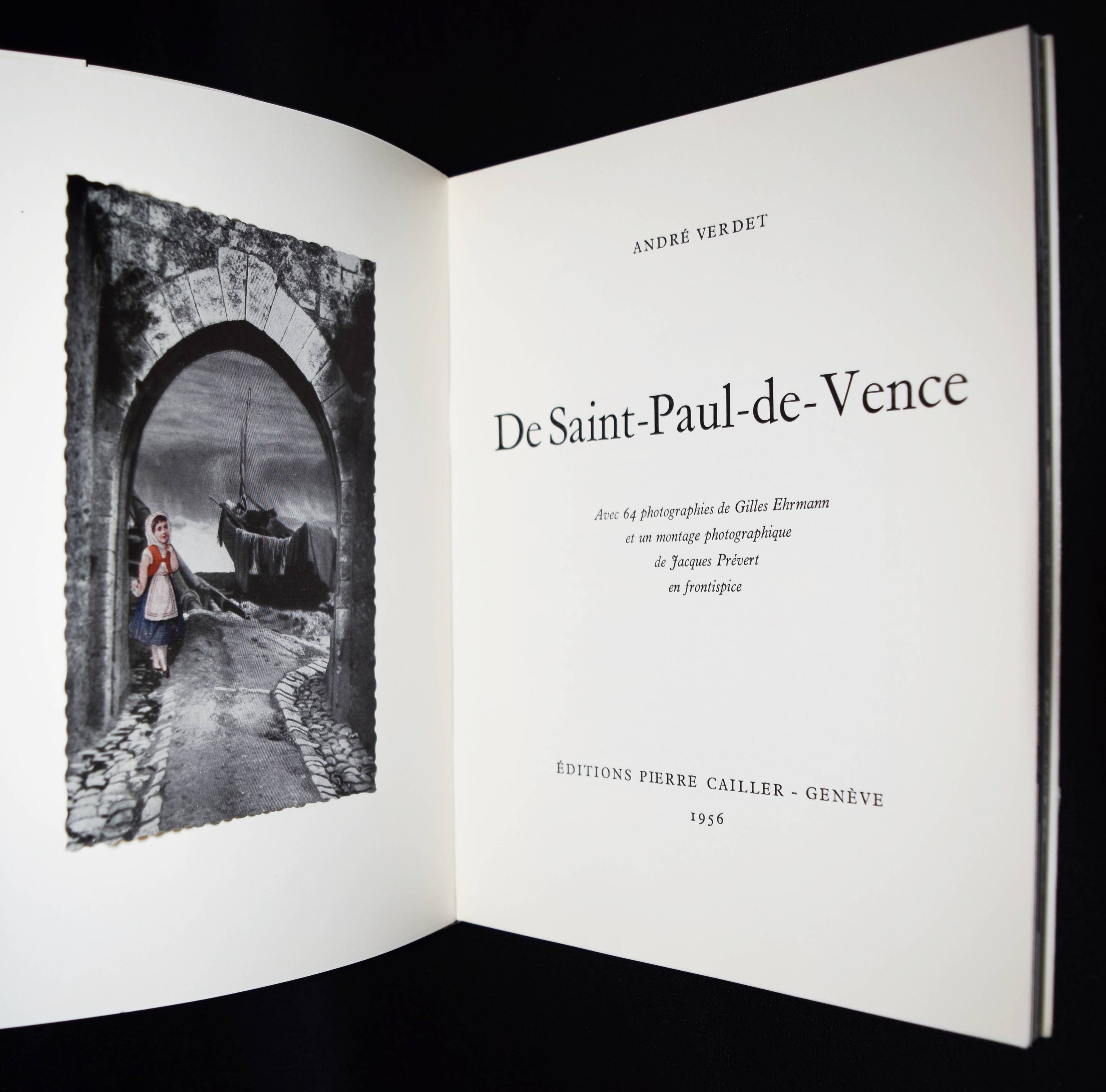 Ehrmann – Verdet, André. Saint Paul de Vence. Avec 64 photographies de Gilles Ehrmann et un montage photographique de Jacques Prévert en frontispice. Genève (Genf), Éditions Pierre Cailler 1956. 8°. 84 S. mit Frontispiz, 64 Tafeln u. 1 signierten Orig.-Lithographie von Raymond Dauphin u. 1 Orig.-Radierung von Manfredo Borsi. Illustr. OKart. mit Japanpapier-Schutzumschlag. Erste Ausgabe. – Nr. V von 100 Exemplaren der Vorzugsausgabe mit 2 (1 sign. u. num.) Orig.-Graphiken. – Der franz. Schauspieler und Fotograf G. Ehrmann (1928-2005) studierte 1946 bis 1949 an der École nationale supérieure des arts décoratifs in Paris und gründete die Avantgarde-Theatergruppe „Ceux-là“. Während dieser Zeit lernte er auch einige Vertreter des Surrealismus kennen. 1950 begann er zu fotografieren. Er porträtierte Chagall, Picasso und andere Künstler und lernte den Schriftsteller, Maler und Bildhauer Anré Verdet (1913-2004) kennen. – A. Verdet war mit vielen bedeutenden Malern (Georges Braque, Marc Chagall, Hans Hartung, Fernand Léger, Henri Matisse und Pablo Picasso) befreundet. 1977 traf er Bill Wyman von den Rolling Stones und Jon Anderson, den Lead-Sänger von Yes. Verdet gründete daraufhin eine eigene Gruppe und nannte sie Bételgeuse. – Sehr schönes sauberes Exemplar.