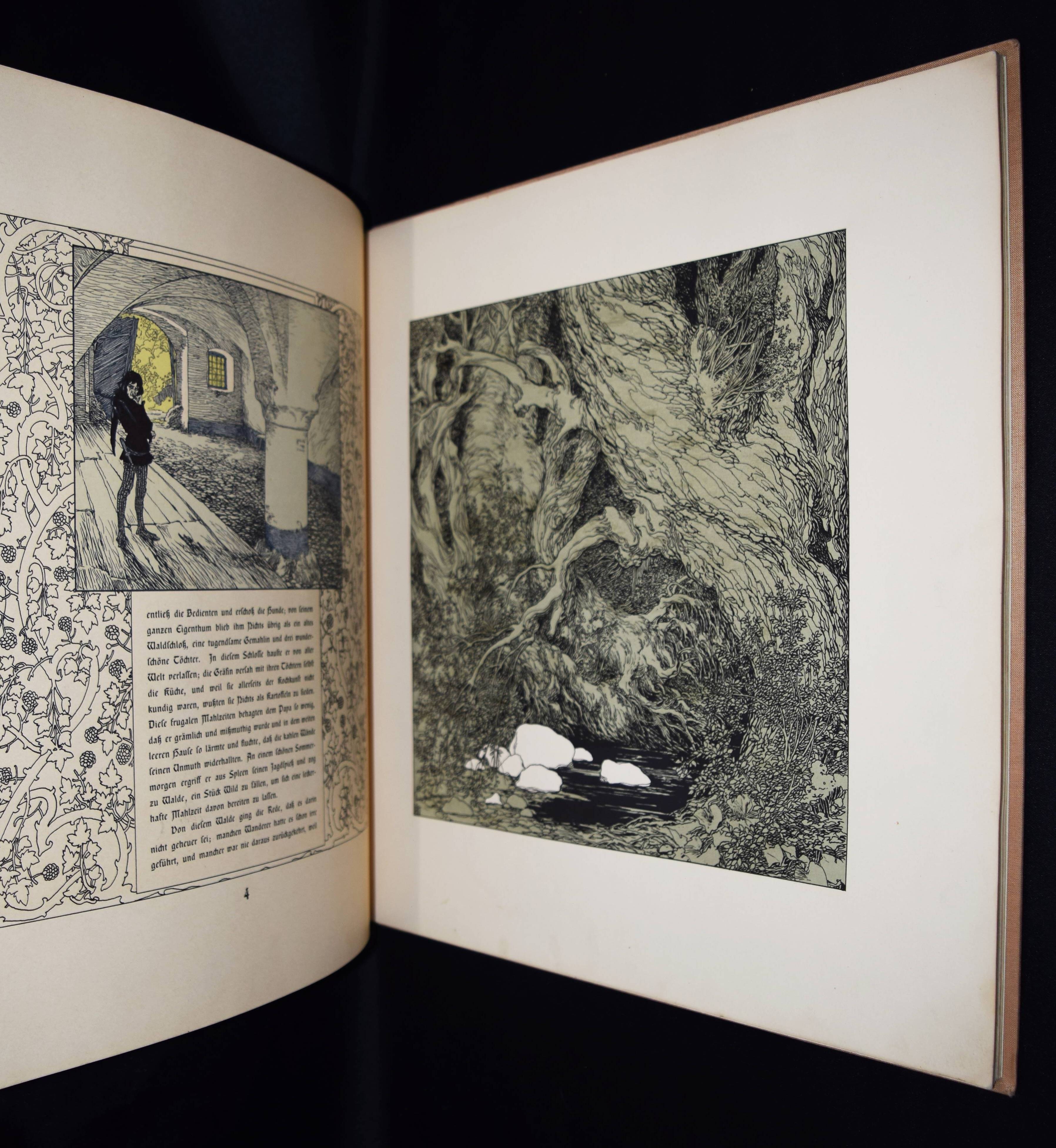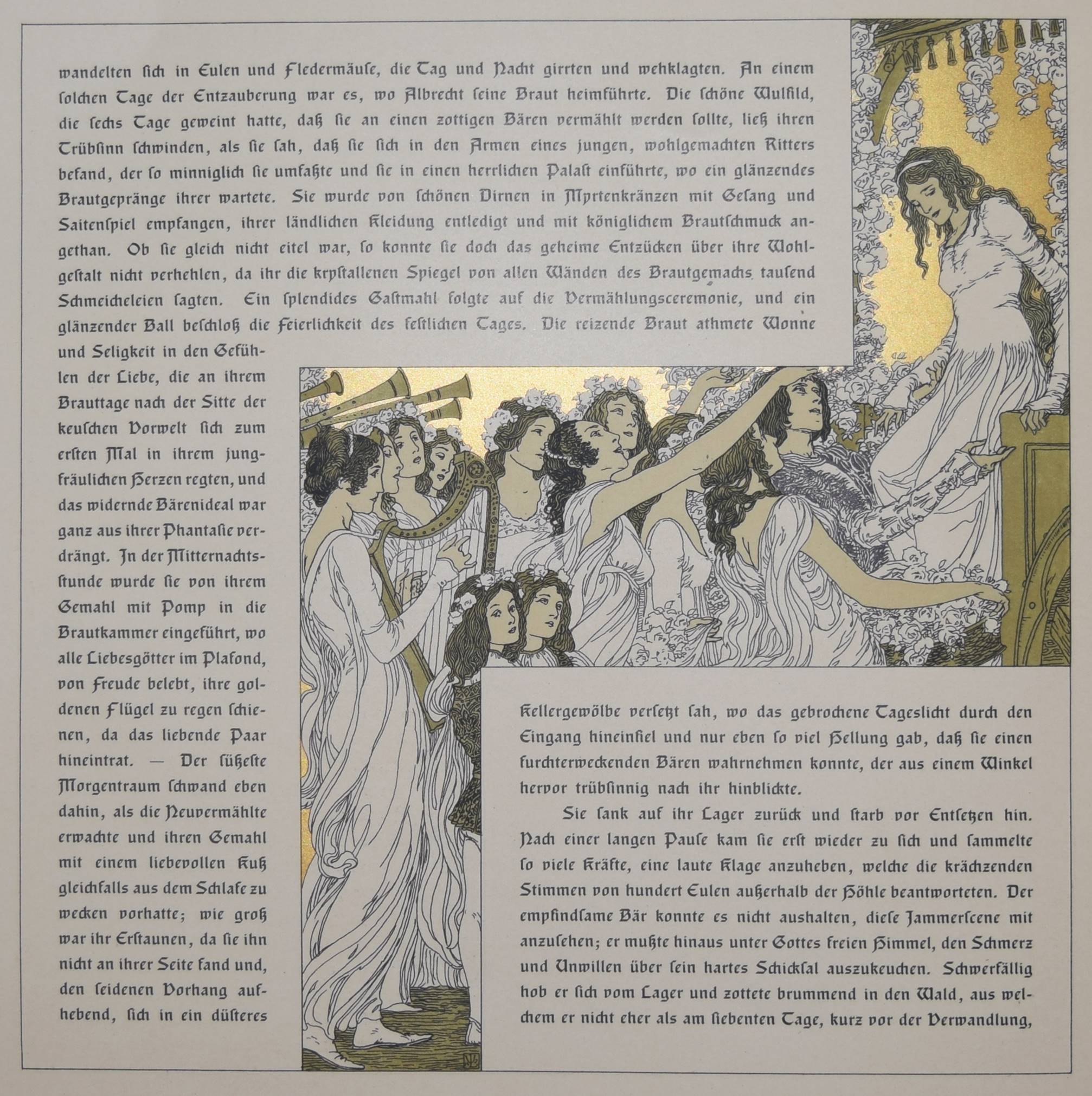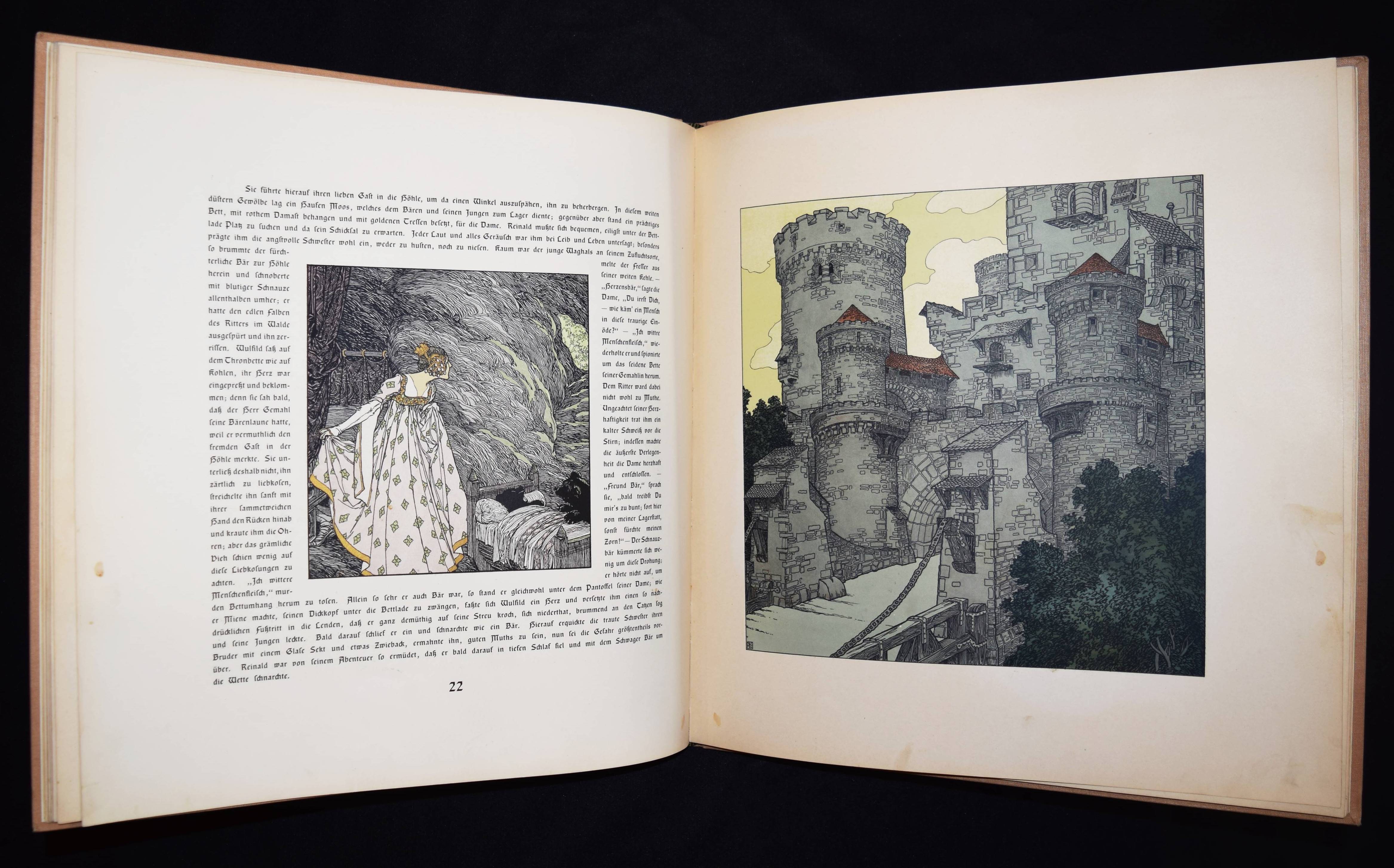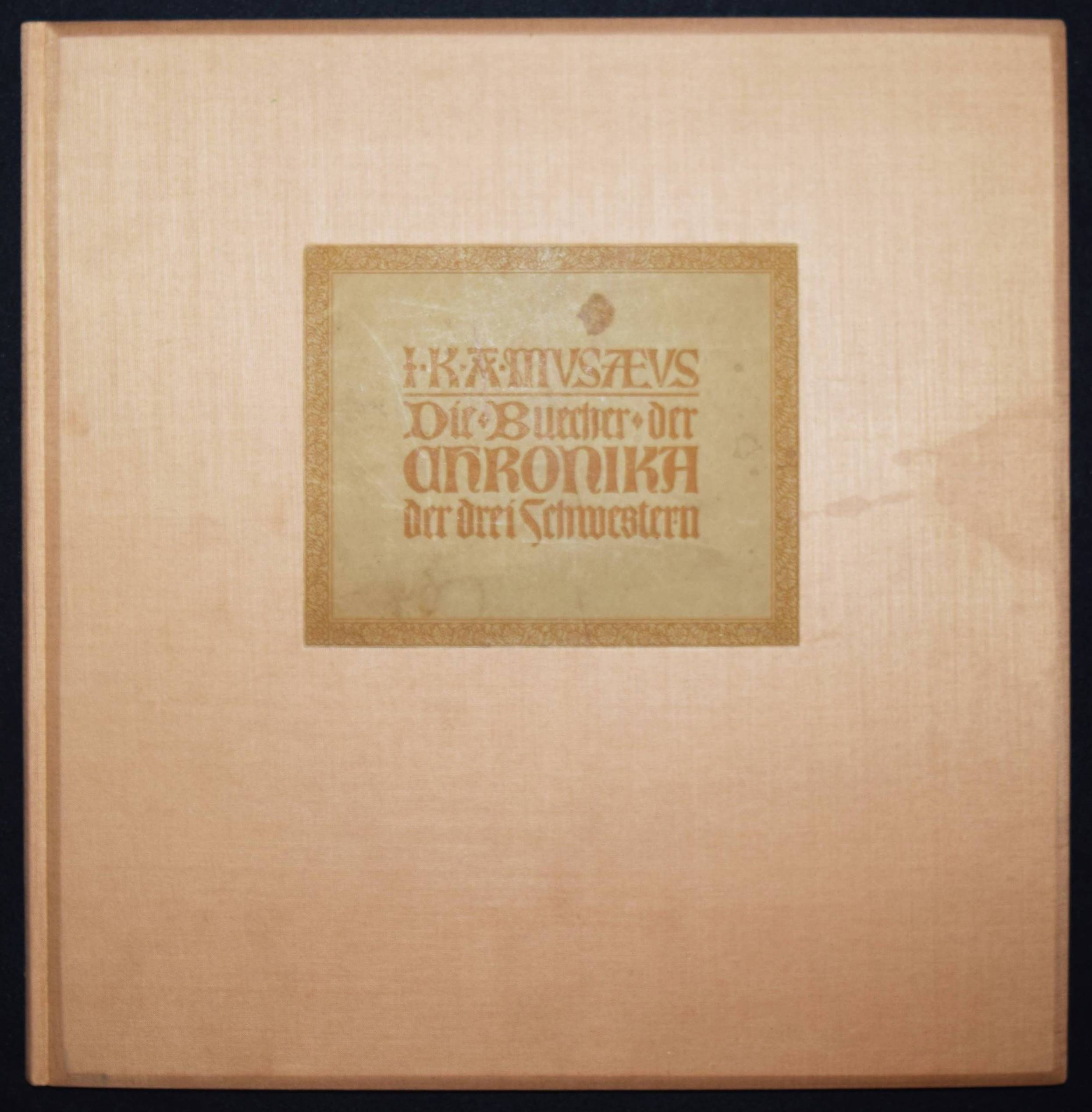 Musäus, J(ohann) K(arl) A(ugust). Die Bücher der Chronika der drei Schwestern. Illustriert von H(einrich) Lefler und J(osef) Urban. Berlin, Stargardt 1900. Folio. 54 S. mit illustr. Titel u. zahlreichen teils farb. Illustrationen, sechs davon blattgroß, Bordüren und Vignetten im Text. Moderner hellbrauner Leinenband mit mont. Orig.-Deckelschild. Bang S. 95, 130 u. Abb. 217, 219. Bilderwelt 462. Doderer-Müller S. 269. LKJ II, 330. Oldenburg, Künstler 137. Rodenberg 280. Stuck-Villa I, 422. Thieme/Becker XXII, 559 u. XXXIII, 589. Nicht bei Heller, Bunte Welt. – Druck von der Reichsdruckerei, Berlin, mit einer Type, die von Paul Voigt entworfen und hier zum ersten Mal verwendet wurde (Cicero-Voigtische-Gotisch). – Die hübschen Illustrationen und Bordüren teils goldgehöht. – „Es ist durch eine ungewöhnliche architektonische Szenerie (Urban war Architekt), eine eigenwillige Umschmelzung historistischer Form- und Dekorzitate ins Stilkünstlerische sowie durch eine fein gestufte, reich instrumentierte Farbigkeit gekennzeichnet“ (H. Ries in Bilderwelt). – Neben freundschaftlichen und geschäftlichen verbanden die beiden Wiener Sezessions-Künstler Joseph Urban und Heinrich Lefler als Schwager auch familiäre Beziehungen. Sie arbeiteten oft zusammen, Urban lieferte dabei stets die dekorative Umrahmung zu Leflers Illustrationen. Beide zählten zu den wichtigsten Künstlern des europäischen Jugendstils. – Eines der Hauptwerke der deutschen Jugendstil-Bücher, das nur in kleiner Auflage sehr aufwändig gedruckt und auf der Pariser Weltausstellung 1900 ausgestellt wurde. – Einband fachgerecht und geschmackvoll erneuert (farblich sehr gut mit dem Deckelschild abgestimmt), im Blattrand vereinzelt leicht fingerfleckig, schönes Exemplar.