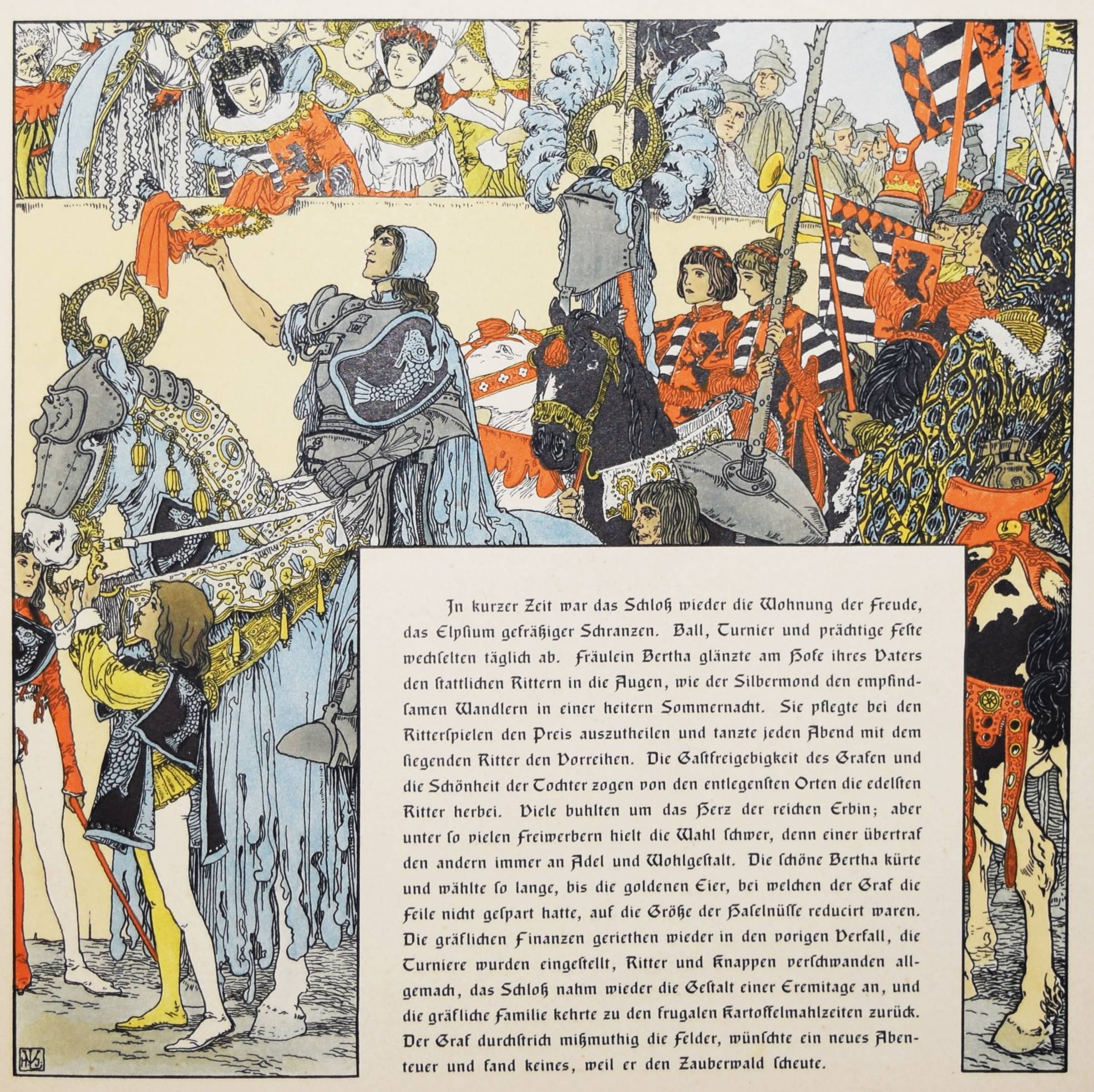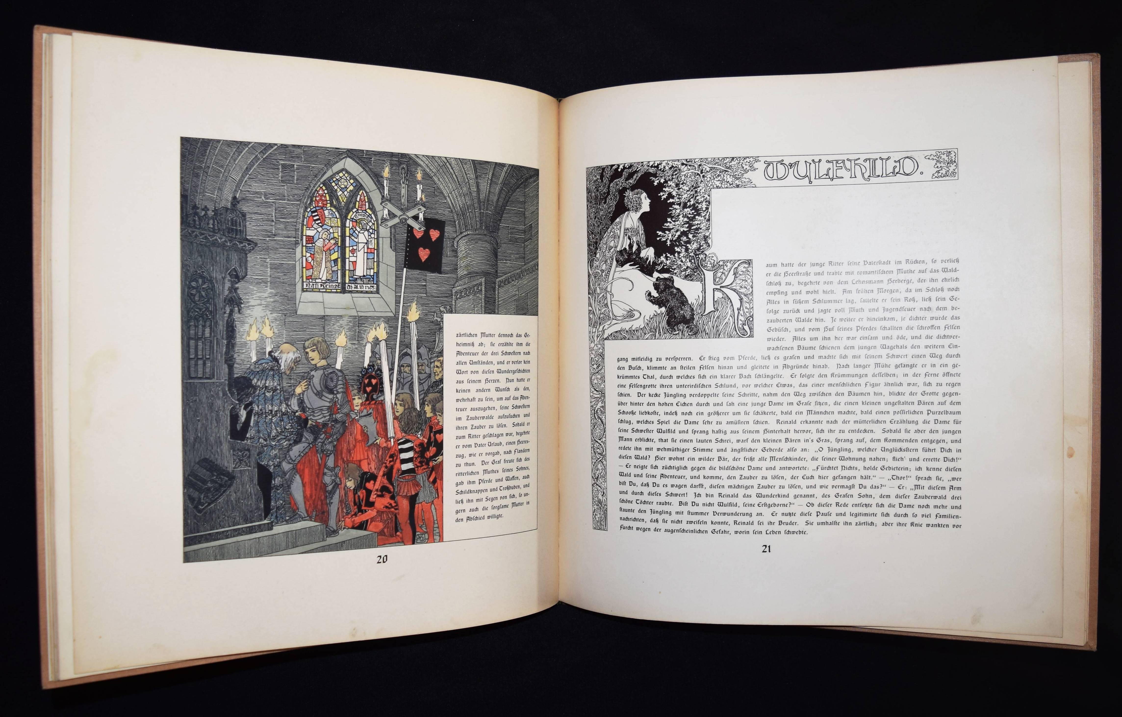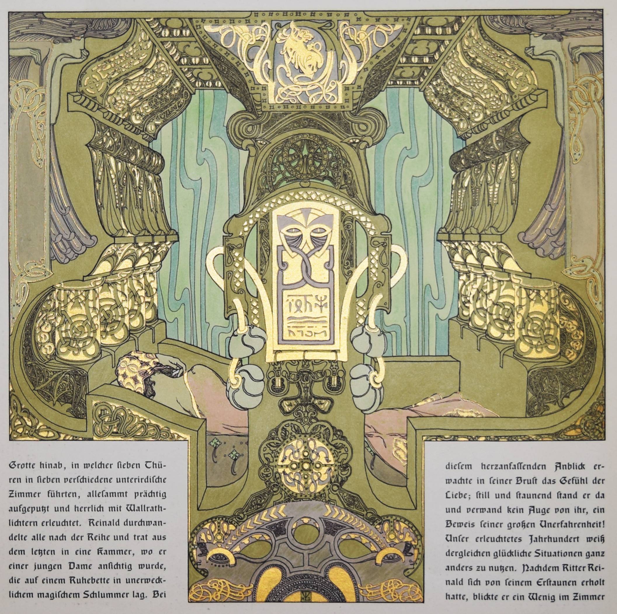 Musäus, J(ohann) K(arl) A(ugust). Die Bücher der Chronika der drei Schwestern. Illustriert von H(einrich) Lefler und J(osef) Urban. Berlin, Stargardt 1900. Folio. 54 S. mit illustr. Titel u. zahlreichen teils farb. Illustrationen, sechs davon blattgroß, Bordüren und Vignetten im Text. Moderner hellbrauner Leinenband mit mont. Orig.-Deckelschild. Bang S. 95, 130 u. Abb. 217, 219. Bilderwelt 462. Doderer-Müller S. 269. LKJ II, 330. Oldenburg, Künstler 137. Rodenberg 280. Stuck-Villa I, 422. Thieme/Becker XXII, 559 u. XXXIII, 589. Nicht bei Heller, Bunte Welt. – Druck von der Reichsdruckerei, Berlin, mit einer Type, die von Paul Voigt entworfen und hier zum ersten Mal verwendet wurde (Cicero-Voigtische-Gotisch). – Die hübschen Illustrationen und Bordüren teils goldgehöht. – „Es ist durch eine ungewöhnliche architektonische Szenerie (Urban war Architekt), eine eigenwillige Umschmelzung historistischer Form- und Dekorzitate ins Stilkünstlerische sowie durch eine fein gestufte, reich instrumentierte Farbigkeit gekennzeichnet“ (H. Ries in Bilderwelt). – Neben freundschaftlichen und geschäftlichen verbanden die beiden Wiener Sezessions-Künstler Joseph Urban und Heinrich Lefler als Schwager auch familiäre Beziehungen. Sie arbeiteten oft zusammen, Urban lieferte dabei stets die dekorative Umrahmung zu Leflers Illustrationen. Beide zählten zu den wichtigsten Künstlern des europäischen Jugendstils. – Eines der Hauptwerke der deutschen Jugendstil-Bücher, das nur in kleiner Auflage sehr aufwändig gedruckt und auf der Pariser Weltausstellung 1900 ausgestellt wurde. – Einband fachgerecht und geschmackvoll erneuert (farblich sehr gut mit dem Deckelschild abgestimmt), im Blattrand vereinzelt leicht fingerfleckig, schönes Exemplar.