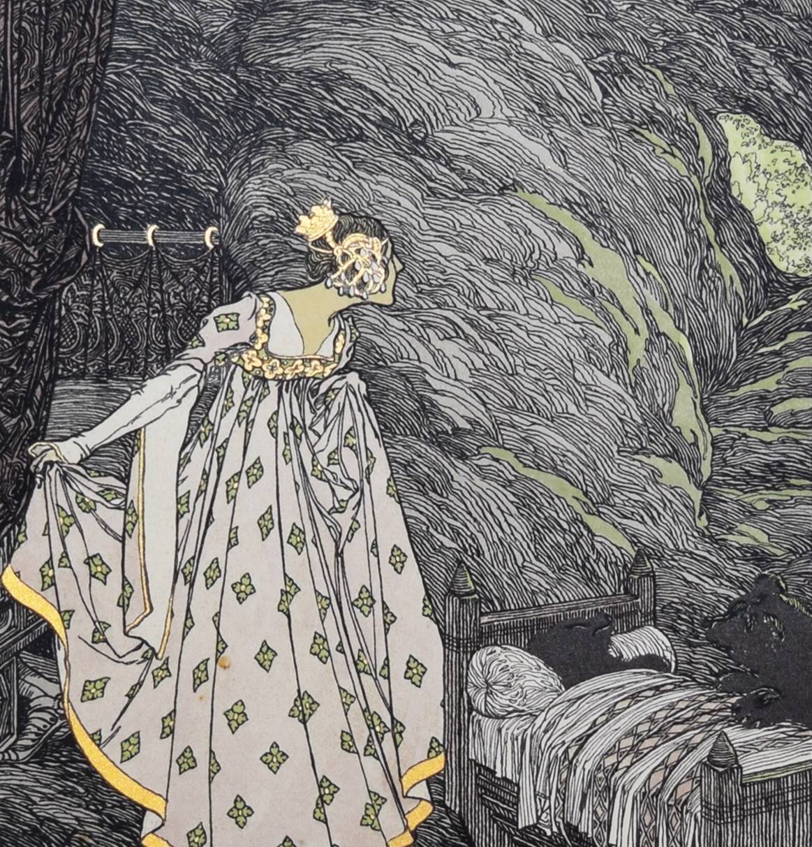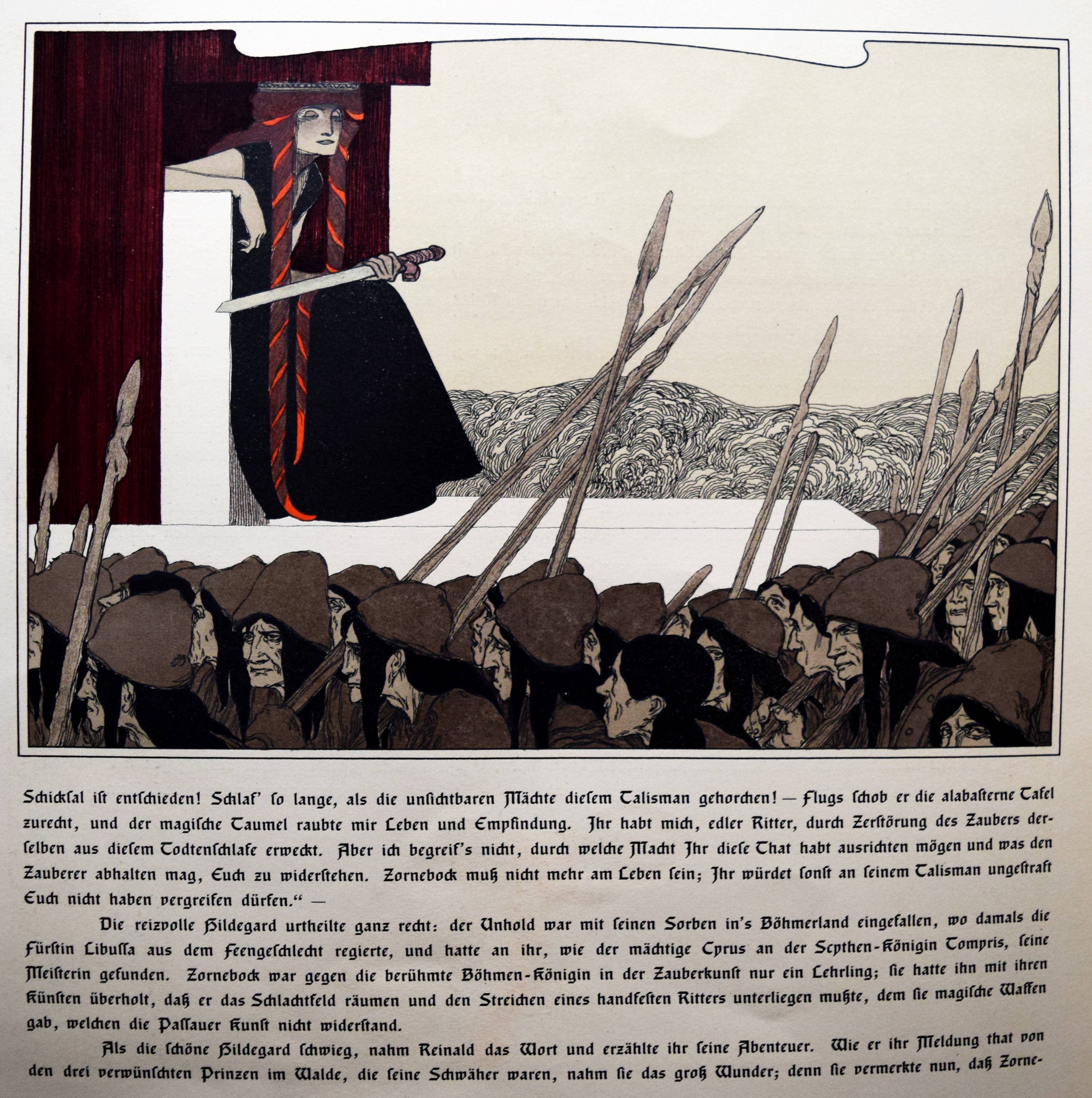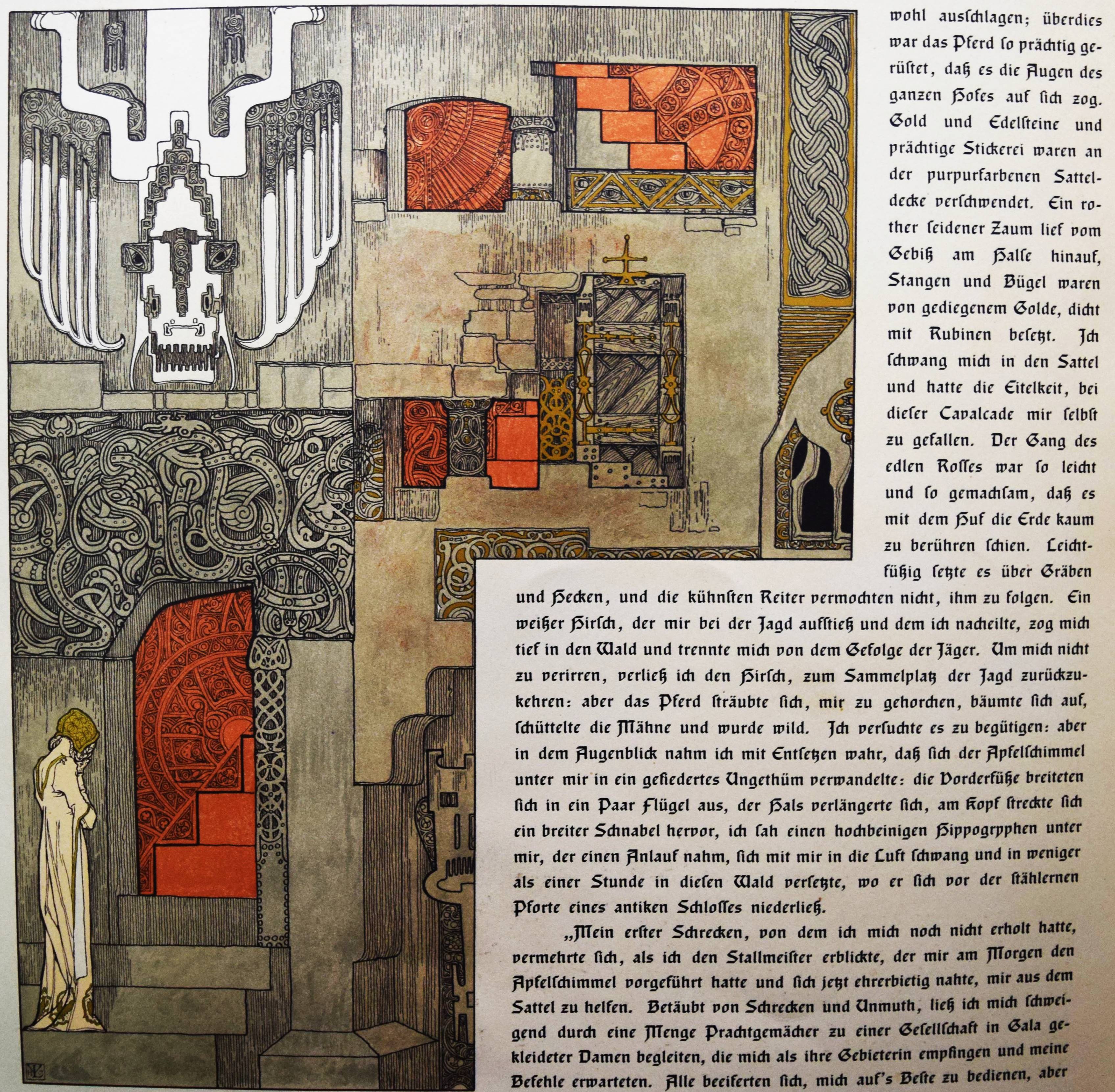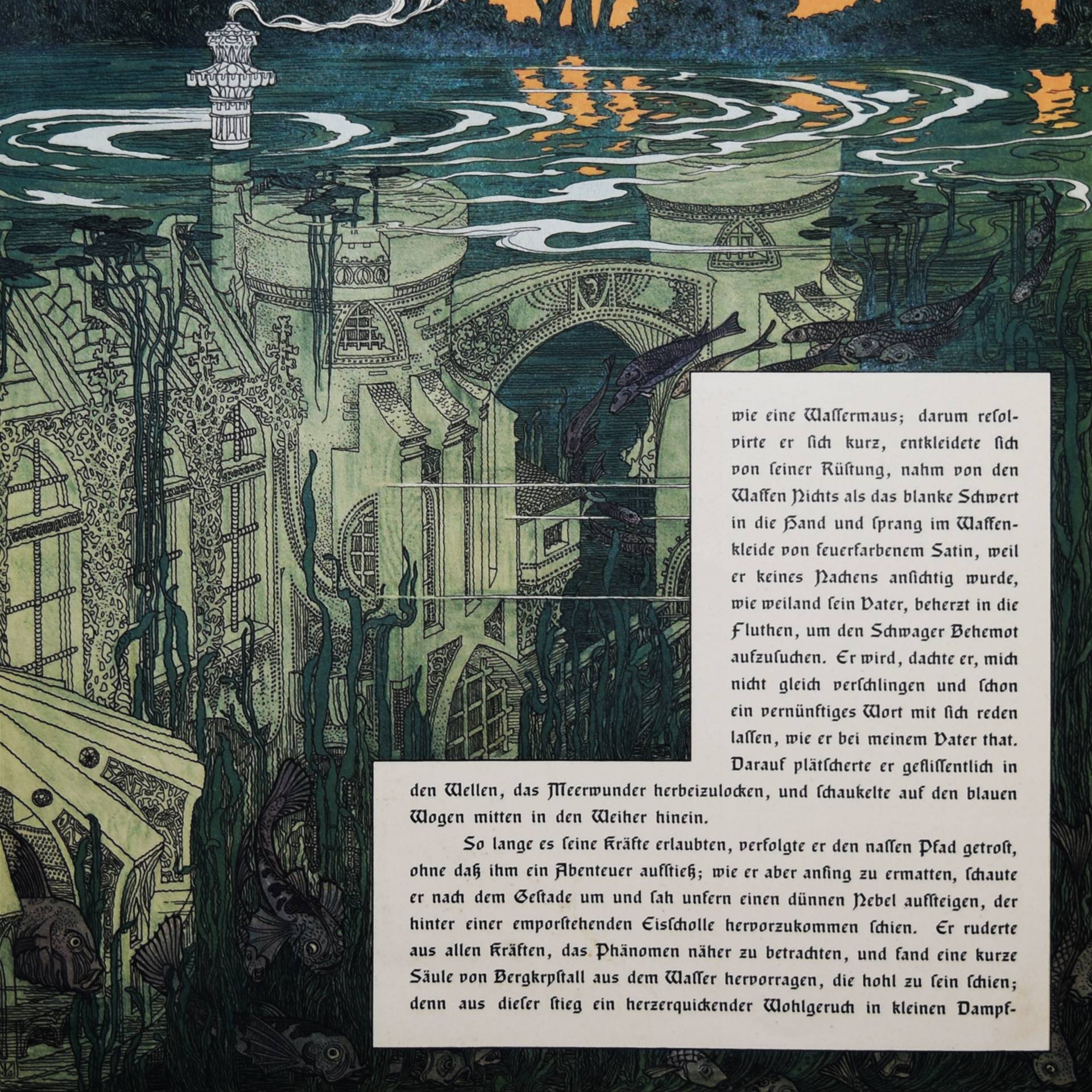 Musäus, J(ohann) K(arl) A(ugust). Die Bücher der Chronika der drei Schwestern. Illustriert von H(einrich) Lefler und J(osef) Urban. Berlin, Stargardt 1900. Folio. 54 S. mit illustr. Titel u. zahlreichen teils farb. Illustrationen, sechs davon blattgroß, Bordüren und Vignetten im Text. Moderner hellbrauner Leinenband mit mont. Orig.-Deckelschild. Bang S. 95, 130 u. Abb. 217, 219. Bilderwelt 462. Doderer-Müller S. 269. LKJ II, 330. Oldenburg, Künstler 137. Rodenberg 280. Stuck-Villa I, 422. Thieme/Becker XXII, 559 u. XXXIII, 589. Nicht bei Heller, Bunte Welt. – Druck von der Reichsdruckerei, Berlin, mit einer Type, die von Paul Voigt entworfen und hier zum ersten Mal verwendet wurde (Cicero-Voigtische-Gotisch). – Die hübschen Illustrationen und Bordüren teils goldgehöht. – „Es ist durch eine ungewöhnliche architektonische Szenerie (Urban war Architekt), eine eigenwillige Umschmelzung historistischer Form- und Dekorzitate ins Stilkünstlerische sowie durch eine fein gestufte, reich instrumentierte Farbigkeit gekennzeichnet“ (H. Ries in Bilderwelt). – Neben freundschaftlichen und geschäftlichen verbanden die beiden Wiener Sezessions-Künstler Joseph Urban und Heinrich Lefler als Schwager auch familiäre Beziehungen. Sie arbeiteten oft zusammen, Urban lieferte dabei stets die dekorative Umrahmung zu Leflers Illustrationen. Beide zählten zu den wichtigsten Künstlern des europäischen Jugendstils. – Eines der Hauptwerke der deutschen Jugendstil-Bücher, das nur in kleiner Auflage sehr aufwändig gedruckt und auf der Pariser Weltausstellung 1900 ausgestellt wurde. – Einband fachgerecht und geschmackvoll erneuert (farblich sehr gut mit dem Deckelschild abgestimmt), im Blattrand vereinzelt leicht fingerfleckig, schönes Exemplar.