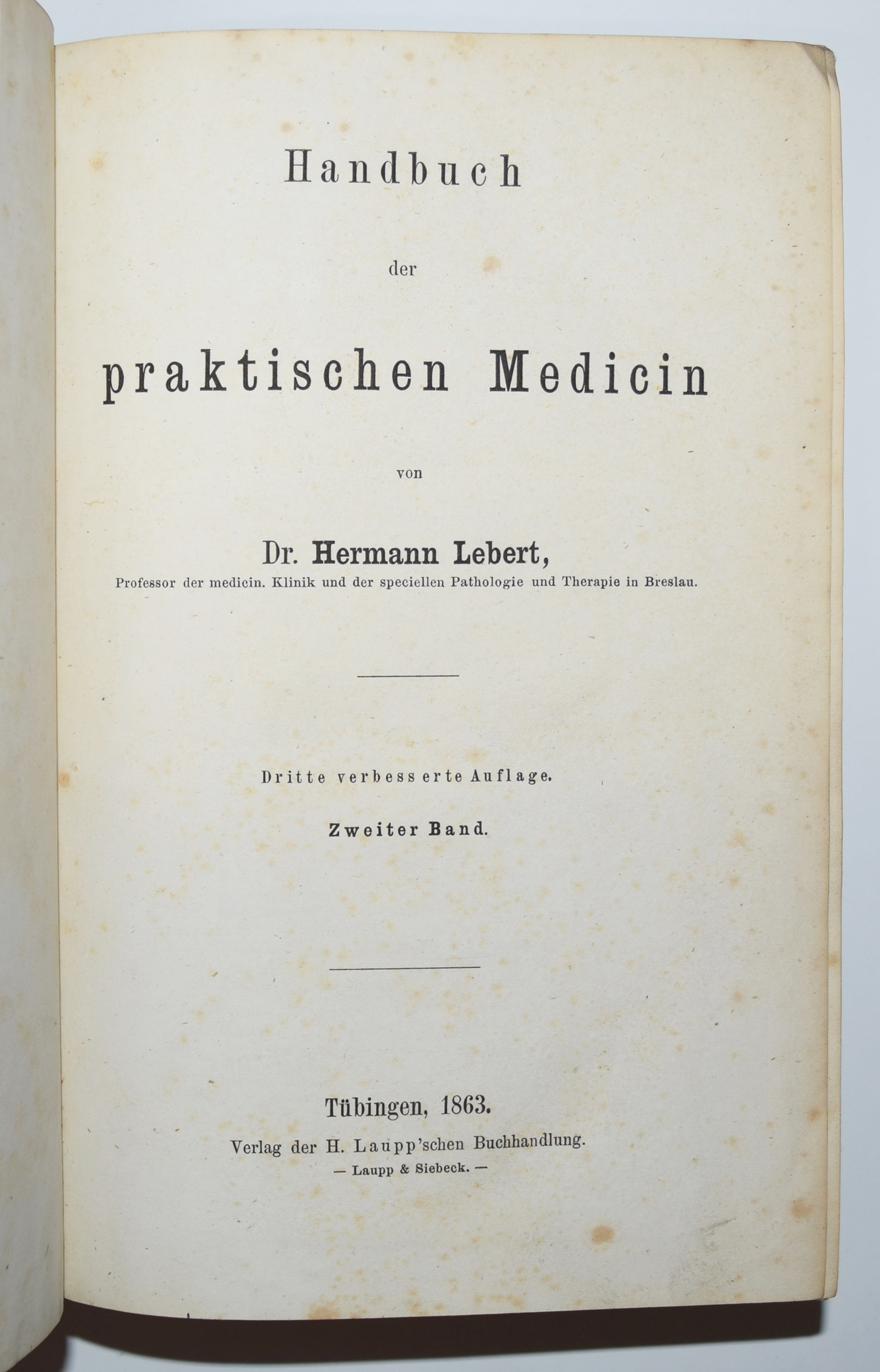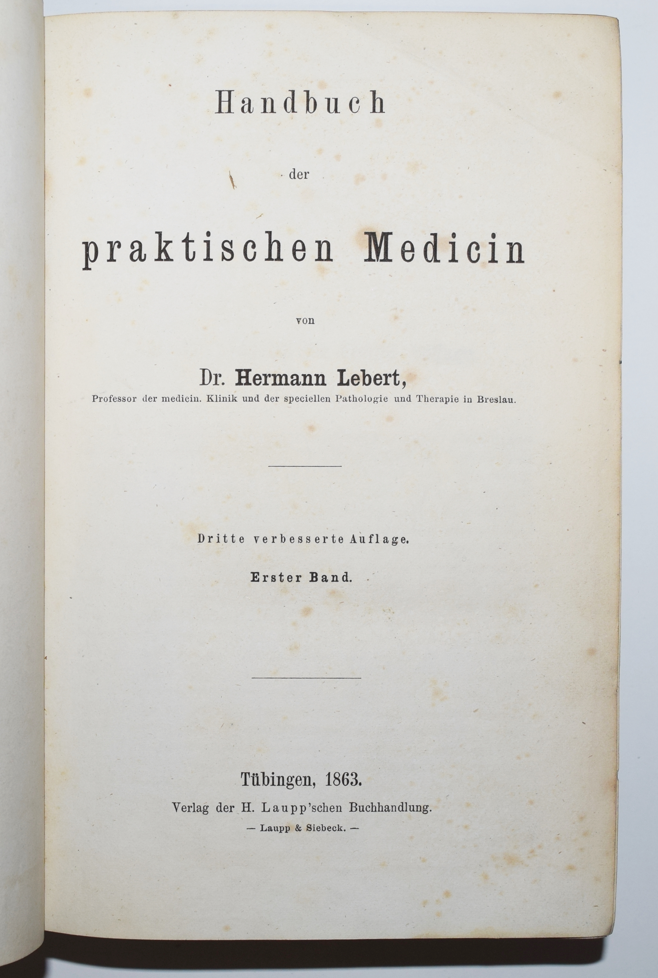 Lebert, Hermann. Handbuch der praktischen Medicin. 3., verb. Aufl. 2 Bände. Tübingen, Laupp 1863. Gr.-8°. XVI, 1091 S.; IX, 1074 S. OLn. mit goldgepr. Rückensch. u. Rückenverg. Hirsch-Hüb. III, 705 f. – Der schlesische Mediziner H. Lebert (1813-1878) praktizierte nach seinem Studium in Berlin und Zürich für kurze Zeit in Zürich. „Wegen der Teilnahme am Savoyerzug 1834 wurde L. von der Universität relegiert, worauf er nach Paris ging. Danach war er Arzt in Bex, ab 1838 Badearzt in Lavey-Morcles und ab 1846 prakt. Arzt in Paris. 1853 wurde er o. Prof. für Pathologie, Therapie und medizin. Klinik in Zürich. 1859-74 war er Prof. in Breslau, ab 1859 auch Honorarprof. der Akad. Lausanne. Ab 1874 lebte er in Vevey. Als bedeutender Mediziner und Naturwissenschaftler veröffentlichte L. mehrere grundlegende medizin. Werke und kleinere Schriften über Schweizer Kurorte sowie über Spinnen und Milben“ (A. Portmann-Tinguely in HLS). – Einbände etwas berieben, stellenweise etwas braunfleckig, gutes Exemplar.