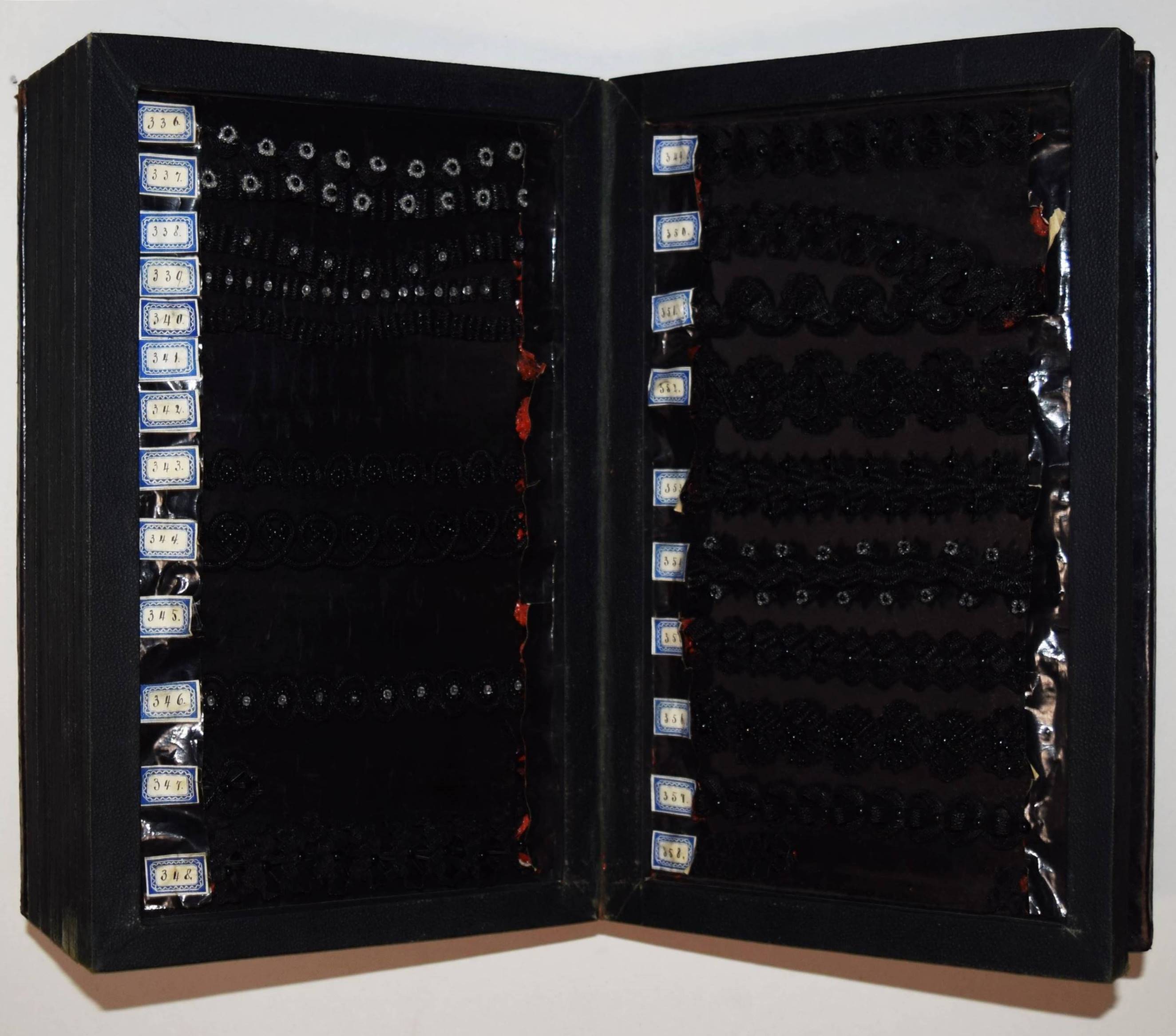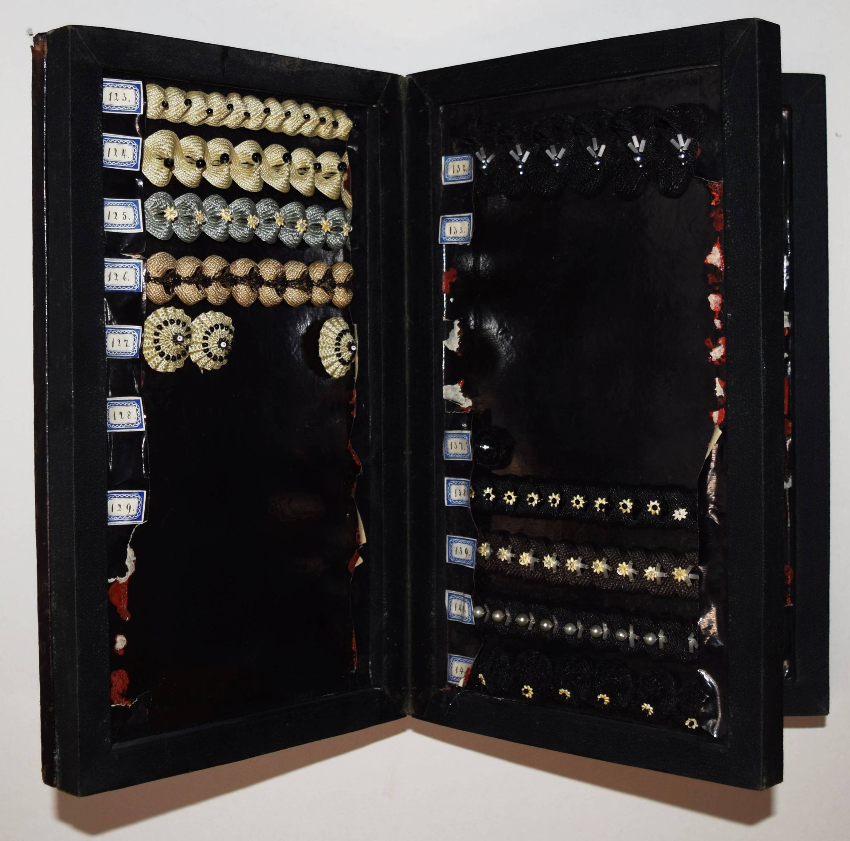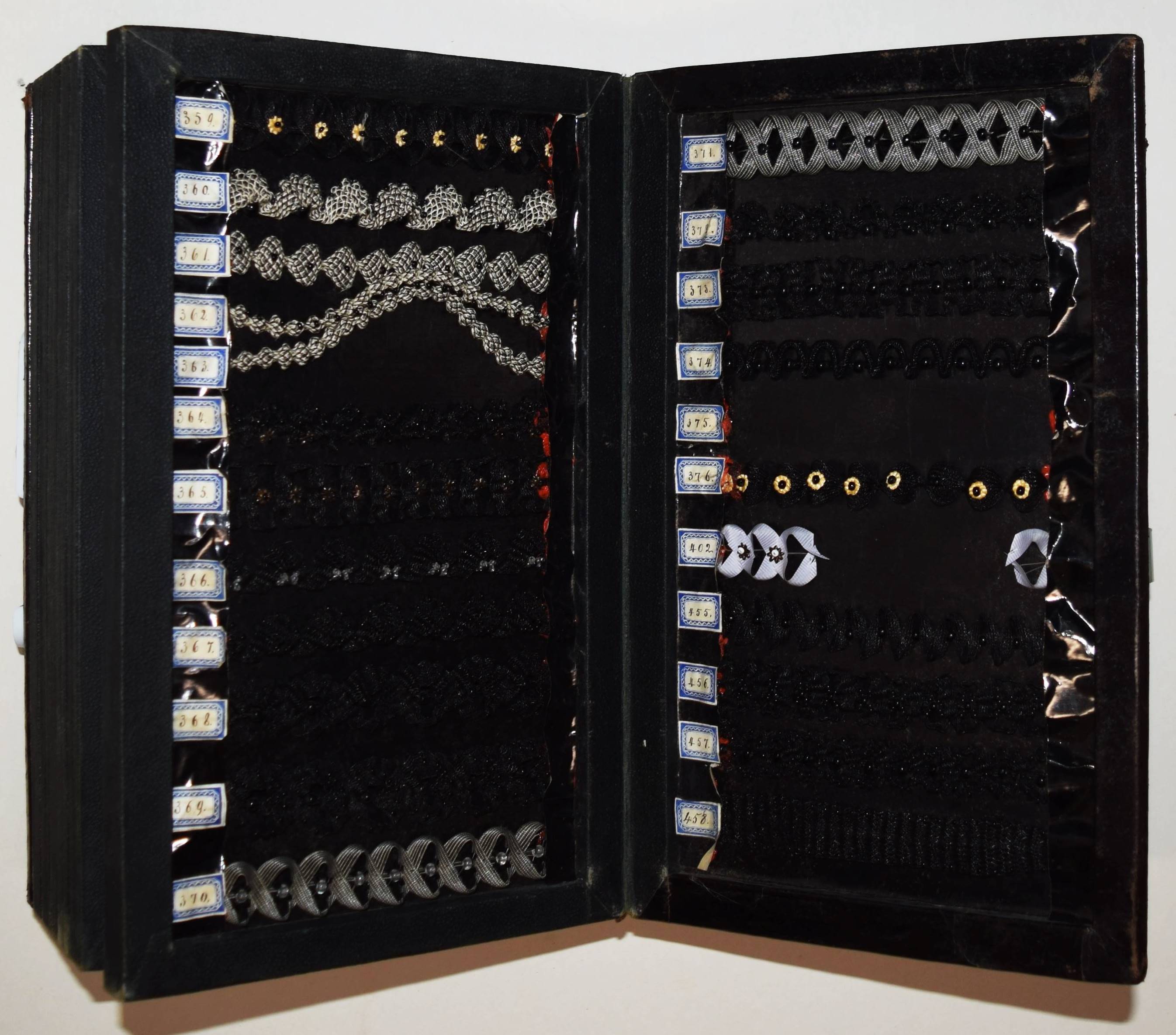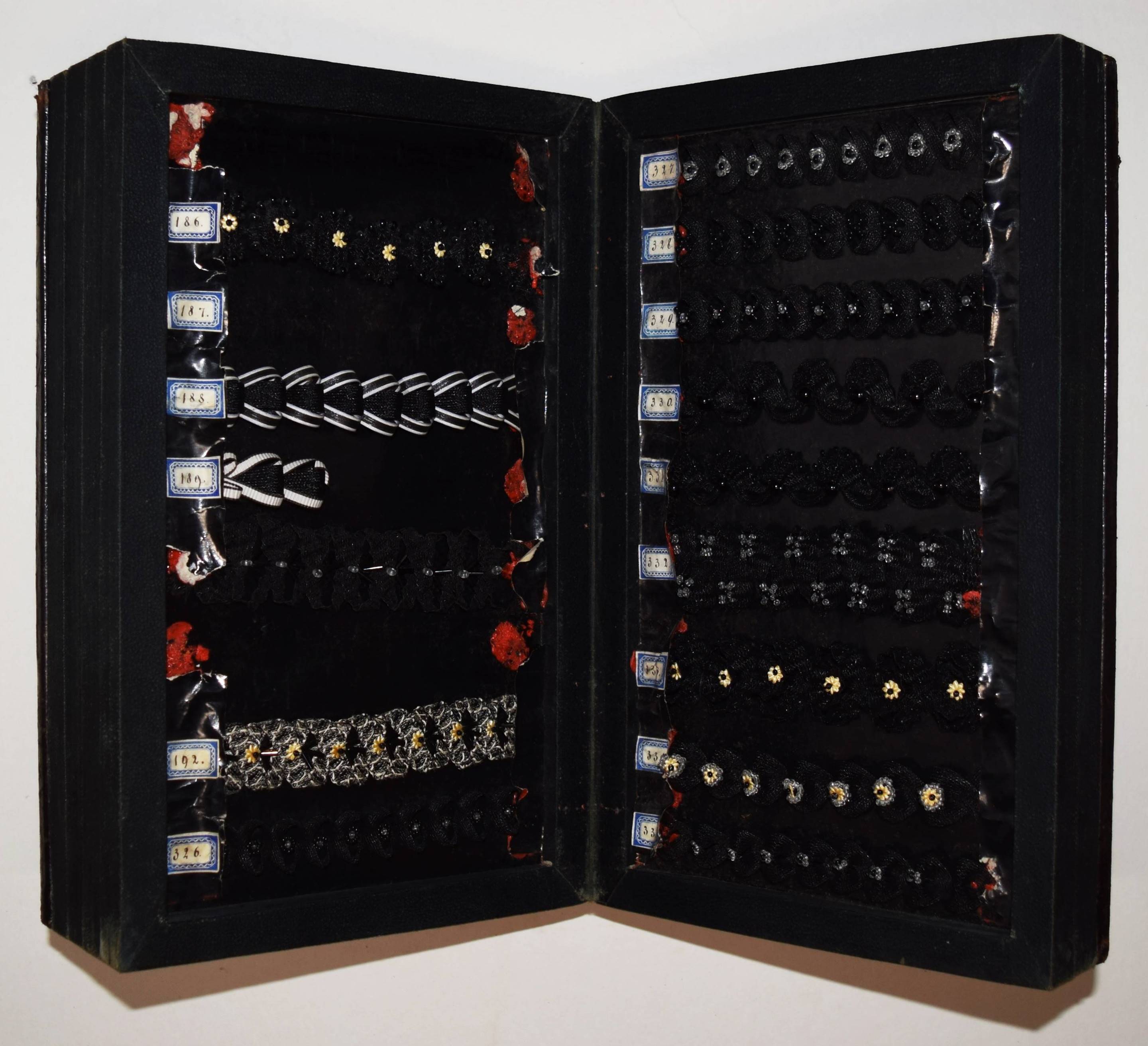 Musterbuch – Bordüren, Borten. Schweiz um 1890. 4° (30 x 19 x 13 cm.). Mit ca. 100 Bordüren, zusammen in 14 flache Kästen mit rotem Siegelwachs montiert. Buchkassette aus Holz mit lederbezogenen Deckeln mit Deckelmonogramm „F. Gbr. M.“ Bordüren wohl für Trachten oder Modisten in Hellblau, Altweiß, Braun und Schwarz, gewebt, meist aus Roßhaar und mit Perlen oder kleinen Sternen in Silber, Natur oder Schwarz verziert. Alle Muster sind mit handschr. Nummern auf Papierschildchen versehen. Ca. 45 Borten fehlen ganz oder teilweise. – Lederbezug der Kassette etwas berieben und am Kapital stellenweise etwas gelöst, sonst sehr gut erhalten.
