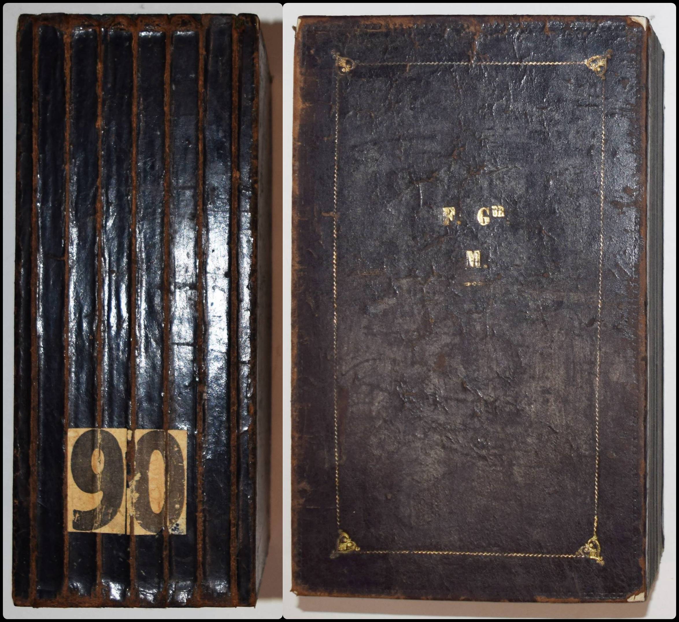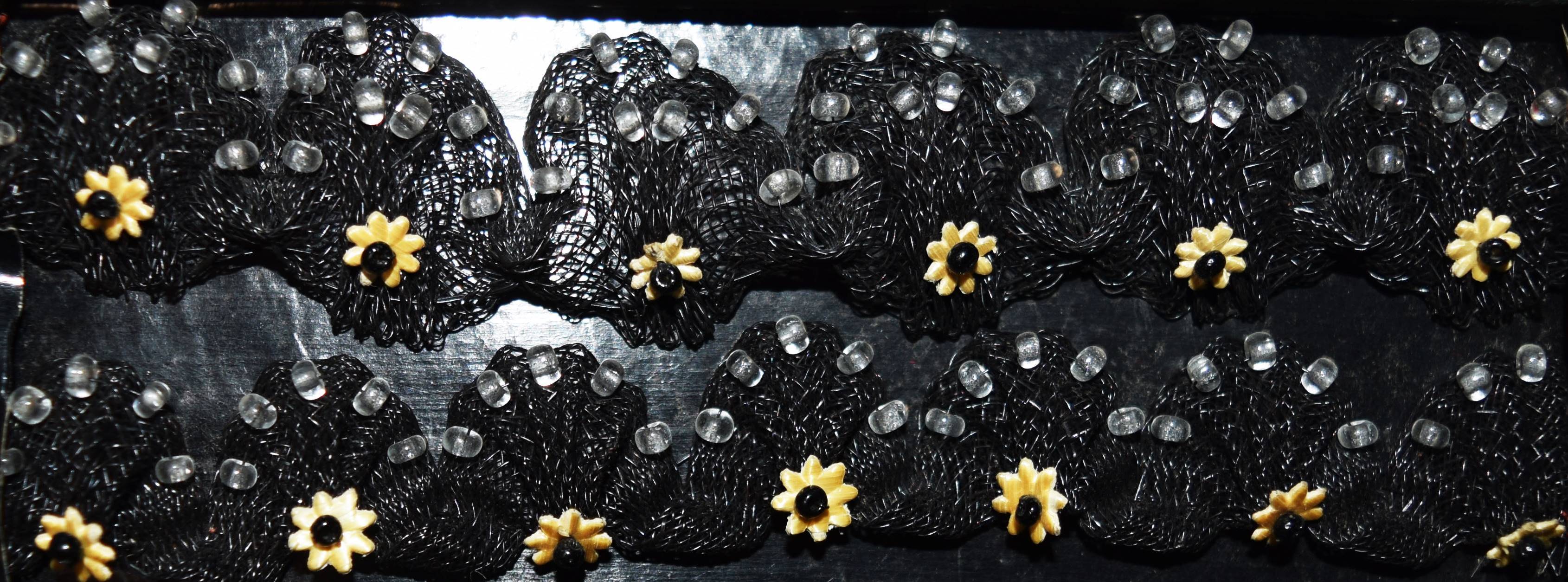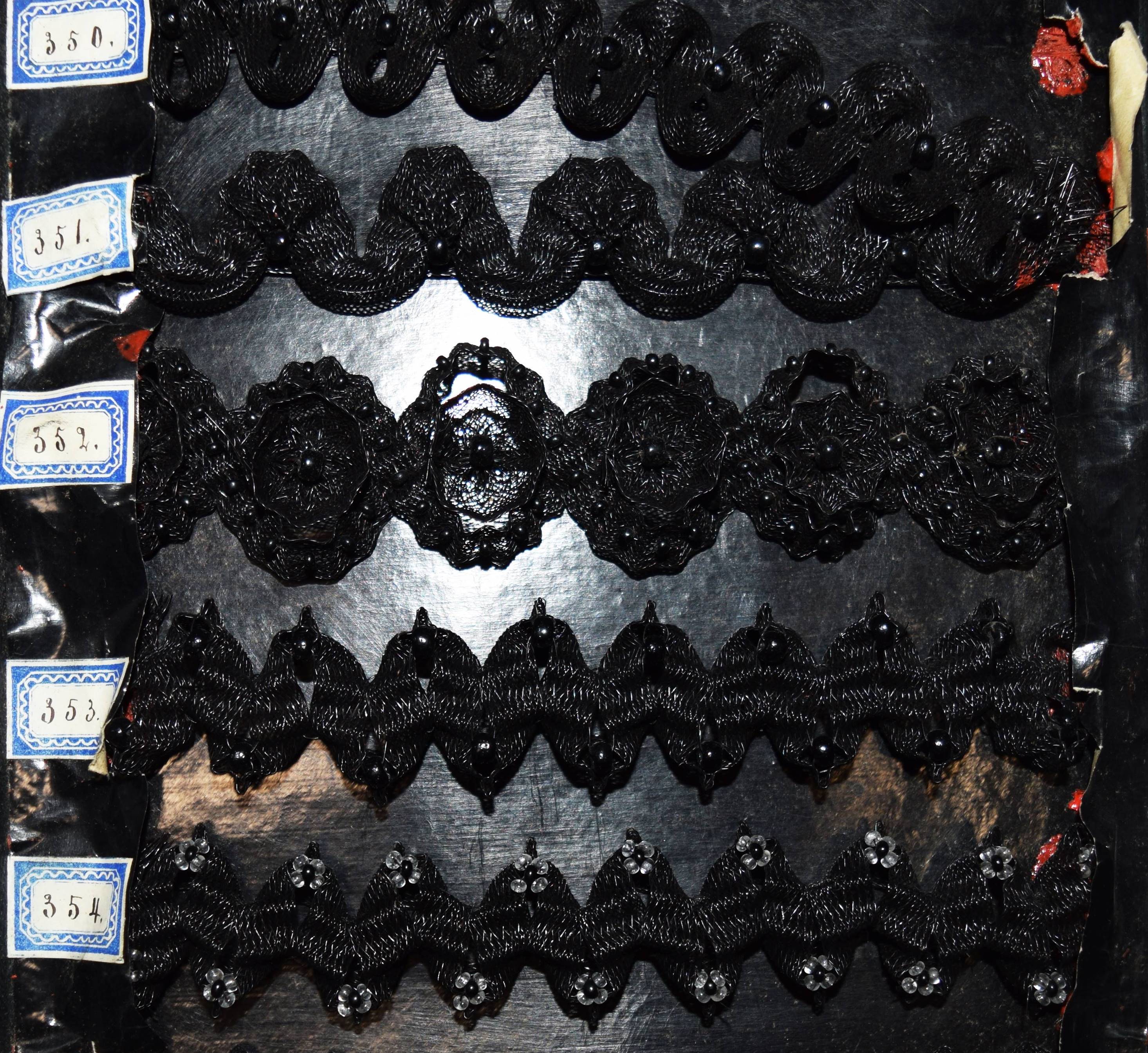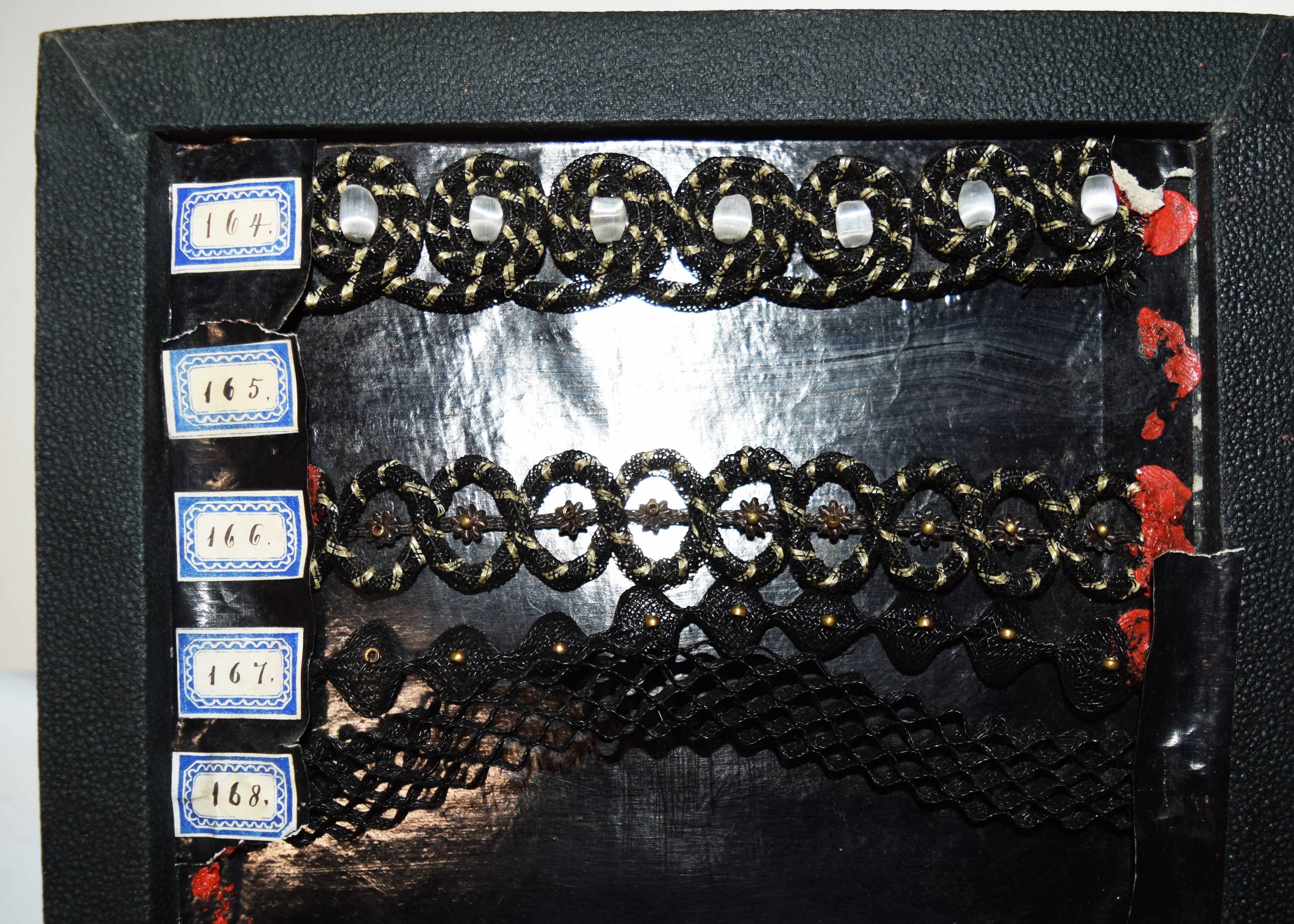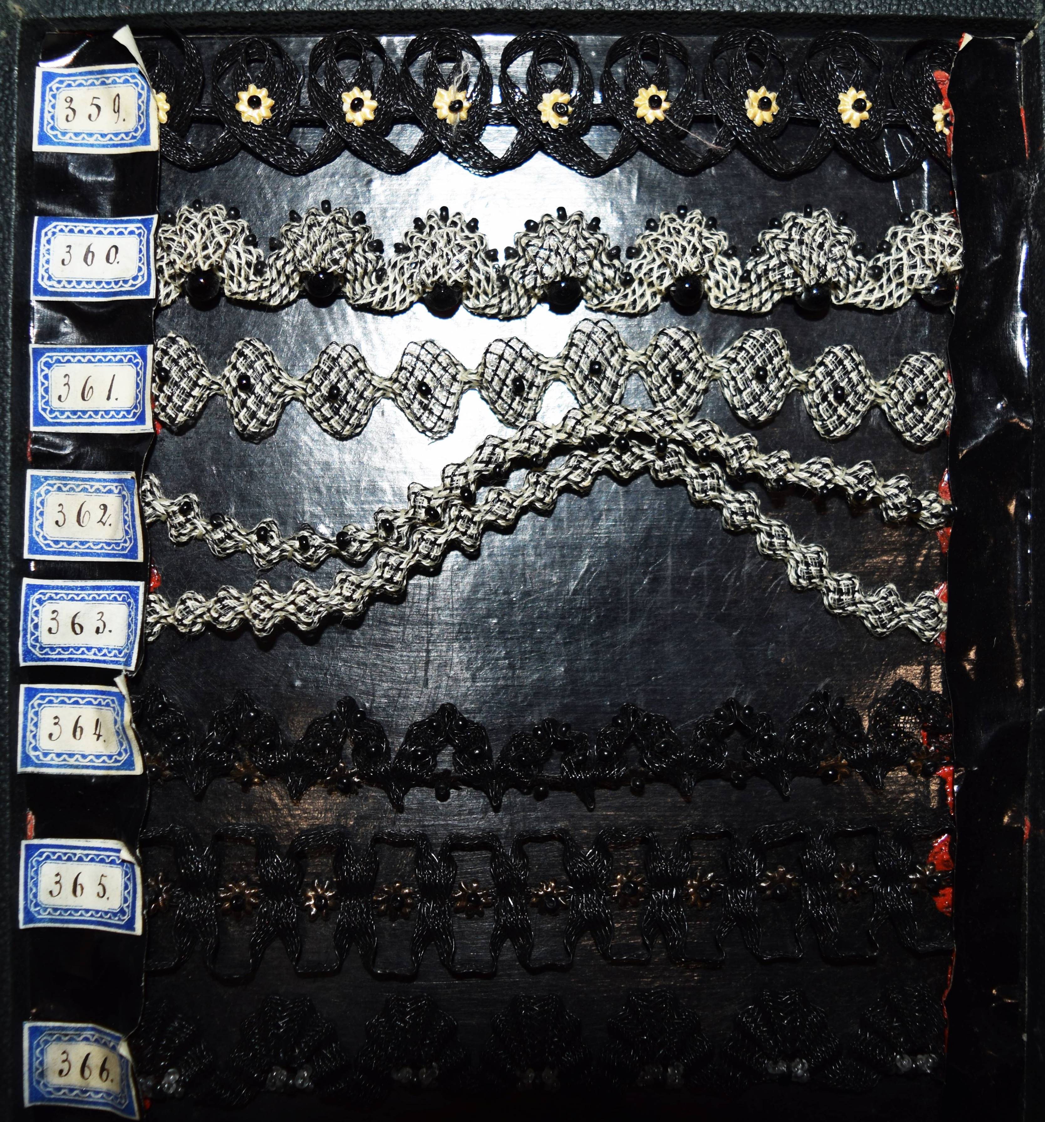 Musterbuch – Bordüren, Borten. Schweiz um 1890. 4° (30 x 19 x 13 cm.). Mit ca. 100 Bordüren, zusammen in 14 flache Kästen mit rotem Siegelwachs montiert. Buchkassette aus Holz mit lederbezogenen Deckeln mit Deckelmonogramm „F. Gbr. M.“ Bordüren wohl für Trachten oder Modisten in Hellblau, Altweiß, Braun und Schwarz, gewebt, meist aus Roßhaar und mit Perlen oder kleinen Sternen in Silber, Natur oder Schwarz verziert. Alle Muster sind mit handschr. Nummern auf Papierschildchen versehen. Ca. 45 Borten fehlen ganz oder teilweise. – Lederbezug der Kassette etwas berieben und am Kapital stellenweise etwas gelöst, sonst sehr gut erhalten.