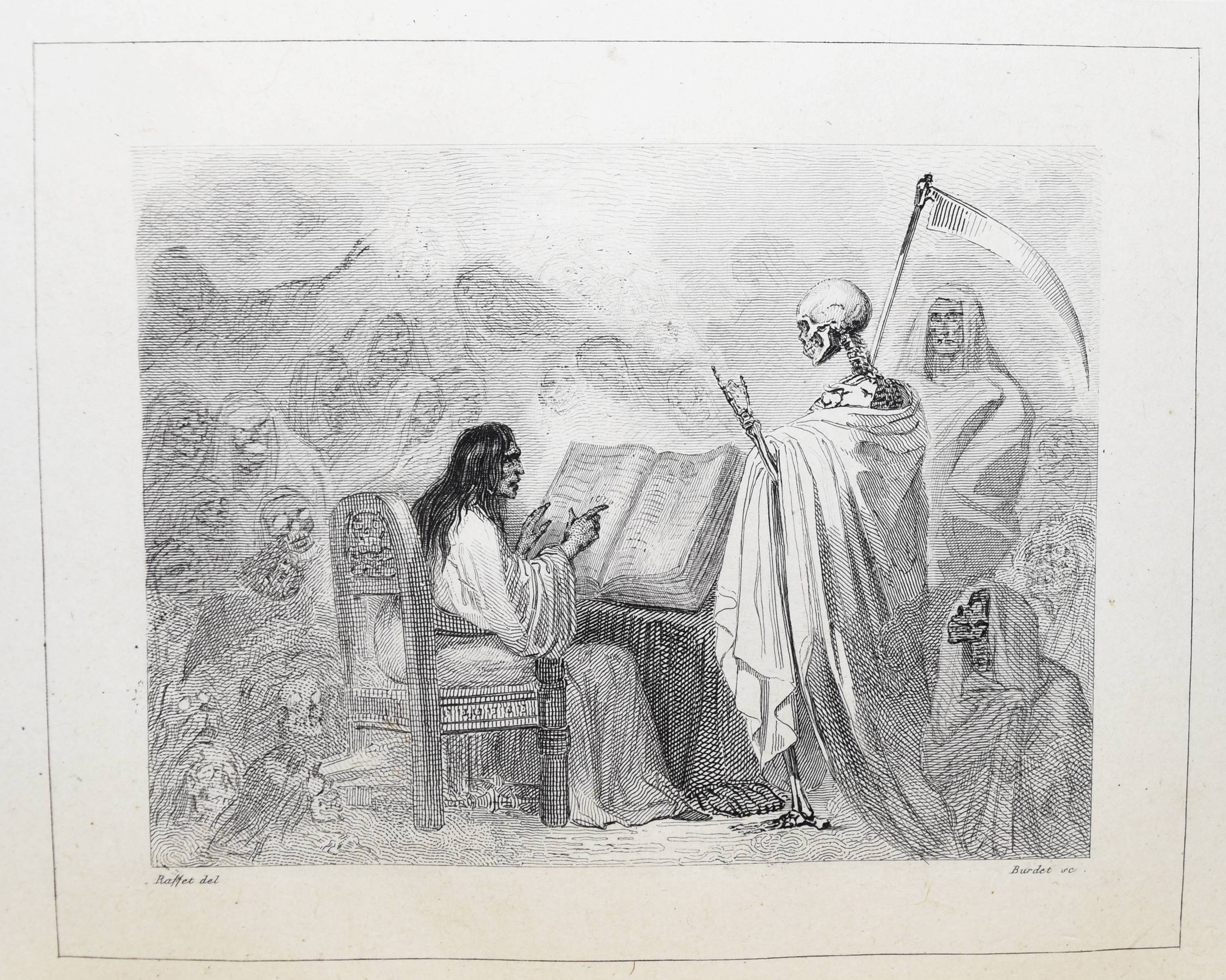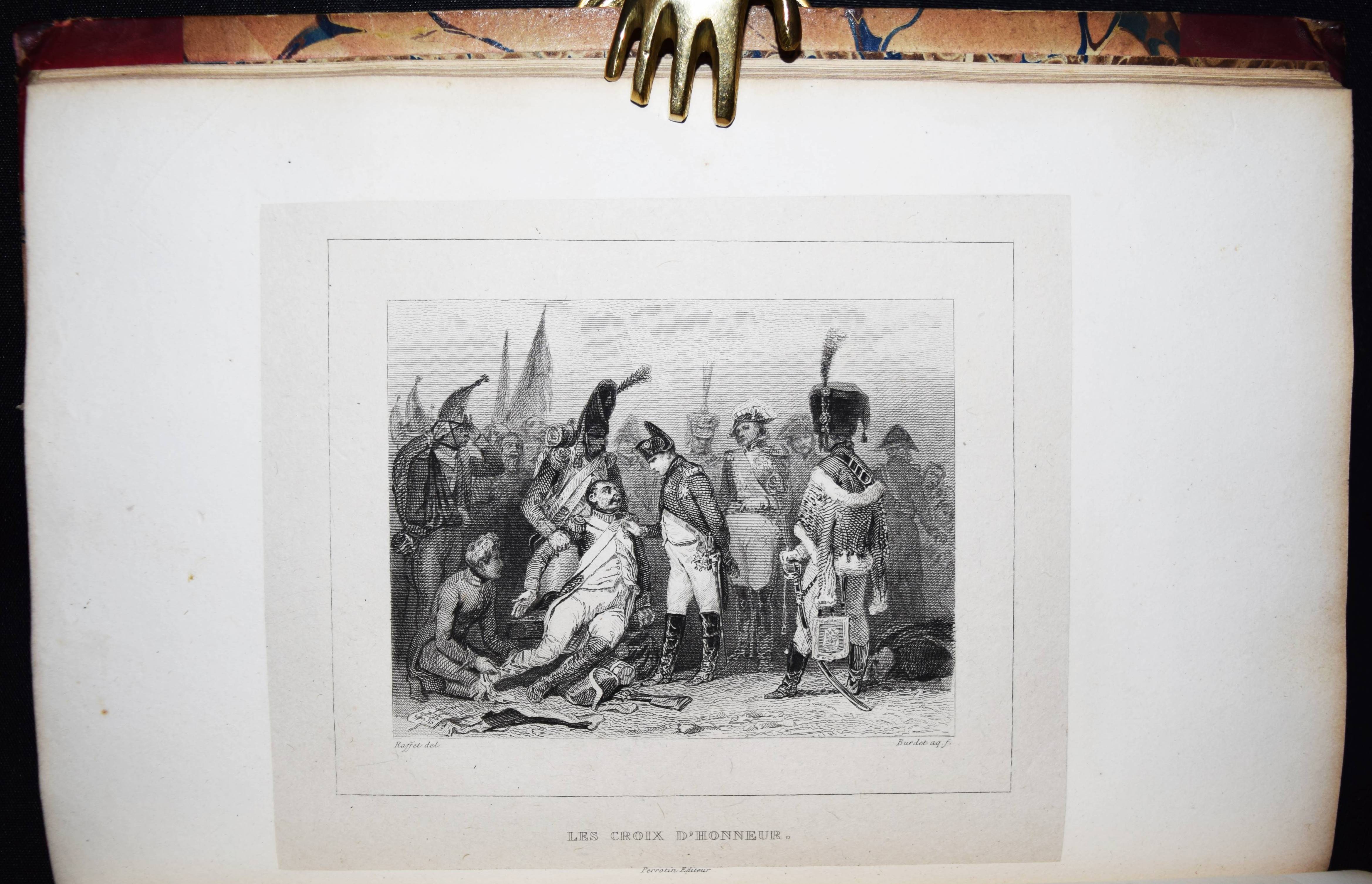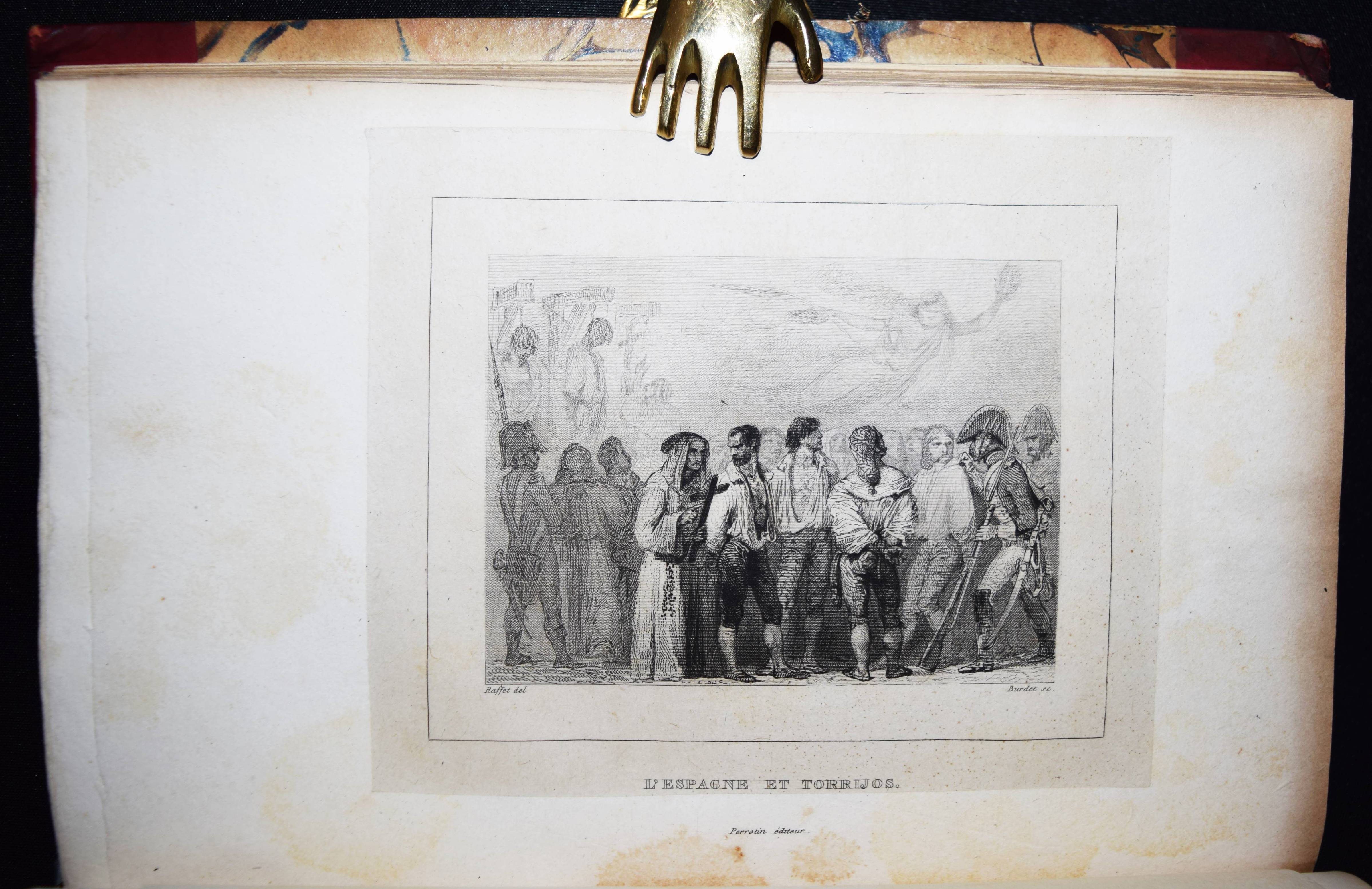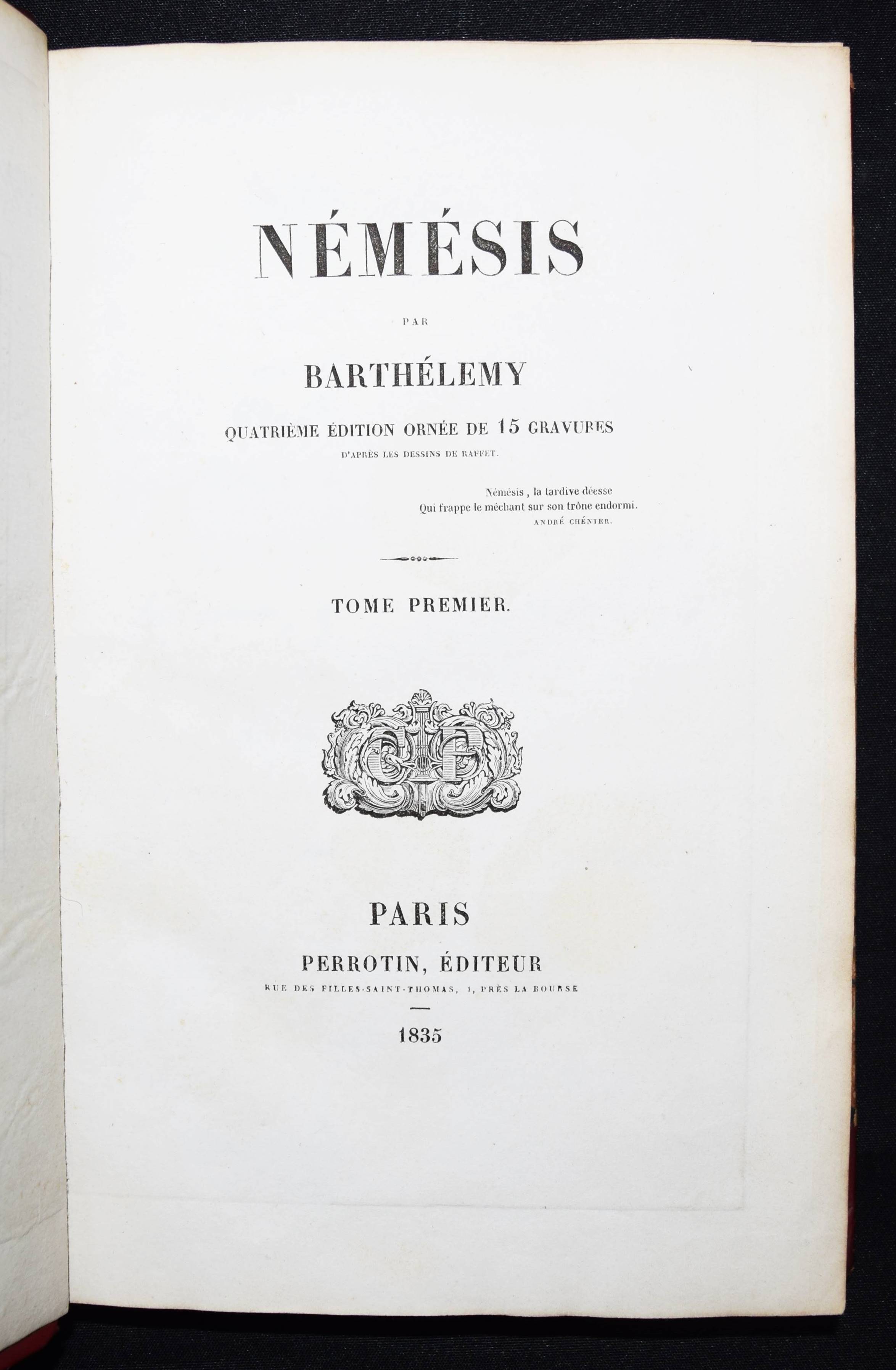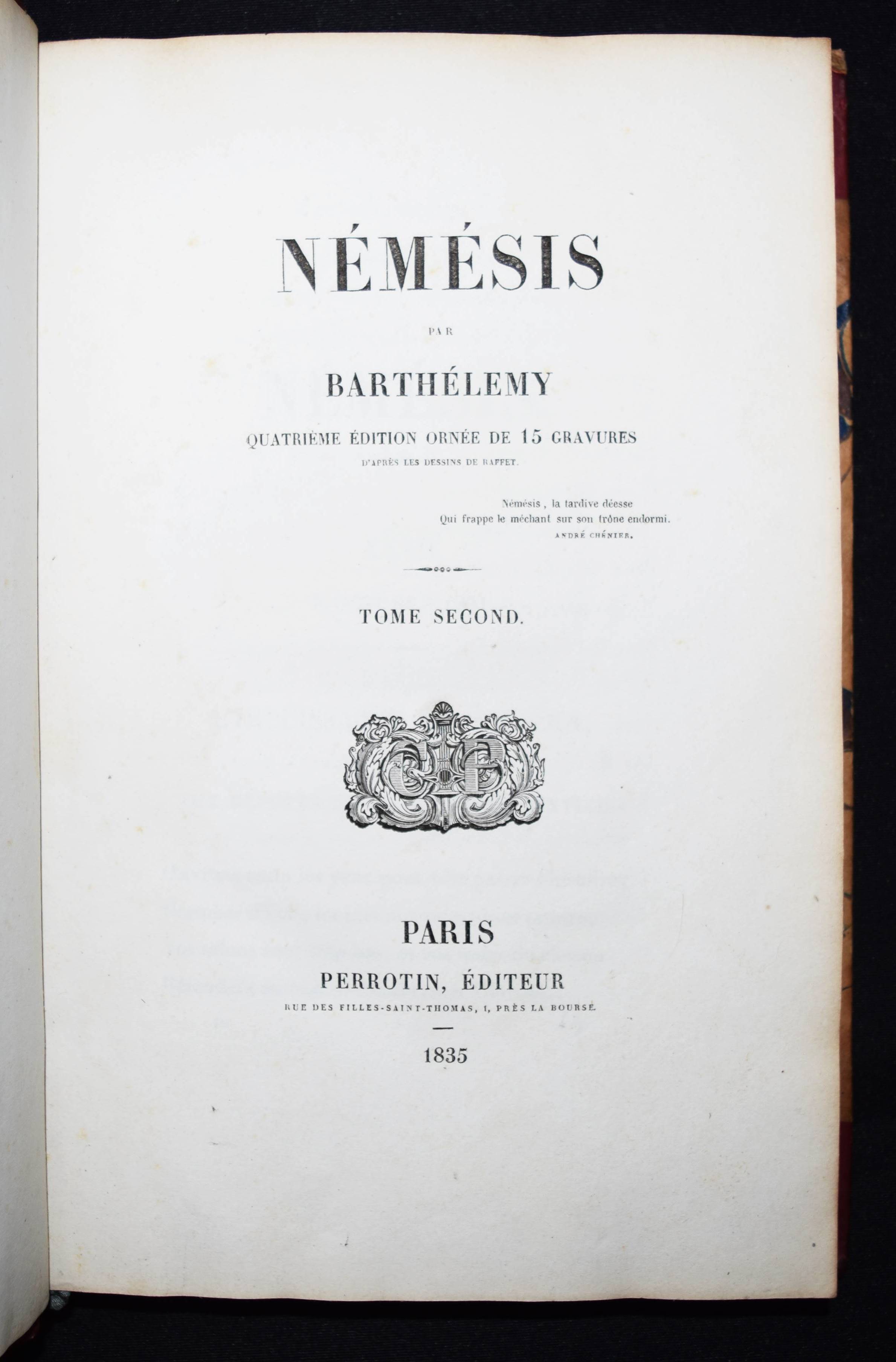 Barthélemy, (Auguste Marseille). Némésis. 4. éd. ornée de 15 gravures d’après les dessins de (Auguste) Raffet. 2 Bände. Paris, Perrotin 1835. 8°. [2] Bl., VIII, 384 S.; [2] Bl., 346 S. mit gestoch. Portrait von Tony Johannot, 1 gefalt. Handschriften-Faksimile u. 14 Stahlstich-Tafeln von Burdet nach Raffet auf China. Weinrote Hldr. d. Zt. mit goldgepr. Rückentitel u. dekorativer Rückenverg. Vicaire I, 328. – Erschien zuerst 1832 ohne die Illustrationen. – Einbände etwas berieben, sehr schönes sauberes und dekorativ gebundenes Exemplar.