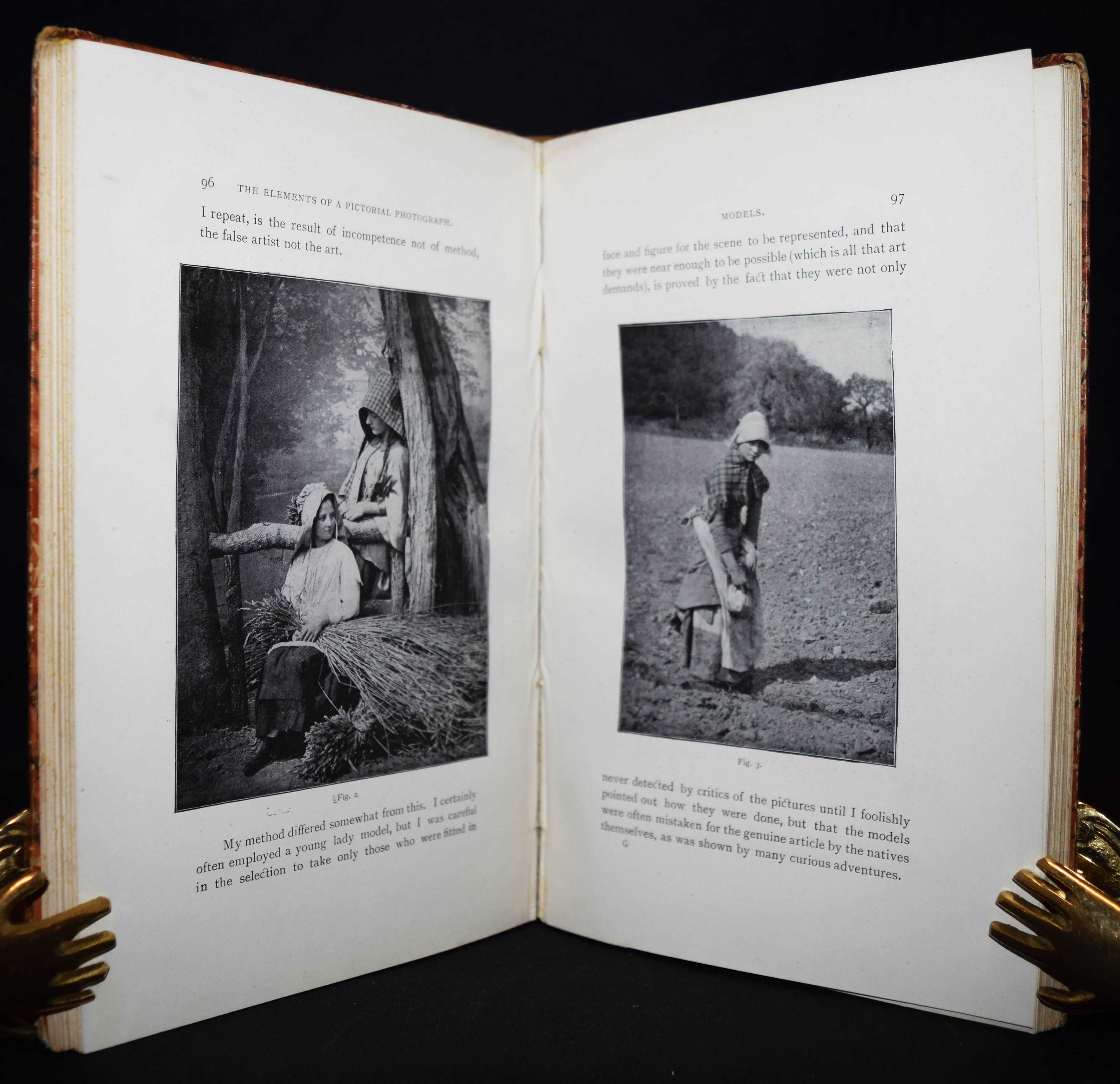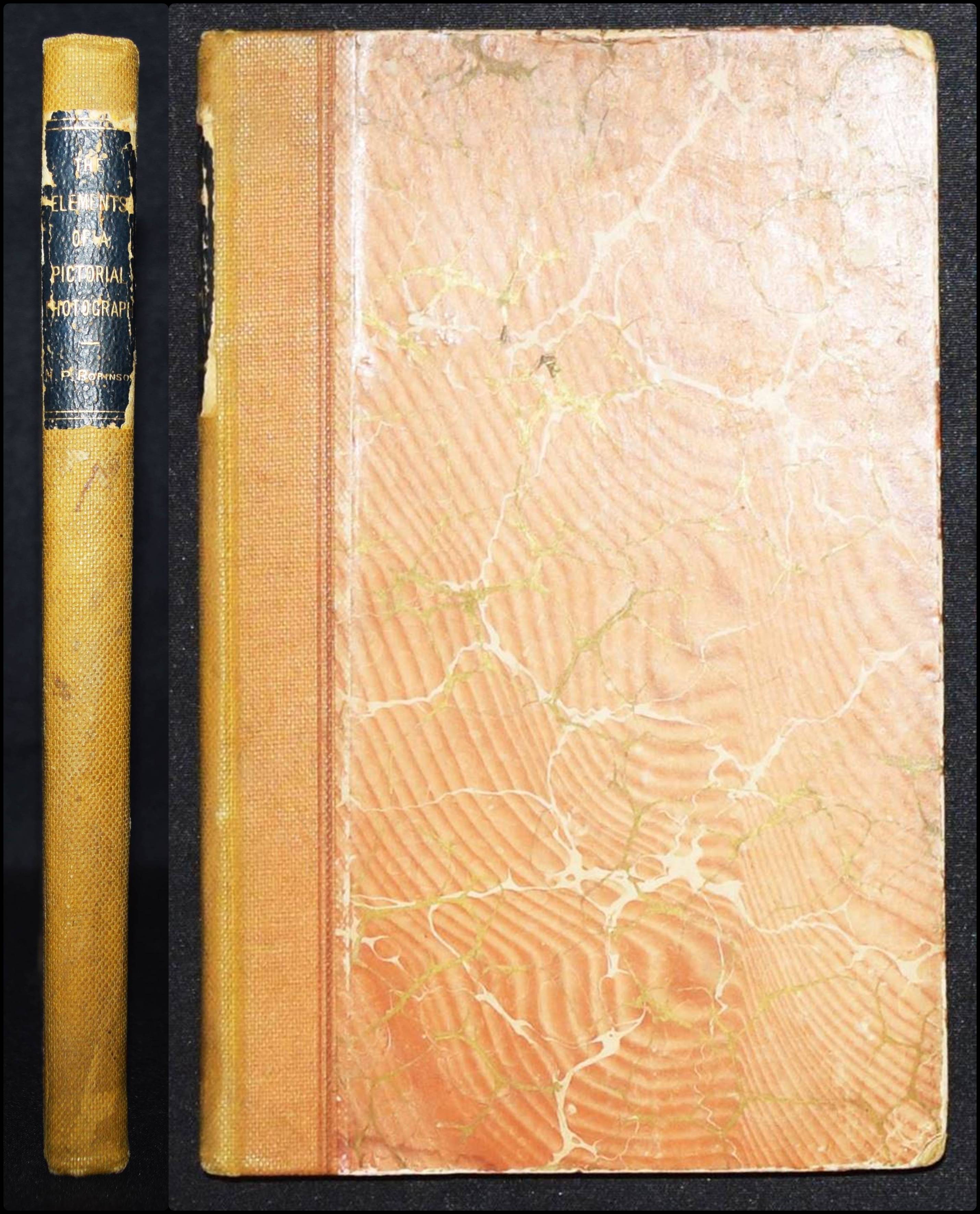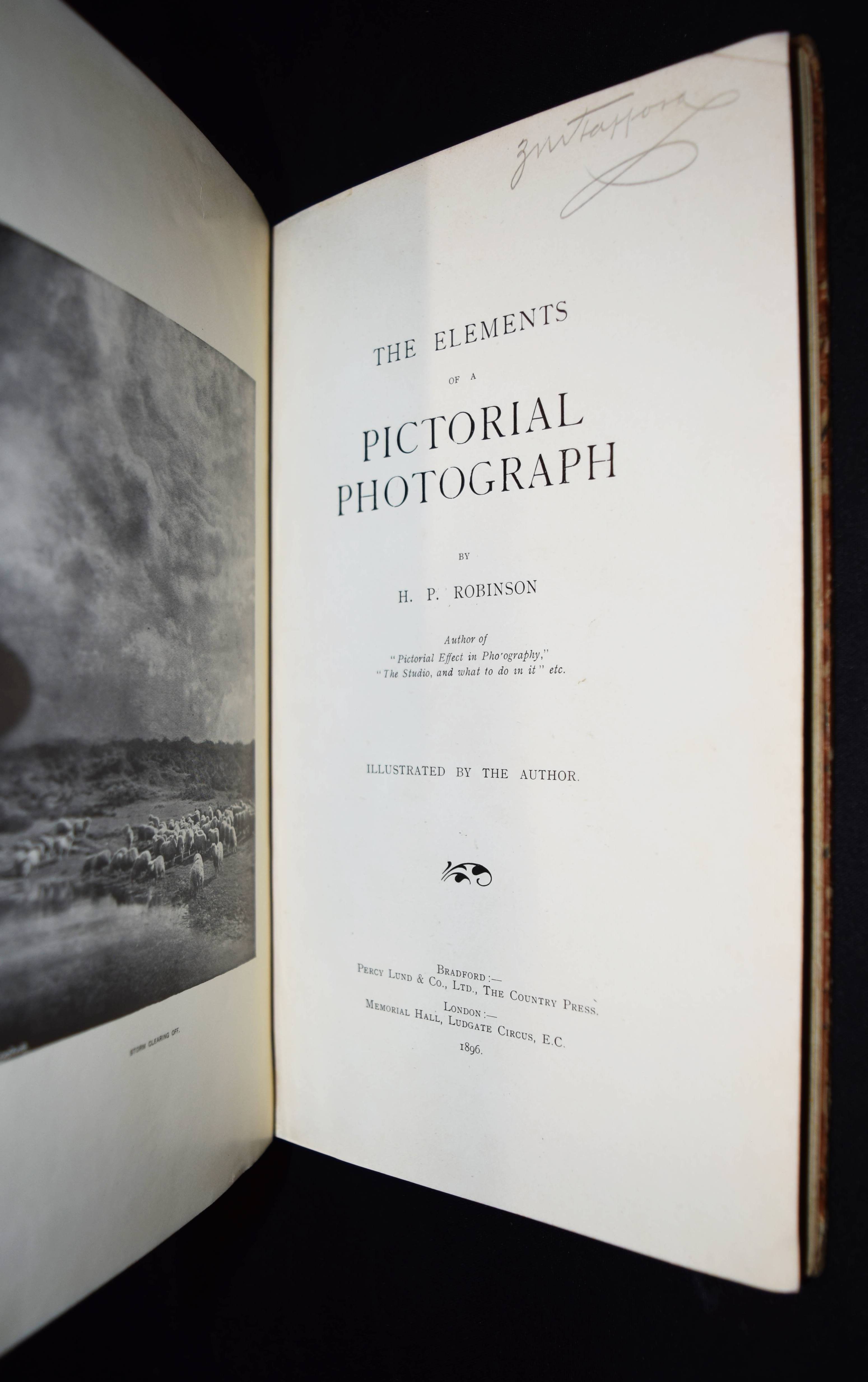 Robinson, H(enry) P(each). The elements of a pictorial photograph. Bradford, London, Percy Lund & Co. 1896. 8°. 167 S., [2] Bl. mit Frontispiz u. 39 Abb. Hln. d. Zt. mit goldgepr. Rückenschild. Roosens/Salu 8508. – Erste Ausgabe. – „(E)influssreichster Vertreter jener Maler-Photographen war Henry Peach Robinson, ursprünglich Buchhändler und Amateurmaler. Er wandte sich, obgleich eines seiner Bilder 1852 in der Royal Academy gezeigt wurde, der Photographie zu und eröffnete 1857 in Leamington Spa ein Porträtatelier. Im Ausgleich für die Massenproduktion von Visitenkartenphotos, mit denen er – wie Rejlander – seinen Lebensunterhalt verdiente, fertigte Robinson in seiner freien Zeit einige Kompositionen an, die er auf die Jahresausstellungen schickte, in der Erwartung, dem Recht der Photographie auf Anerkennung als Kunst auf diesem Wege Nachdruck verleihen zu können. … Wie andere künstlerisch begabte Photographen seiner Zeit begegnete auch Robinson der Überbetonung der photographischen Technik mit großer Abneigung. Die Beschäftigung mit ihr war zum Selbstzweck geworden. „Wir wollen, daß diese Erfindung zu erhabeneren Zwecken eingesetzt wird als bisher“.“ (H. Gernsheim, Geschichte der Photographie S. 297). – Einband etwas berieben, Rückenschild stärker, Wappen-Exlibris, sonst gut erhalten.
